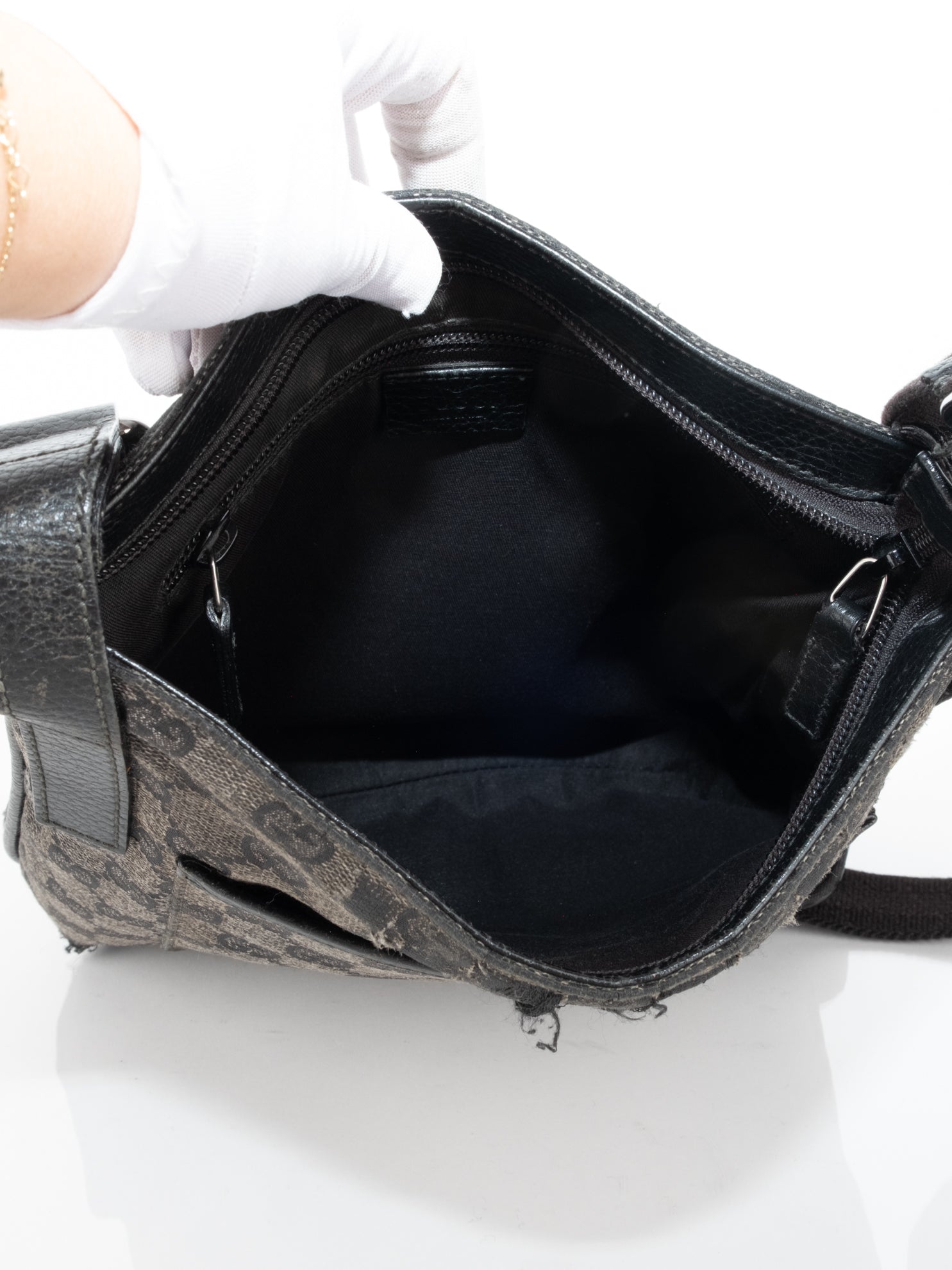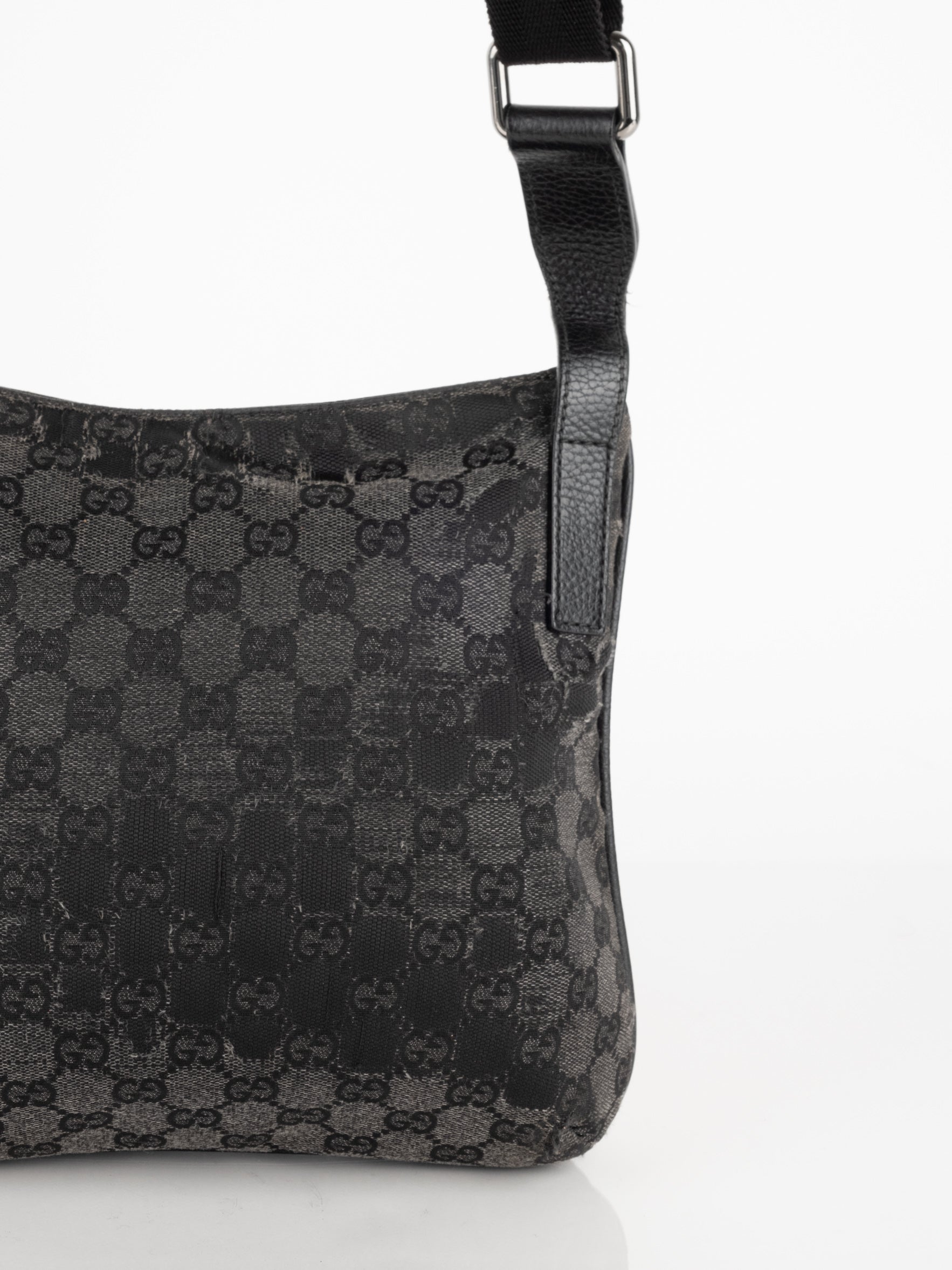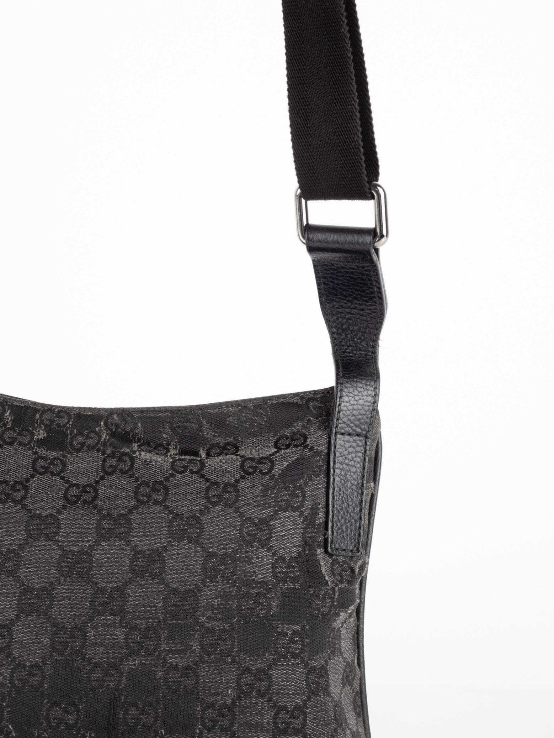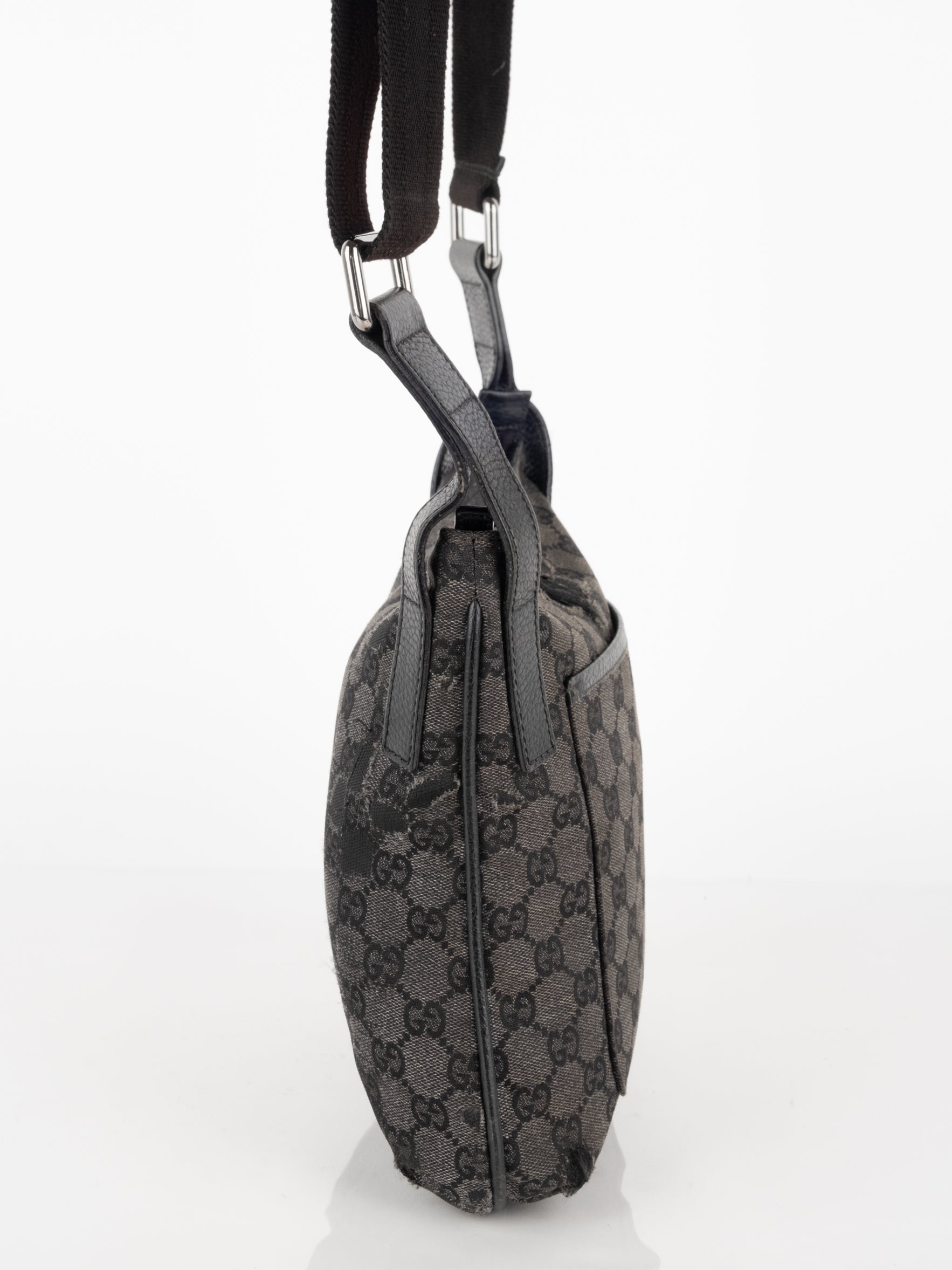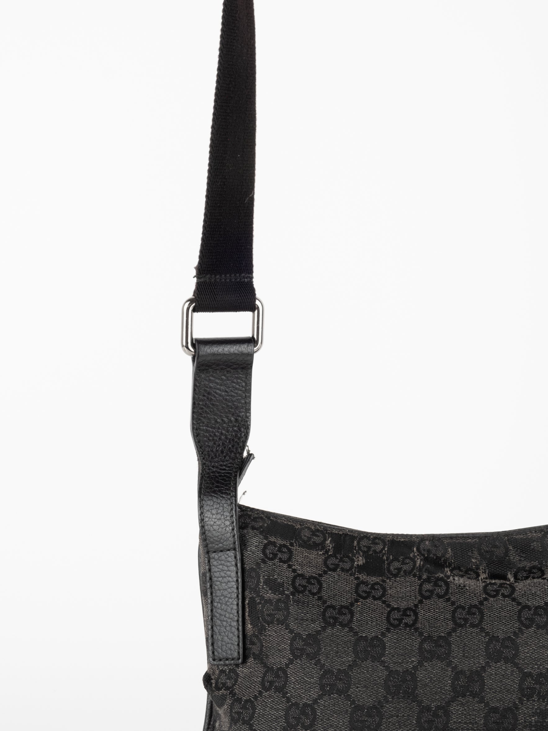 תיק כתף (מתאים לקרוסבודי) העשוי מבד קנבס בשילוש של עור בצבע שחור בהדפס המונוגרמי המוכר של המותג האיטלקי, בעל רצועה העשויה מבד שניתן לכוון ודיטיילים כסופים.