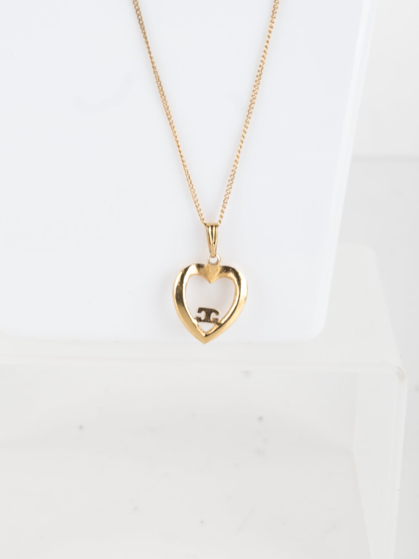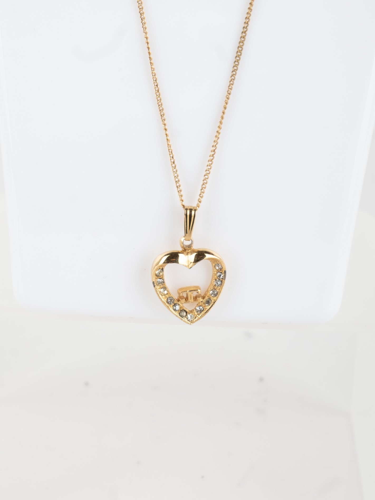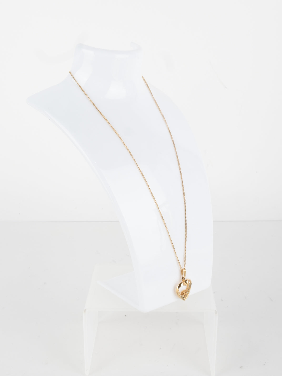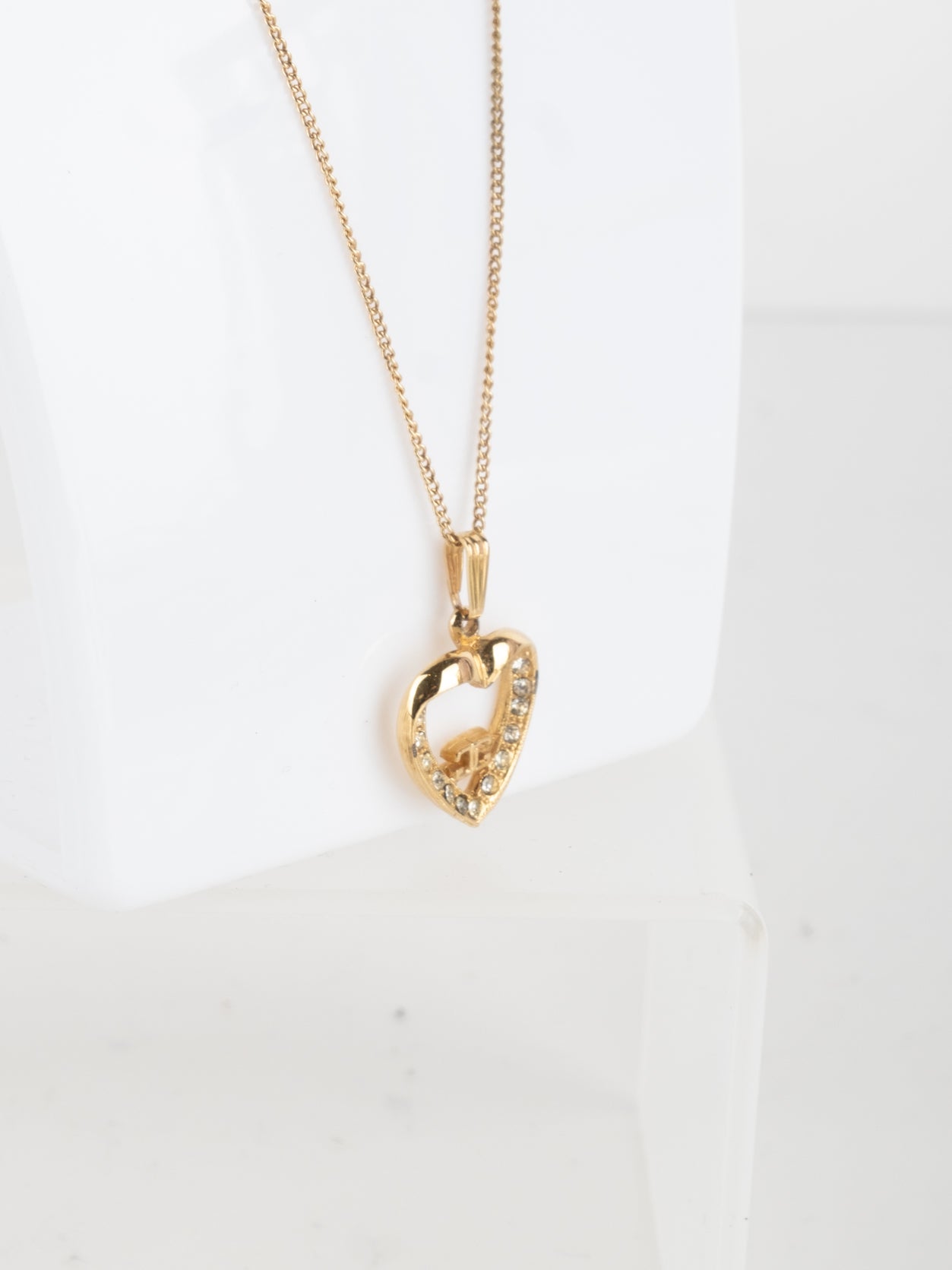 שרשרת עדינה במבע זהב בעלת תליון בצורת לב חלול עם זירקונים מסביב.