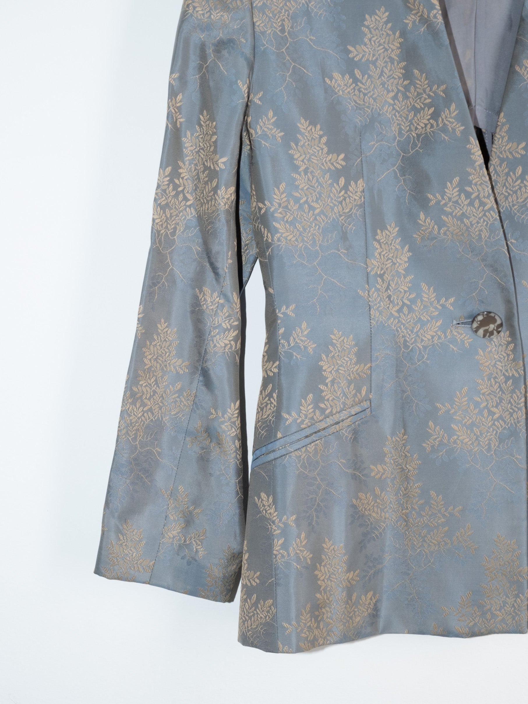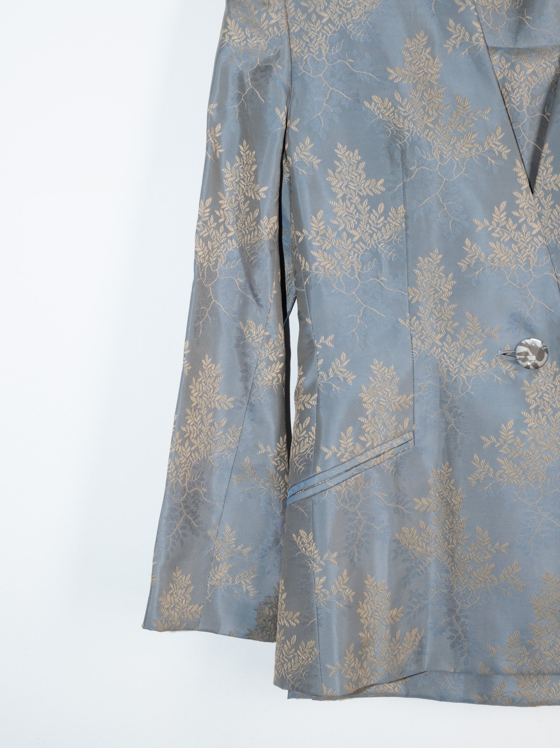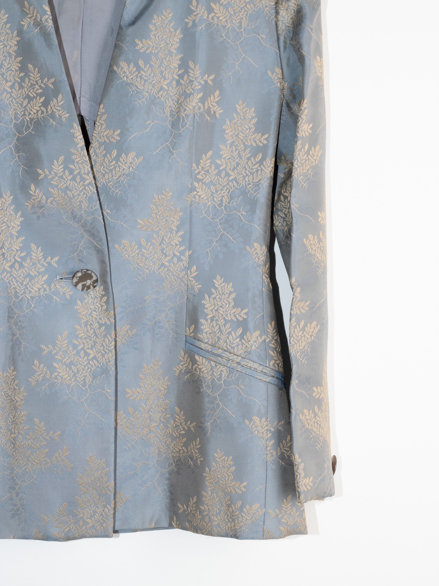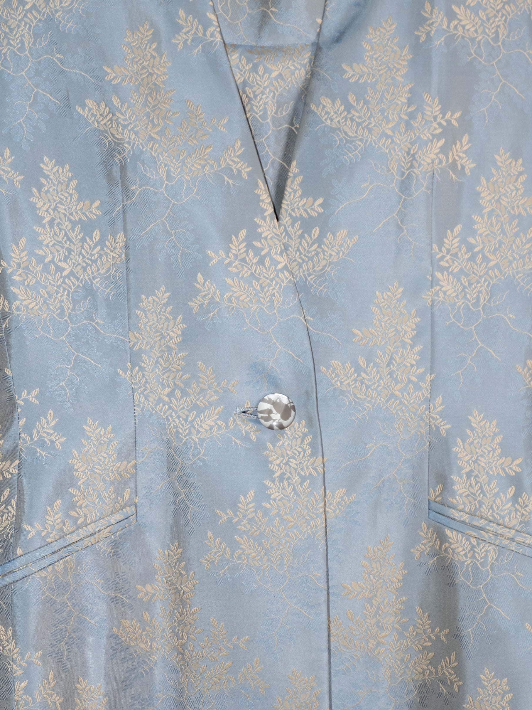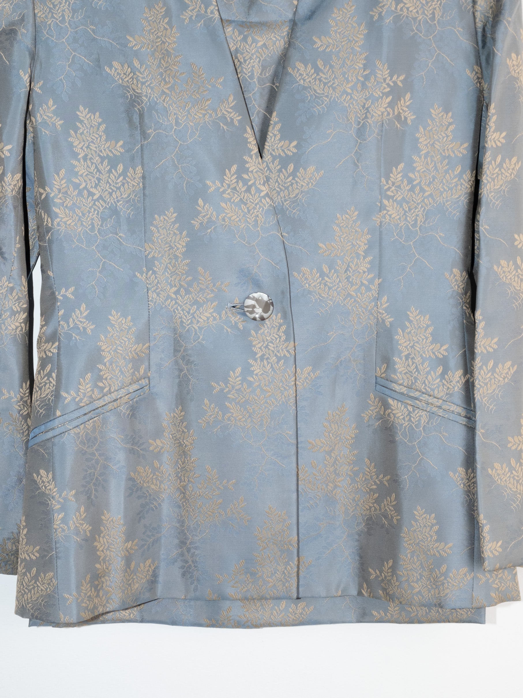 חליפה מדהים בל בלייזר מחויט וחצאית בצבע תכלת אפרפר עם ציורים מוזהבים של טבע בסגנון היפני. בלייזר נסגר באמצעות כפתור, בעל שני כיסים צדדיים ללא סגירה. בסיומת של כל שרוול ישנו כפתור אך משמש לצורך קישוט בלבד.