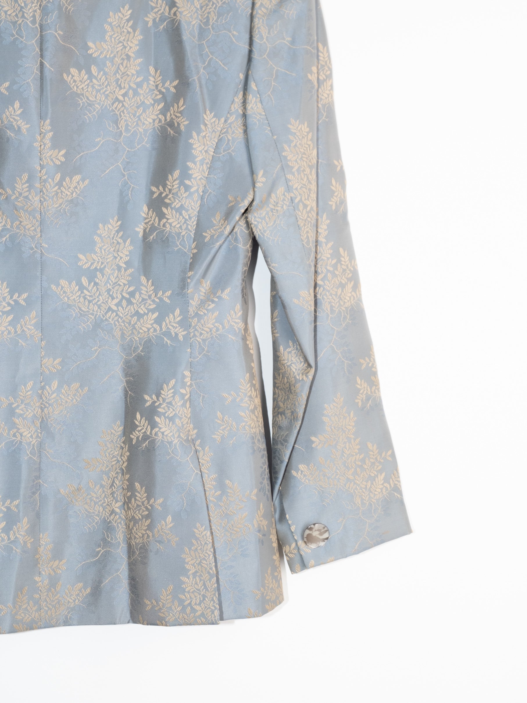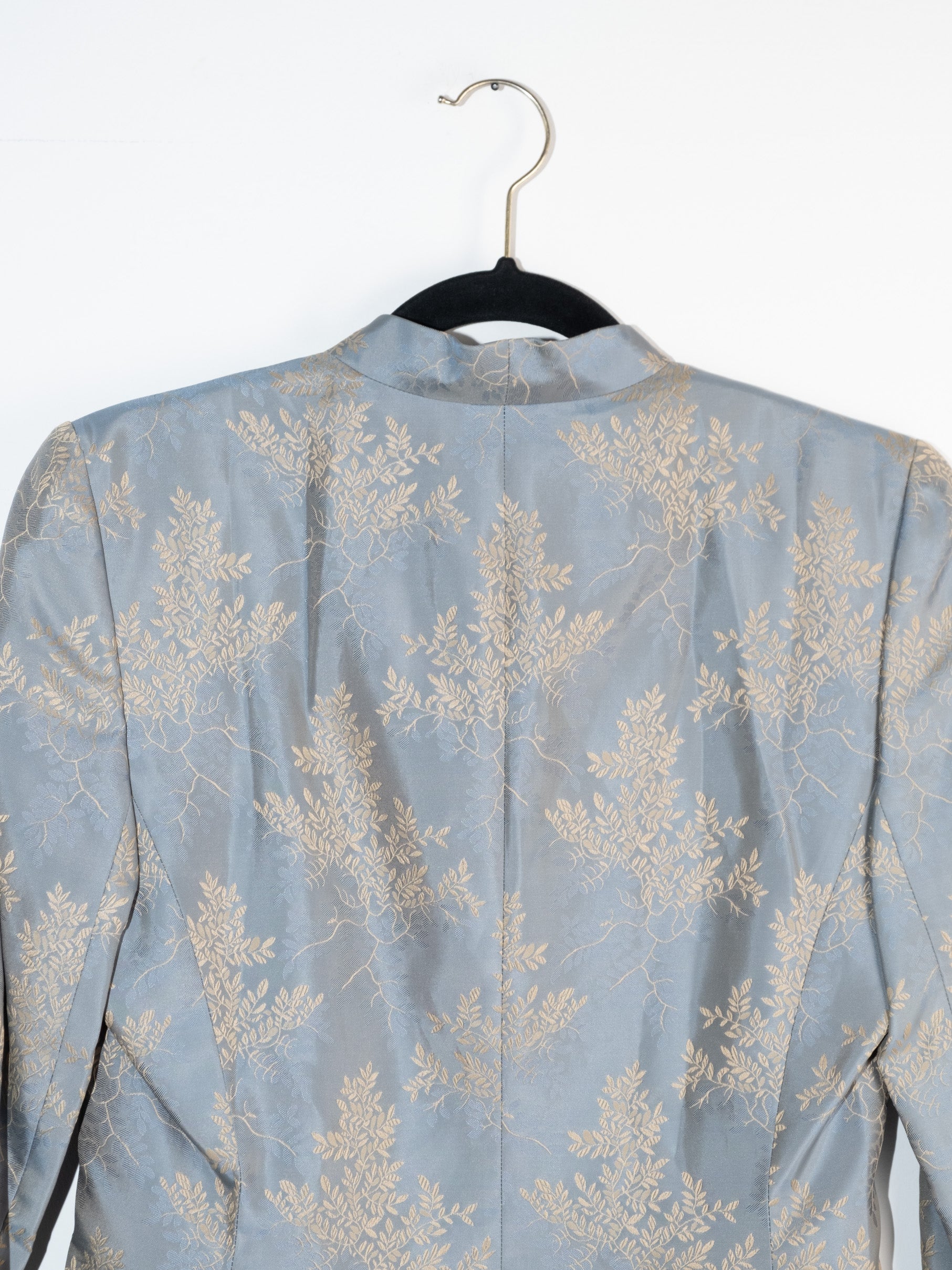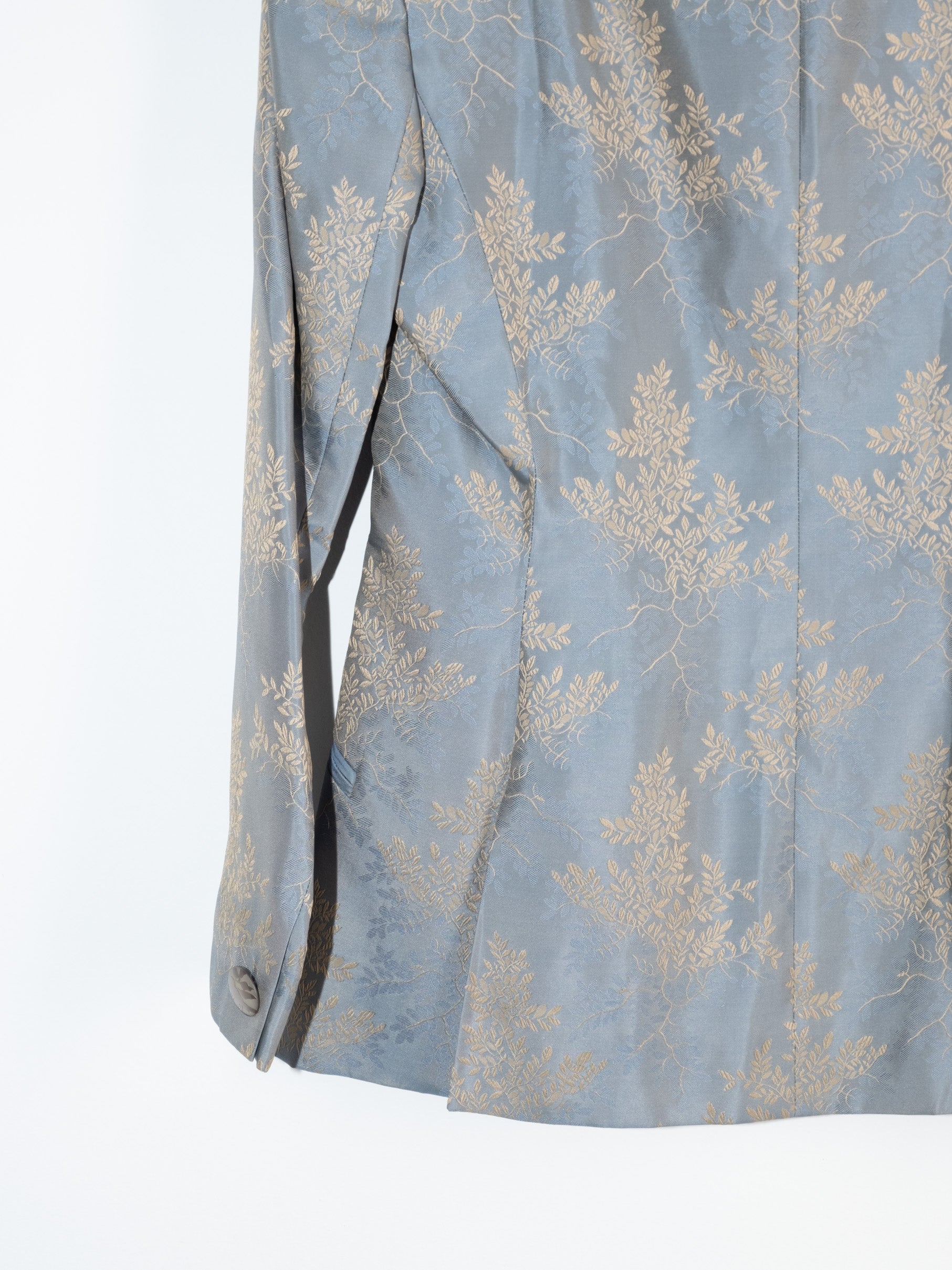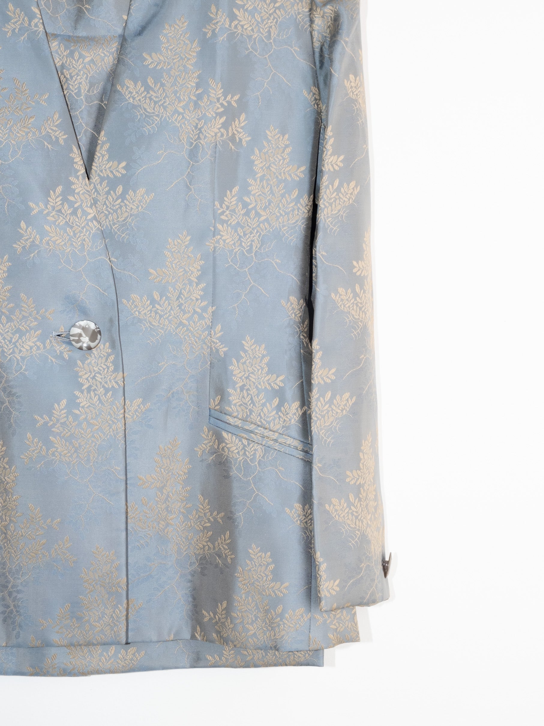 חליפה מדהים בל בלייזר מחויט וחצאית בצבע תכלת אפרפר עם ציורים מוזהבים של טבע בסגנון היפני. בלייזר נסגר באמצעות כפתור, בעל שני כיסים צדדיים ללא סגירה. בסיומת של כל שרוול ישנו כפתור אך משמש לצורך קישוט בלבד.