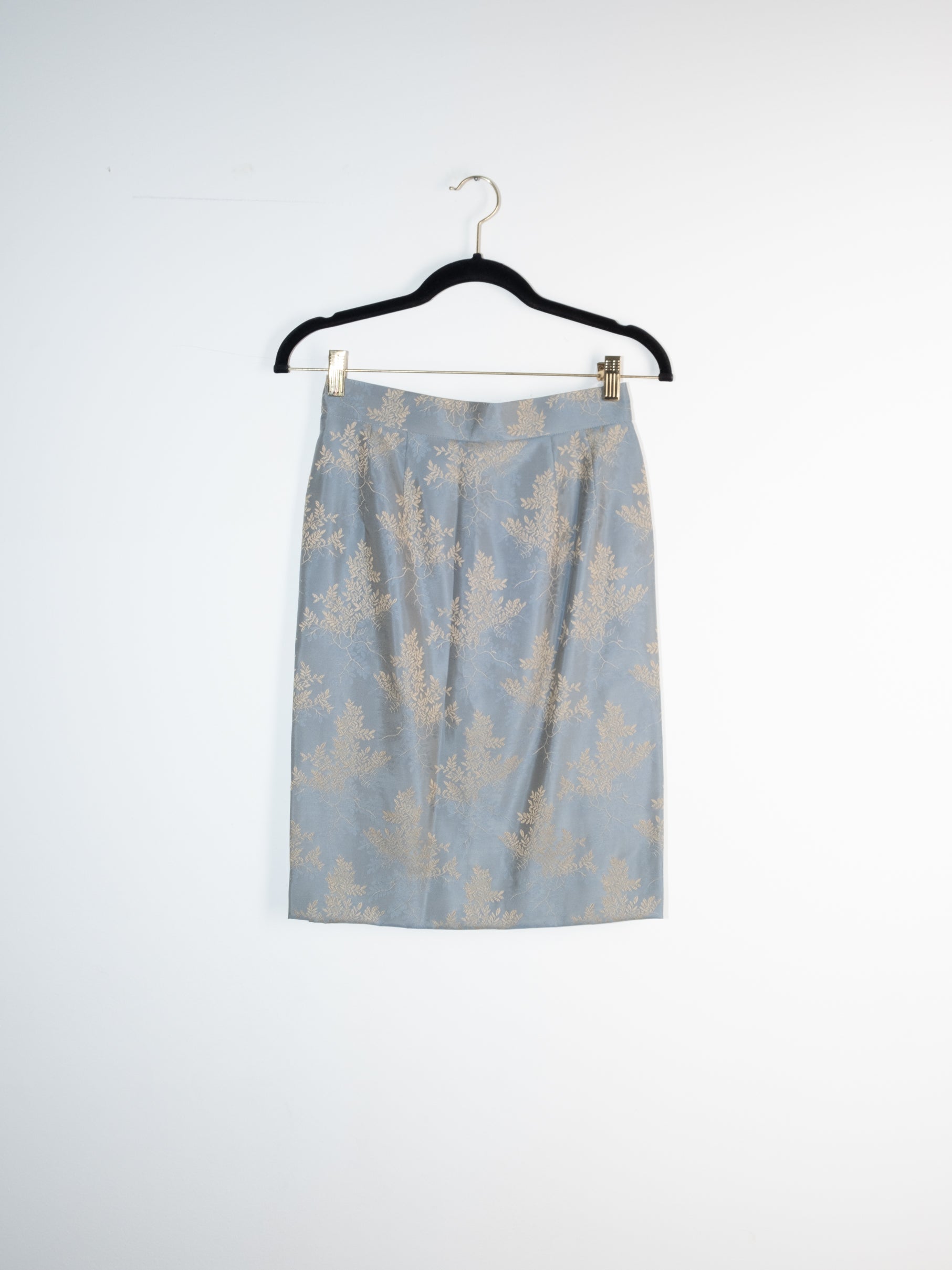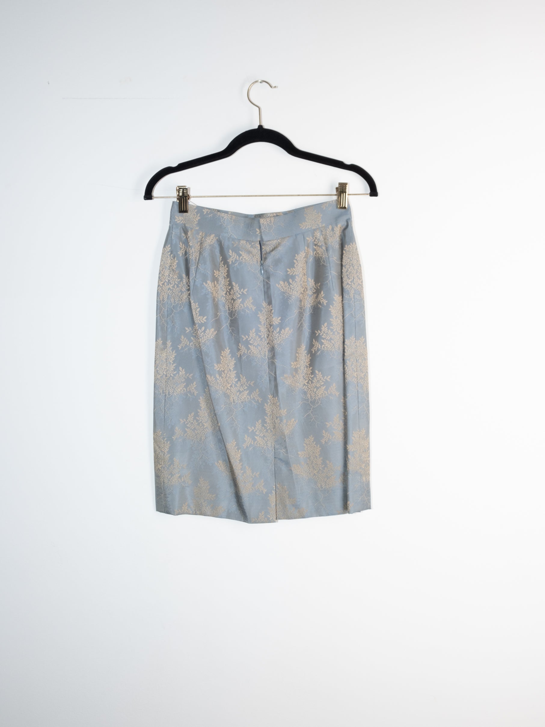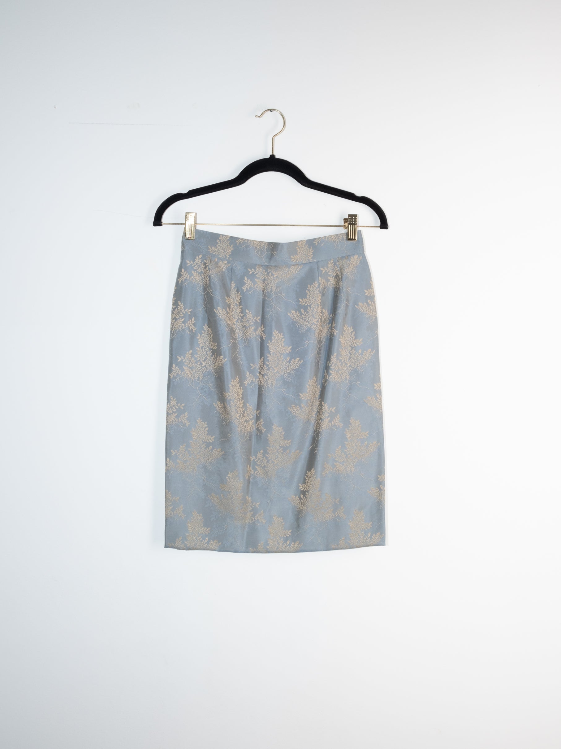 חצאית בצבע זהה בגזרה ישרה הנסגרת באמצעות רוכסן, סגירת קרוס וכפתור תיק-תק.