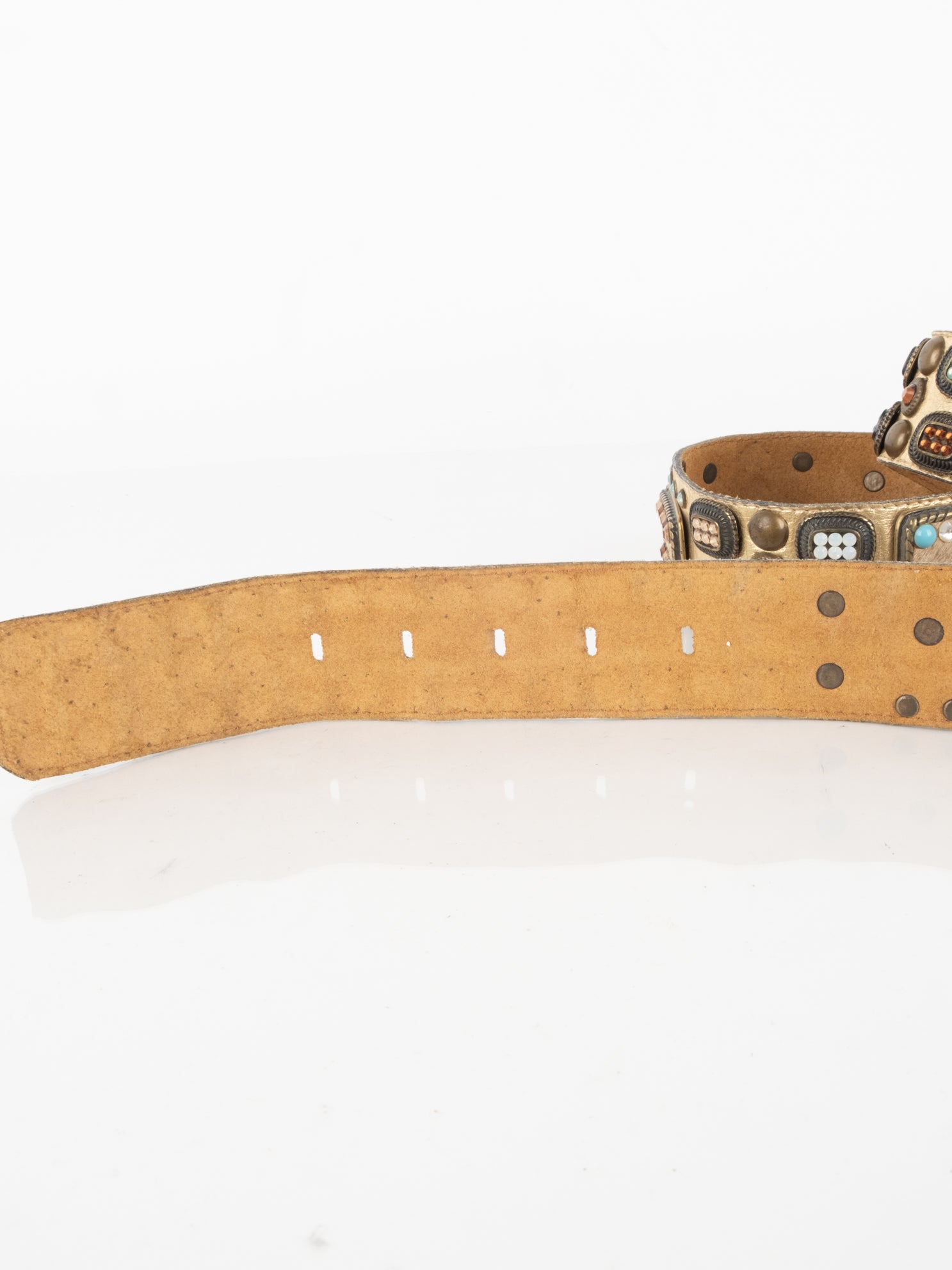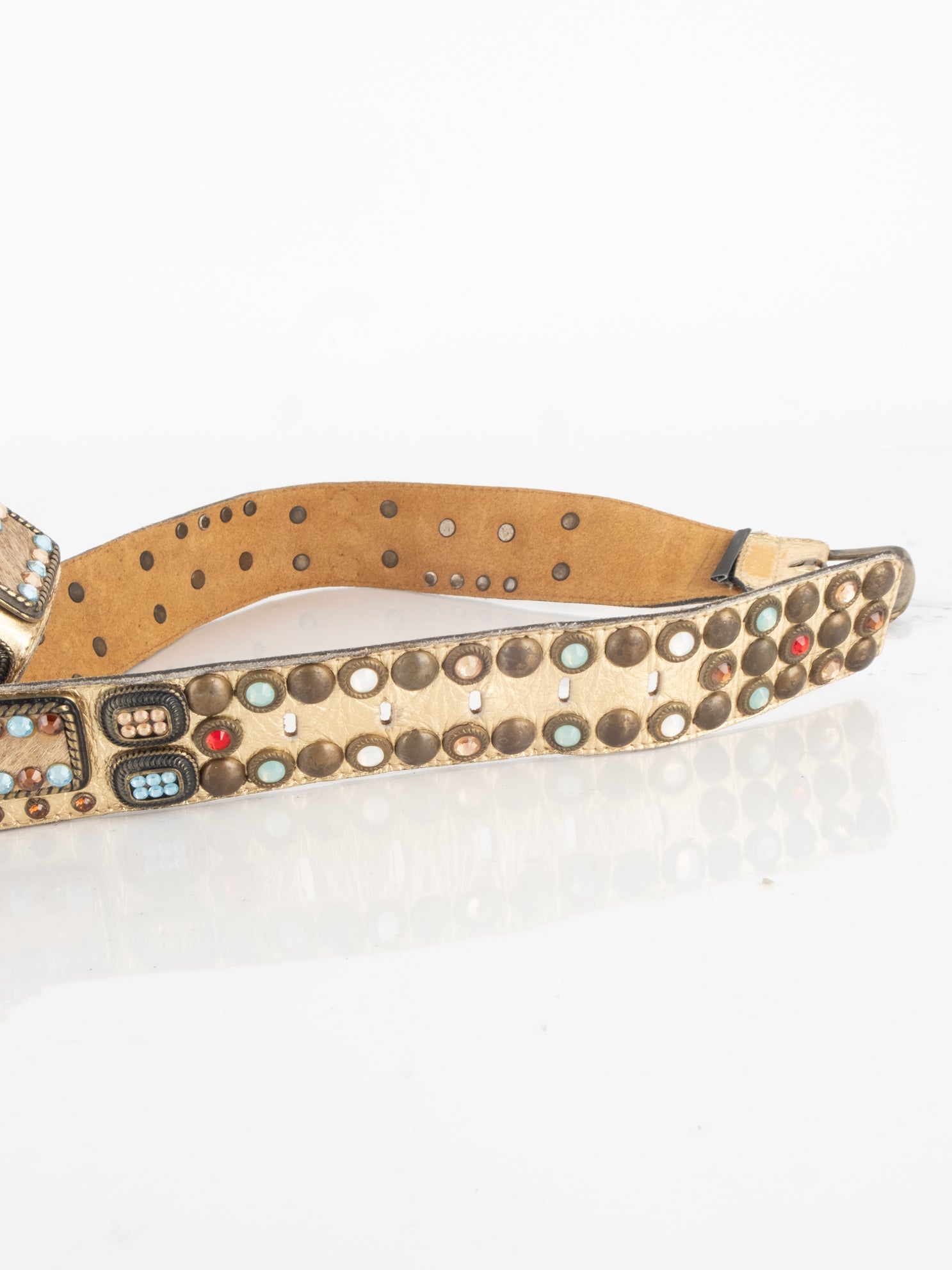 חגורה העשויה מעור בצבה זהב בעלת דיטיילים מוזהבים ואבנים.