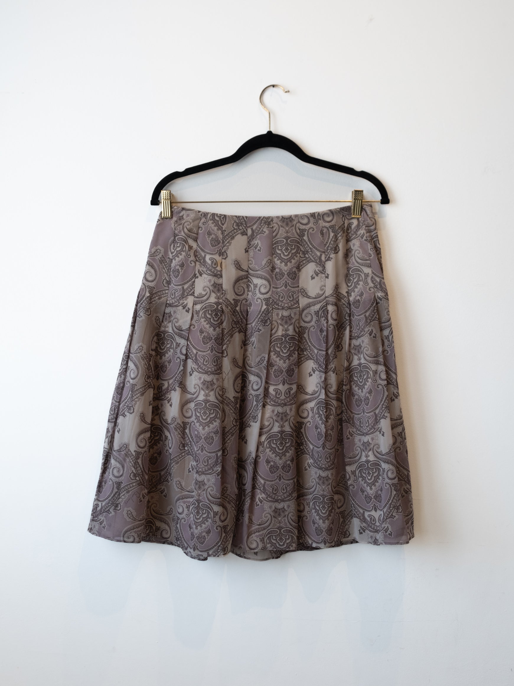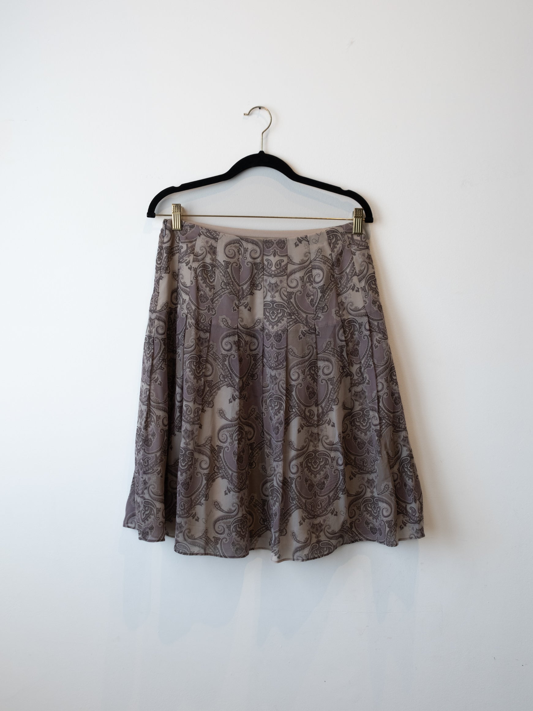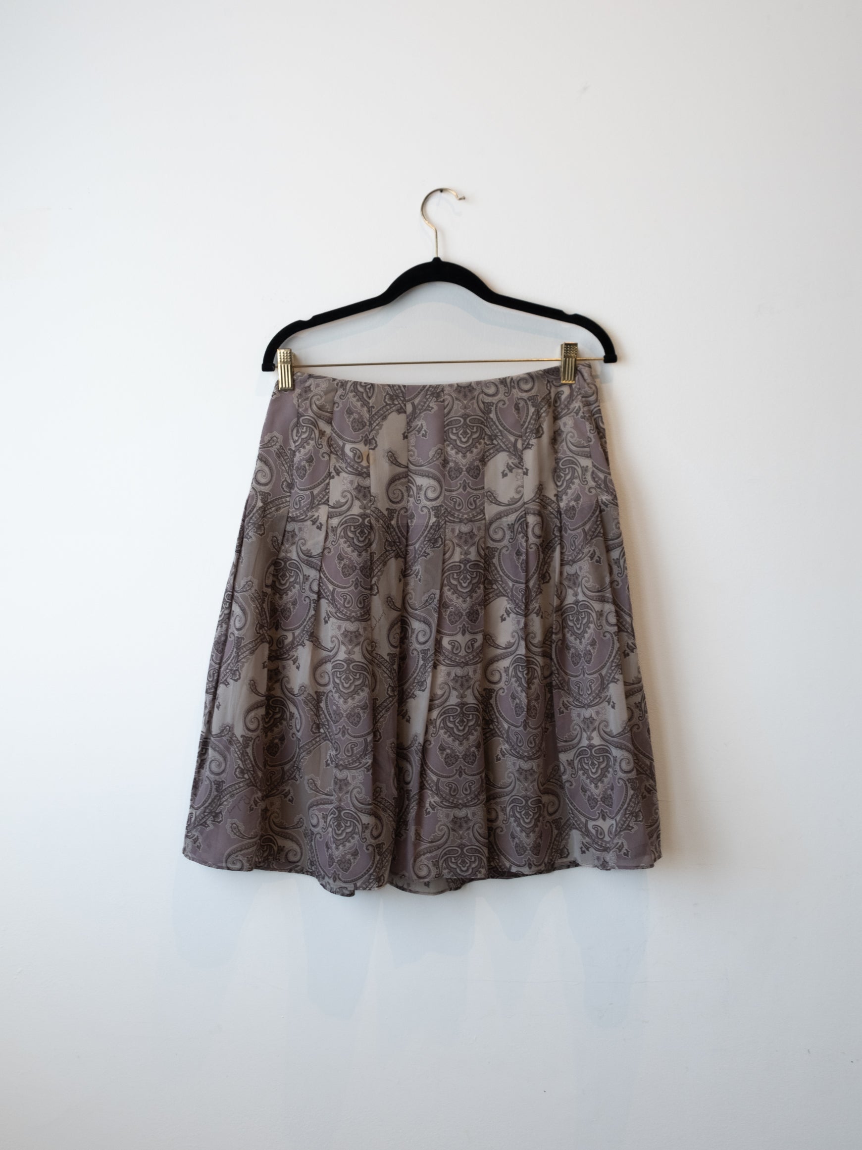 חצאית קלילה בגזרה מתרחבת כלפי מטה בצבע אפור בהדפס פרחוני הנסגרת באמצעות רוכסן מצד שמאל.