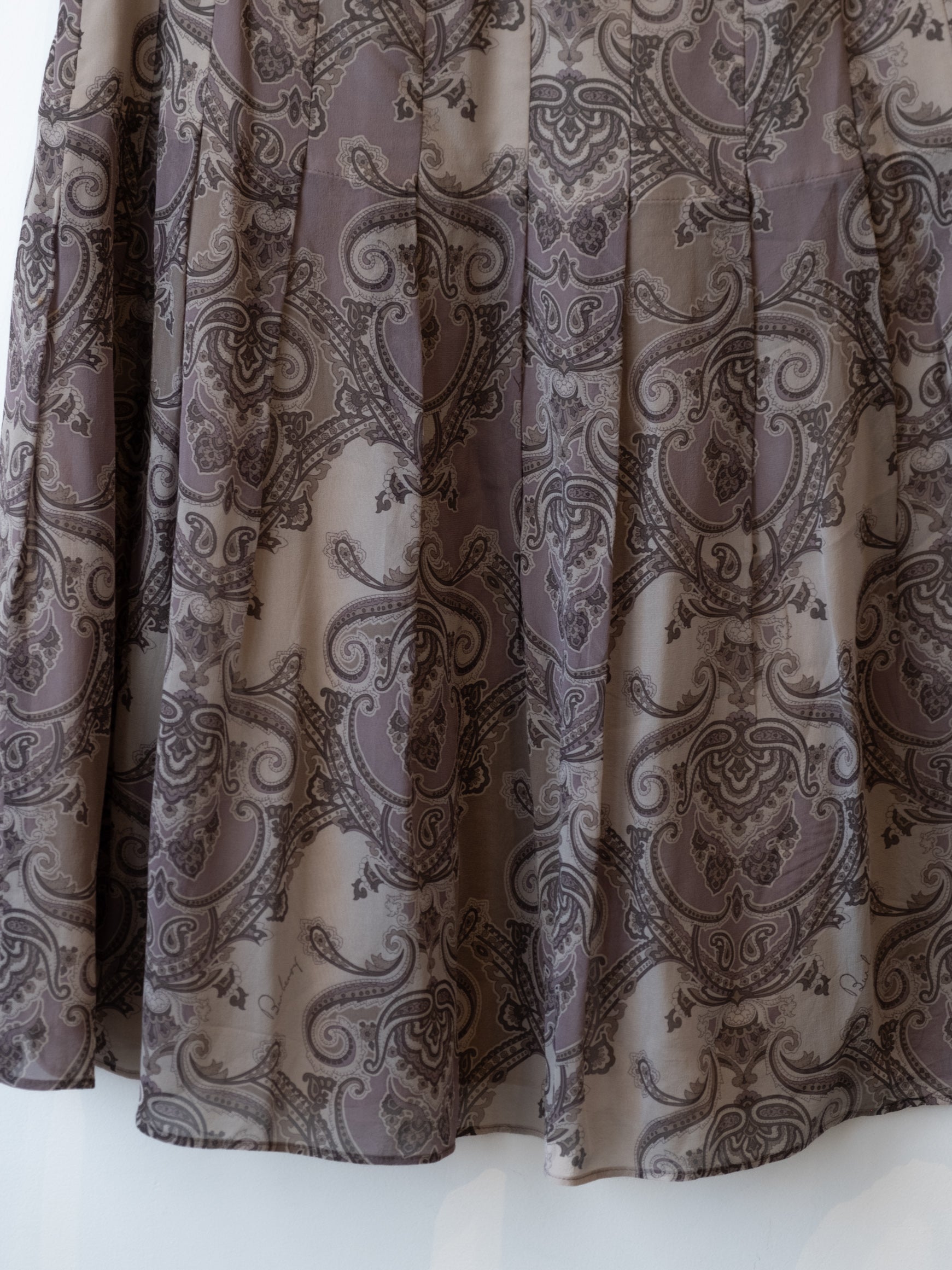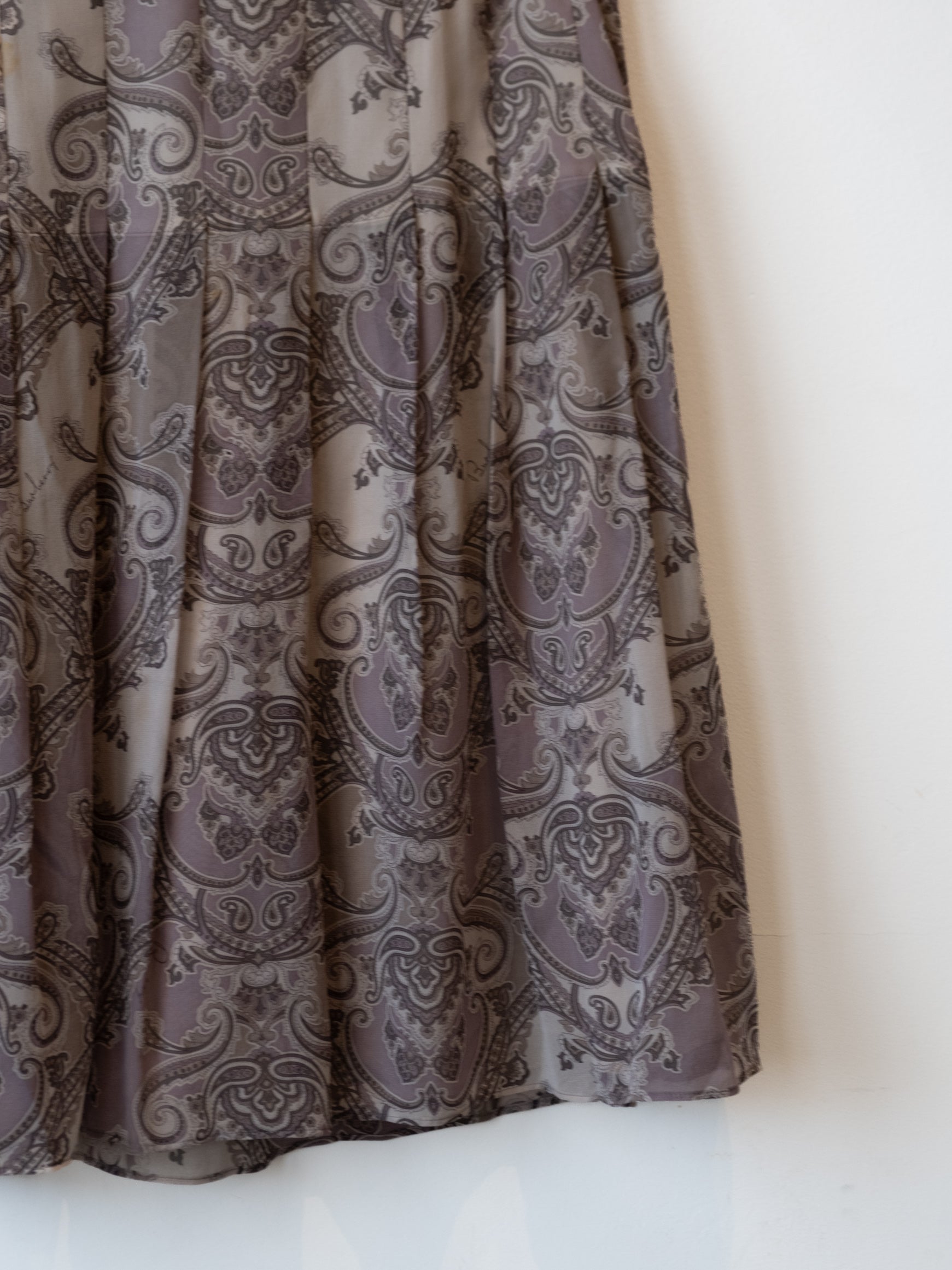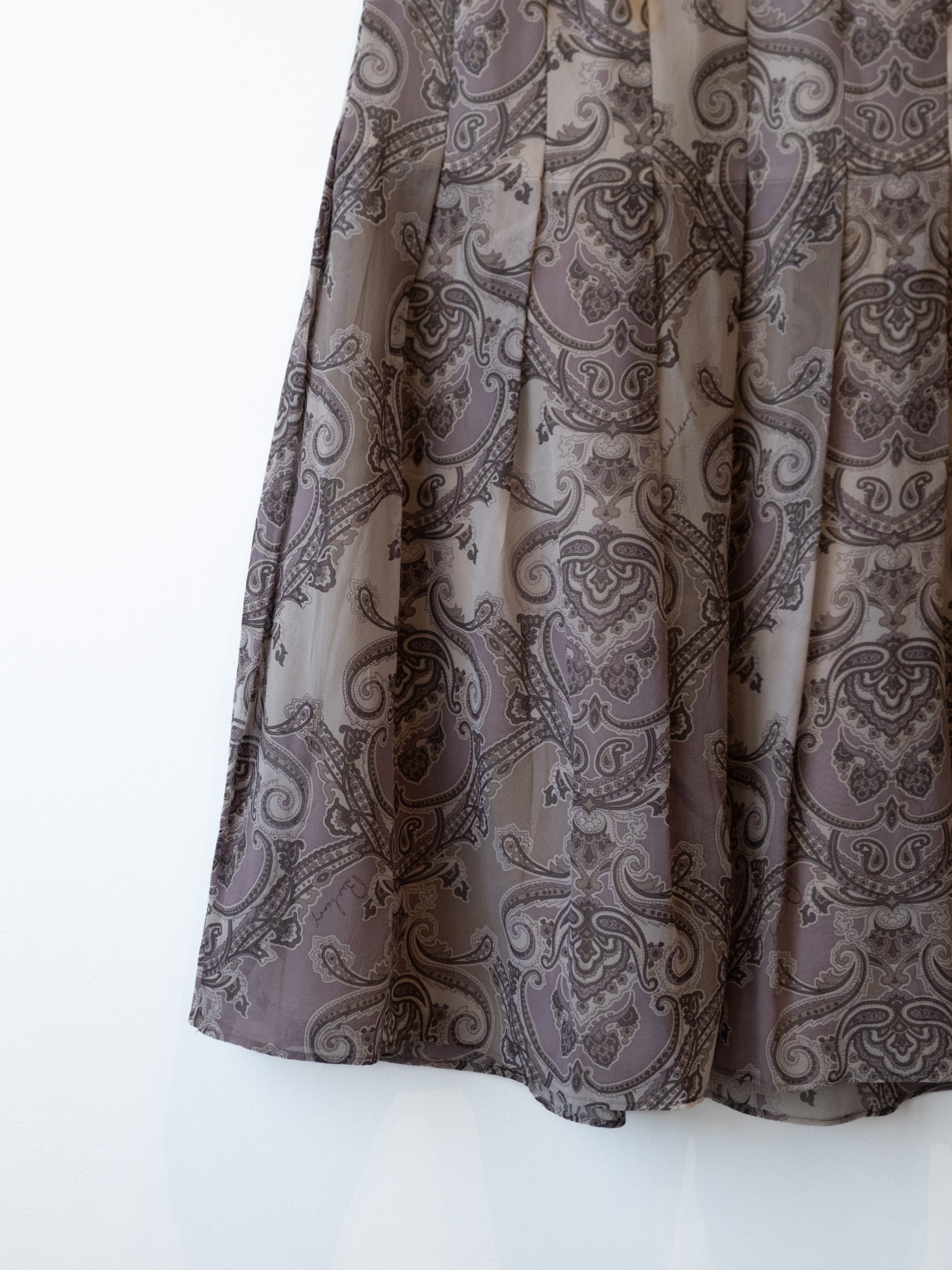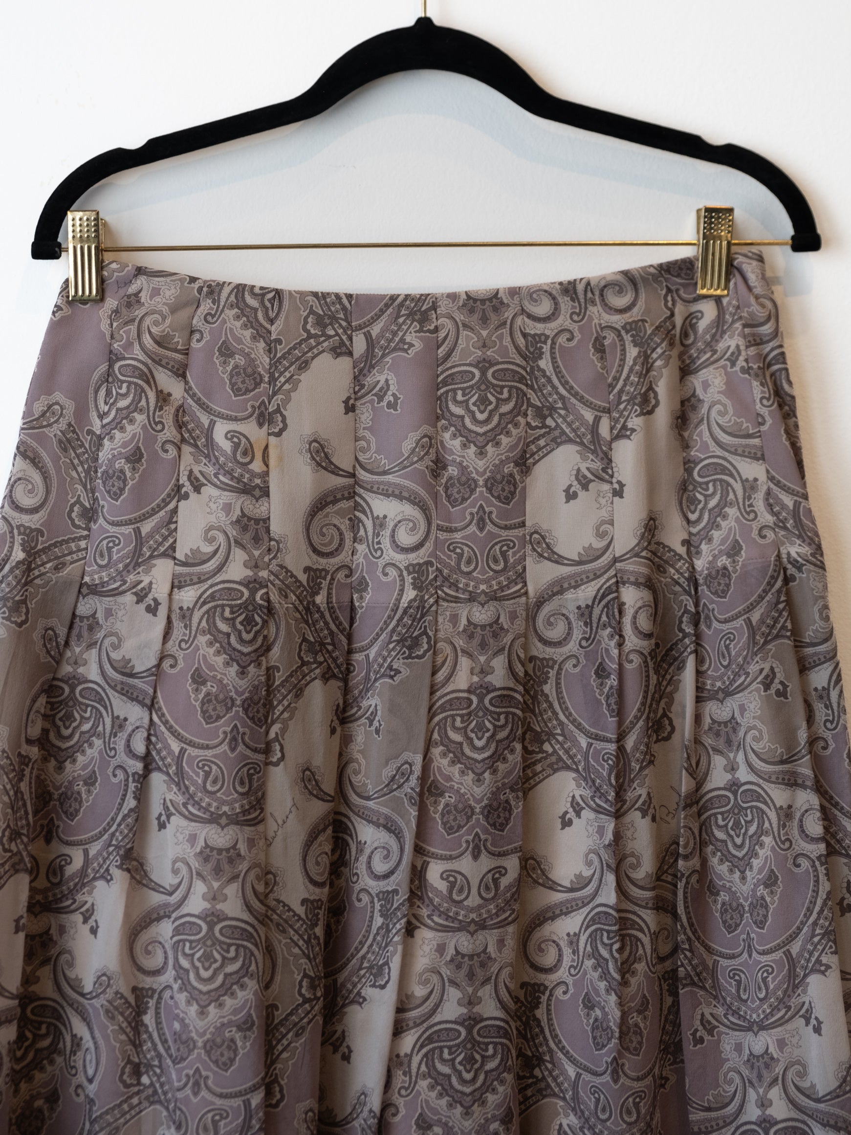 סימני שימוש: קיימים מספר כתמים בחלקו הקדמי של החצאית, הרוכסן מעט קשה אך עובד. הבטנה הפנימים באזור המותן מעט מוכתמת.