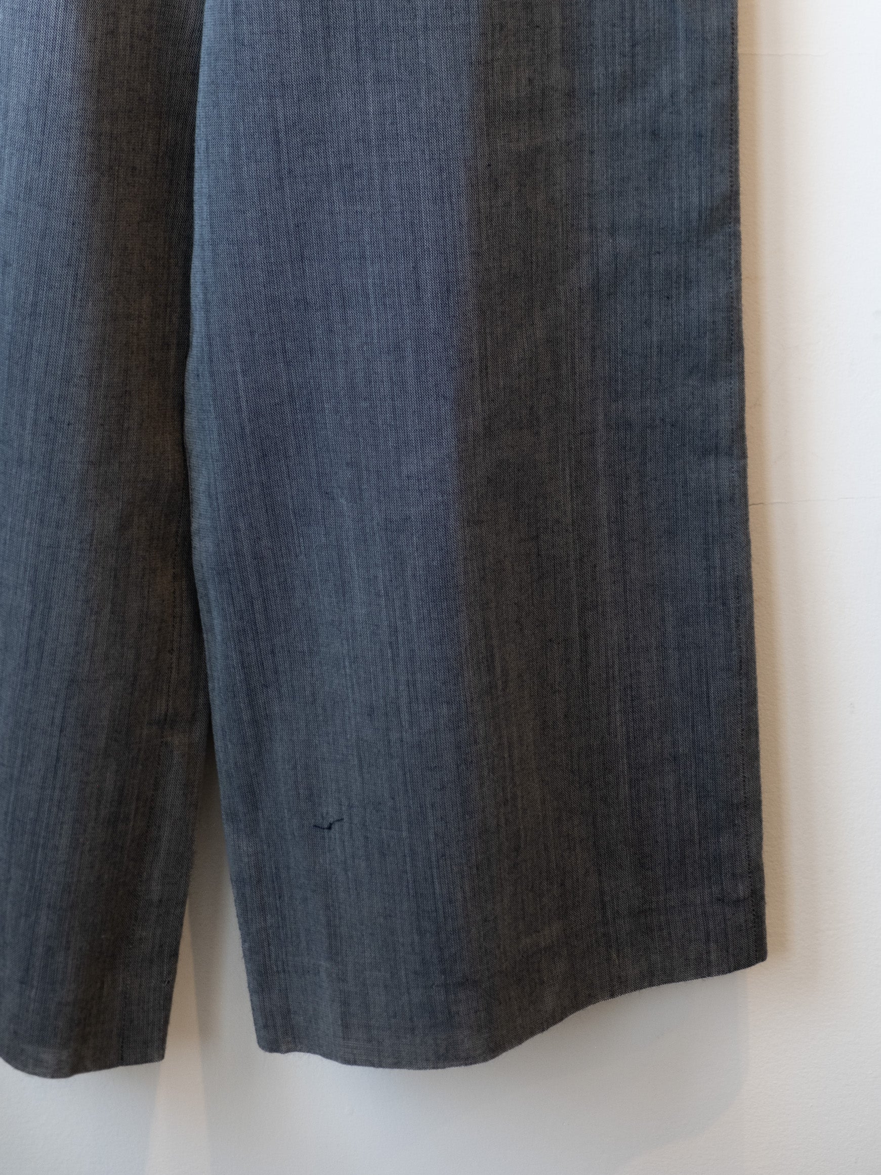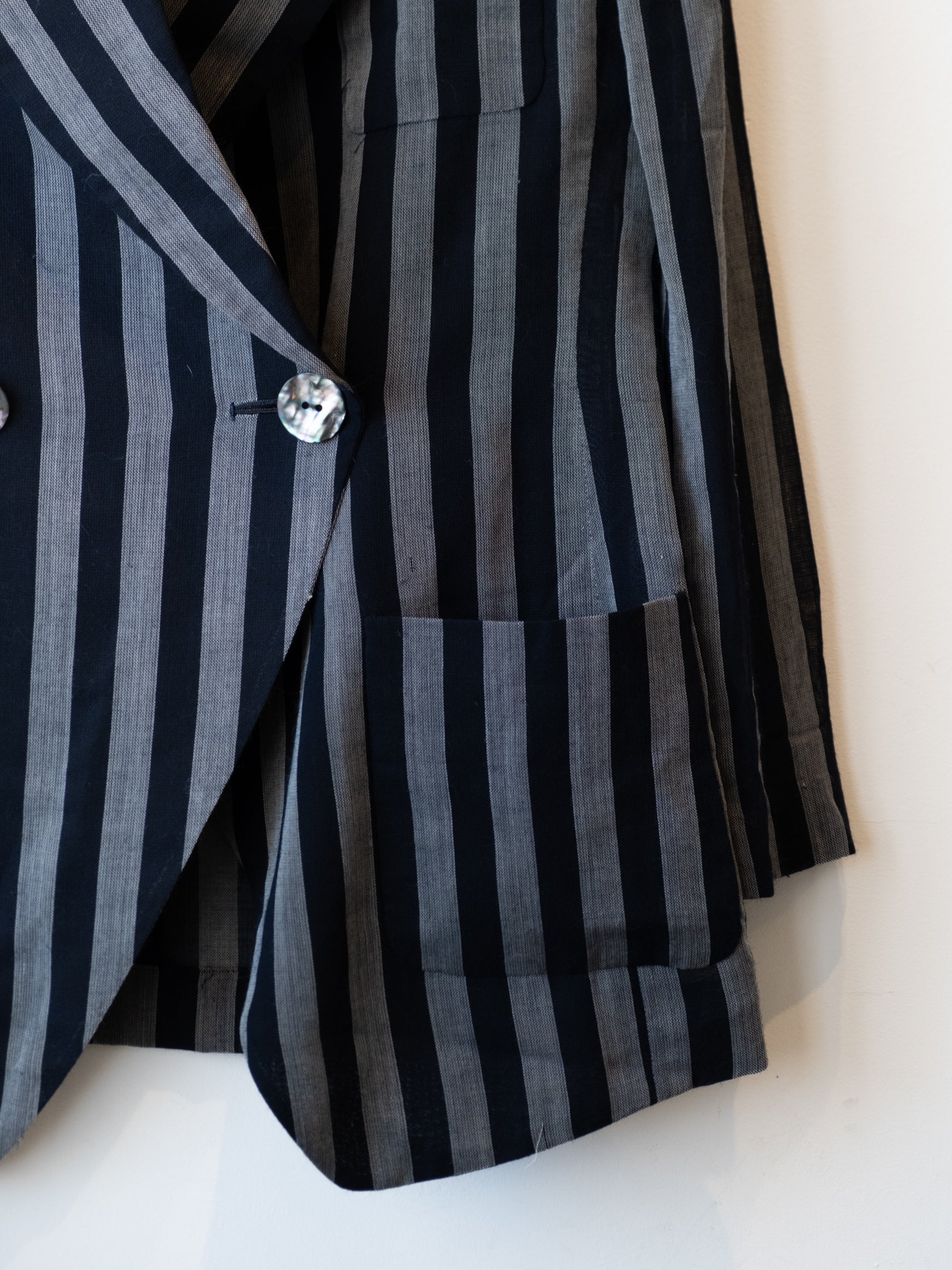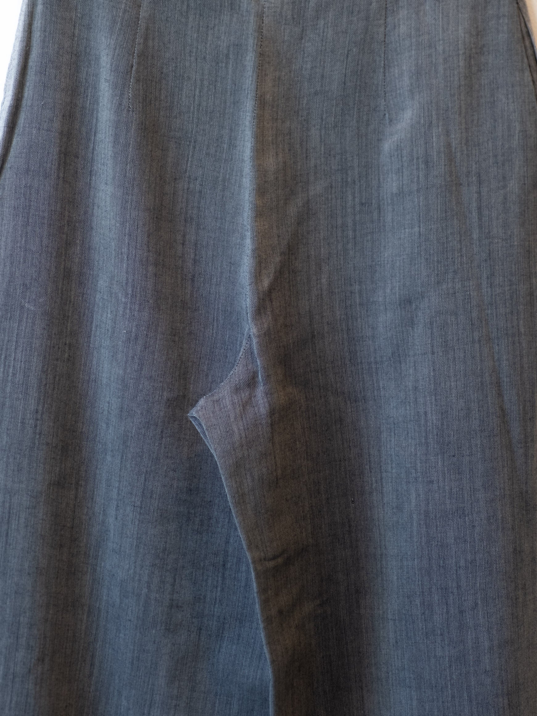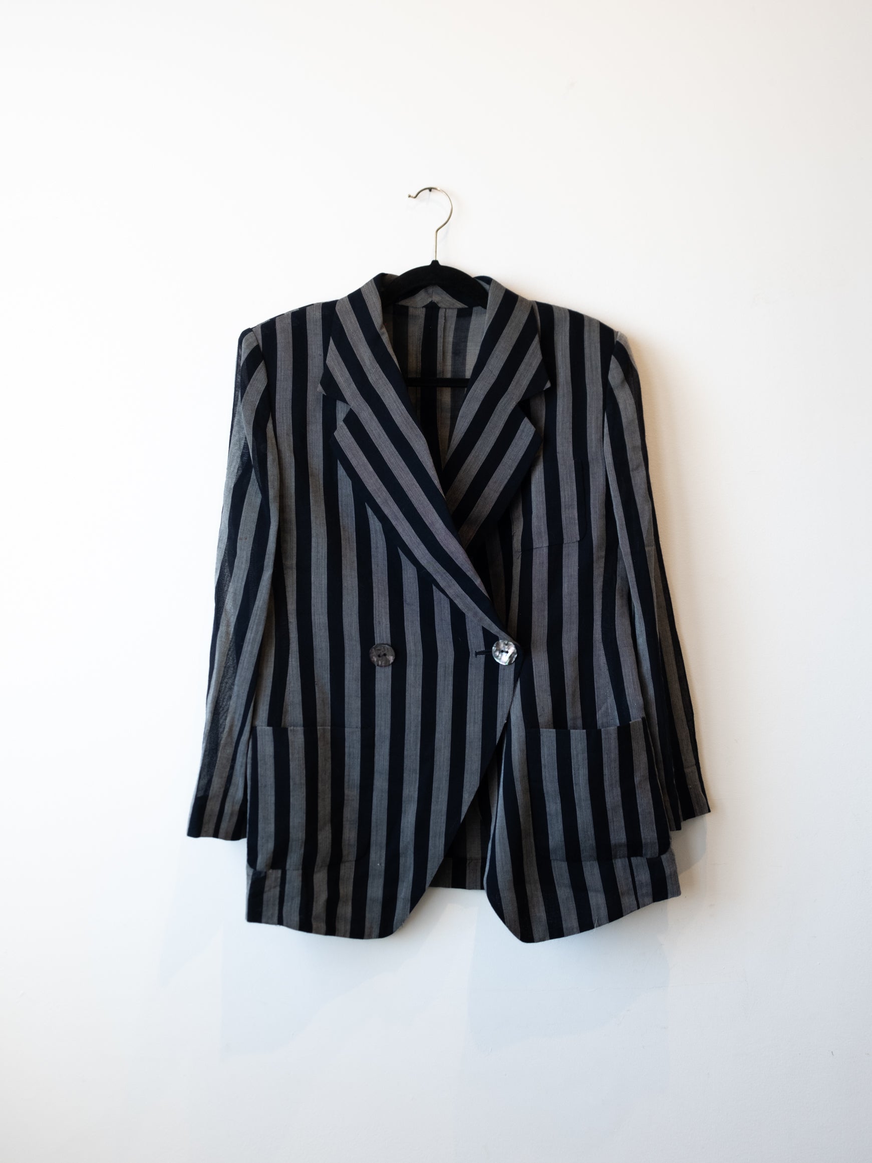 חליפה קלילה של שני חלקים בלייזר עם כתפיים מרופדות בצבע כחול חצי שקוף עם פסים הנסגר באמצעות כפתור ומכנסיים אפורים הנסגרים באמצעות רוכסן ושני סגירות קרוב מצד שמאל.