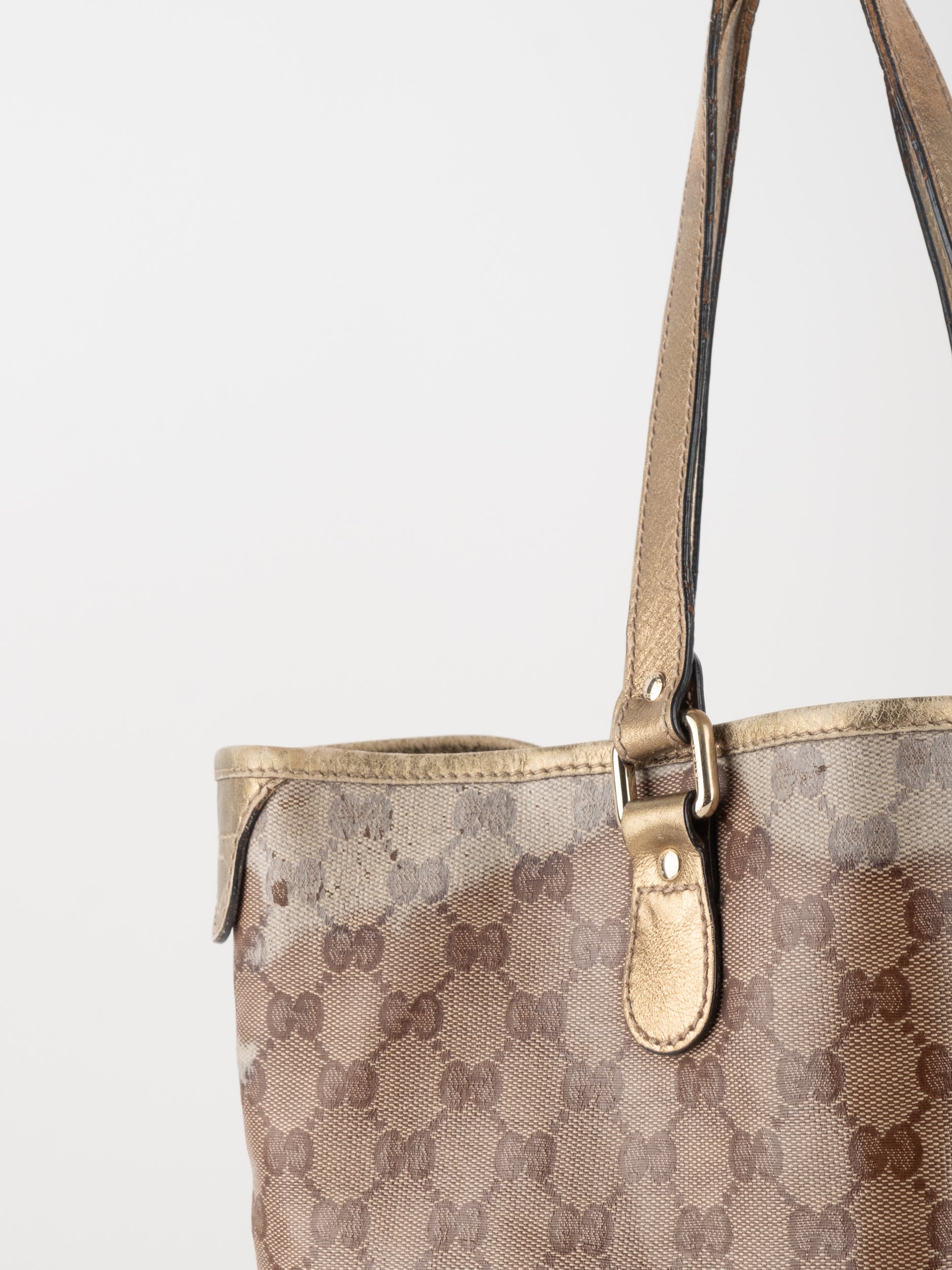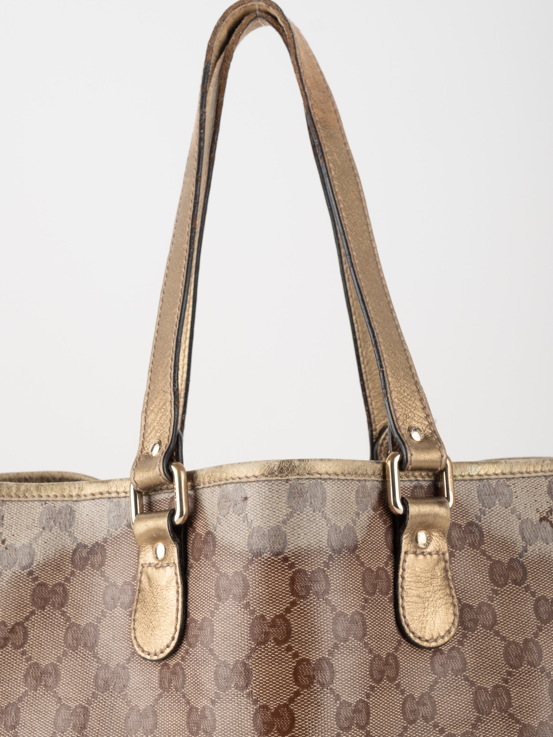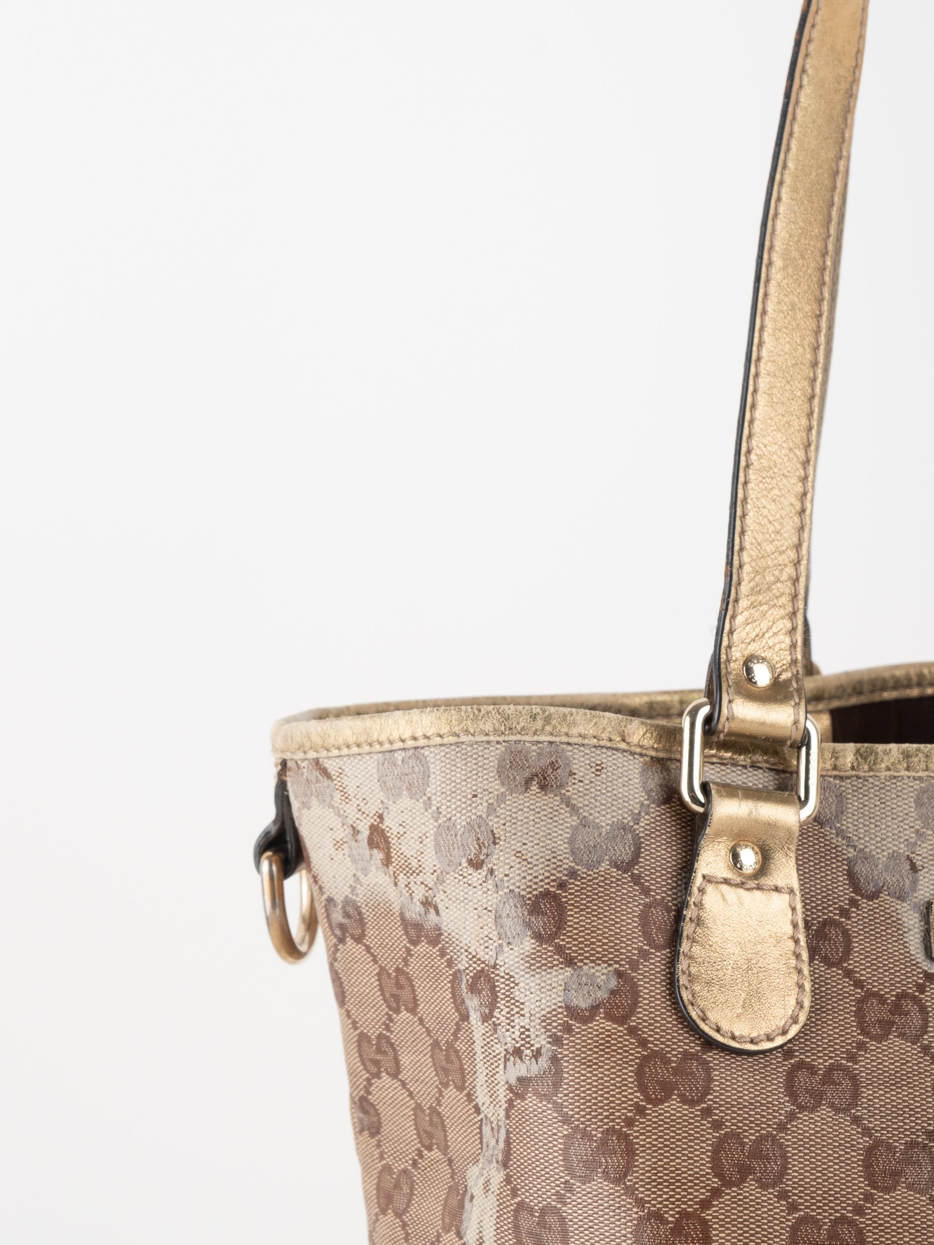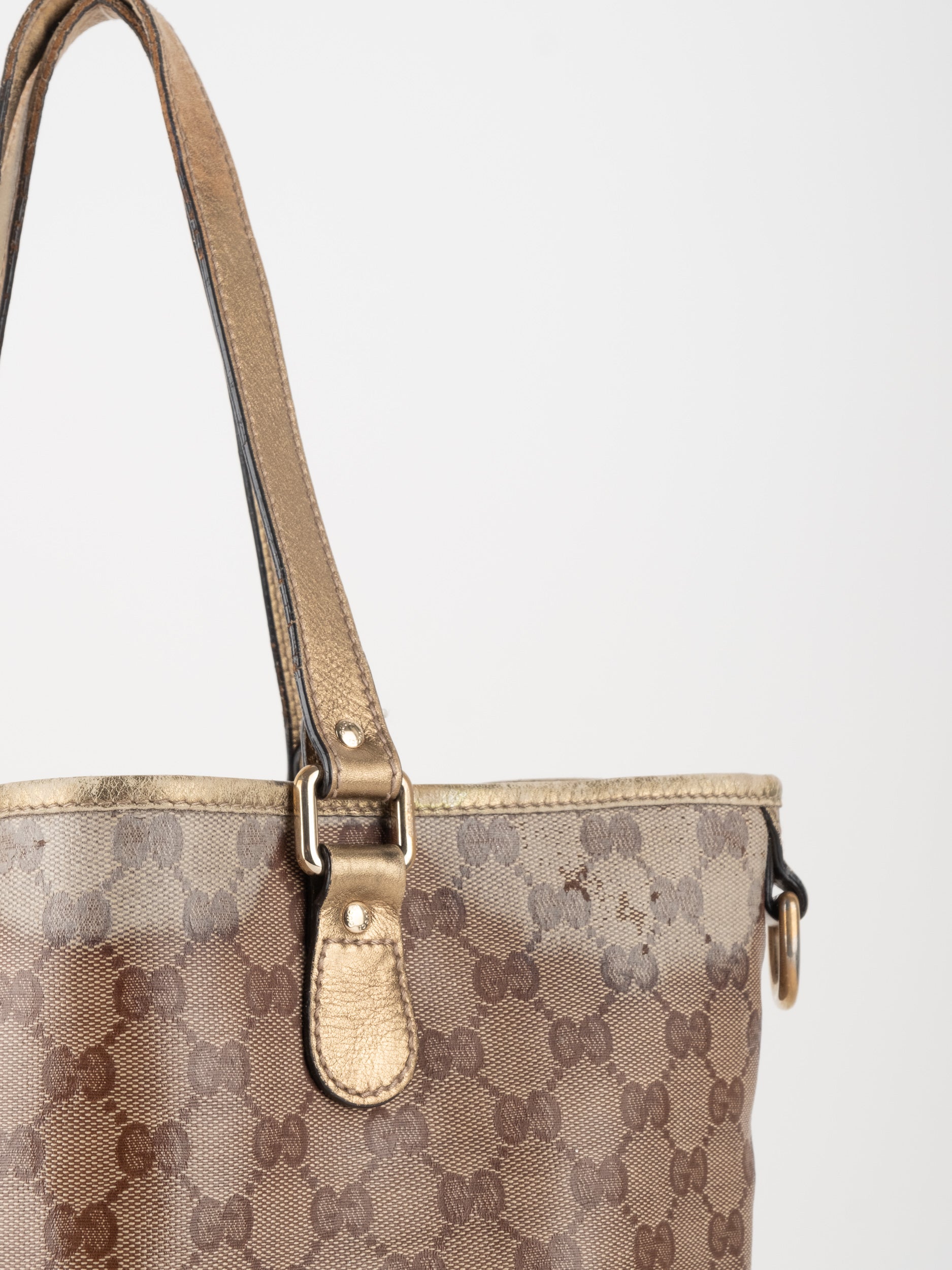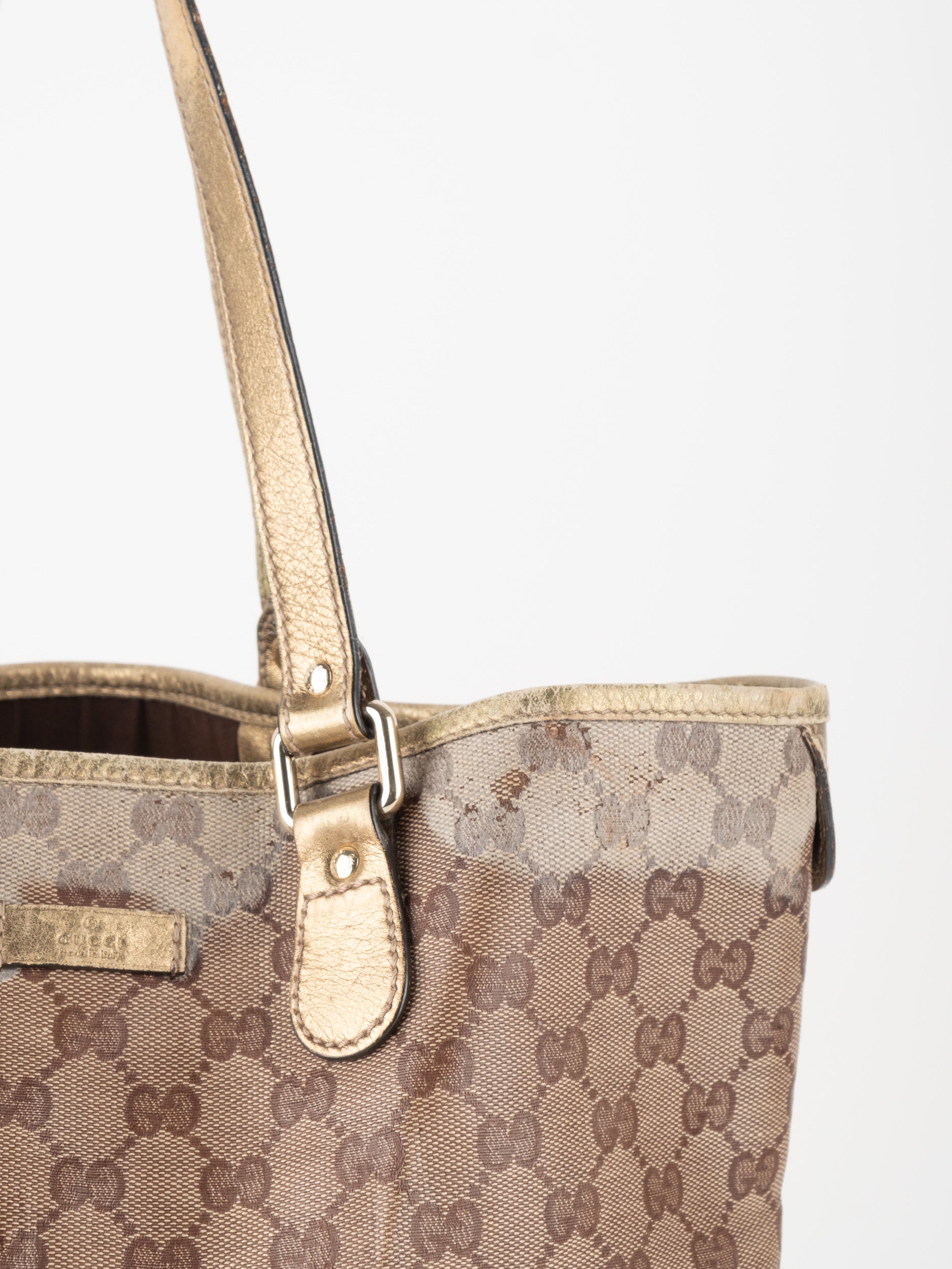 התיק עשוי קנבס בדוגמת GG בשילוב ידיות עור בגוון זהב בהיר. מבנה פתוח ומרווח לשימוש יומיומי.
