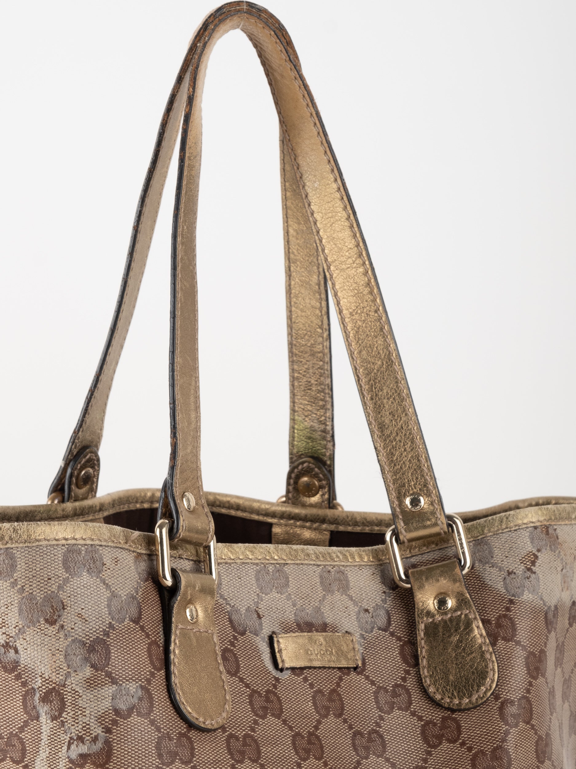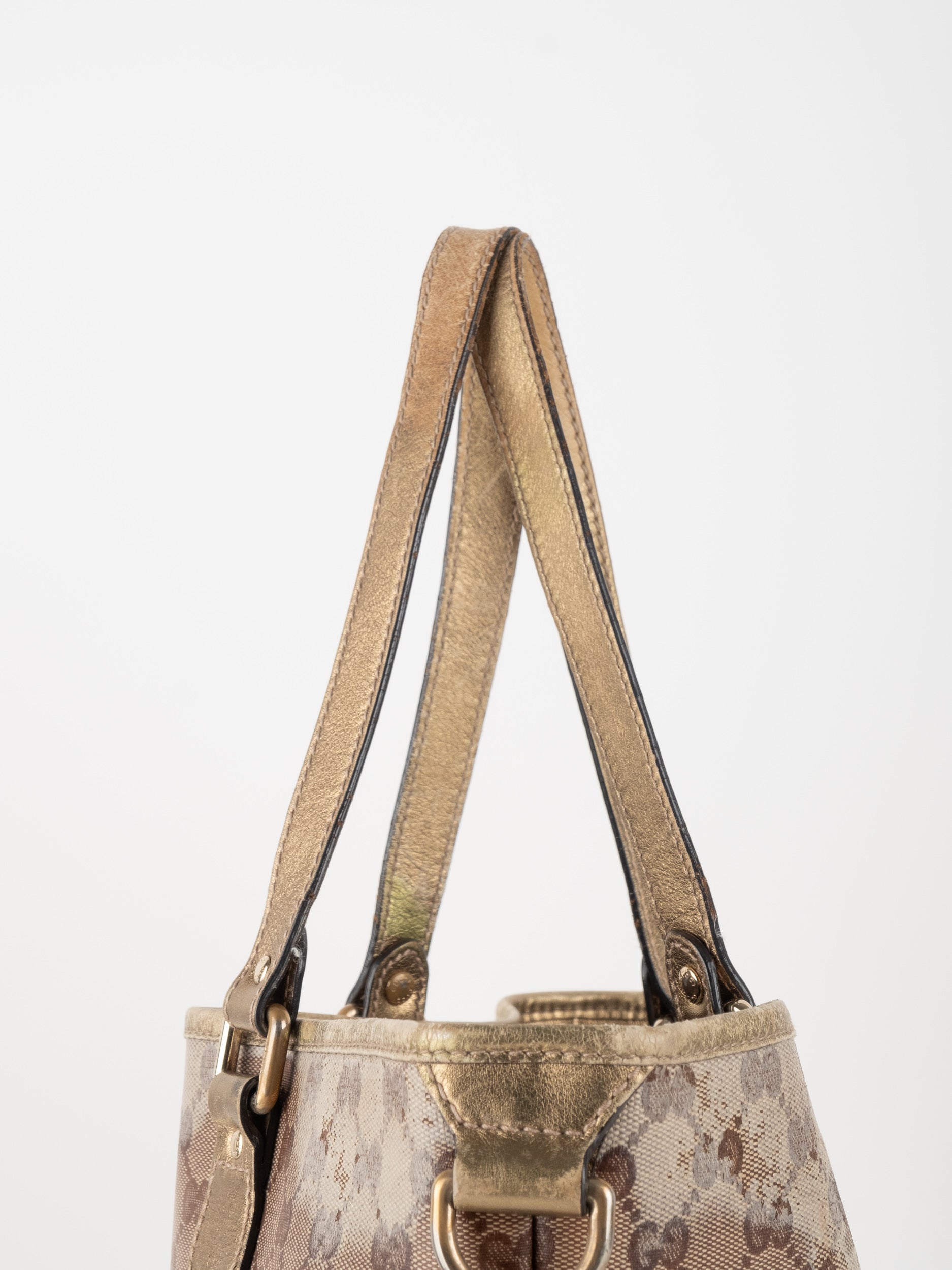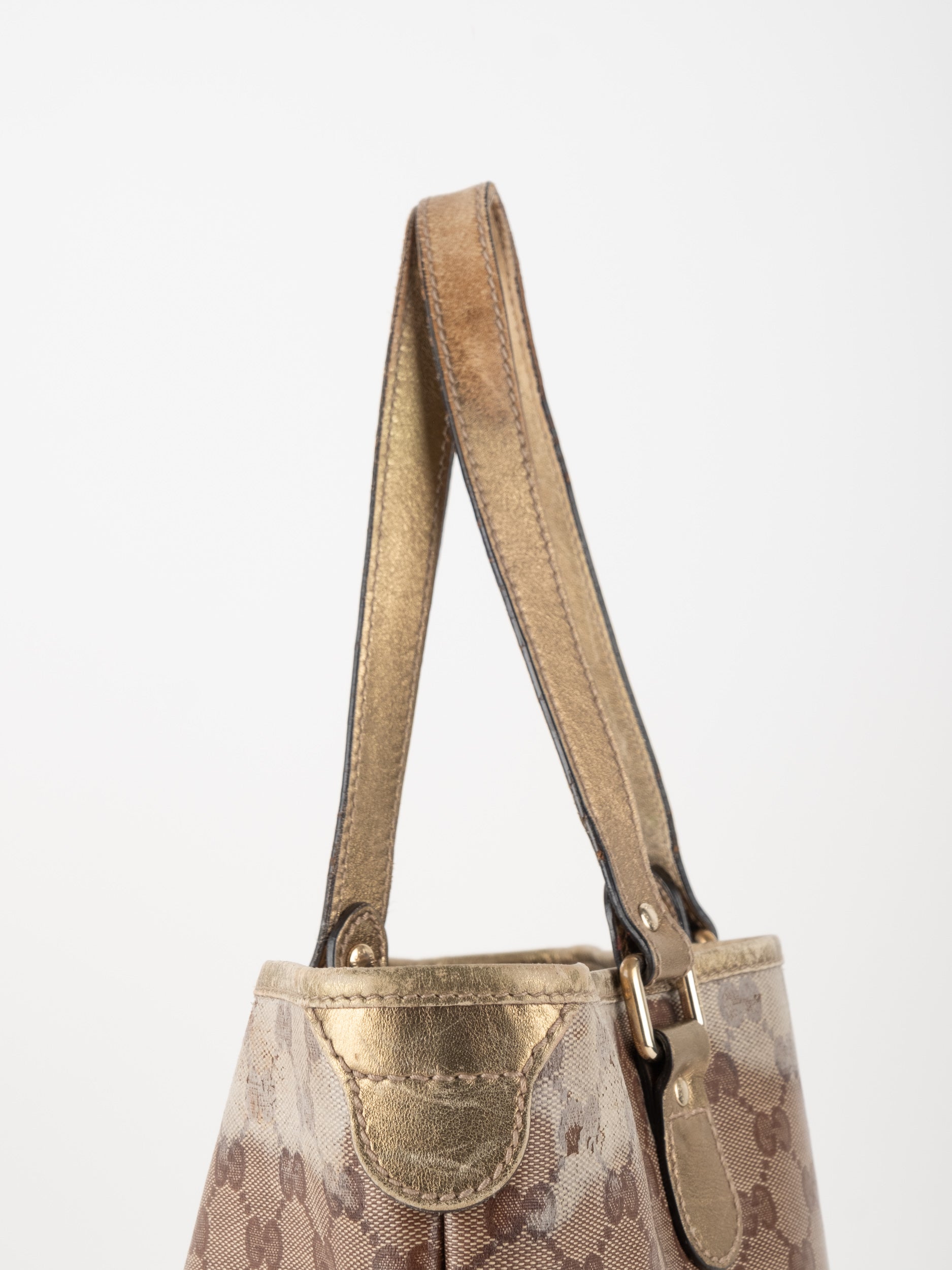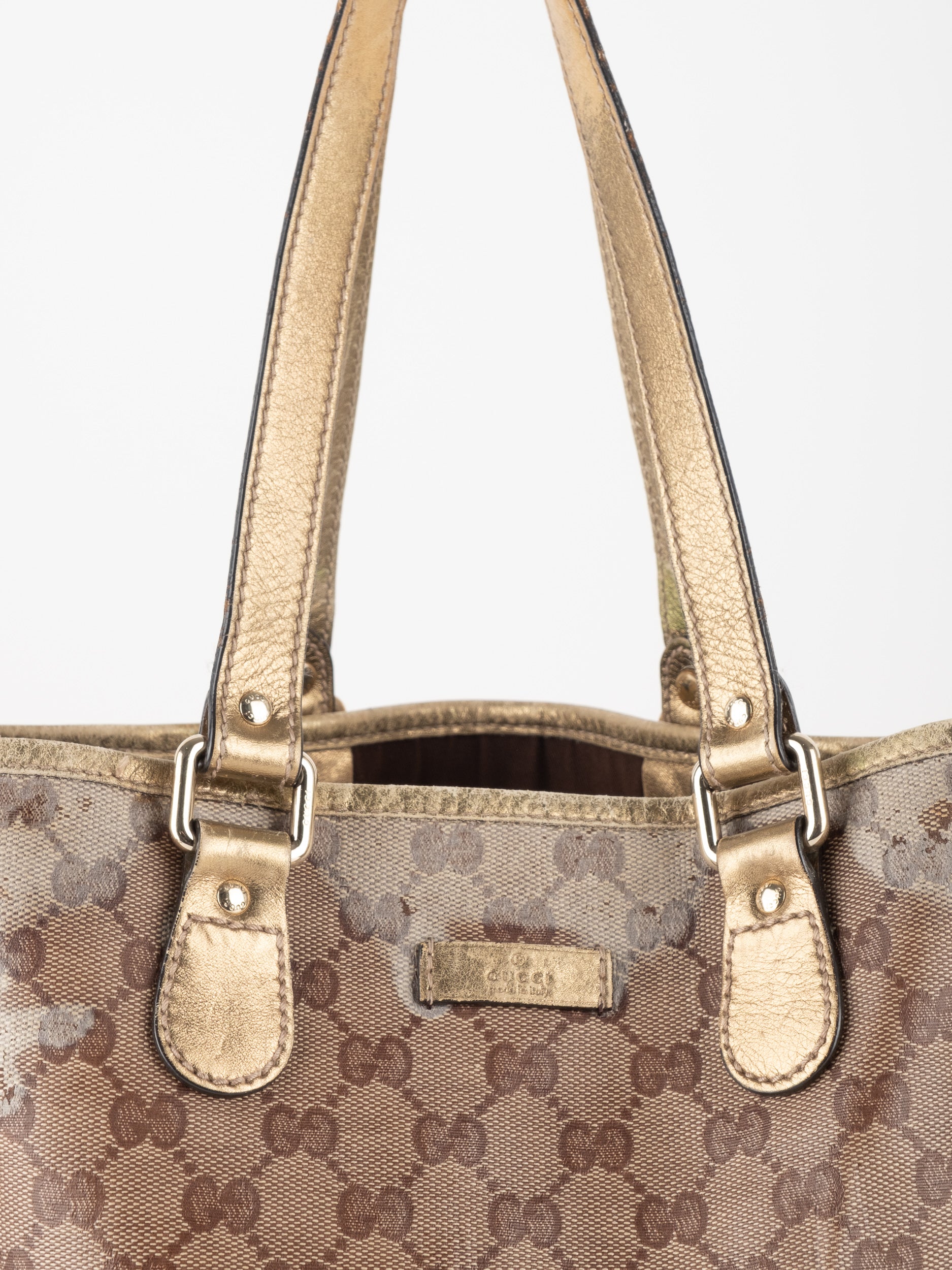 התיק עשוי קנבס בדוגמת GG בשילוב ידיות עור בגוון זהב בהיר. מבנה פתוח ומרווח לשימוש יומיומי.