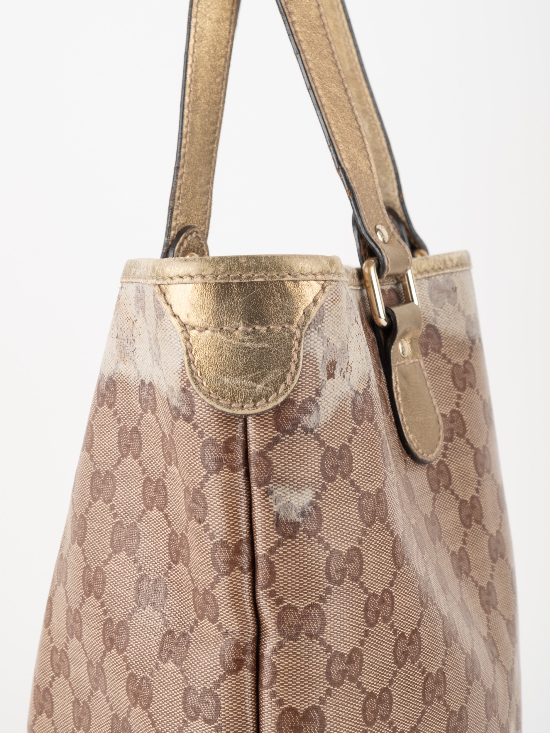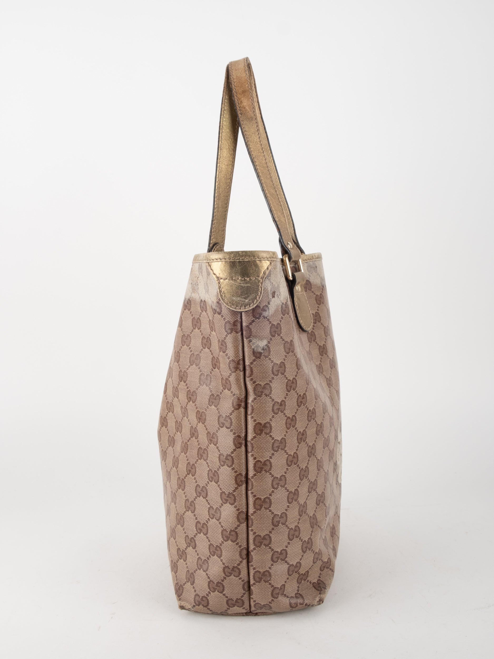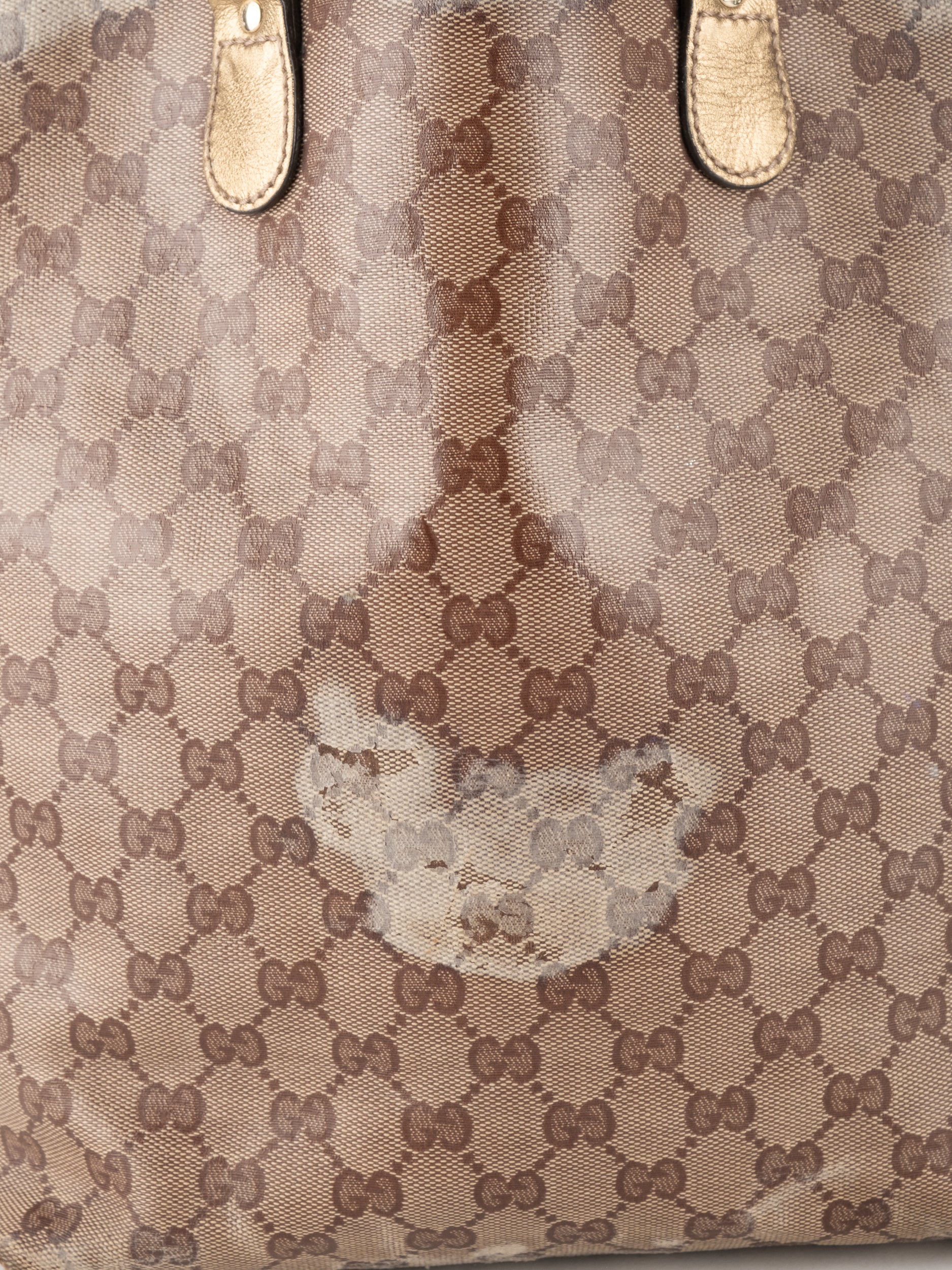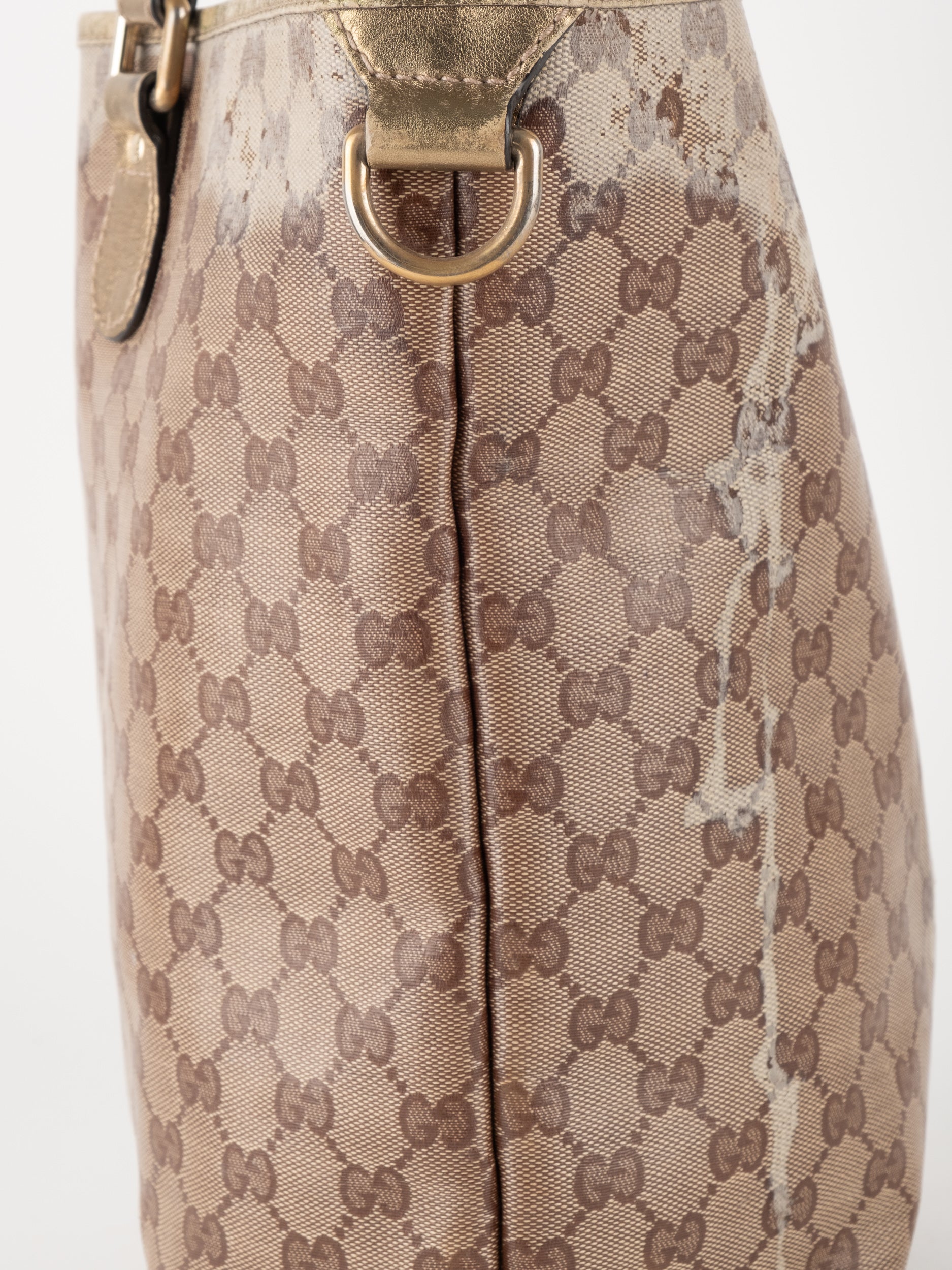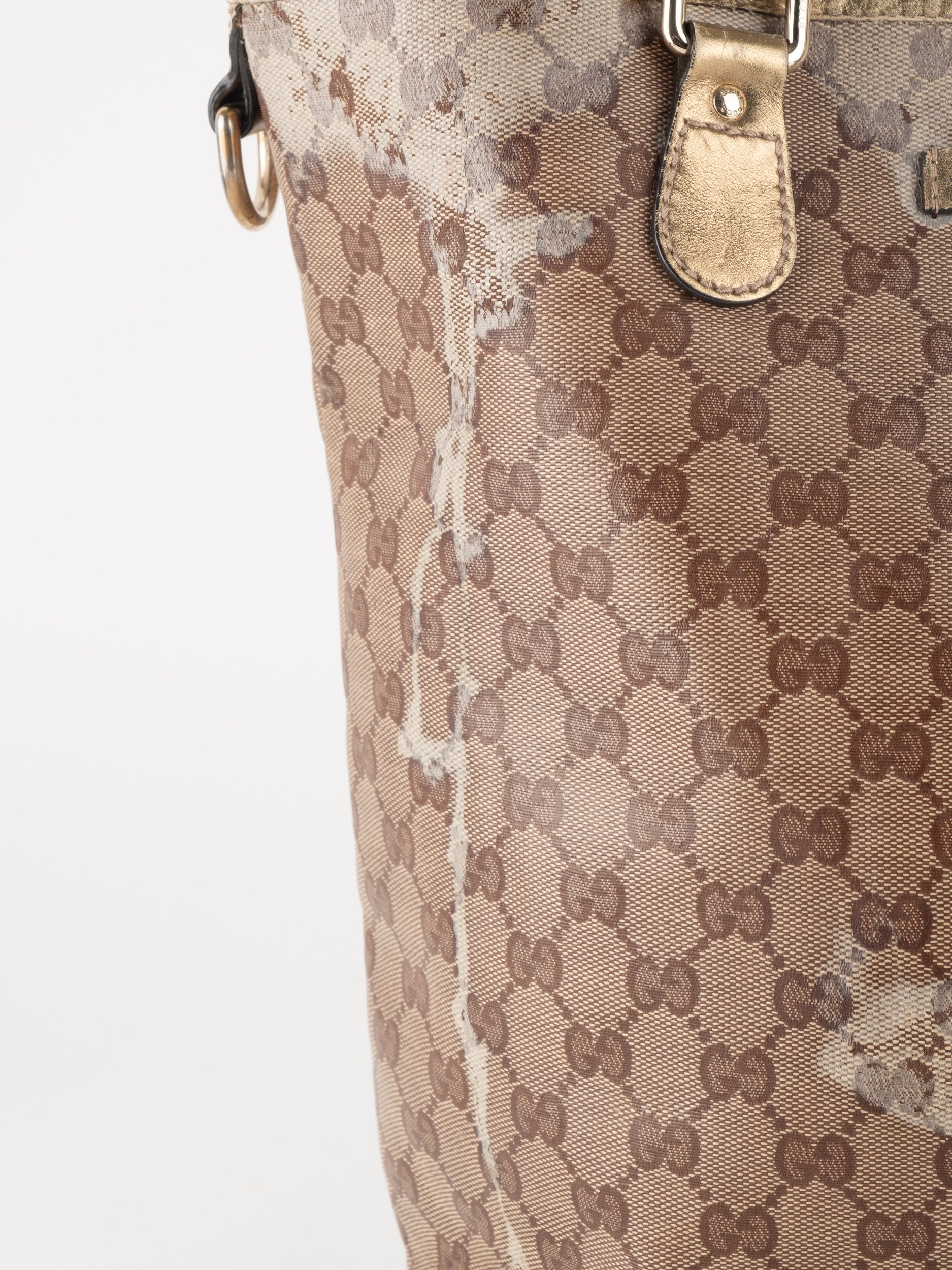התיק עשוי קנבס בדוגמת GG בשילוב ידיות עור בגוון זהב בהיר. מבנה פתוח ומרווח לשימוש יומיומי.