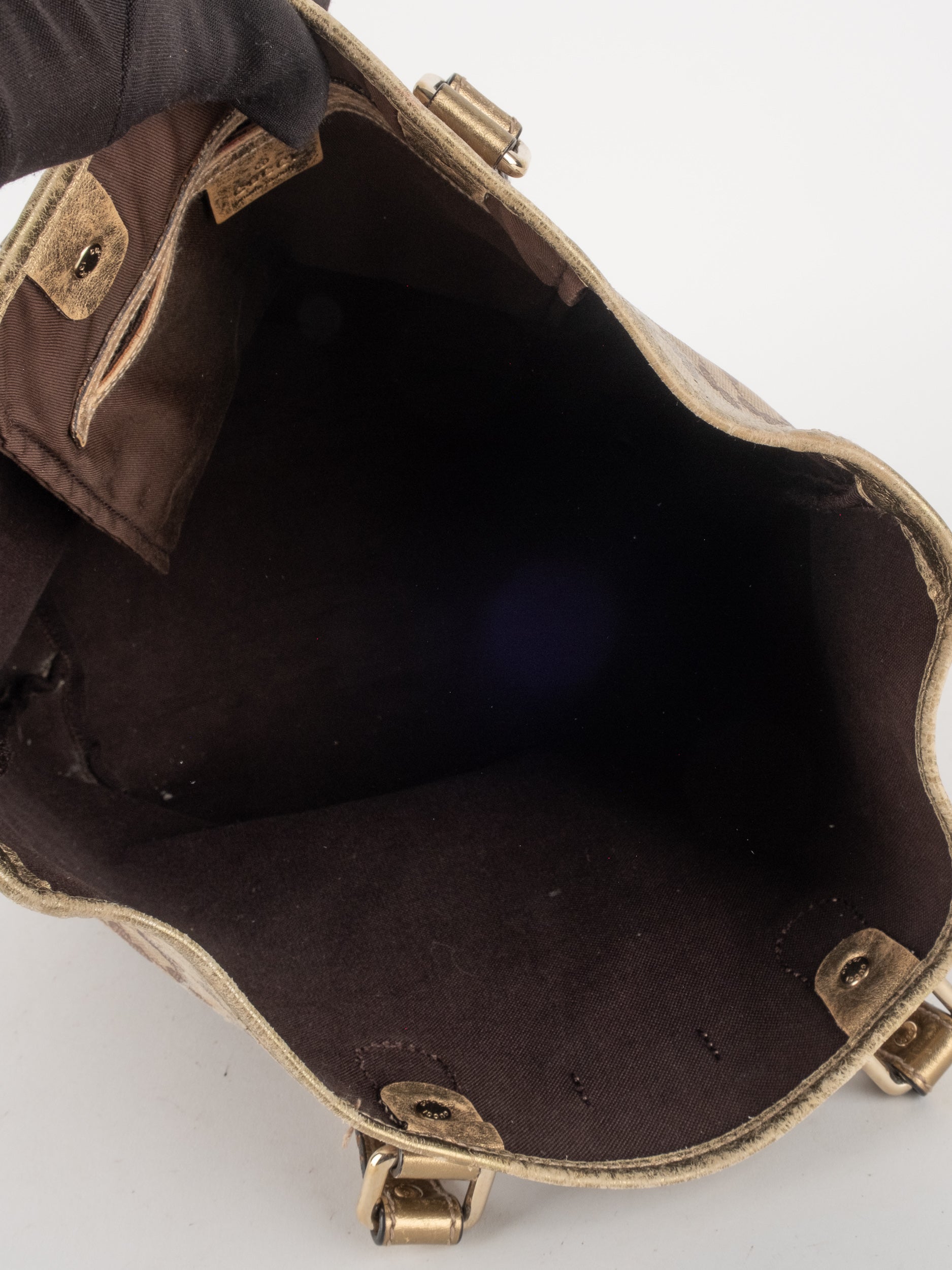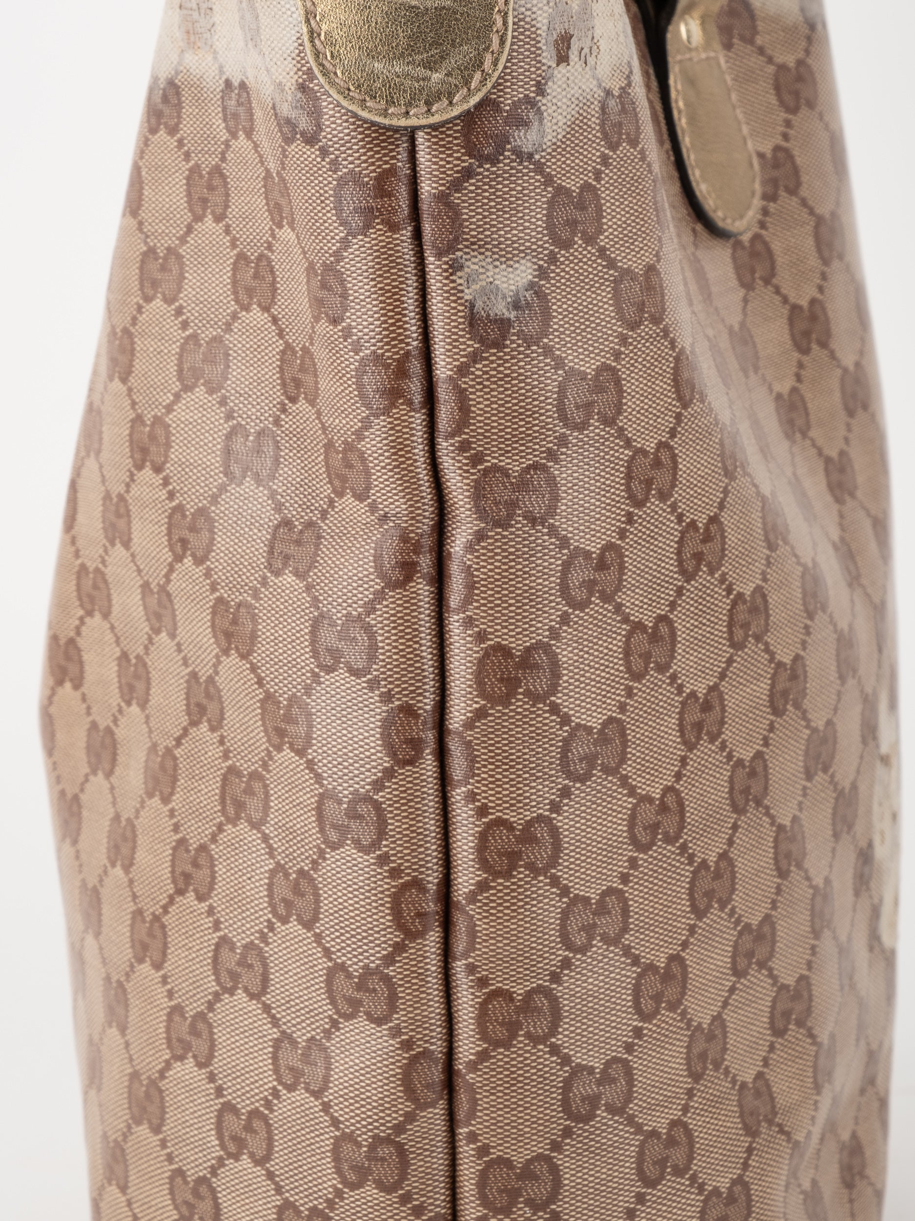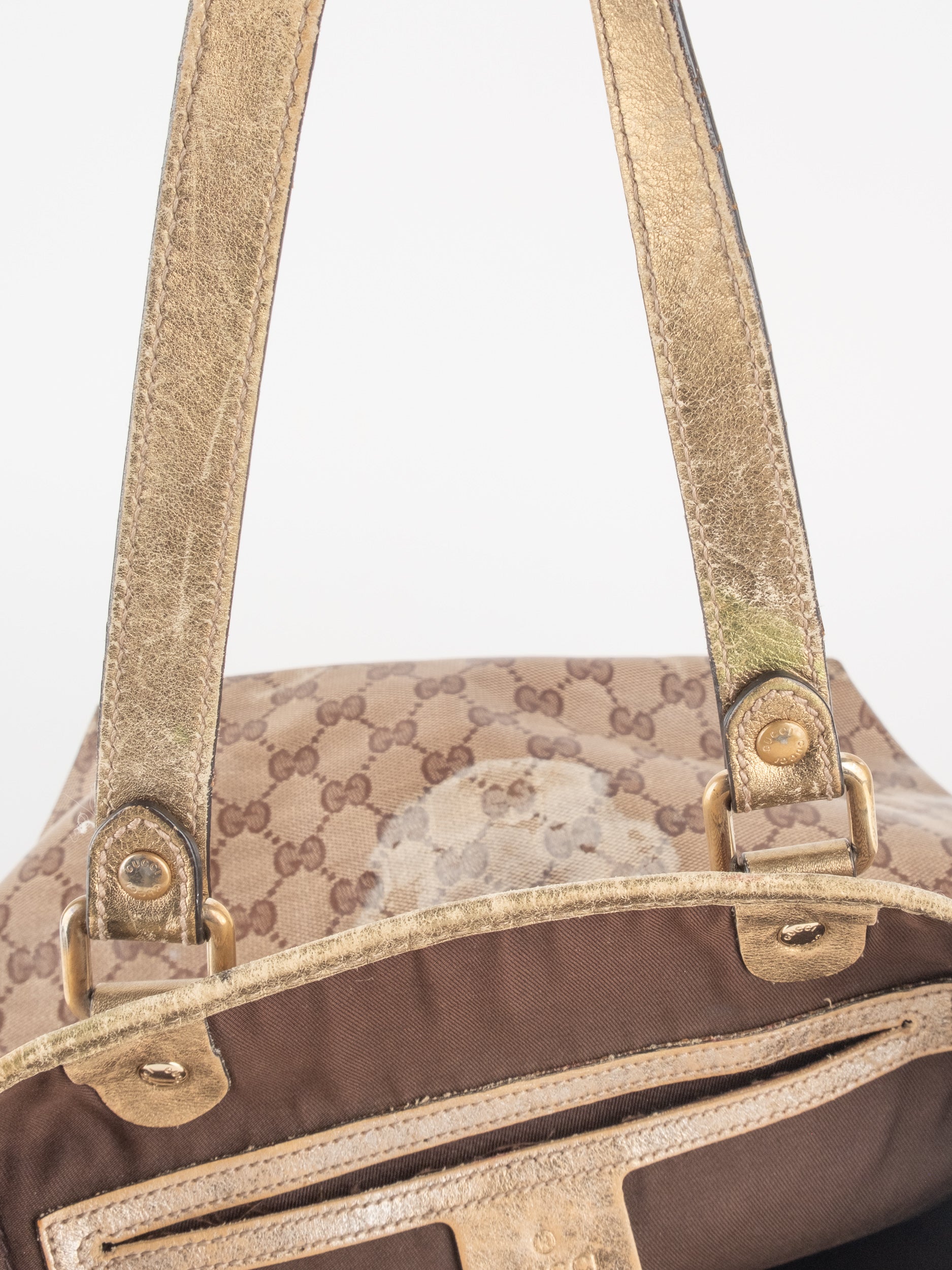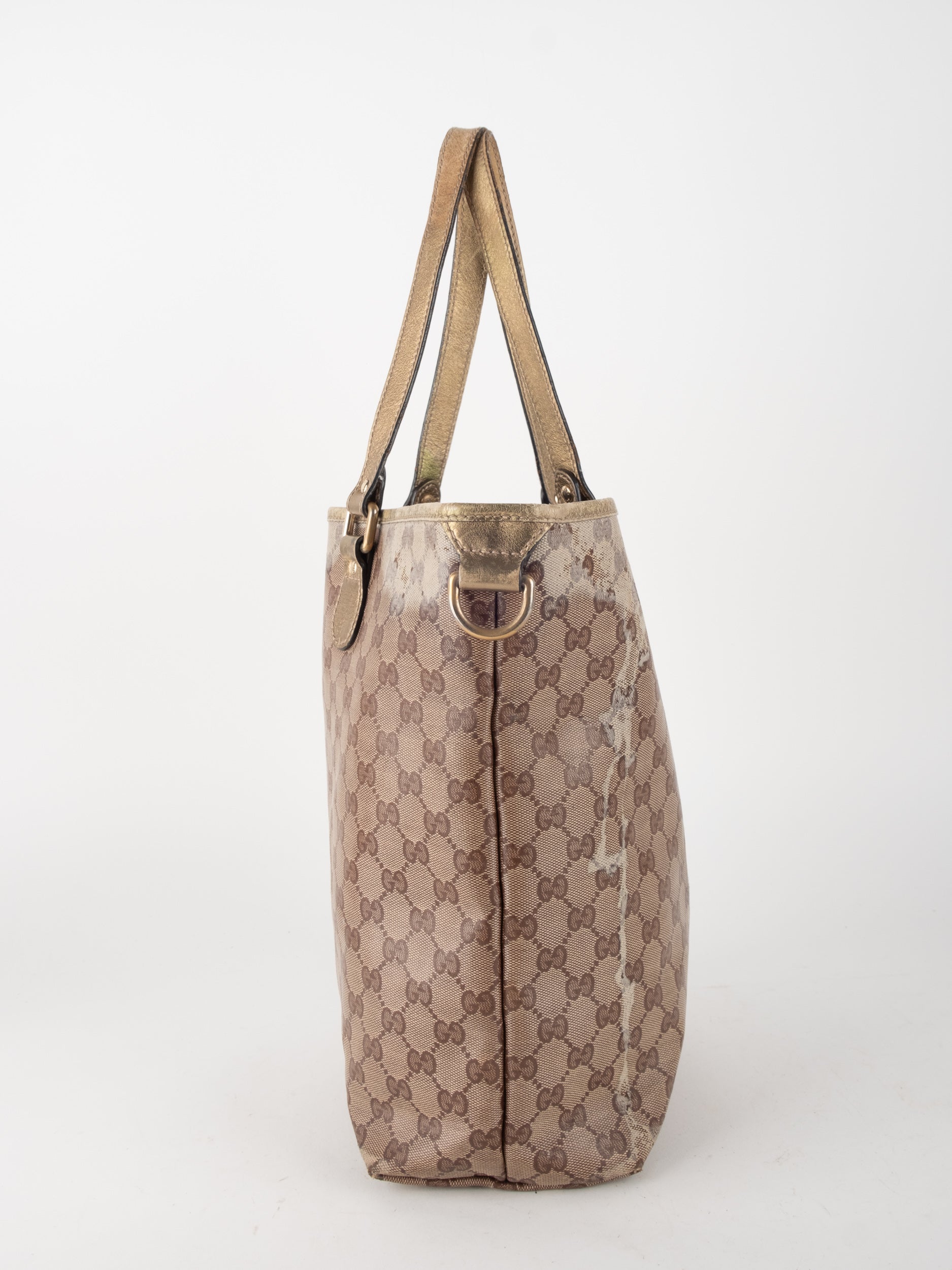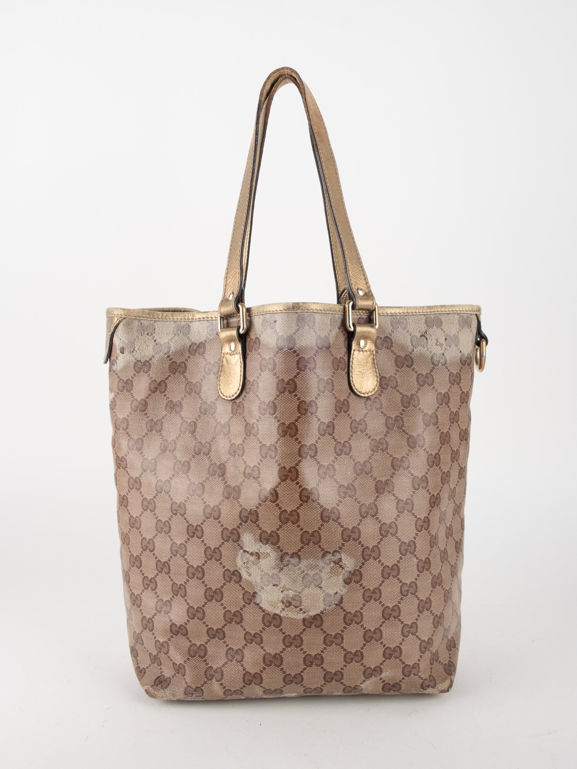 התיק עשוי קנבס בדוגמת GG בשילוב ידיות עור בגוון זהב בהיר. מבנה פתוח ומרווח לשימוש יומיומי.