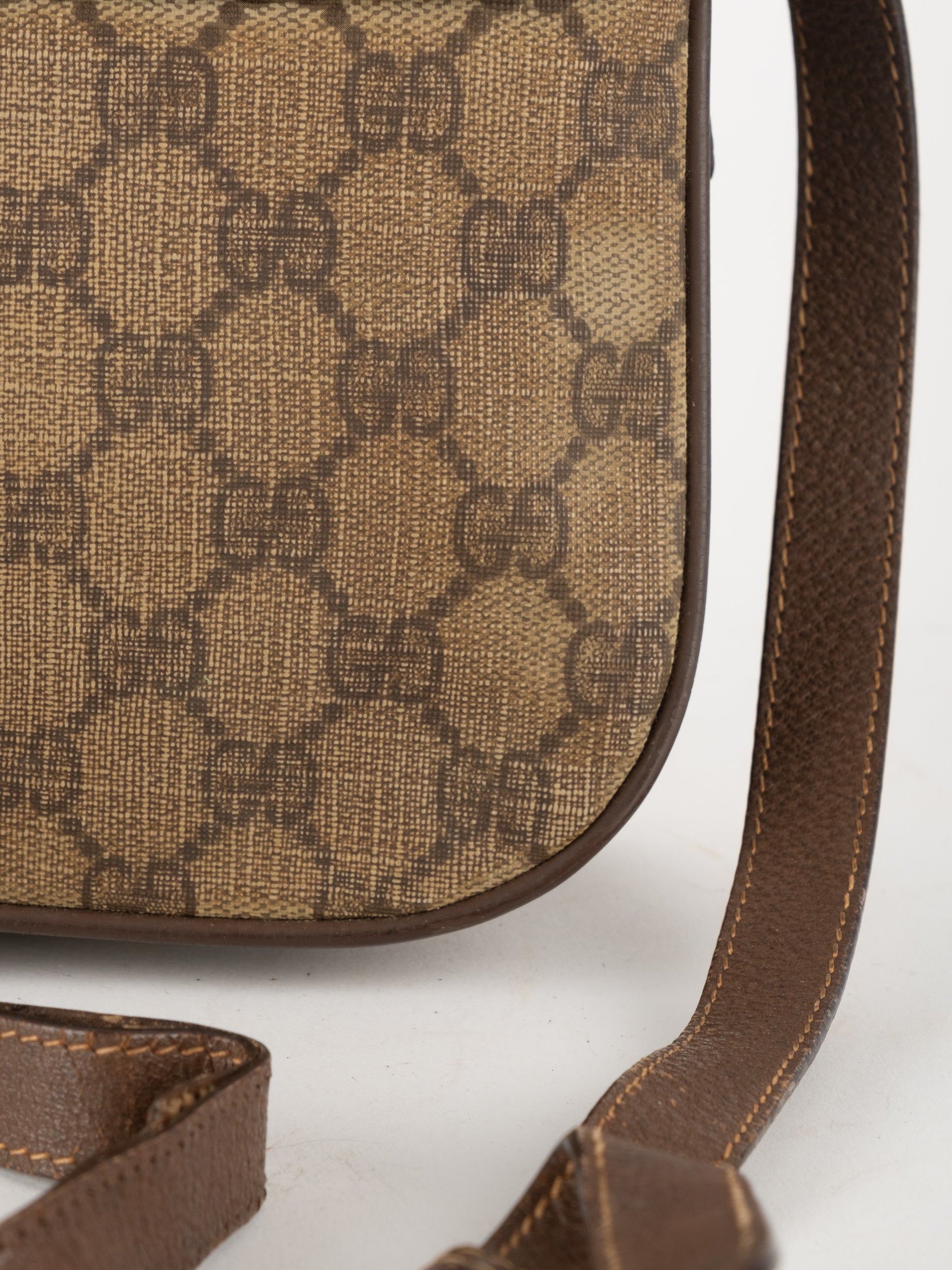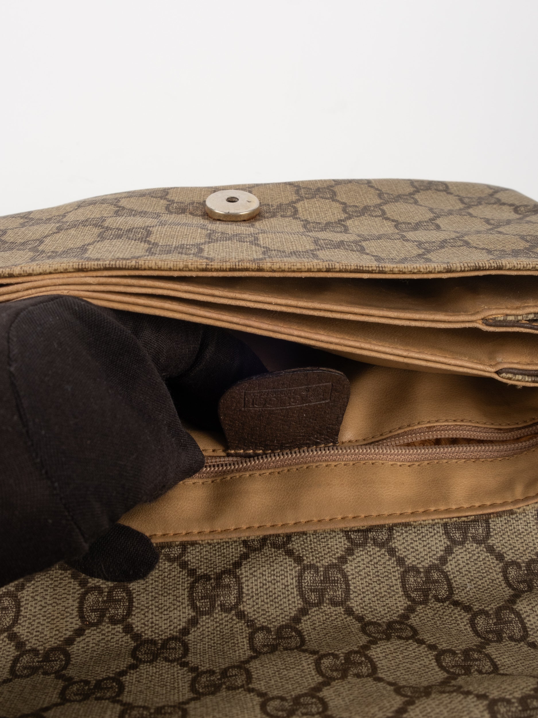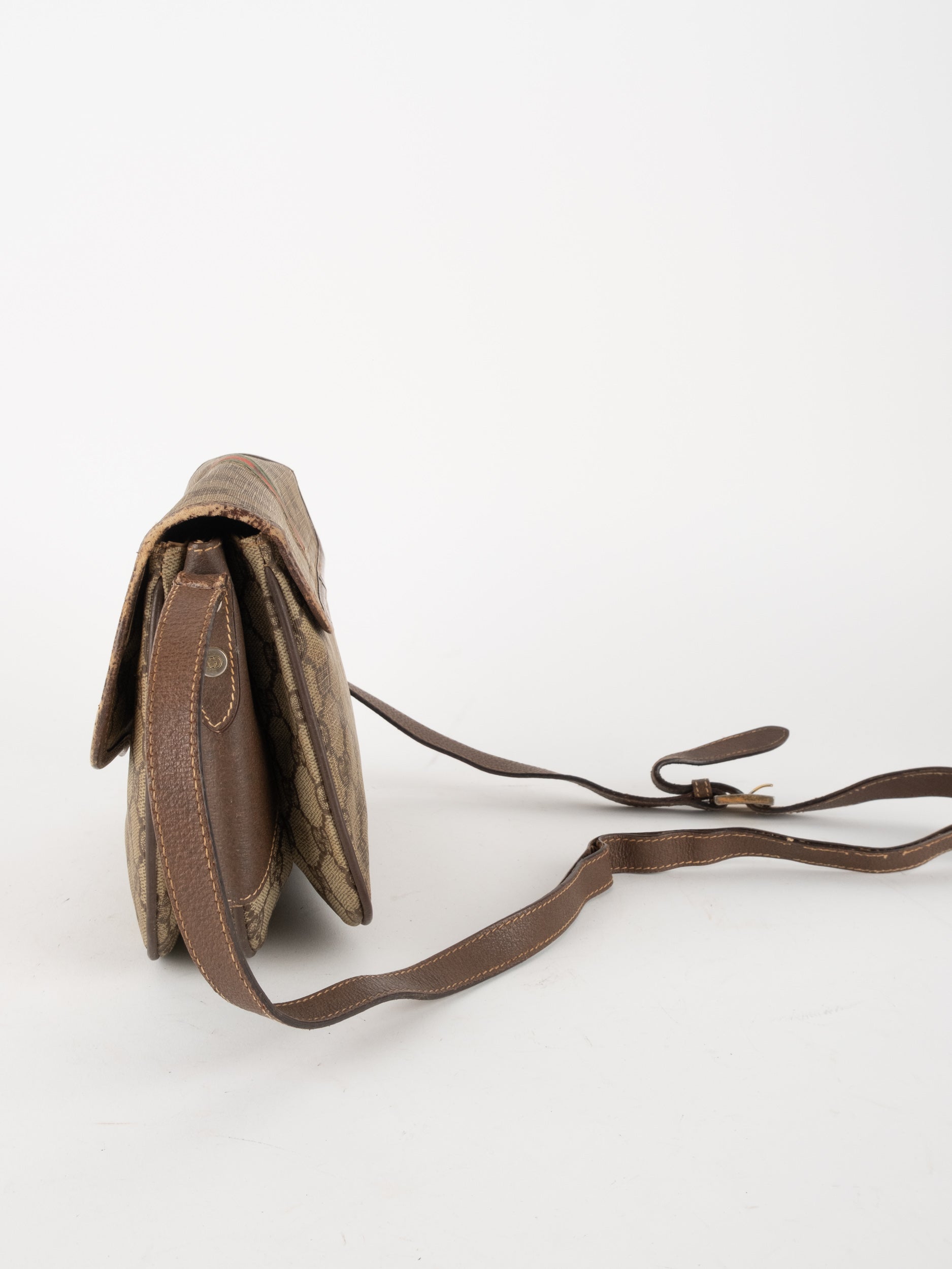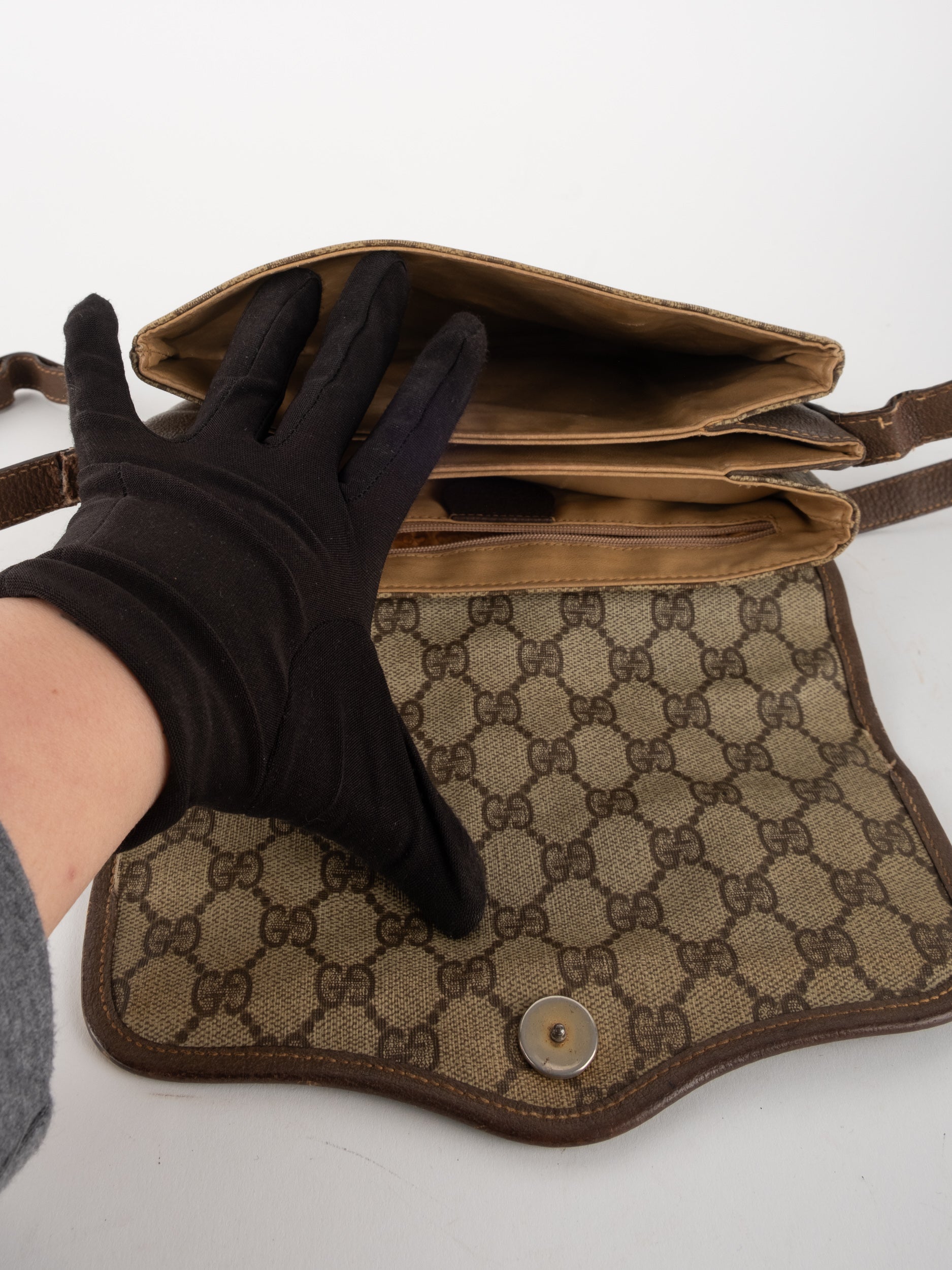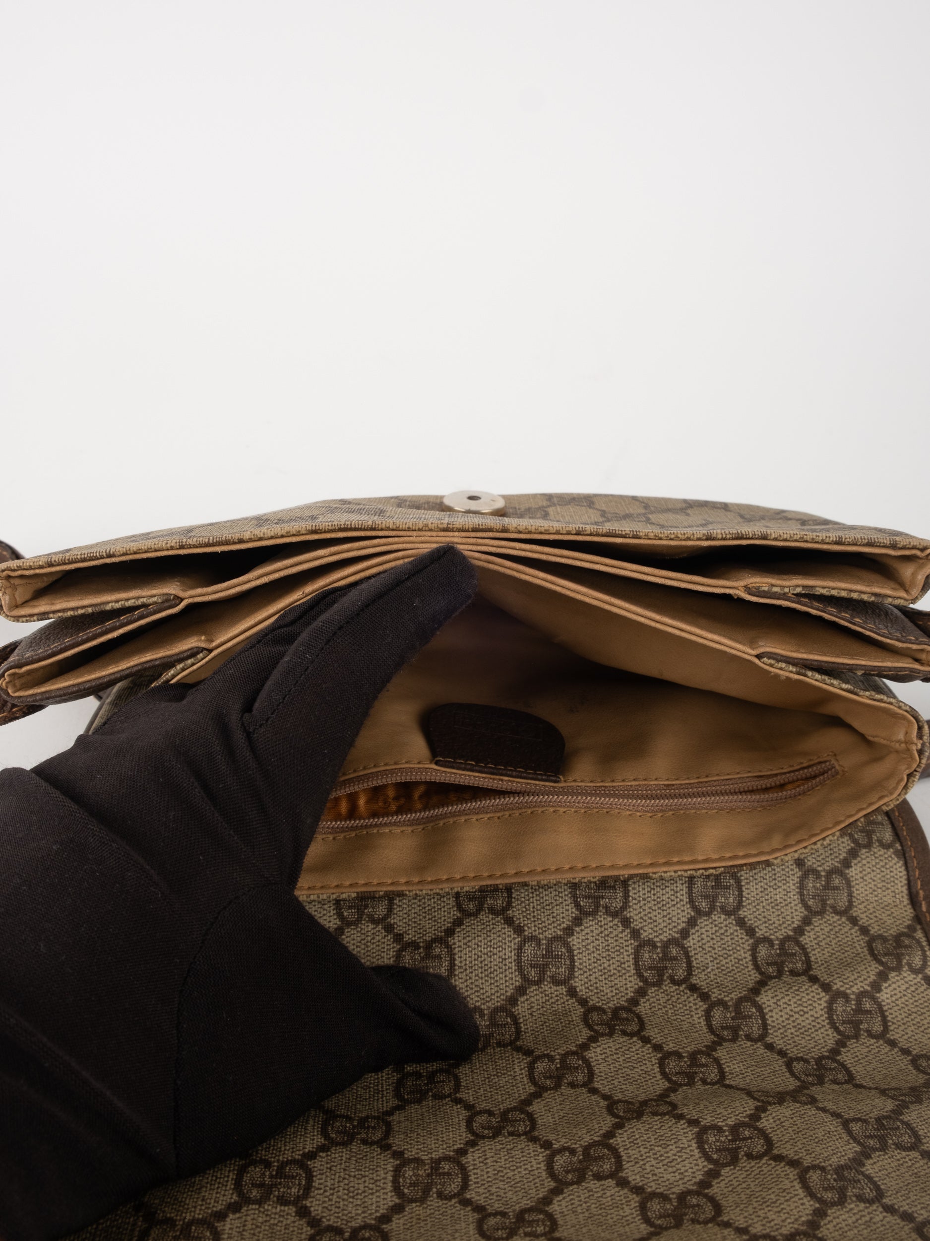תיק צד של גוצ'י וינטג' יד שנייה בדוגמת GG Supreme בגווני בז' וחום, עם פס ירוק־אדום אייקוני במרכז ועיטורי עור חומים. דגם קלאסי שמחבר בין מורשת איטלקית מובהקת לאמירה אופנתית ברורה. הצללית הקומפקטית והסגירה הקדמית יוצרים מראה נשי, מדויק ולא מתאמץ. זהו תיק שמעניק תחושת סטייל בטוח ומעודן, כזה שמוסיף עניין לכל לוק יומיומי ומשדר הבנה אמיתית באופנה.