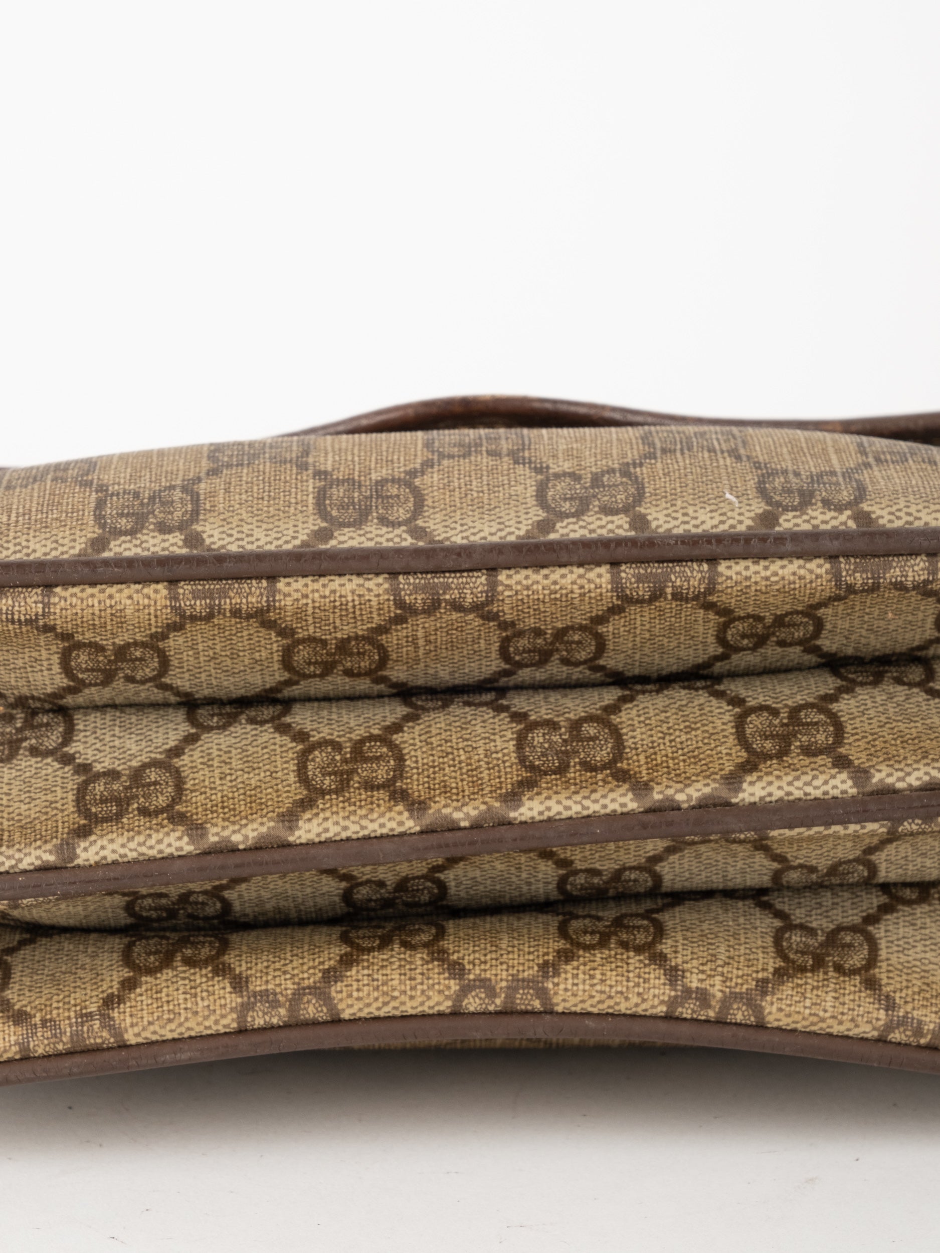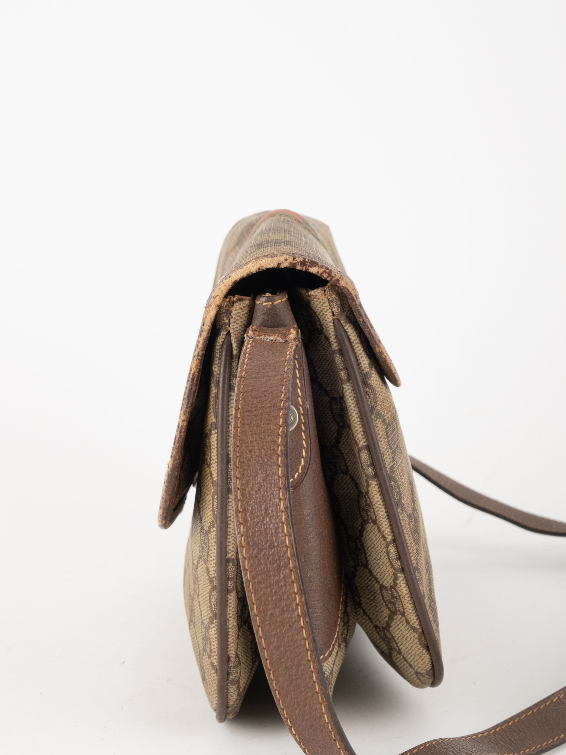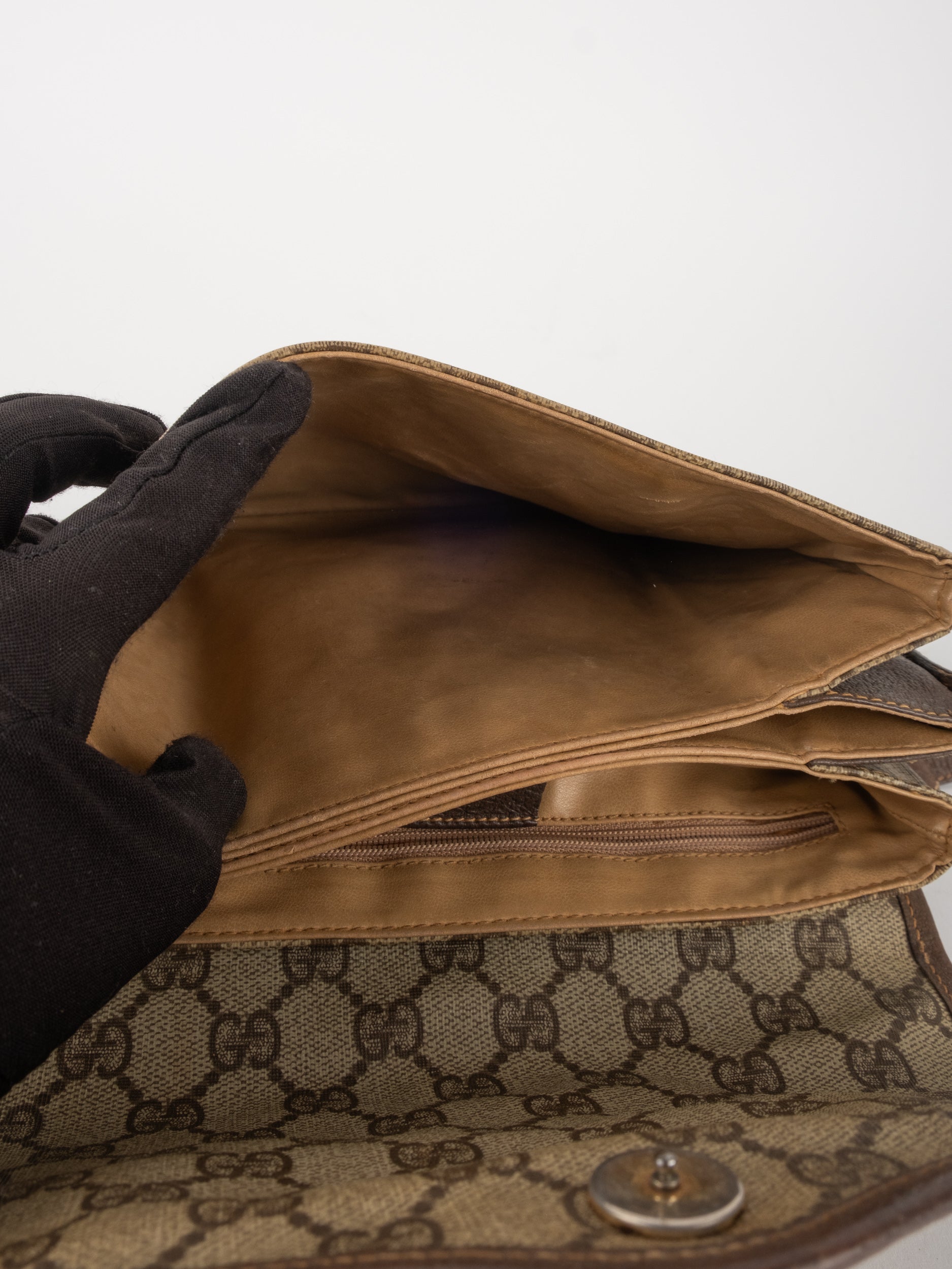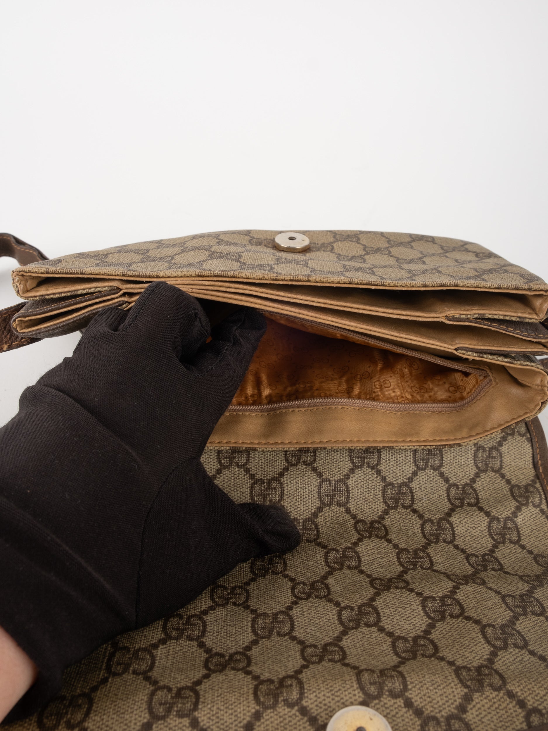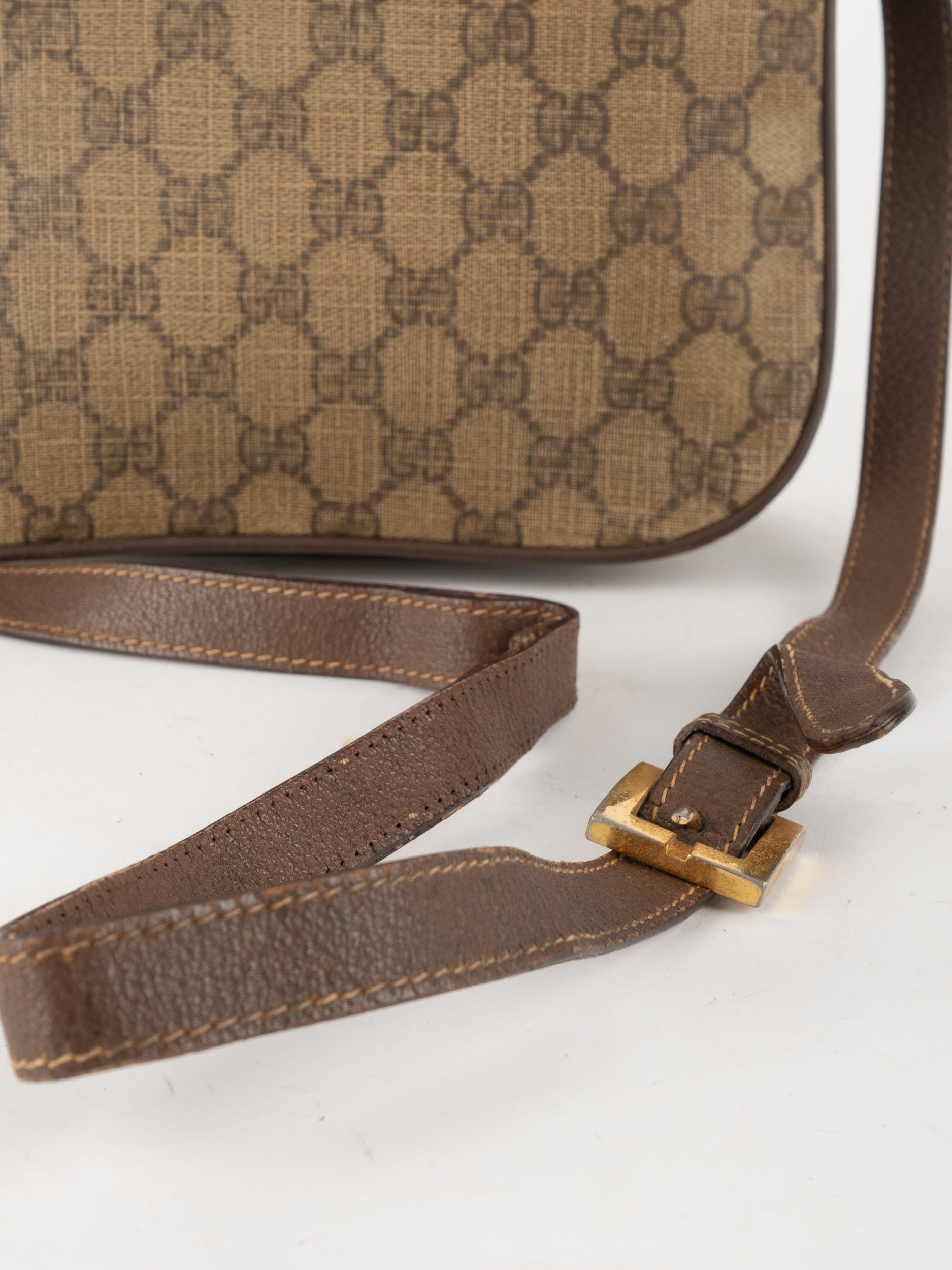 תיק צד של גוצ'י וינטג' יד שנייה בדוגמת GG Supreme בגווני בז' וחום, עם פס ירוק־אדום אייקוני במרכז ועיטורי עור חומים. דגם קלאסי שמחבר בין מורשת איטלקית מובהקת לאמירה אופנתית ברורה. הצללית הקומפקטית והסגירה הקדמית יוצרים מראה נשי, מדויק ולא מתאמץ. זהו תיק שמעניק תחושת סטייל בטוח ומעודן, כזה שמוסיף עניין לכל לוק יומיומי ומשדר הבנה אמיתית באופנה.