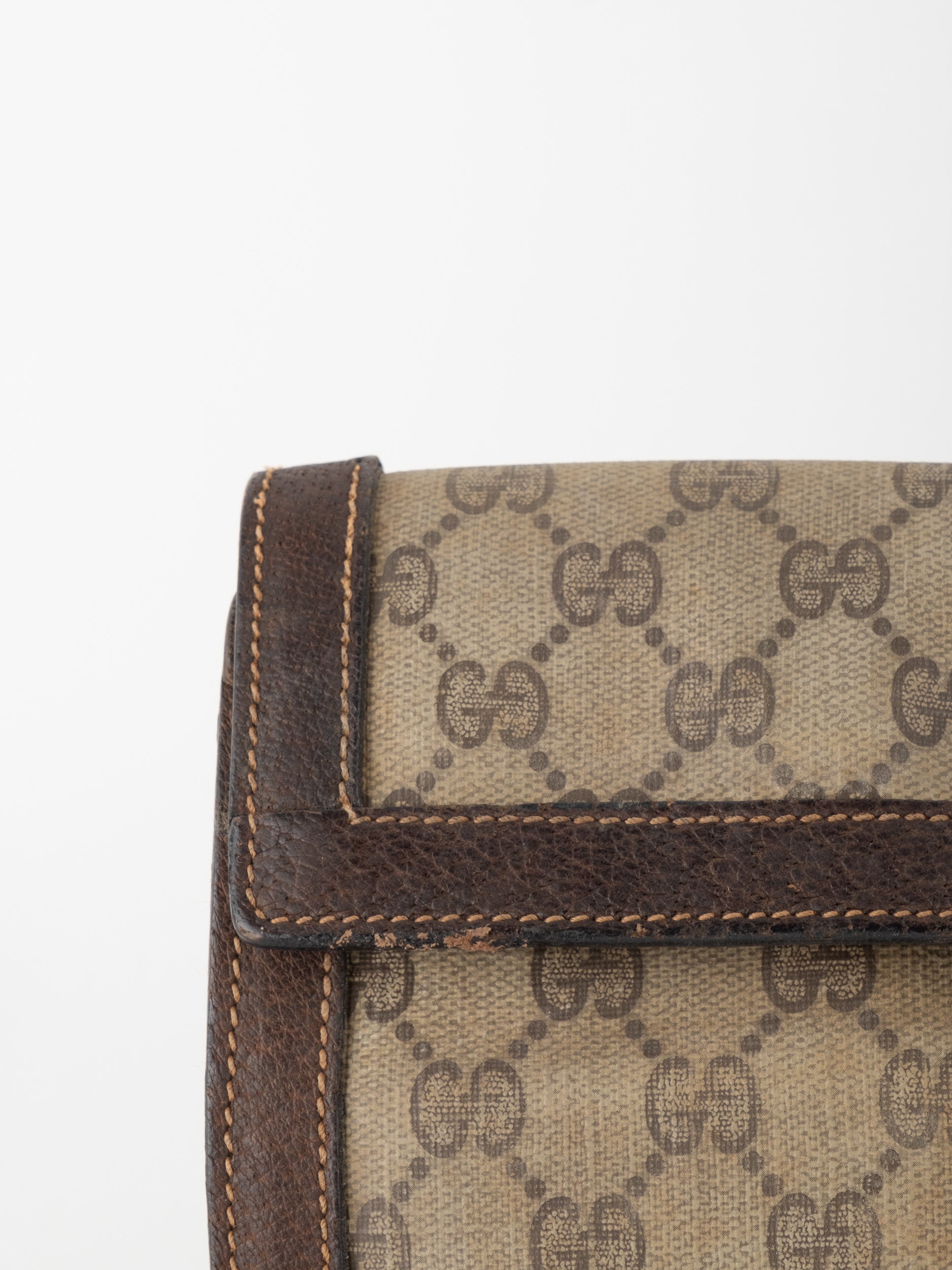 הארנק עשוי קנבס בדוגמת GG בגווני בז’ עם עיטורי עור חום כהה. סגירה קדמית באמצעות לשונית עור וכפתור לחיצה מוזהב. מבנה מתקפל עם חלוקה פנימית נוחה לארגון כרטיסים, שטרות ומסמכים קטנים. יכול לשמש כארנק גדול או כקלאץ’ קטן ואלגנטי.