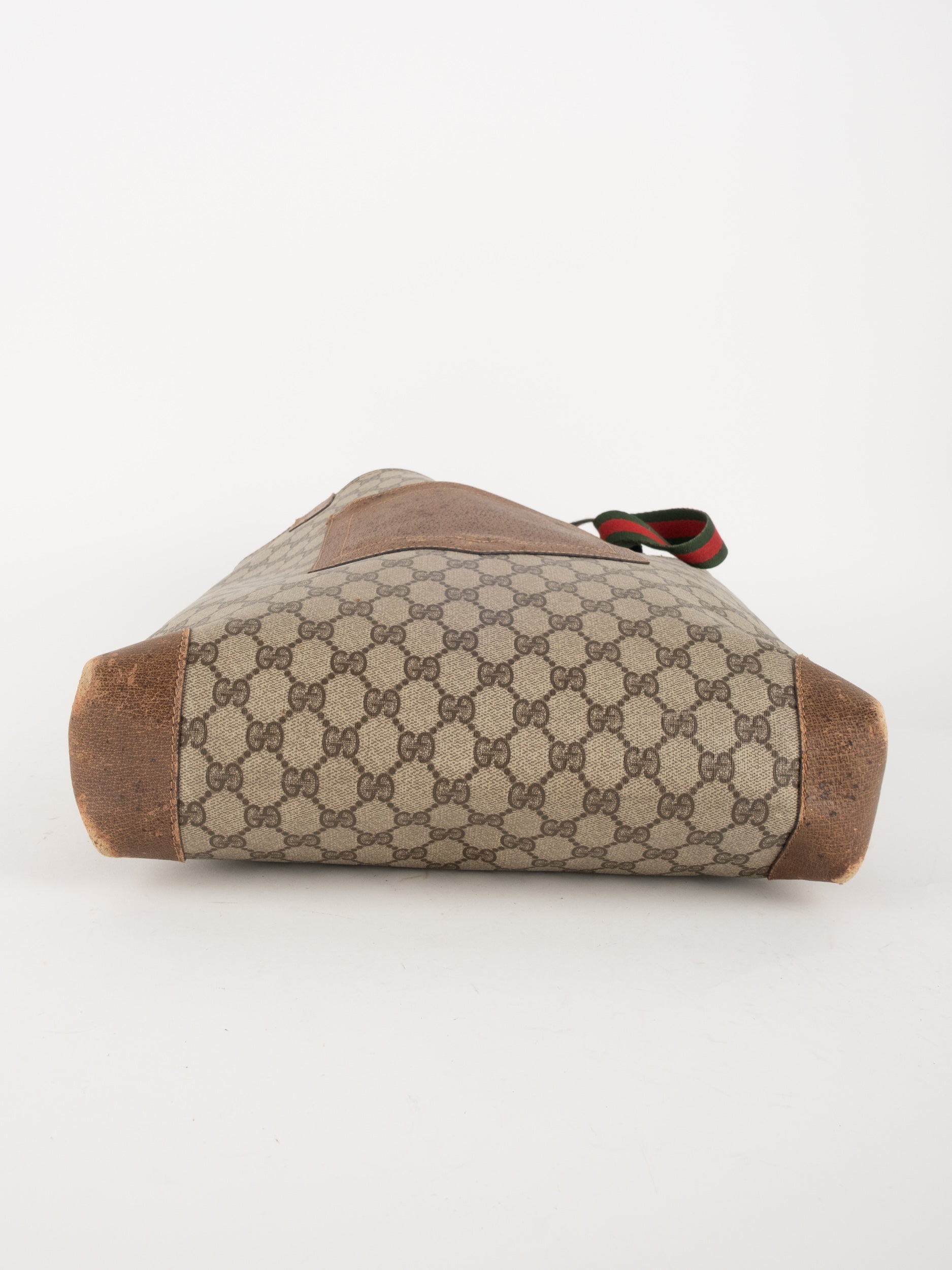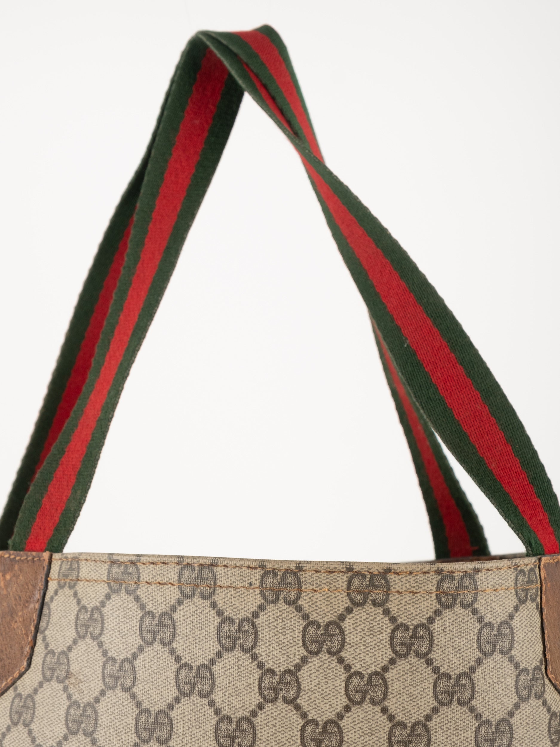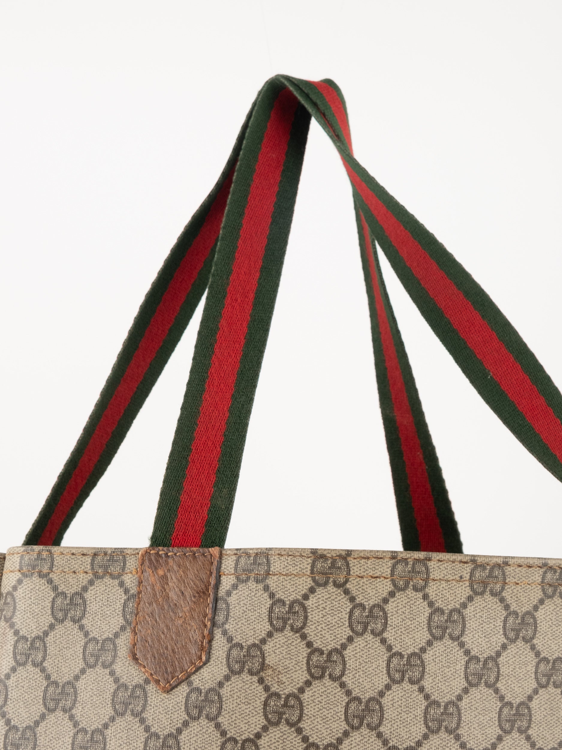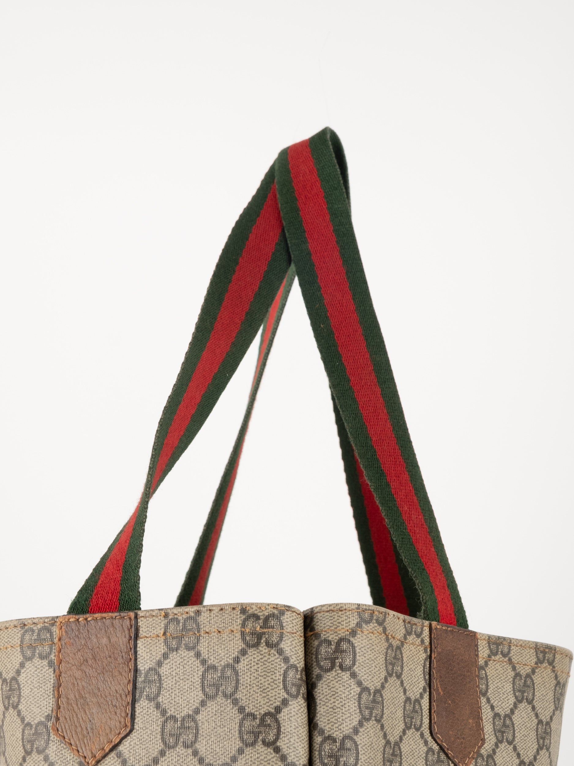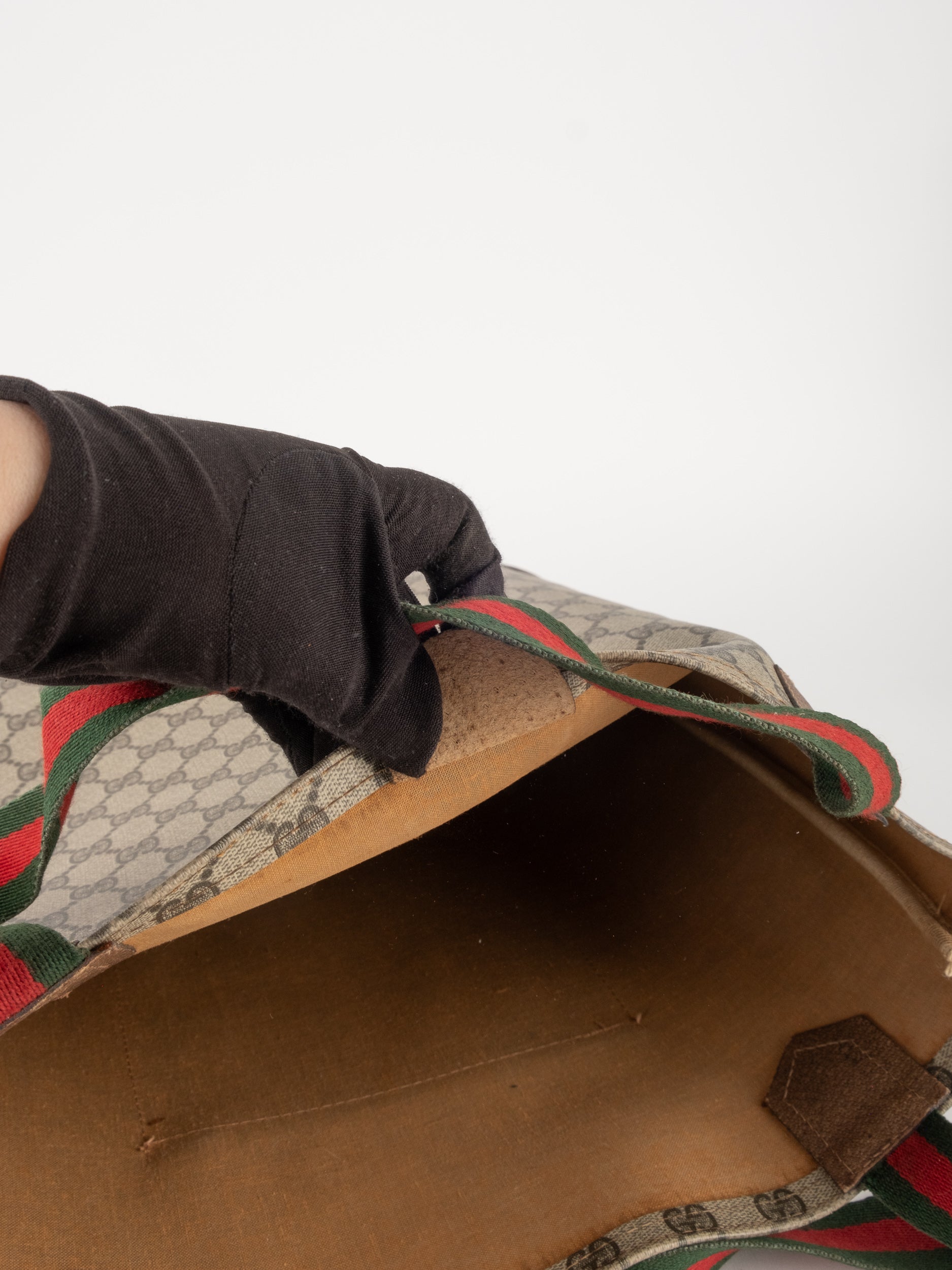 גוצ'י GUCCI וינטג' יד שנייה בדוגמת GG Supreme בגווני בז' וחום, עם כיס קדמי מעור חום ורצועות בד אייקוניות בגווני ירוק ואדום. טוט יומיומי גדול ובעל נוכחות, המשלב אופי וינטג'י עם אמירה אופנתית ברורה.