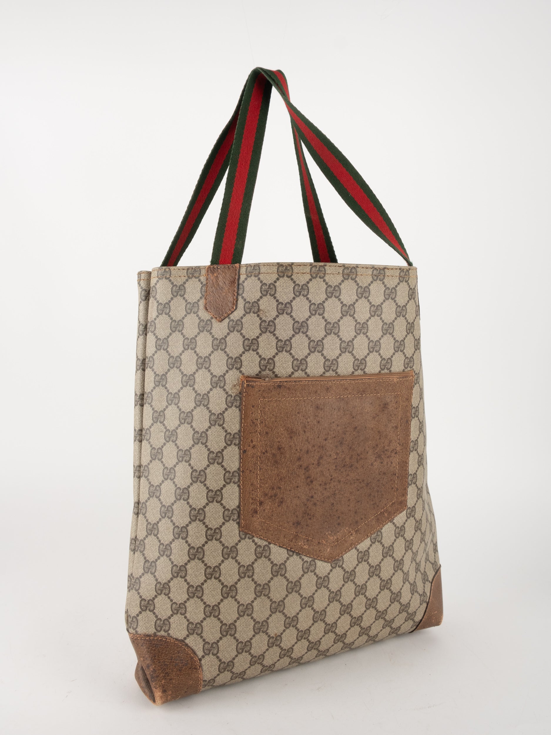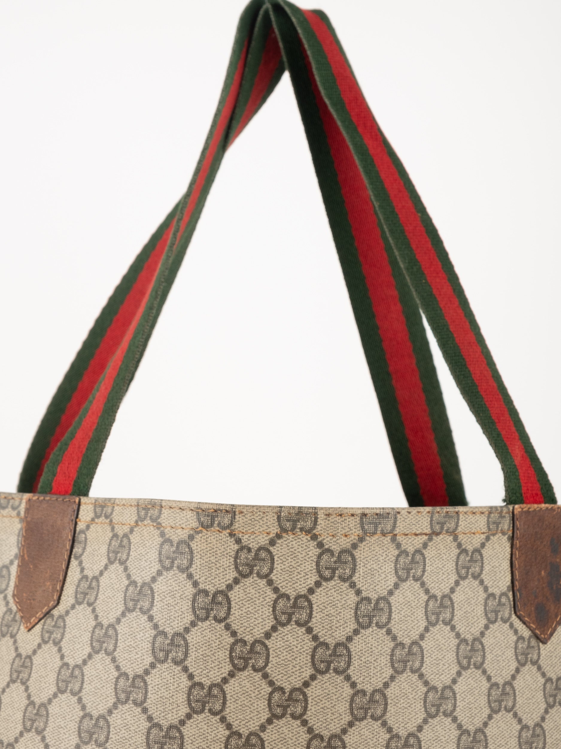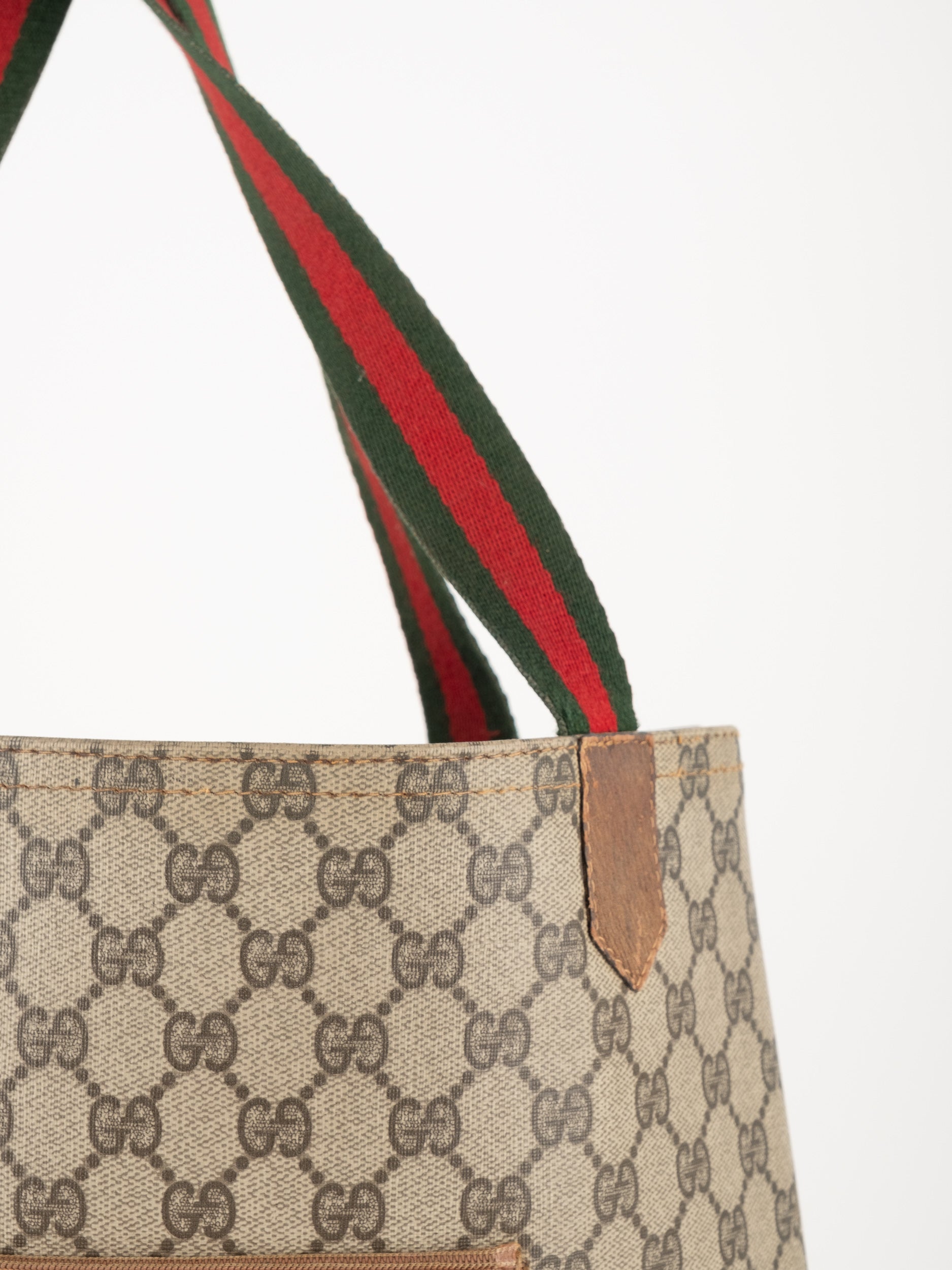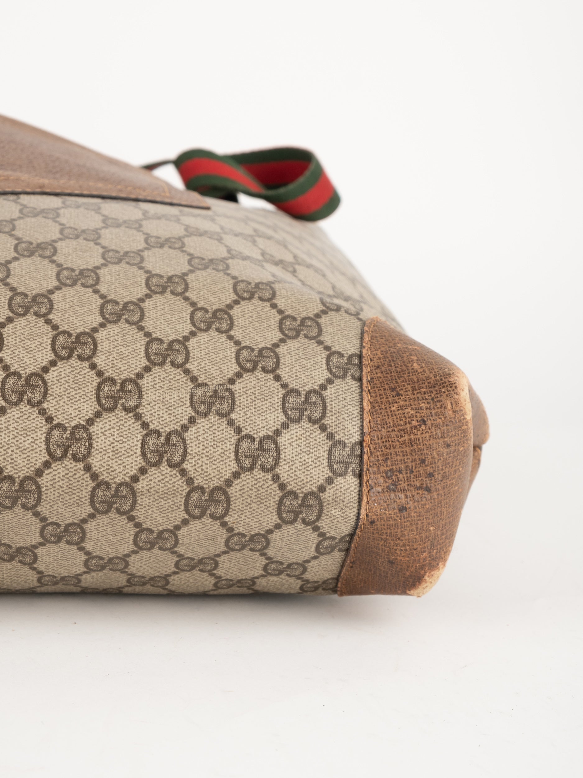 גוצ'י GUCCI וינטג' יד שנייה בדוגמת GG Supreme בגווני בז' וחום, עם כיס קדמי מעור חום ורצועות בד אייקוניות בגווני ירוק ואדום. טוט יומיומי גדול ובעל נוכחות, המשלב אופי וינטג'י עם אמירה אופנתית ברורה.