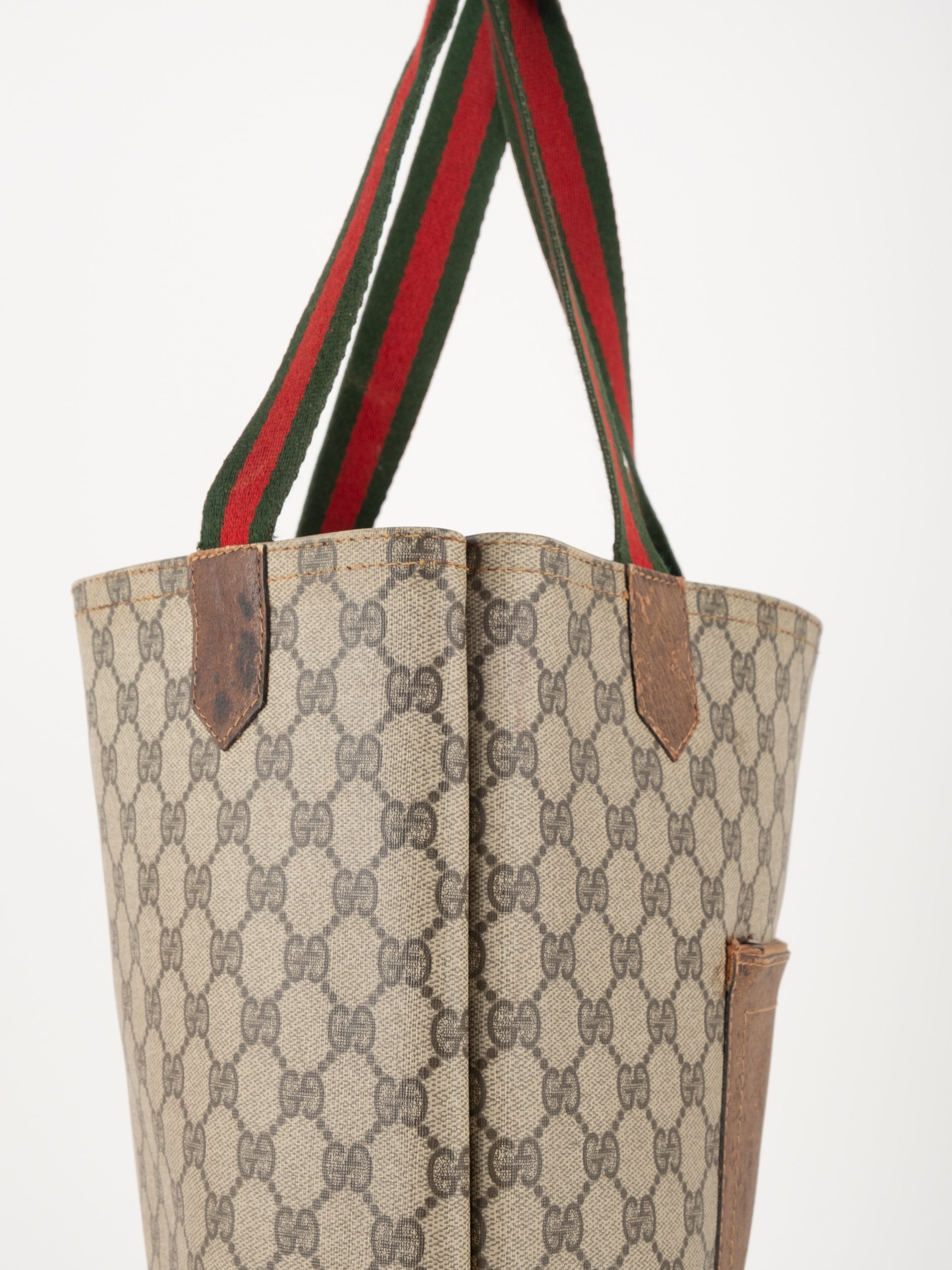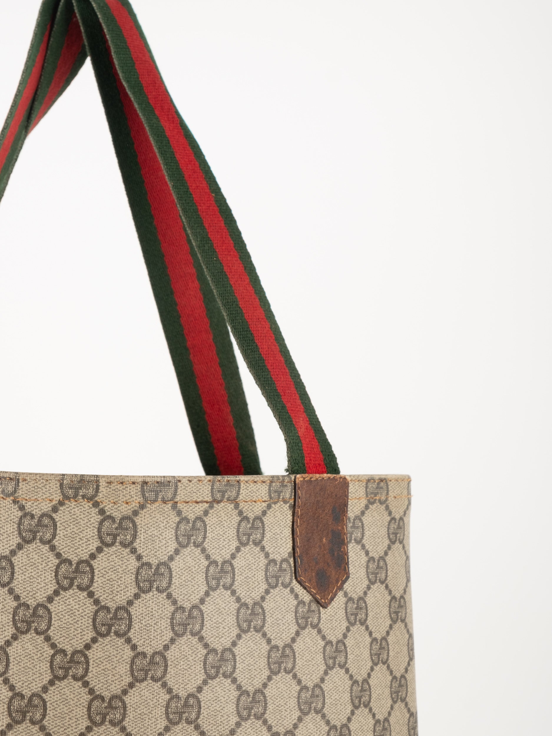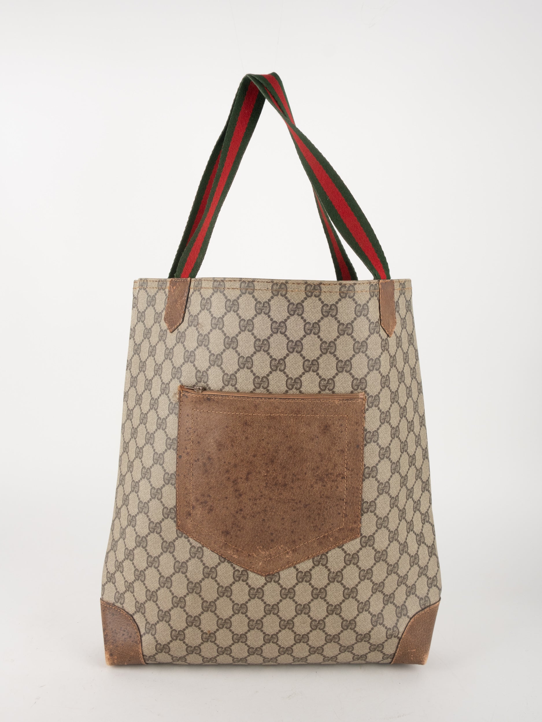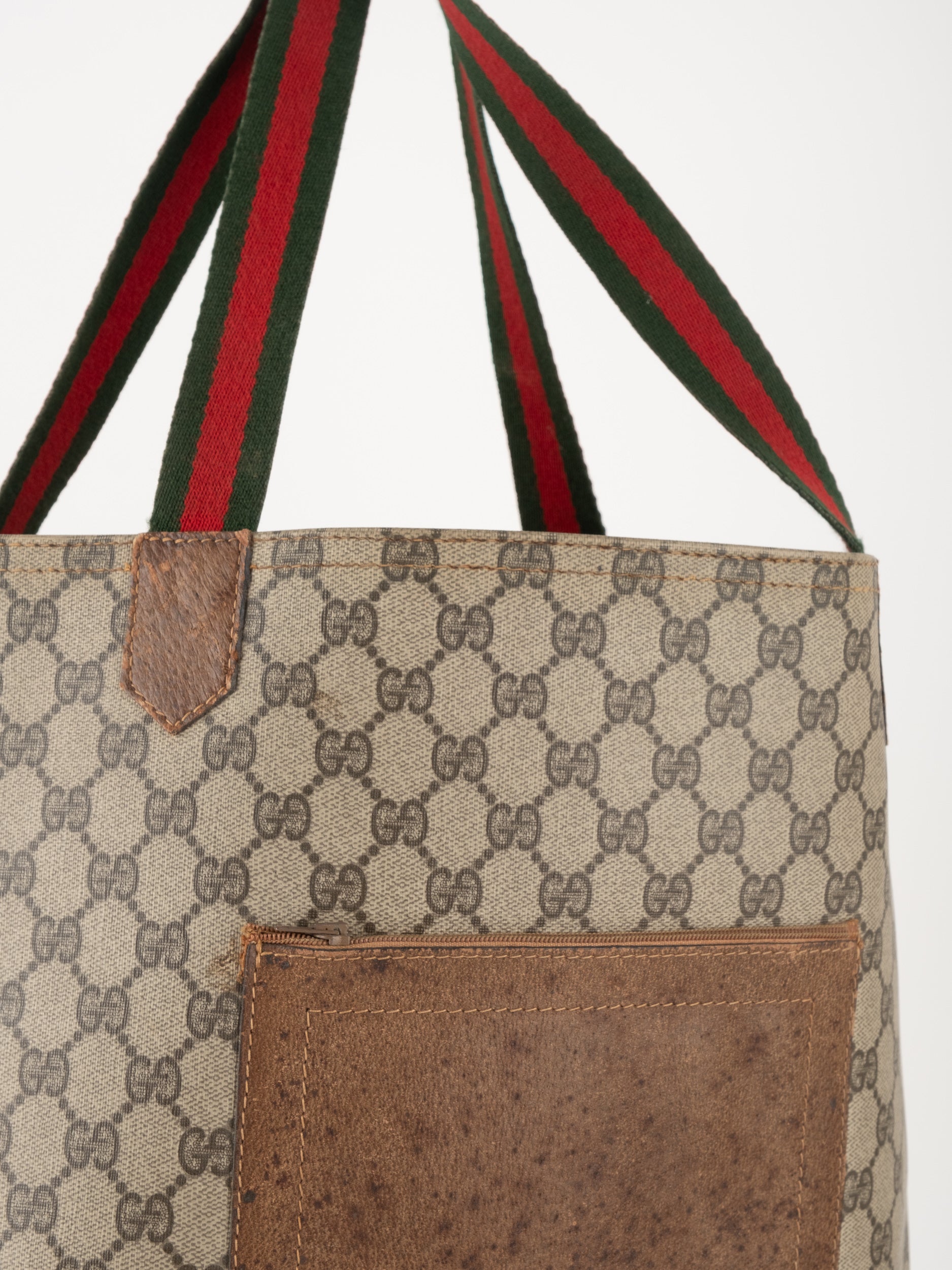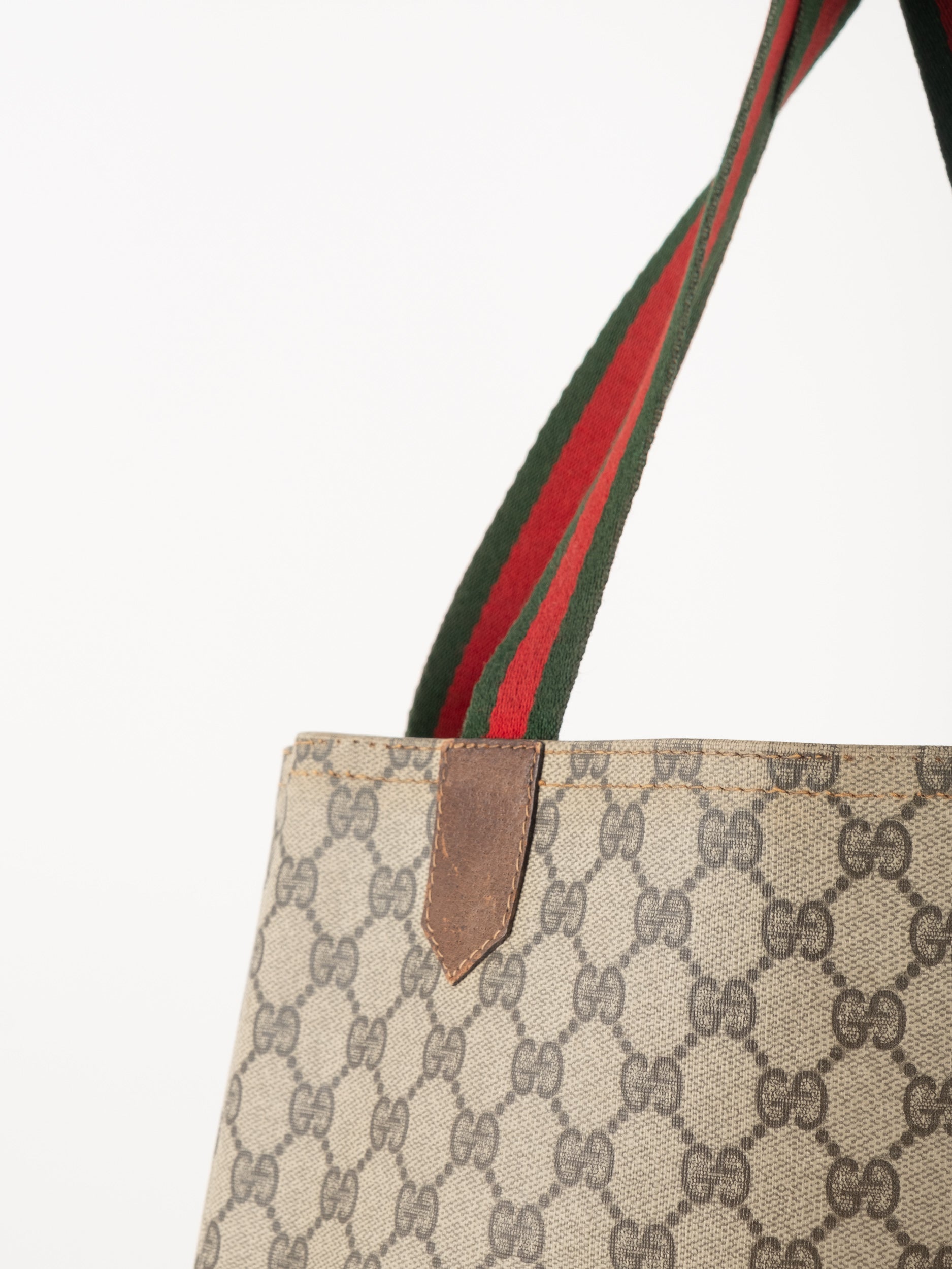 גוצ'י GUCCI וינטג' יד שנייה בדוגמת GG Supreme בגווני בז' וחום, עם כיס קדמי מעור חום ורצועות בד אייקוניות בגווני ירוק ואדום. טוט יומיומי גדול ובעל נוכחות, המשלב אופי וינטג'י עם אמירה אופנתית ברורה.