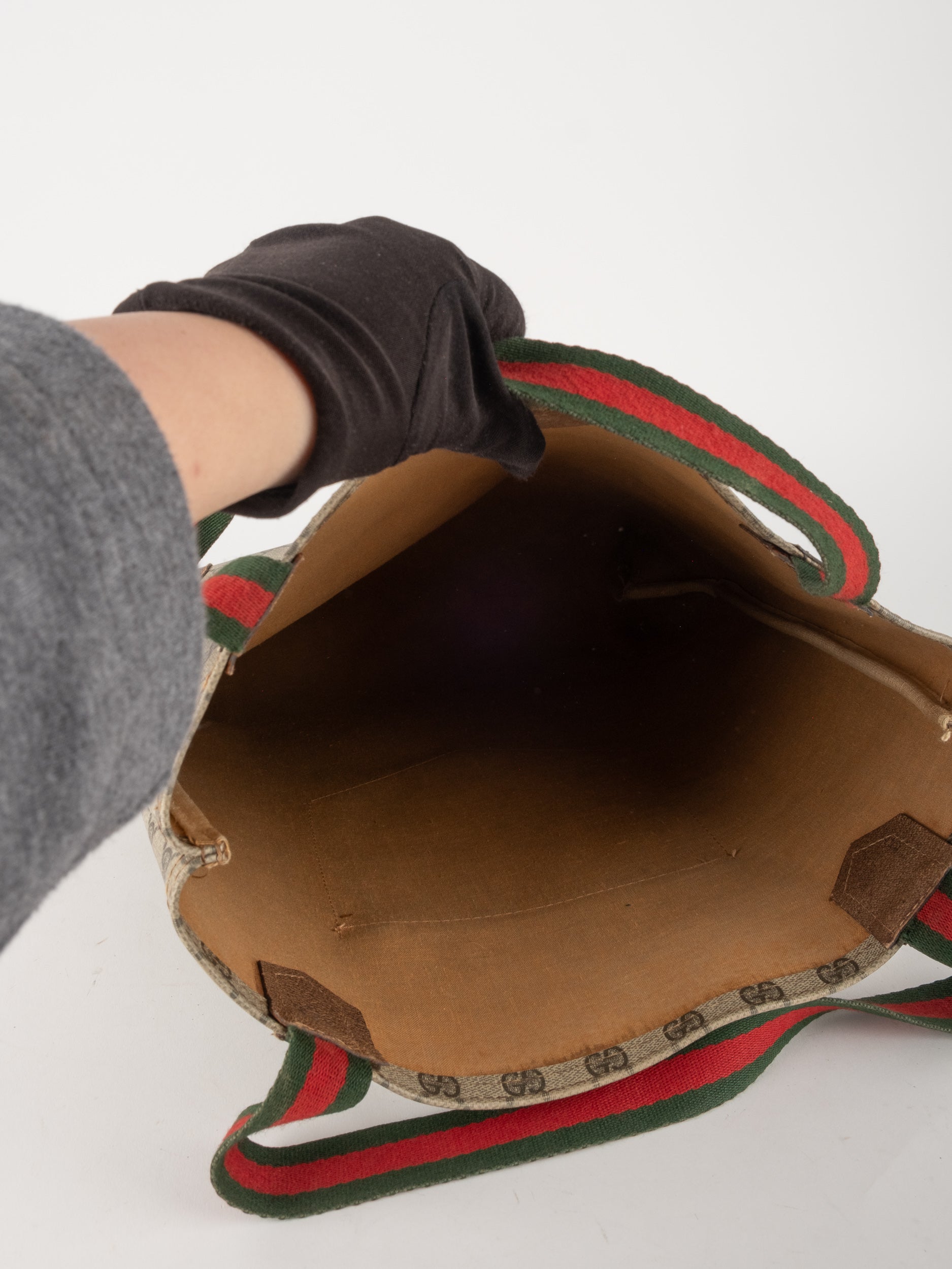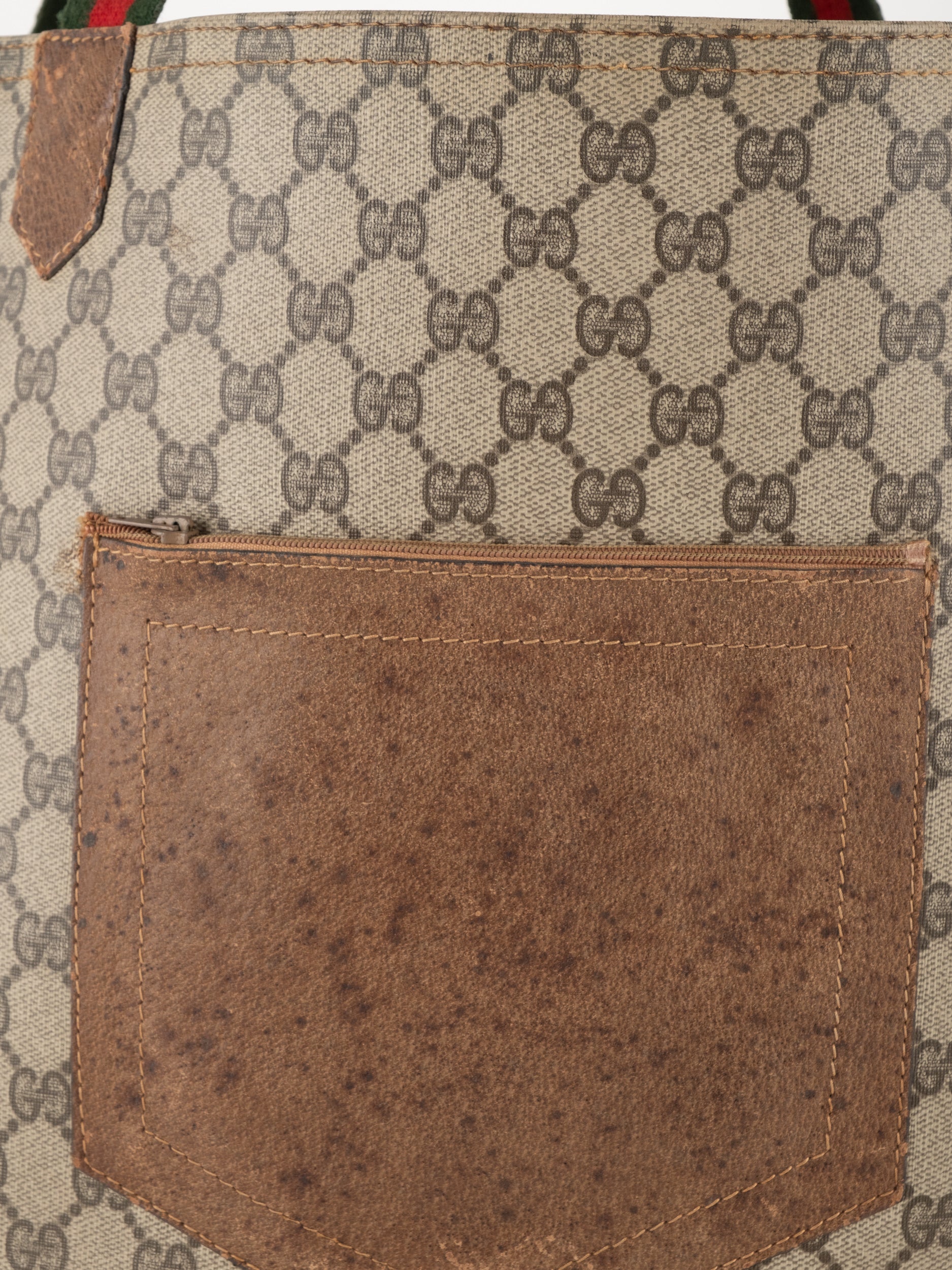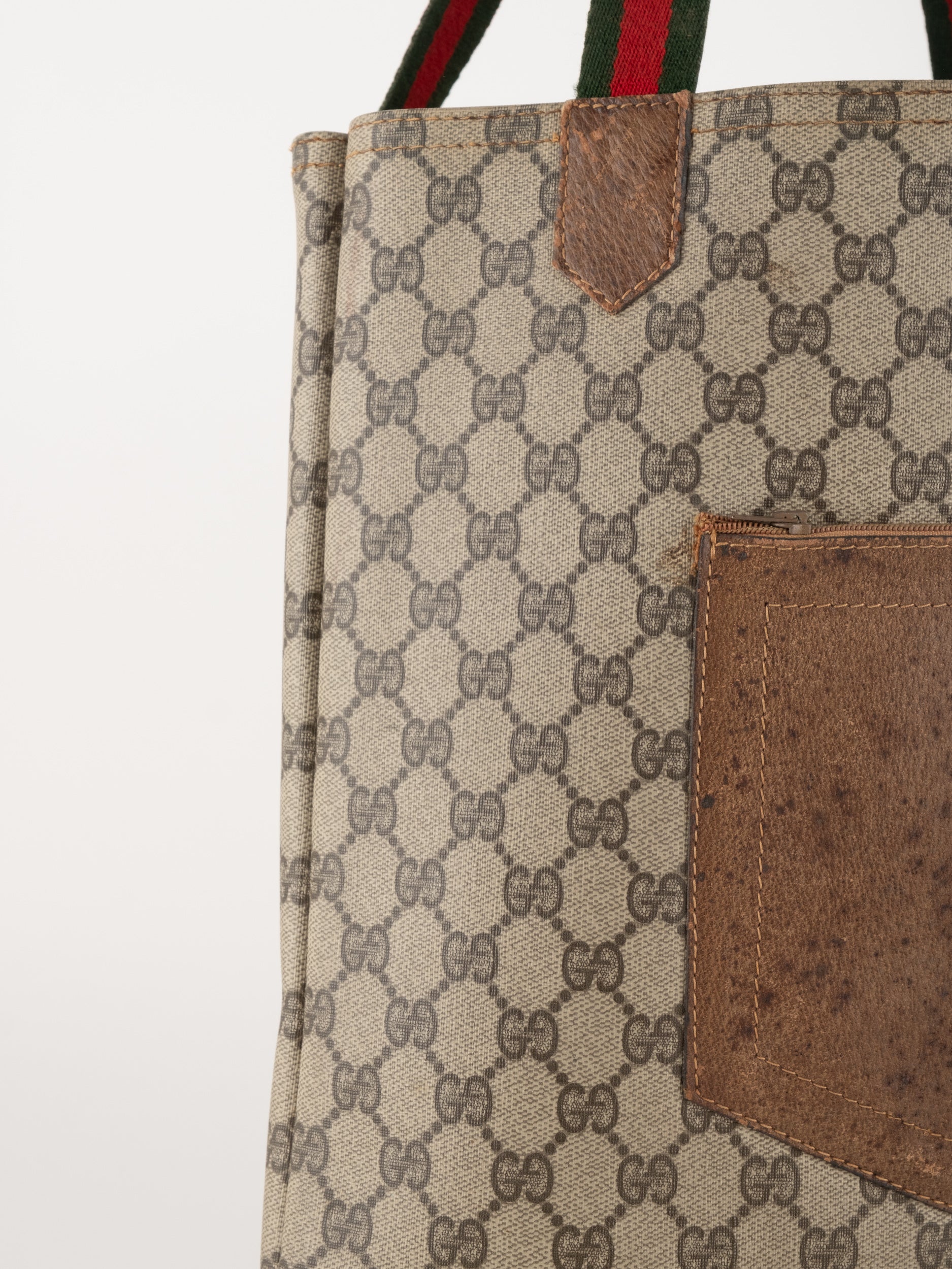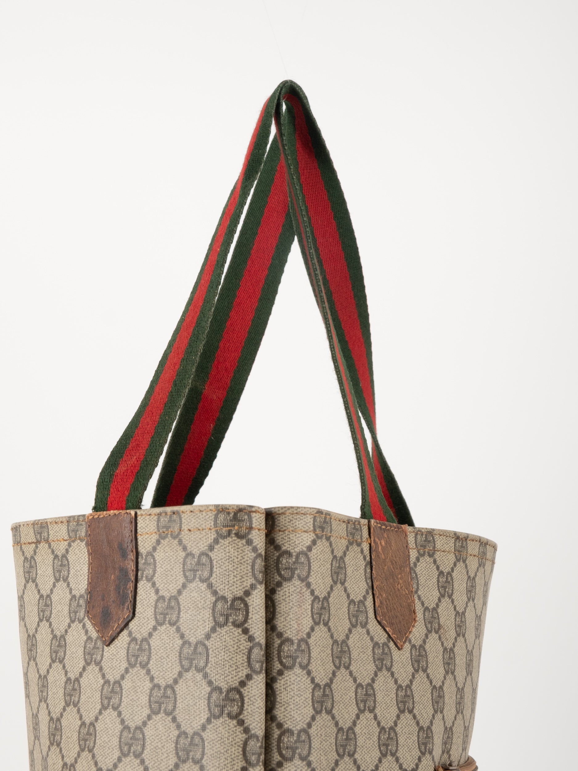 גוצ'י GUCCI וינטג' יד שנייה בדוגמת GG Supreme בגווני בז' וחום, עם כיס קדמי מעור חום ורצועות בד אייקוניות בגווני ירוק ואדום. טוט יומיומי גדול ובעל נוכחות, המשלב אופי וינטג'י עם אמירה אופנתית ברורה.