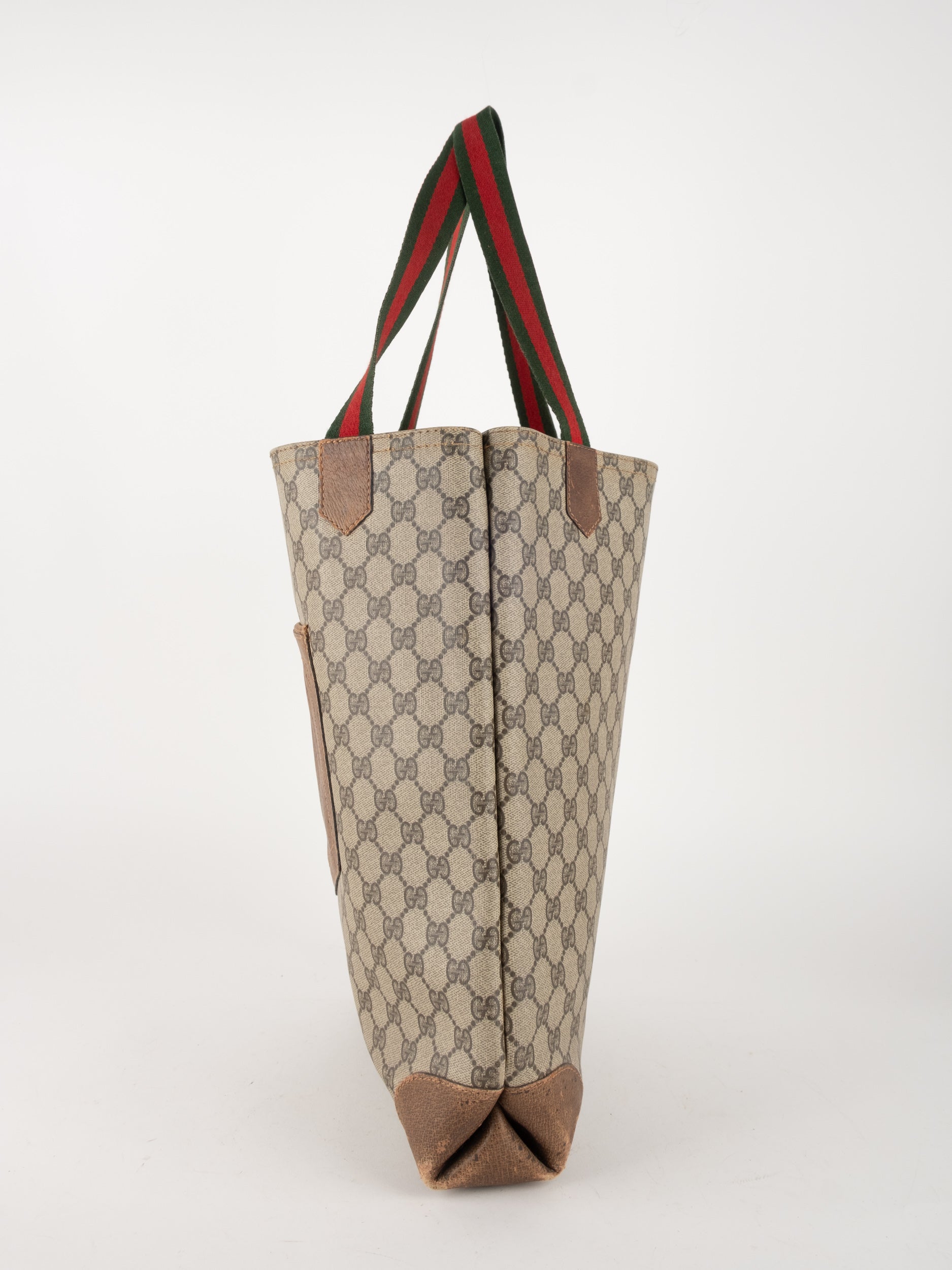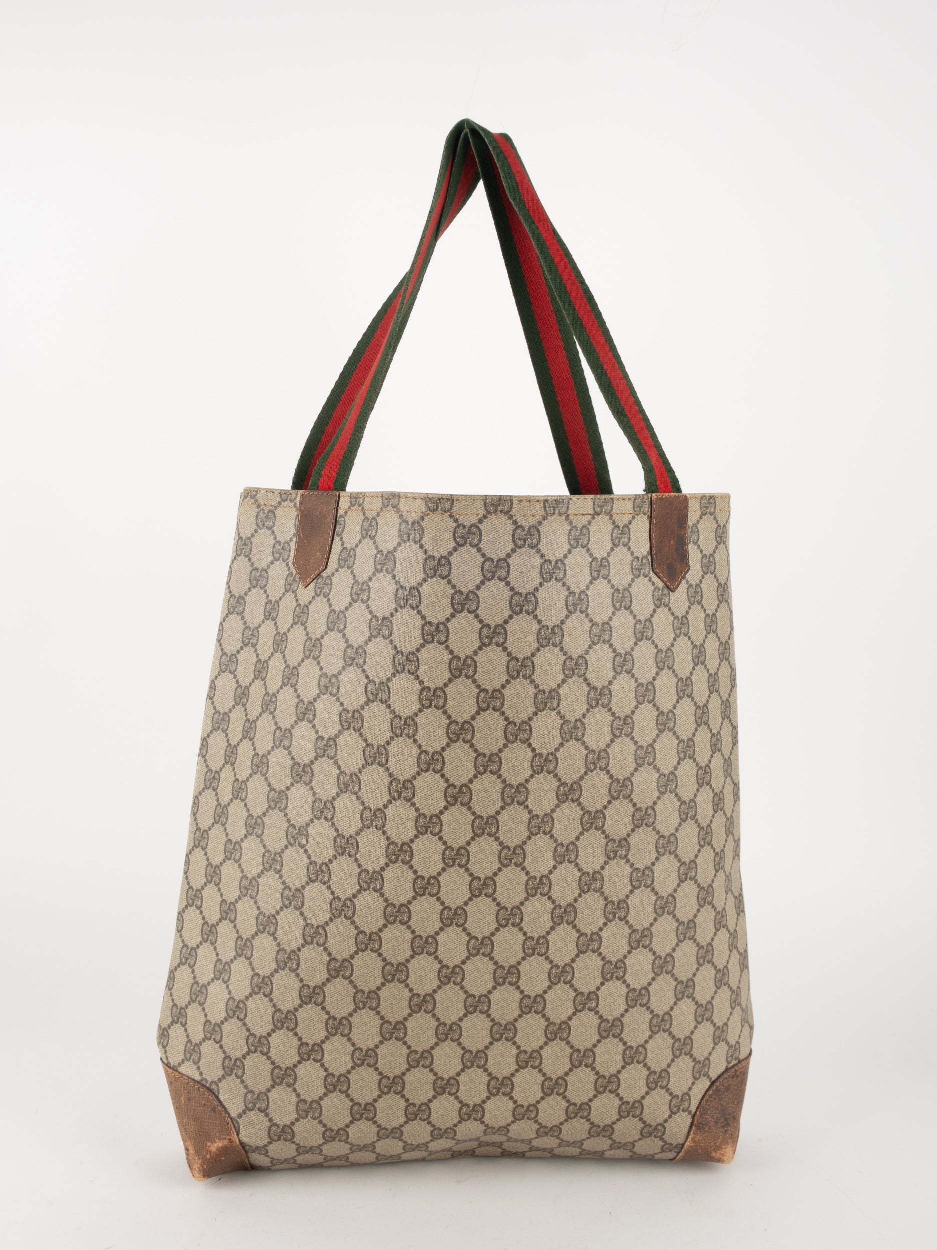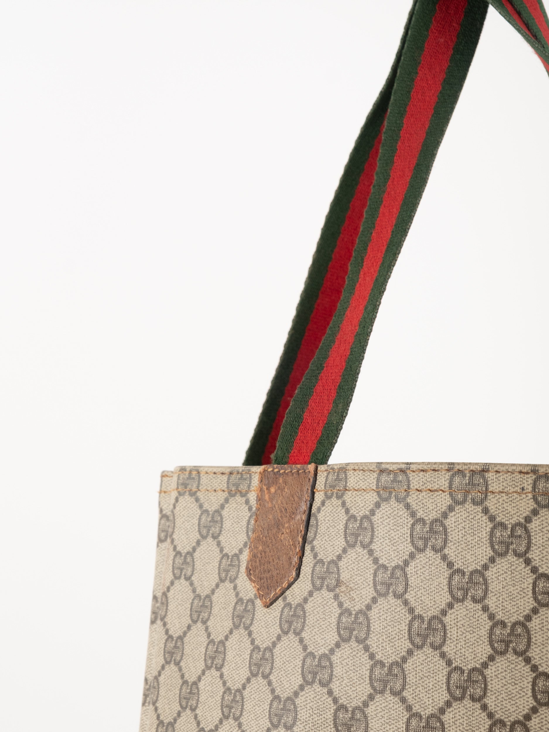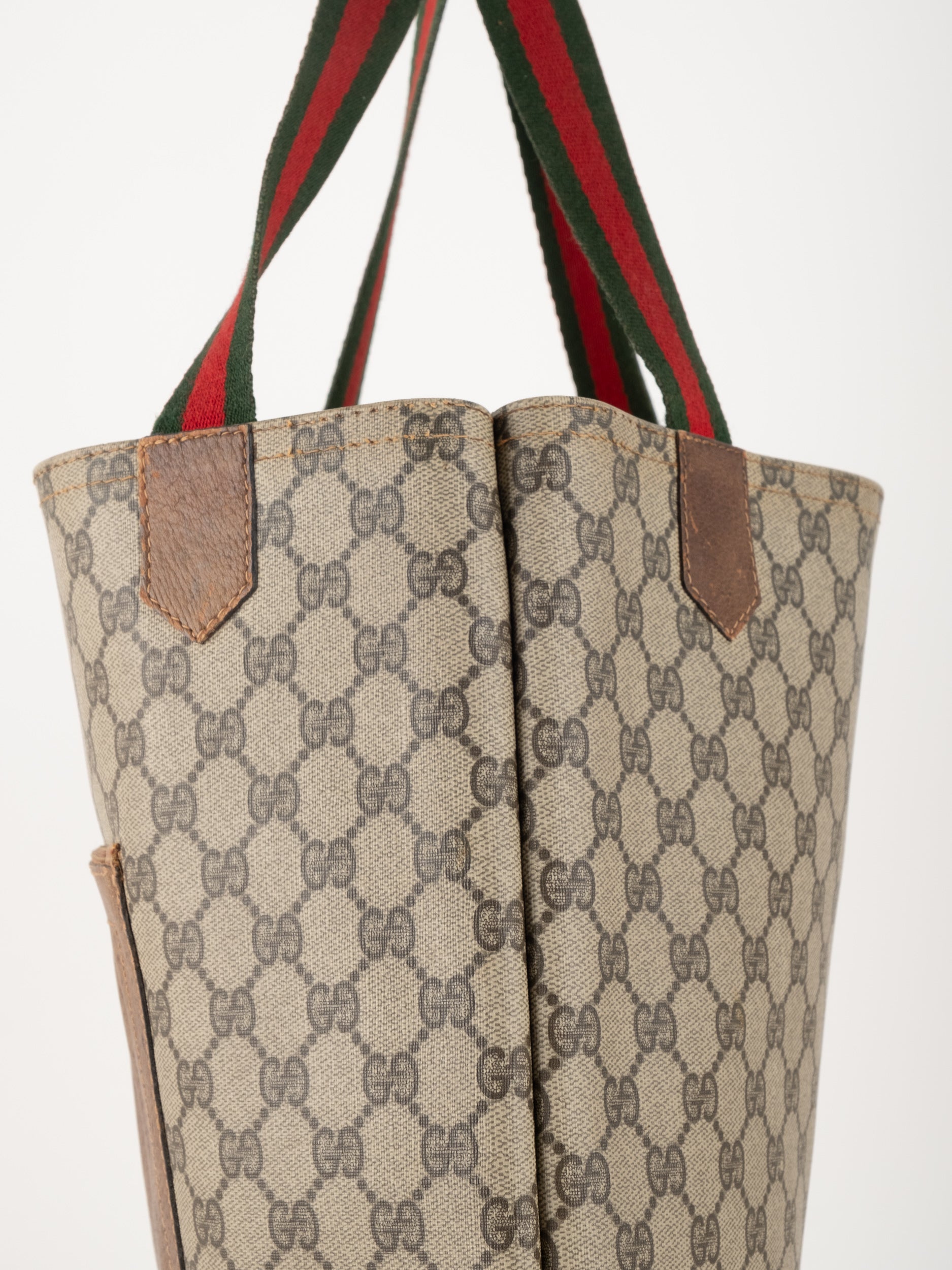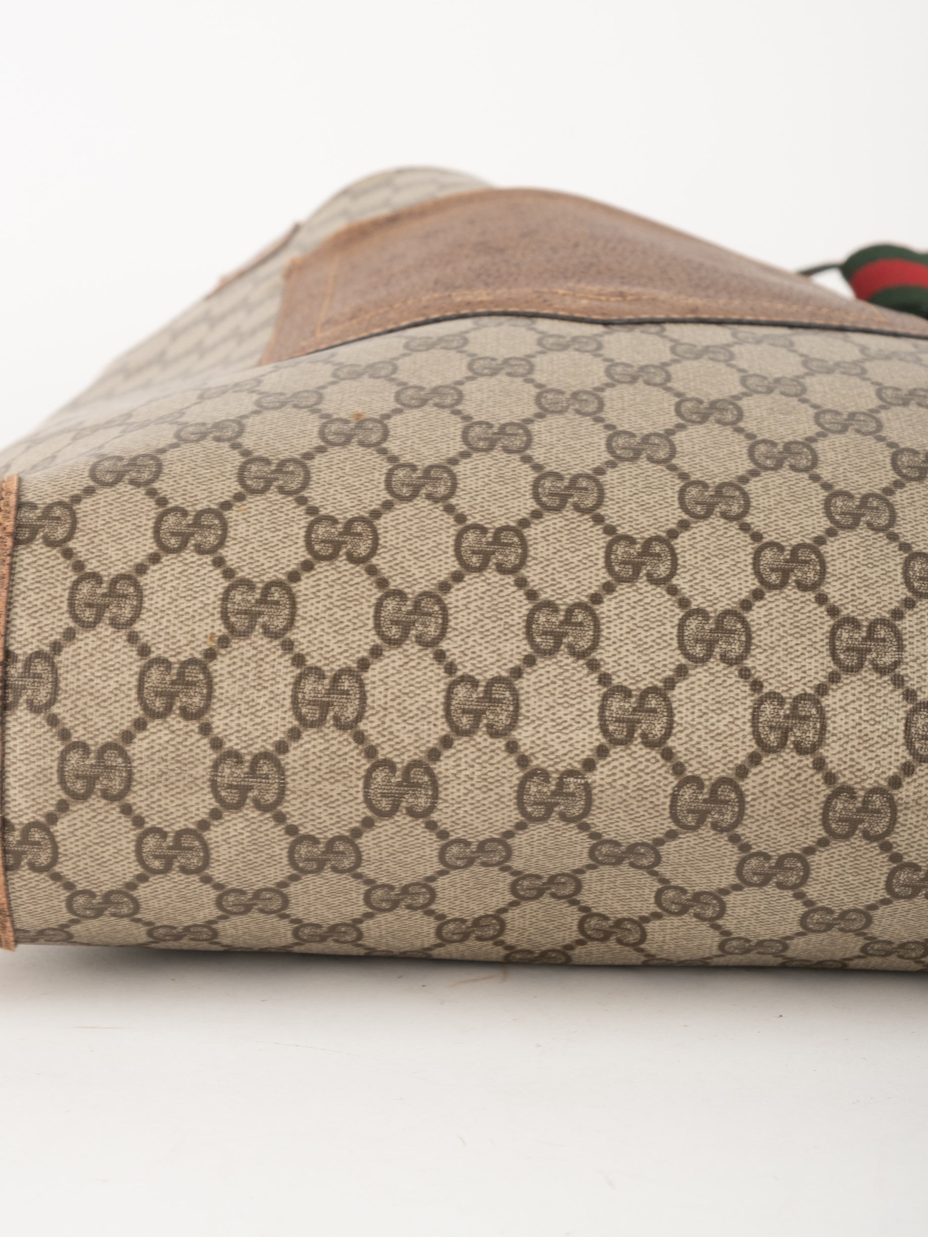 גוצ'י GUCCI וינטג' יד שנייה בדוגמת GG Supreme בגווני בז' וחום, עם כיס קדמי מעור חום ורצועות בד אייקוניות בגווני ירוק ואדום. טוט יומיומי גדול ובעל נוכחות, המשלב אופי וינטג'י עם אמירה אופנתית ברורה.