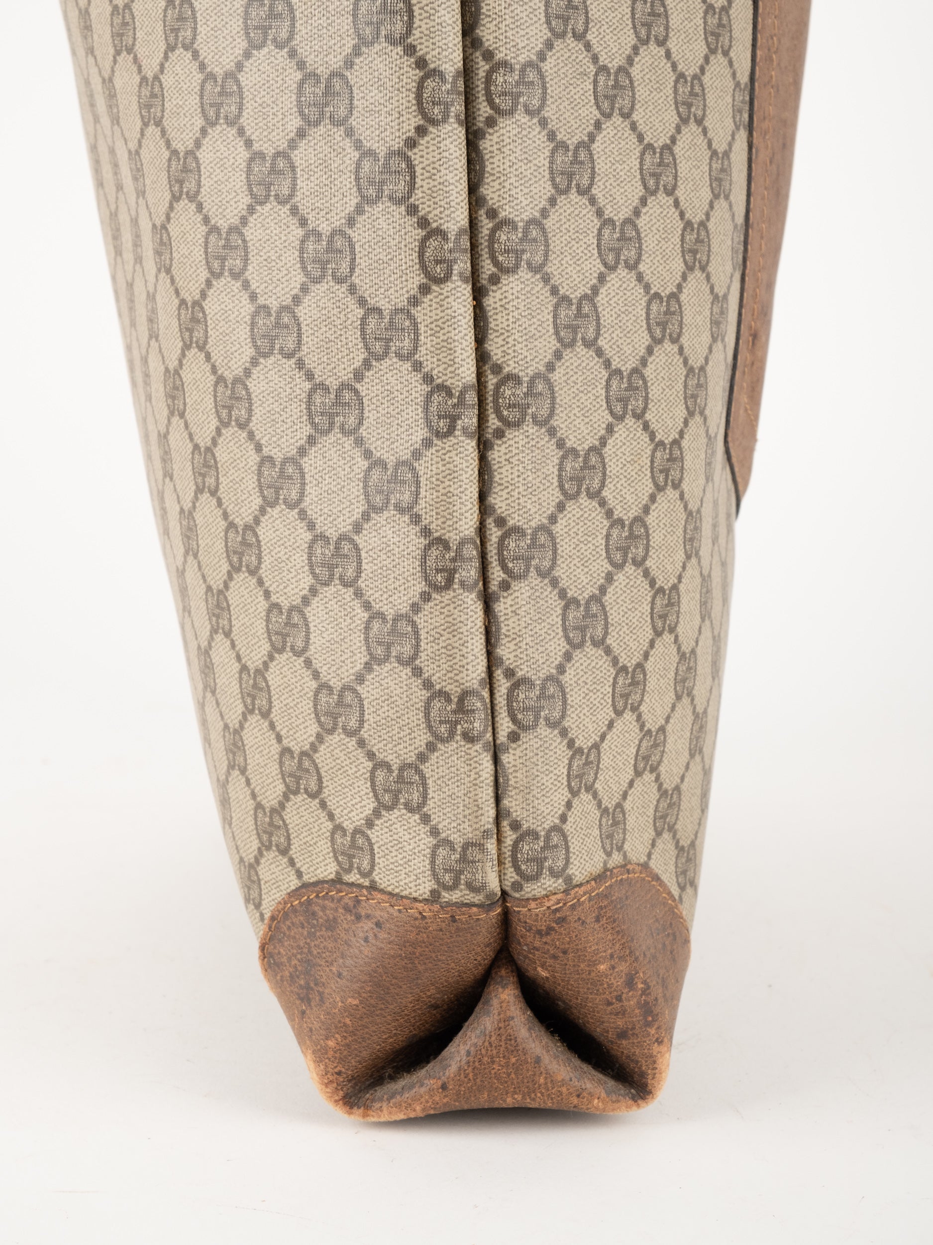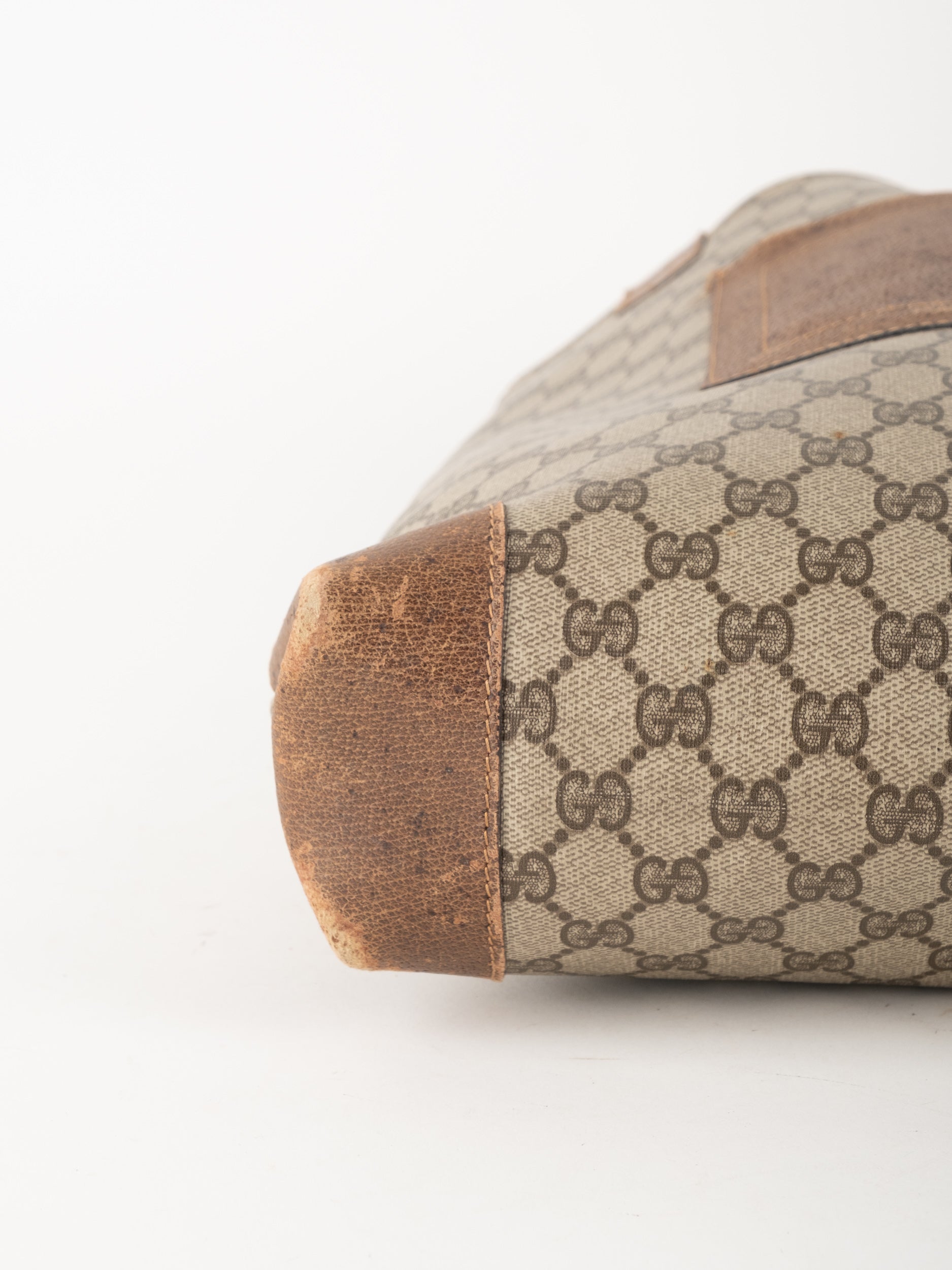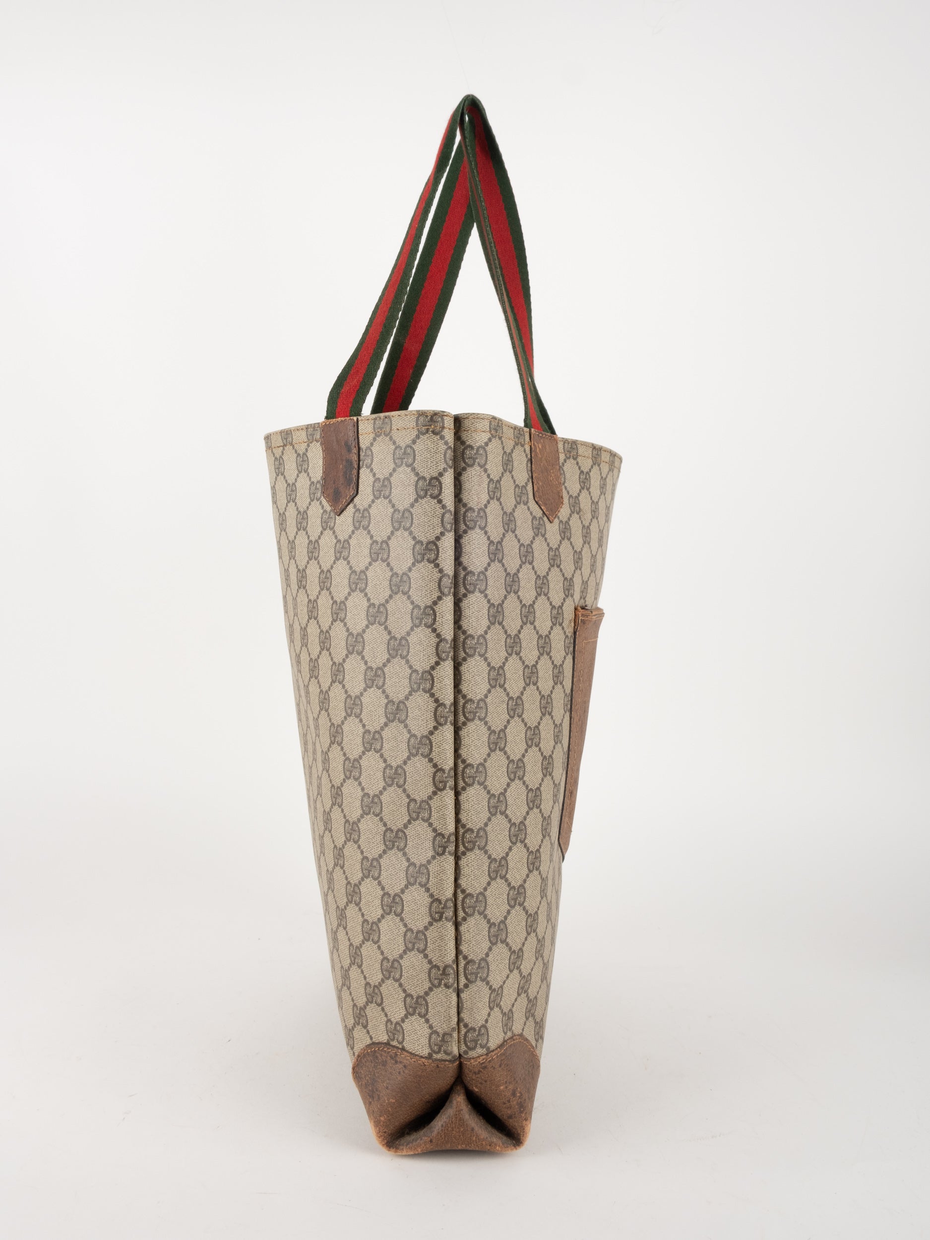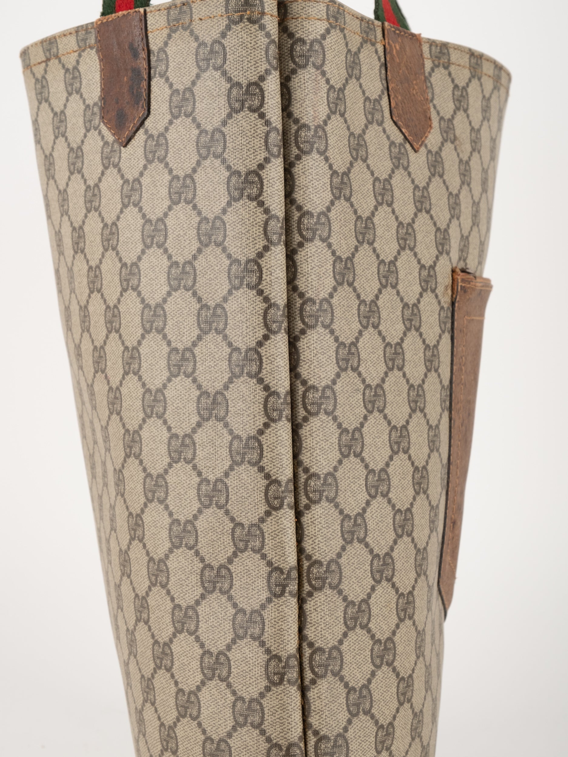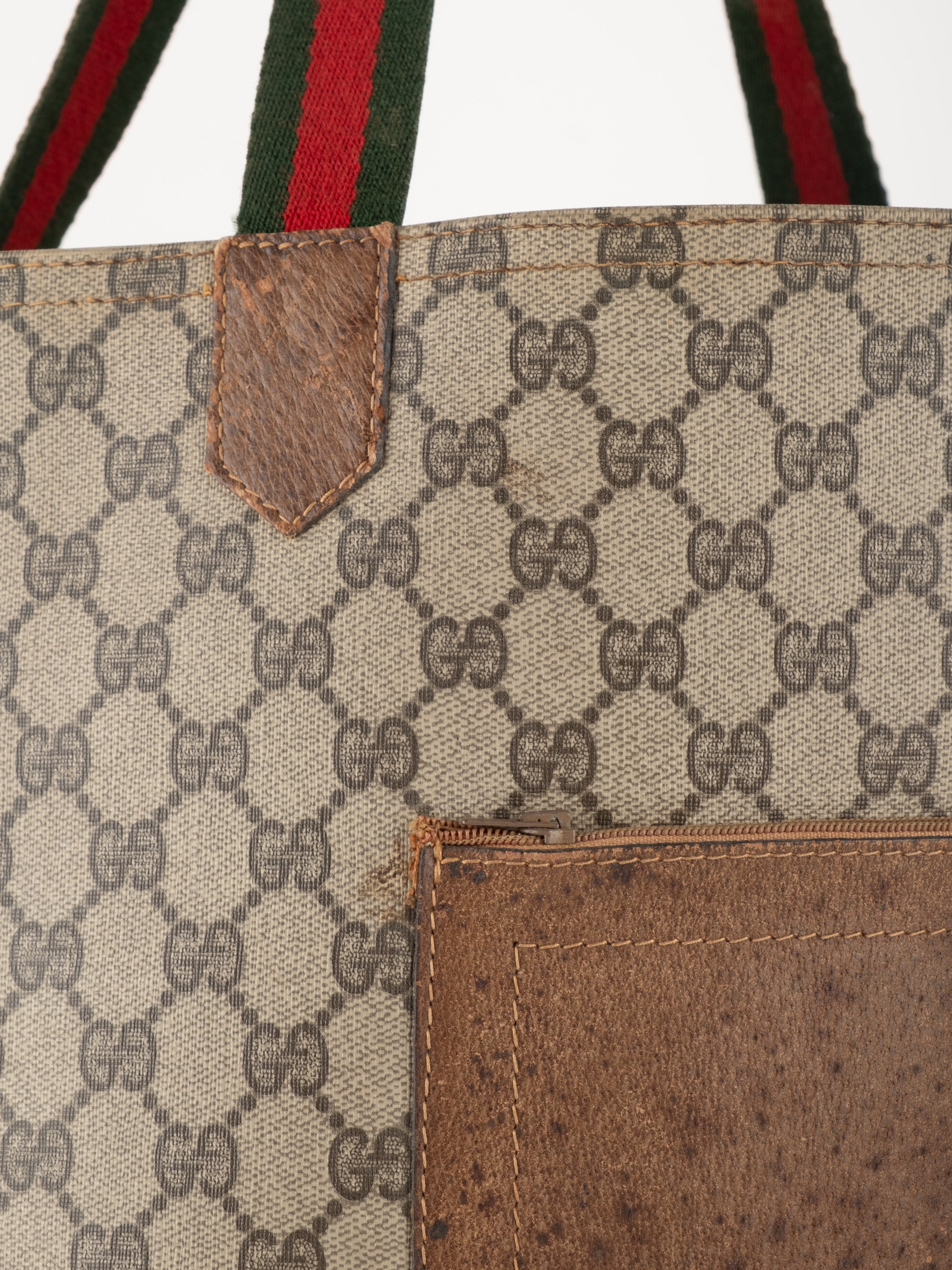 גוצ'י GUCCI וינטג' יד שנייה בדוגמת GG Supreme בגווני בז' וחום, עם כיס קדמי מעור חום ורצועות בד אייקוניות בגווני ירוק ואדום. טוט יומיומי גדול ובעל נוכחות, המשלב אופי וינטג'י עם אמירה אופנתית ברורה.