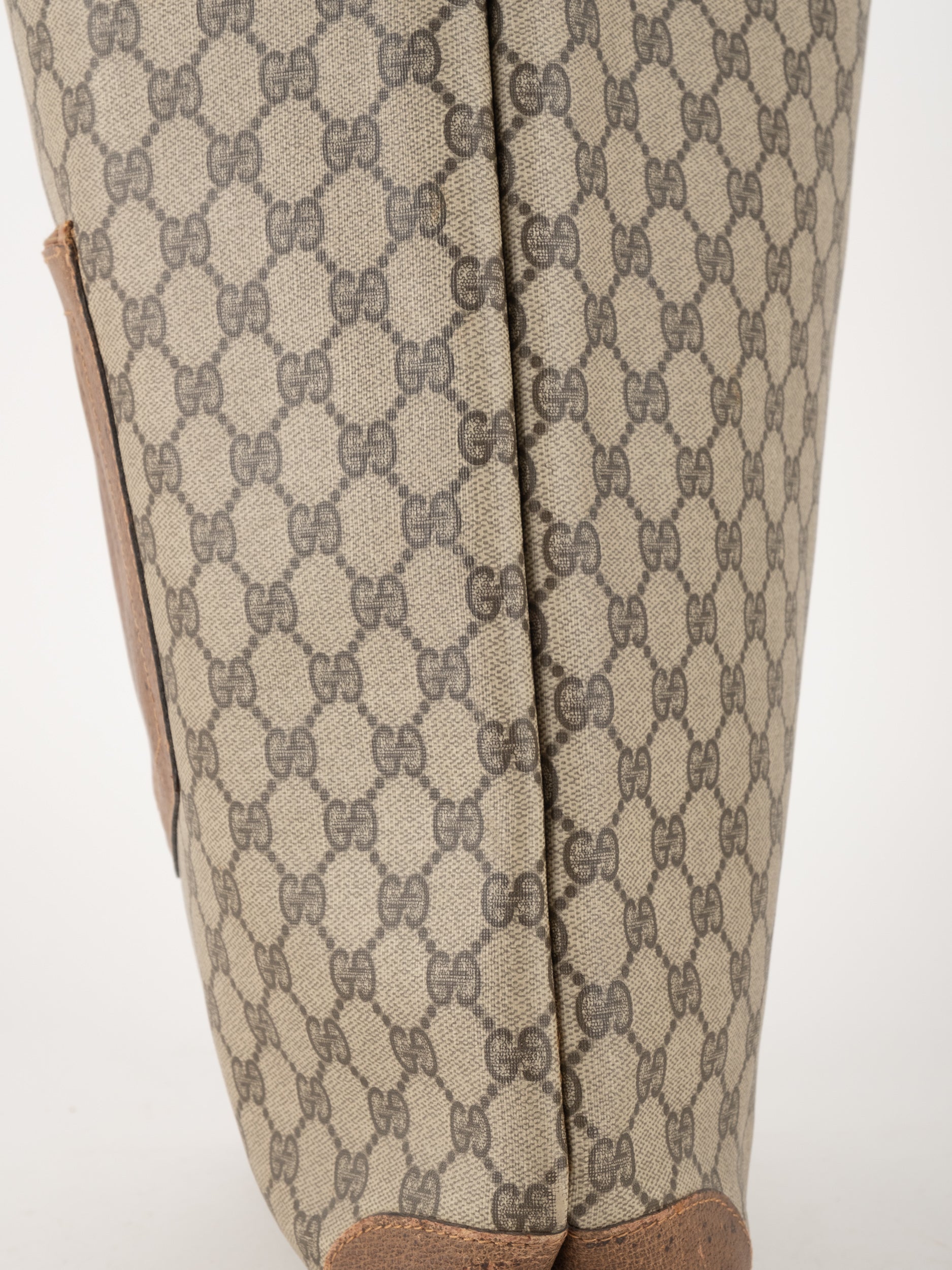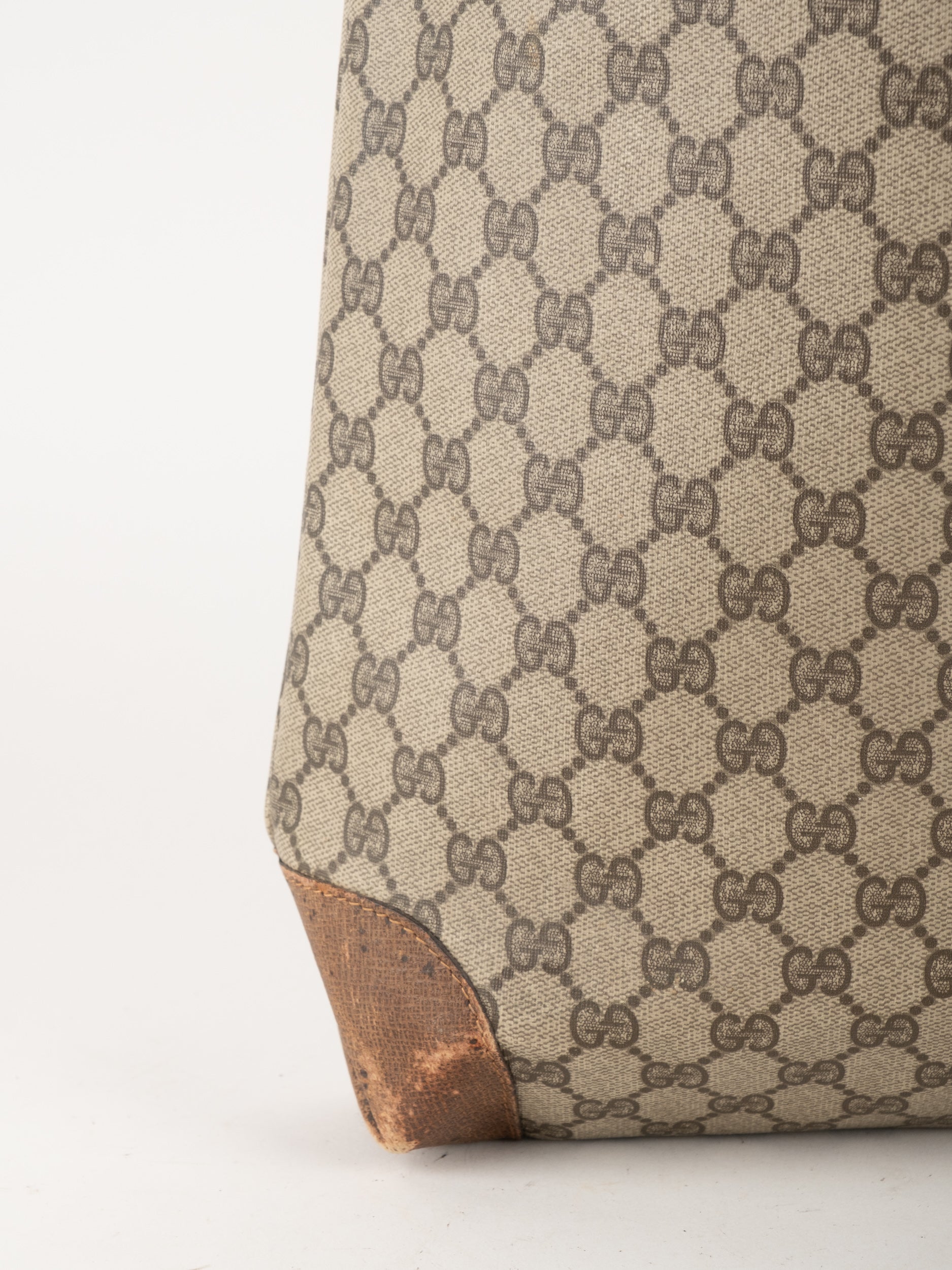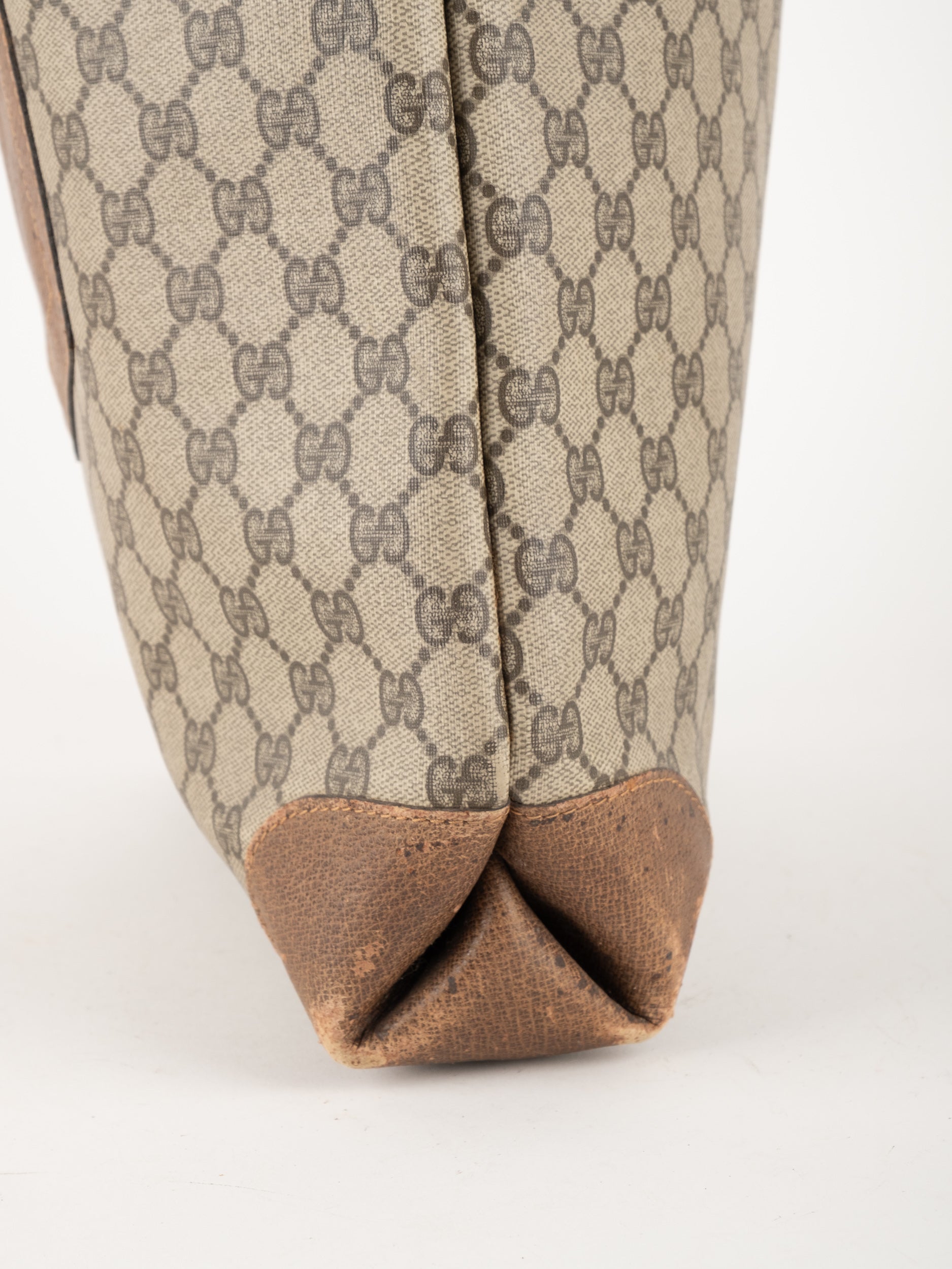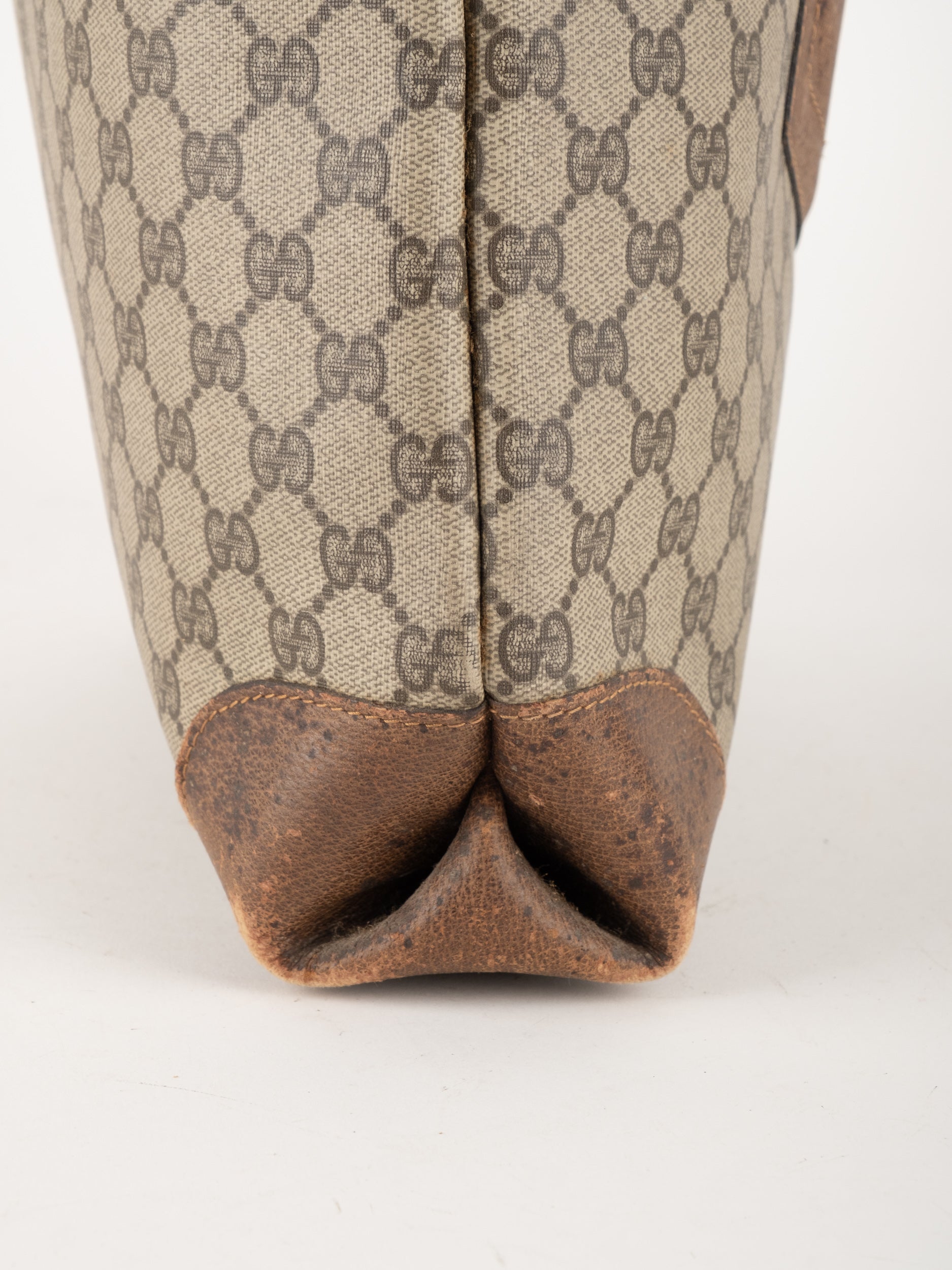גוצ'י GUCCI וינטג' יד שנייה בדוגמת GG Supreme בגווני בז' וחום, עם כיס קדמי מעור חום ורצועות בד אייקוניות בגווני ירוק ואדום. טוט יומיומי גדול ובעל נוכחות, המשלב אופי וינטג'י עם אמירה אופנתית ברורה.