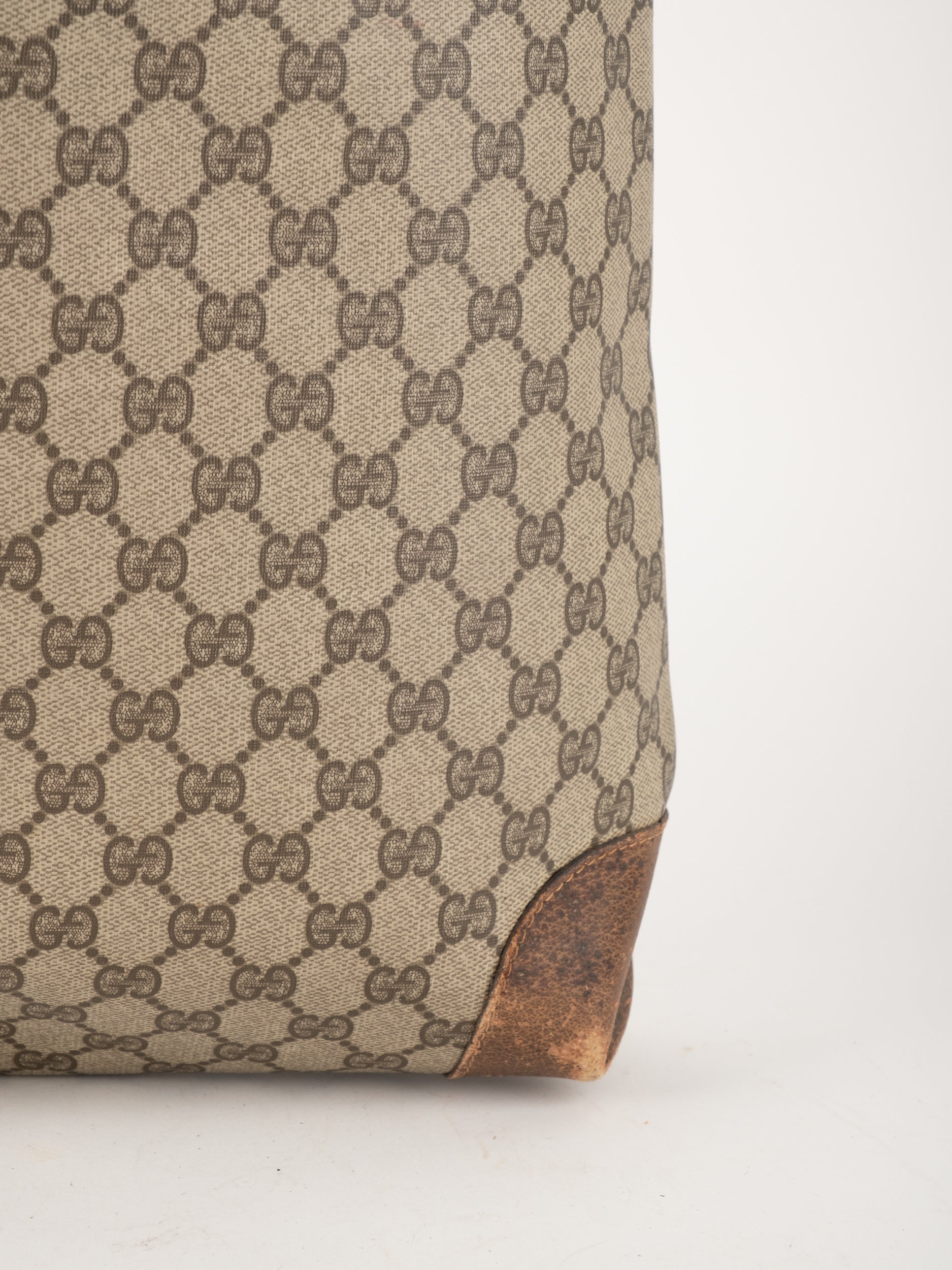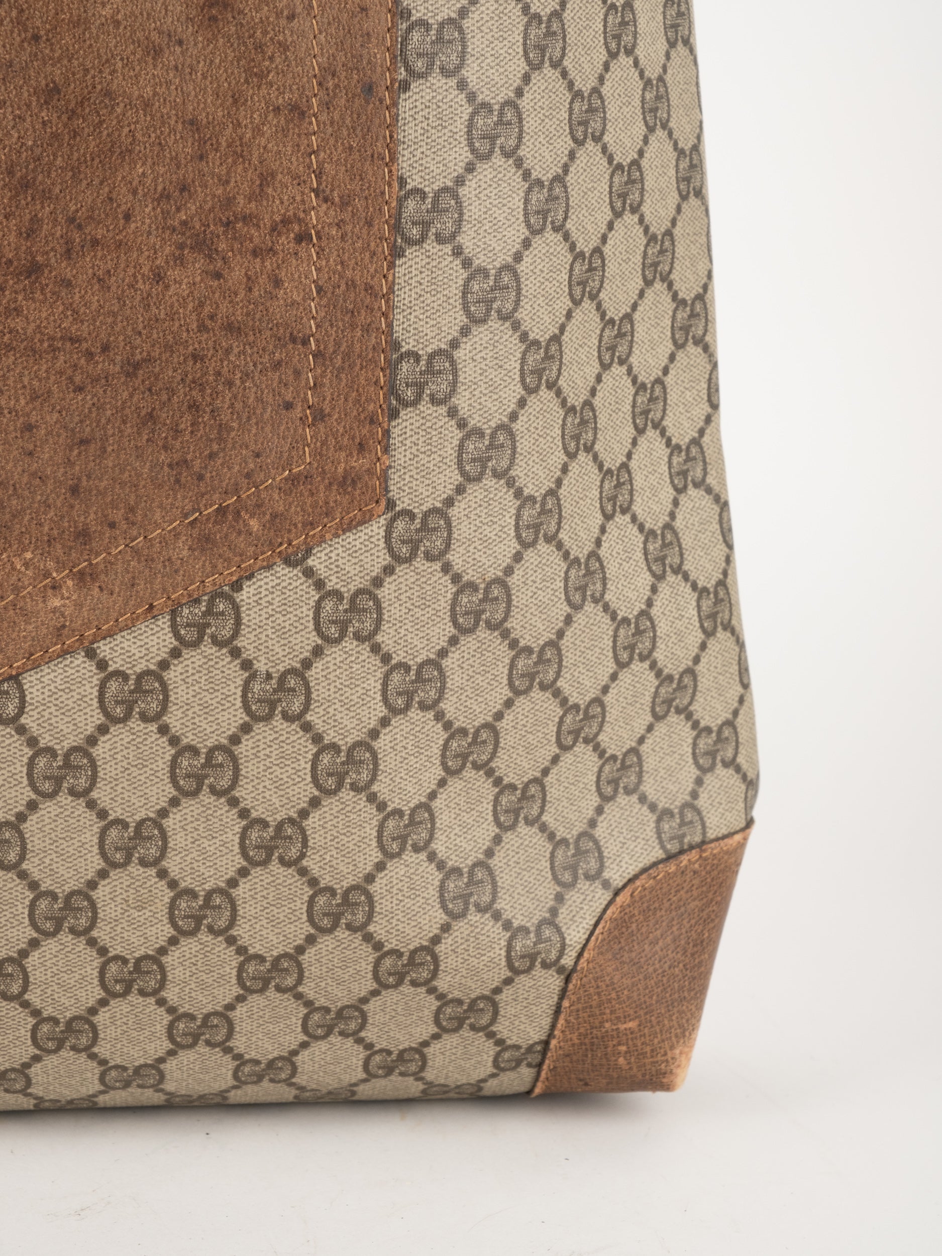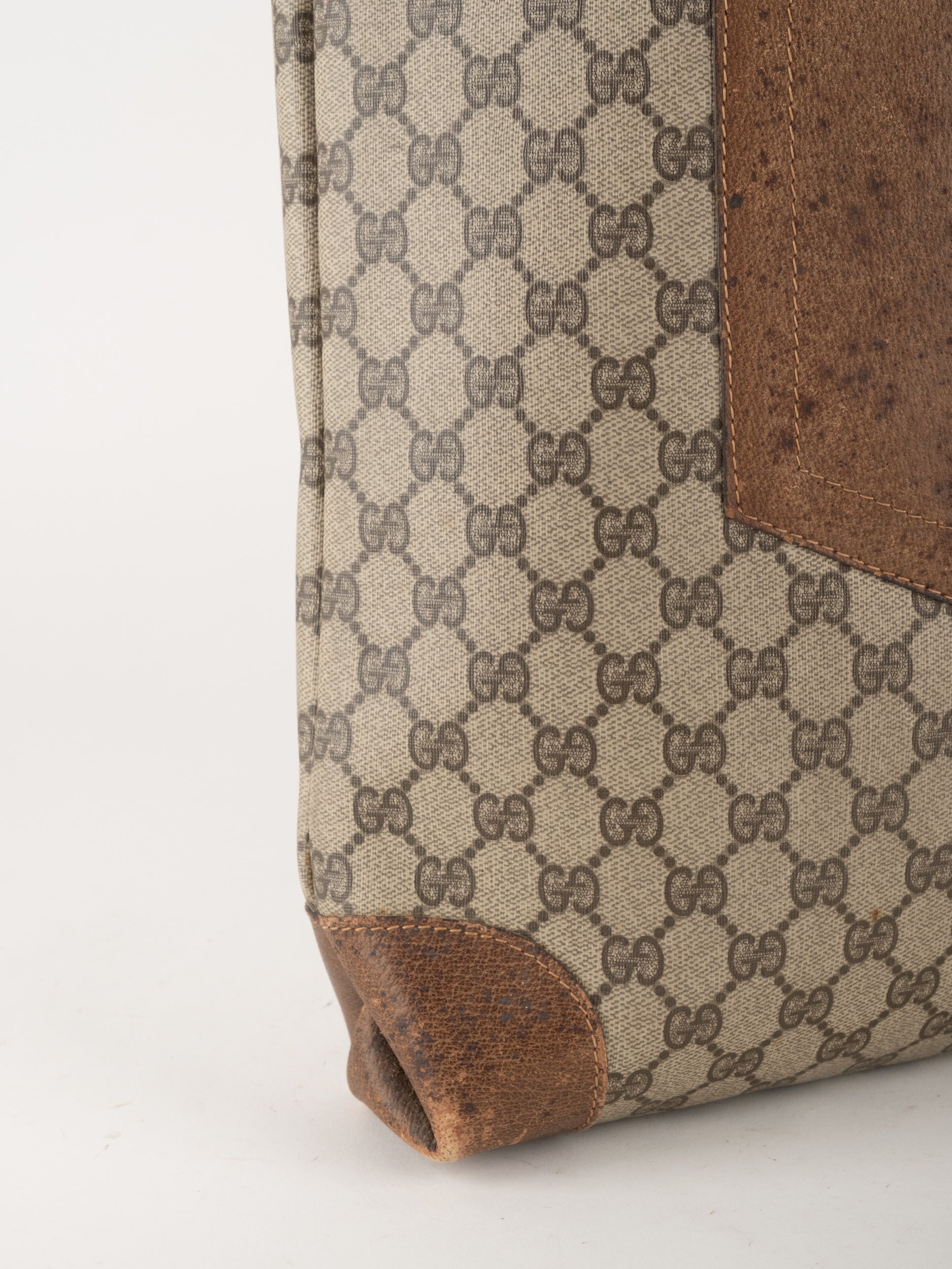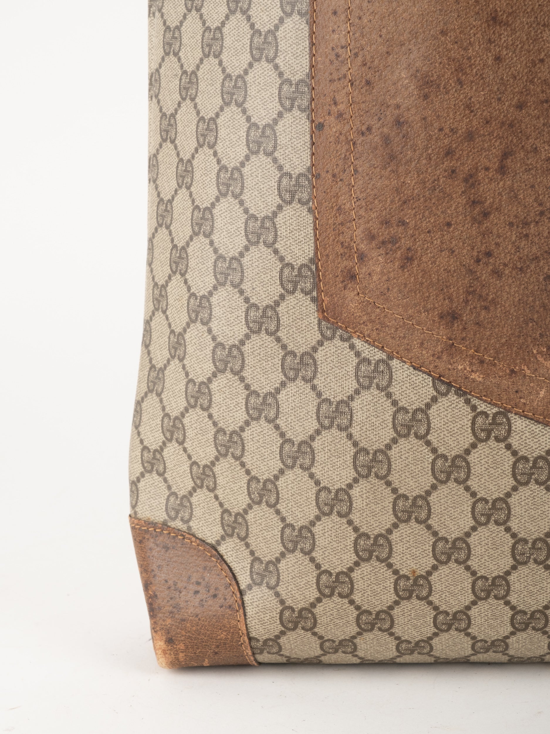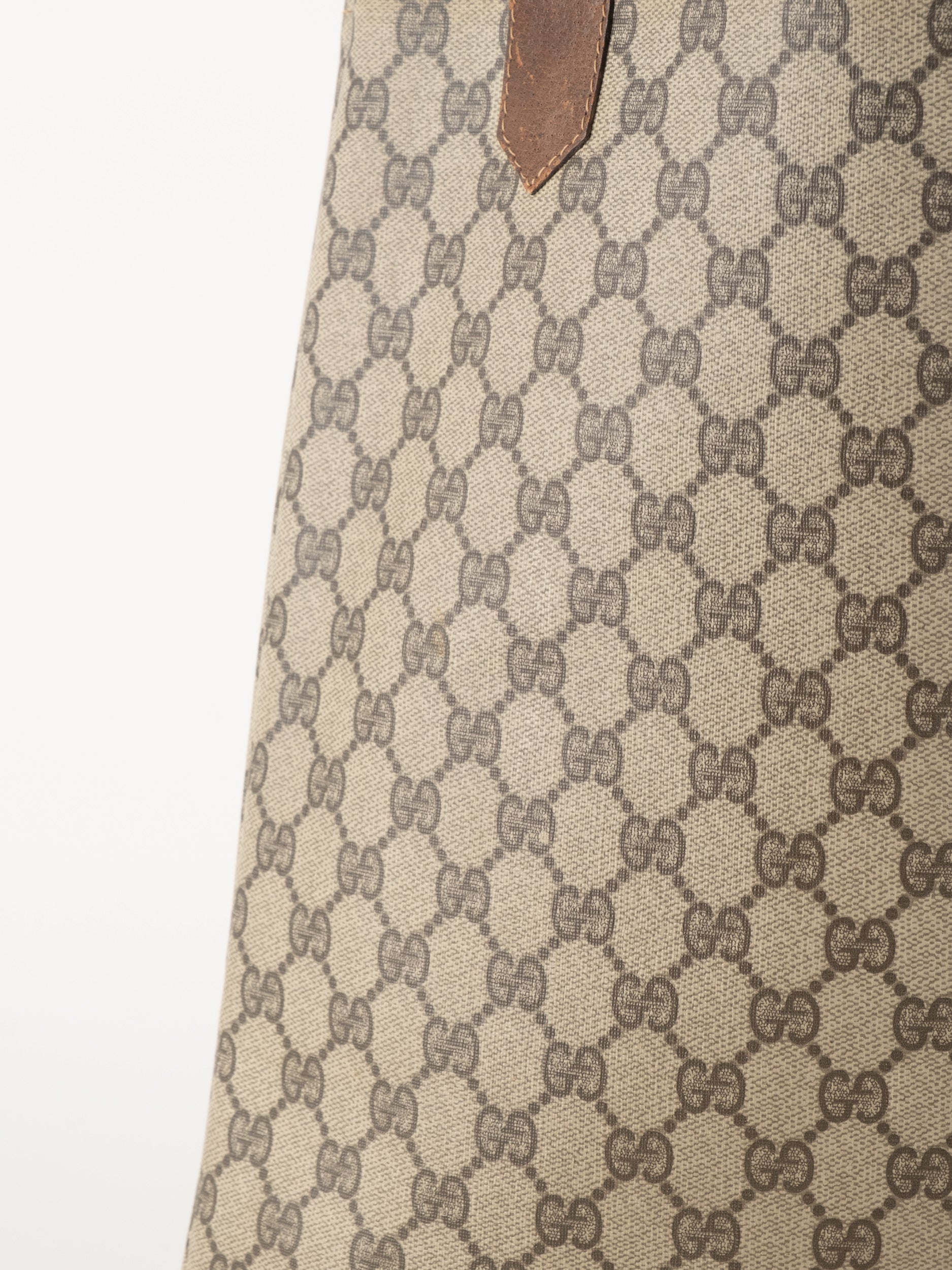 גוצ'י GUCCI וינטג' יד שנייה בדוגמת GG Supreme בגווני בז' וחום, עם כיס קדמי מעור חום ורצועות בד אייקוניות בגווני ירוק ואדום. טוט יומיומי גדול ובעל נוכחות, המשלב אופי וינטג'י עם אמירה אופנתית ברורה.