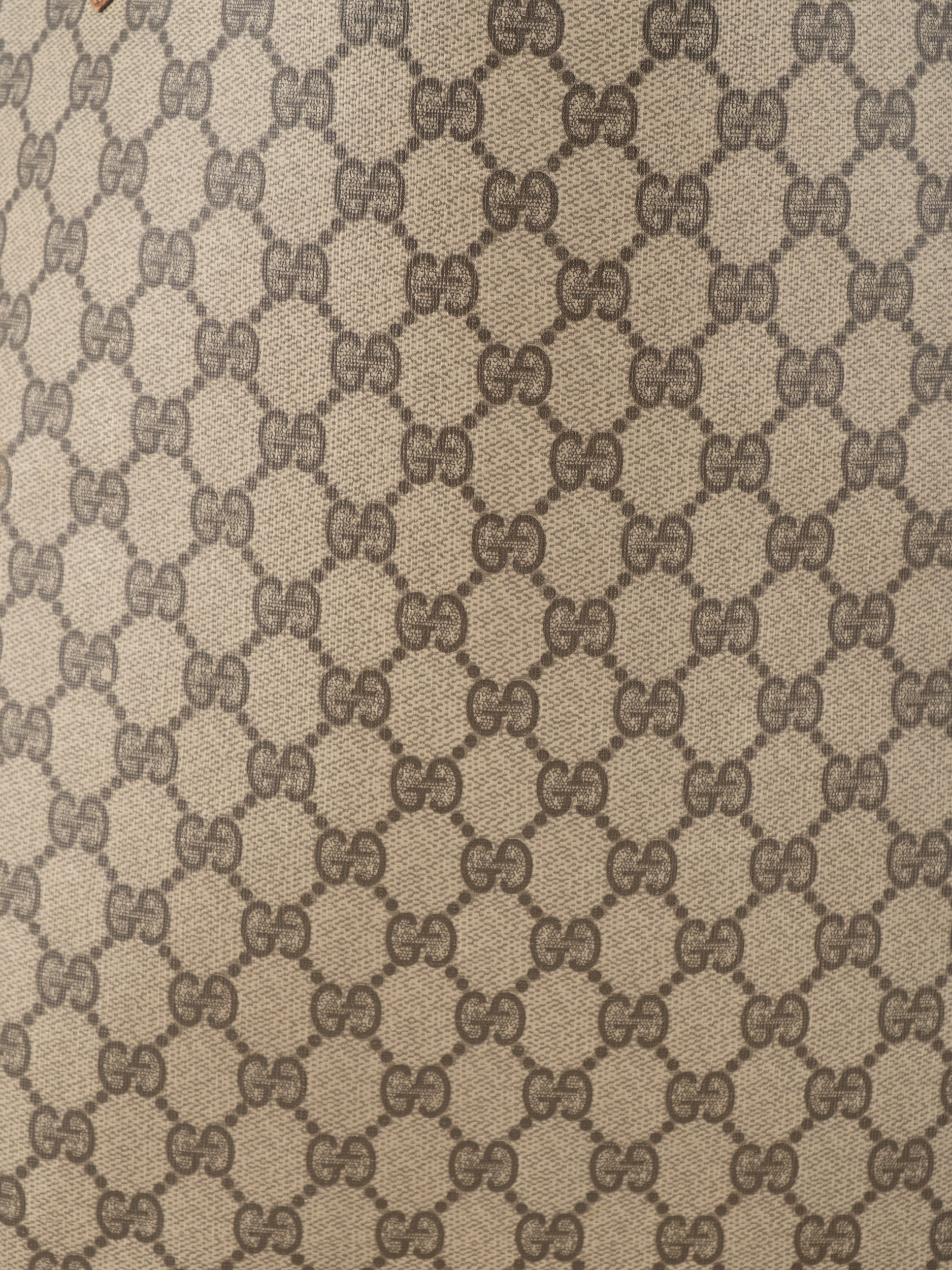 התיק עשוי קנבס בדוגמת GG בגוון בז' עם עיטורי עור חום בפינות ובחלק העליון. כולל כיס קדמי חיצוני מעור, ידיות נשיאה רחבות מבד בגווני ירוק ואדום וחלל פנימי פתוח ומרווח במיוחד. מתאים לשימוש יומיומי, עבודה או נסיעות קצרות.