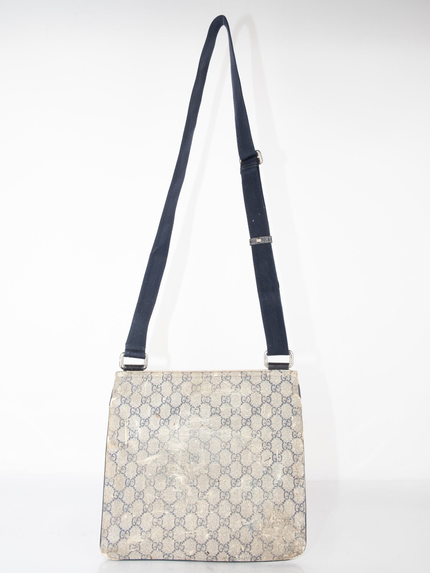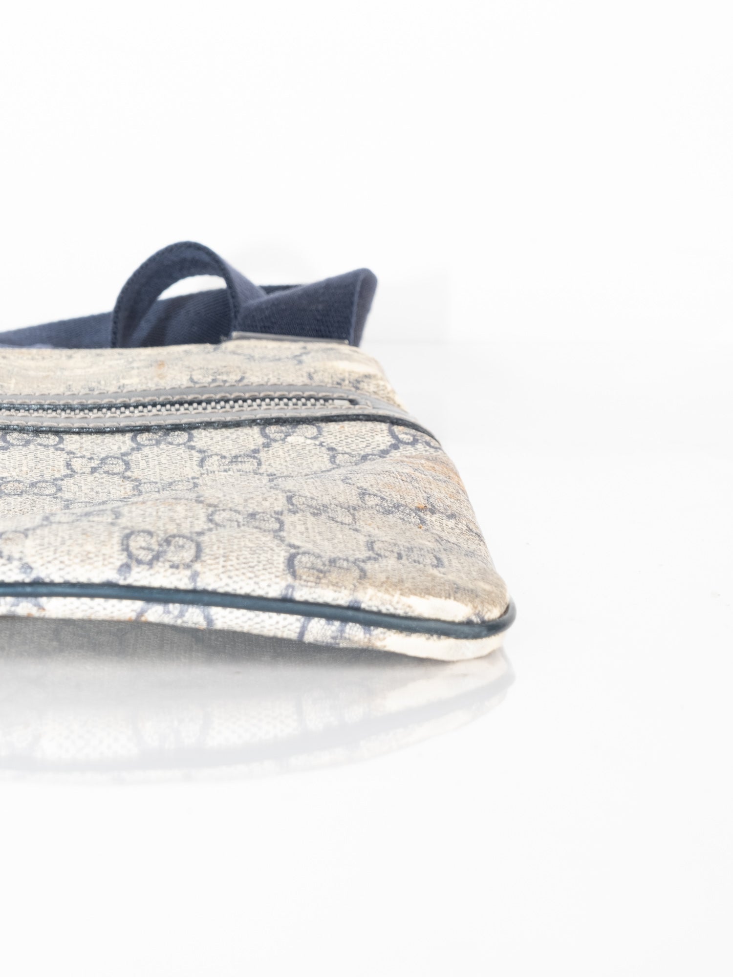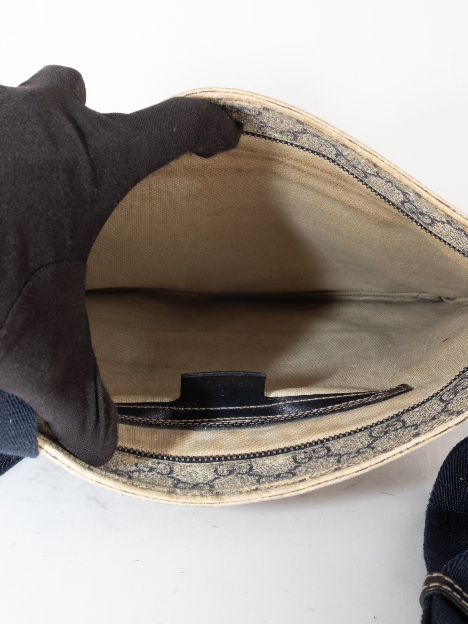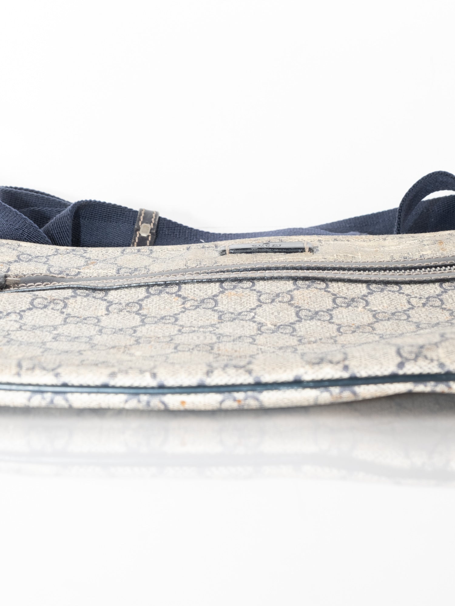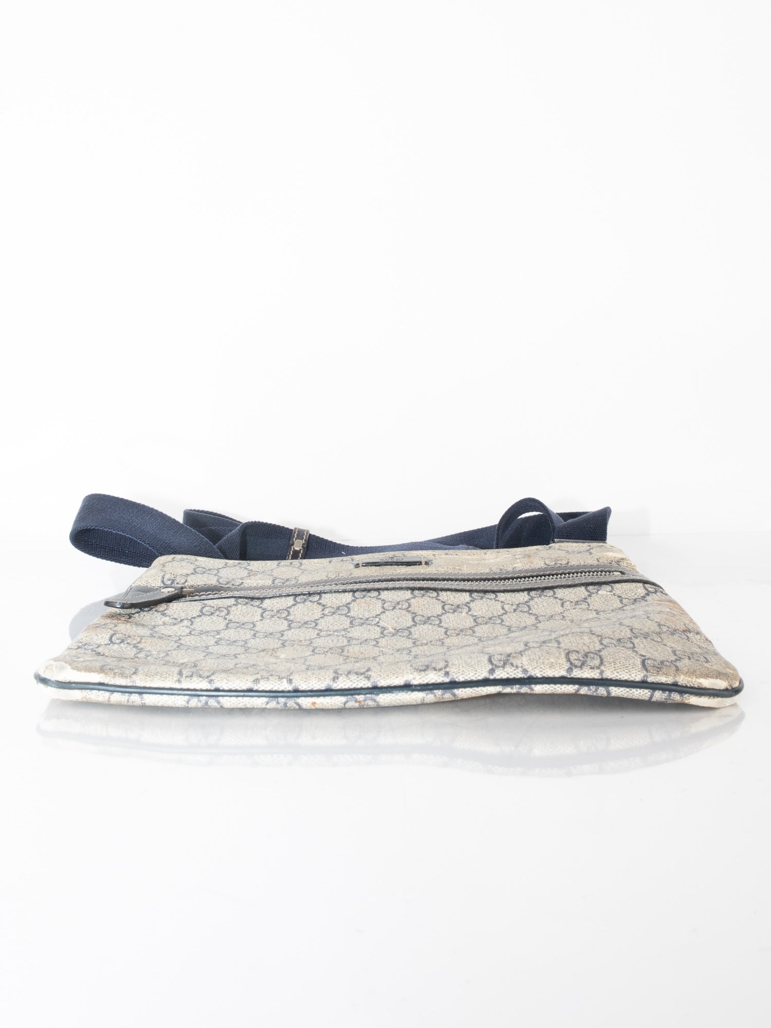 View Similar Productsתיק צד וינטג׳ של גוצ׳י (Gucci) בעיצוב שטוח ופרקטי מבד קנבס עם הדפס GG בצבע בז׳ ופרטים בגוון כחול־אפור. כולל רצועת כתף מתכווננת ורוכסן קדמי.
