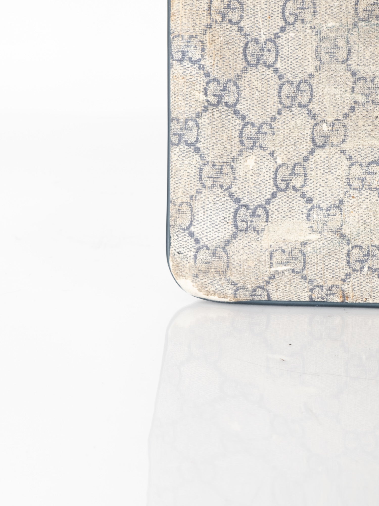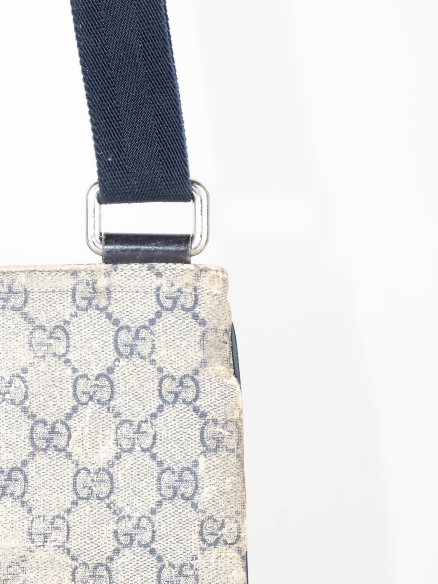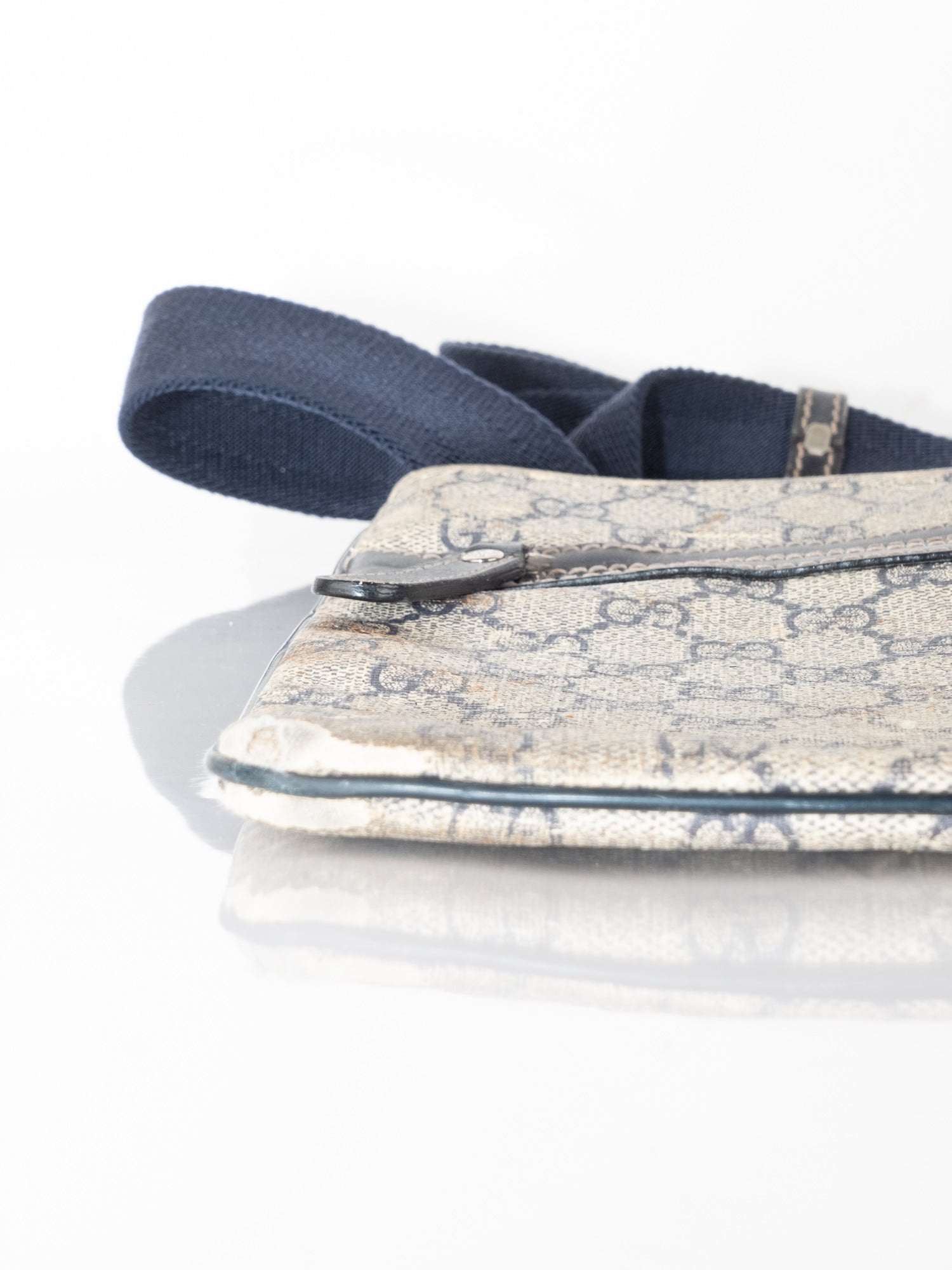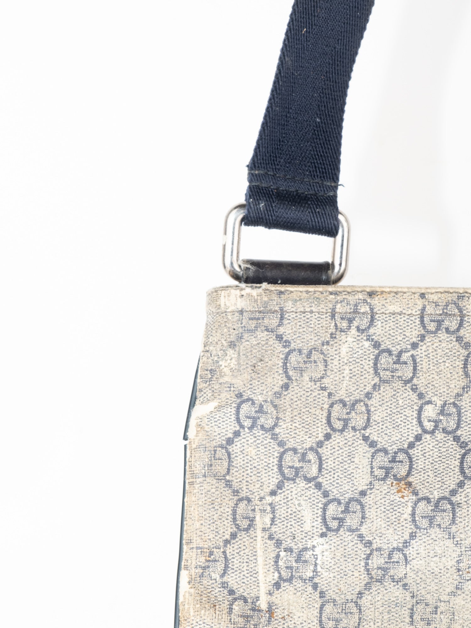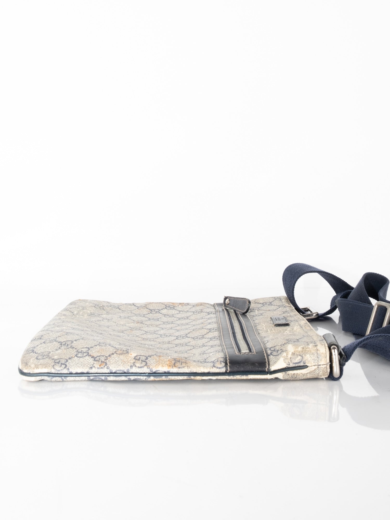 View Similar Productsתיק צד וינטג׳ של גוצ׳י (Gucci) בעיצוב שטוח ופרקטי מבד קנבס עם הדפס GG בצבע בז׳ ופרטים בגוון כחול־אפור. כולל רצועת כתף מתכווננת ורוכסן קדמי.