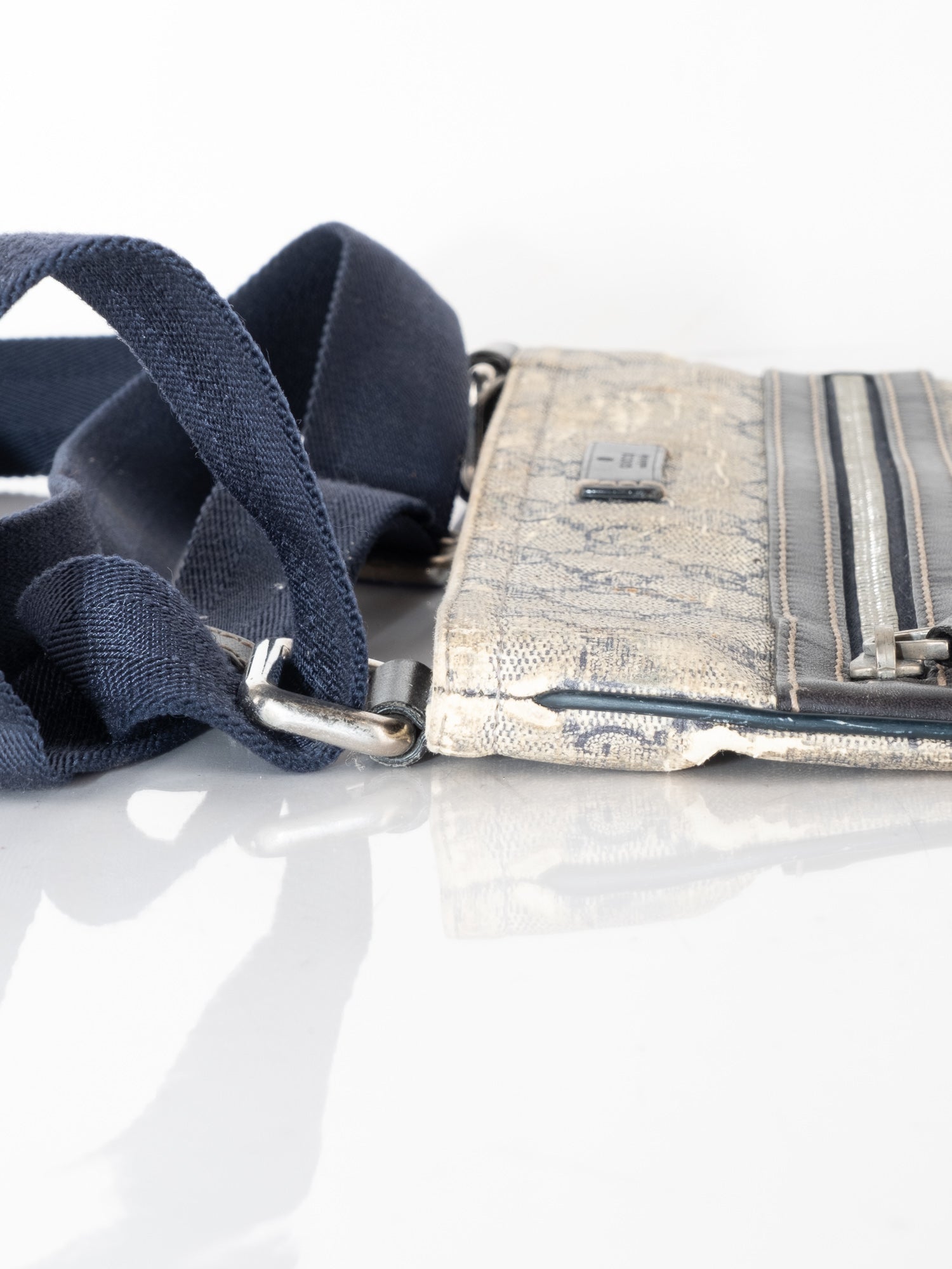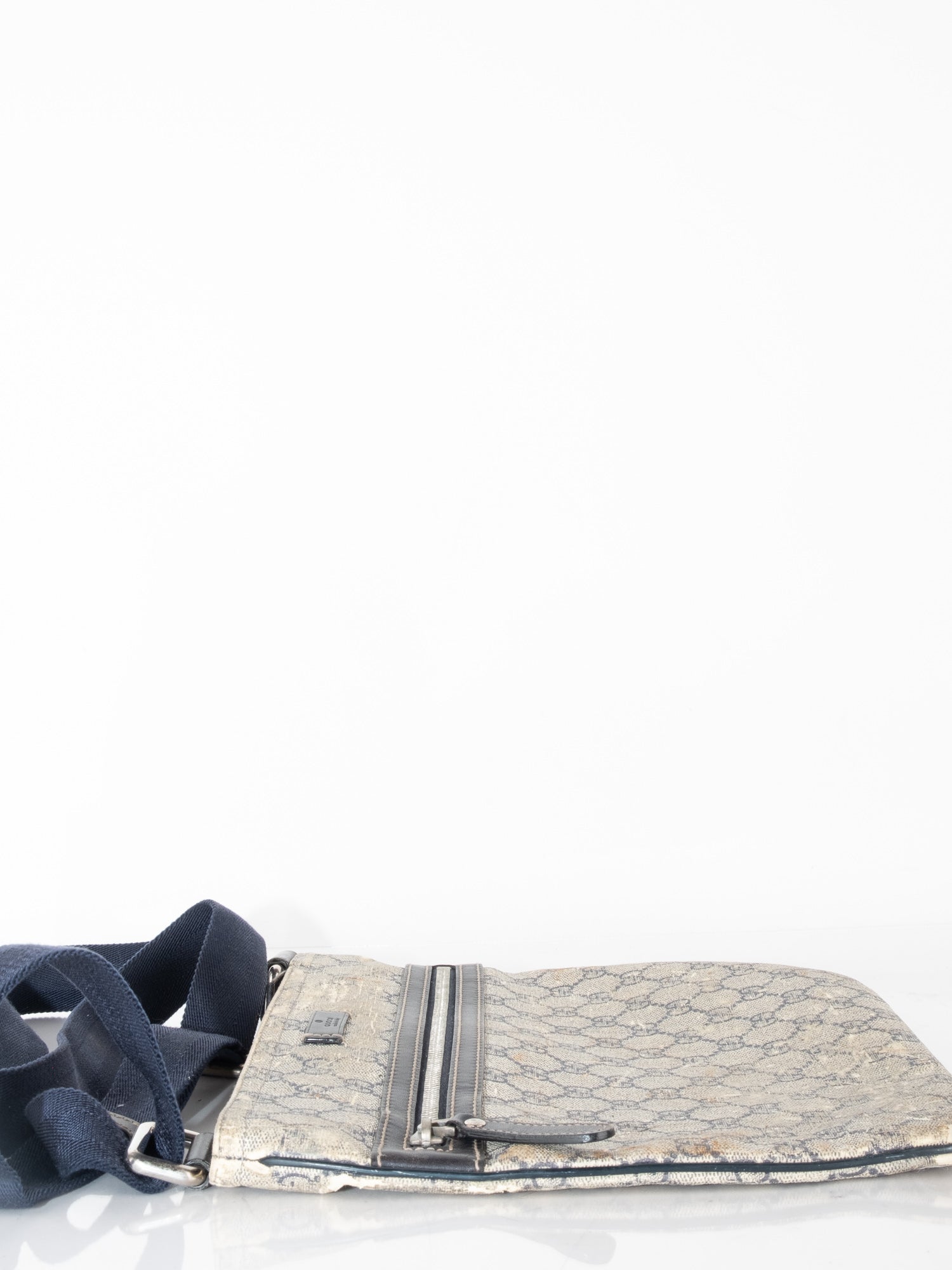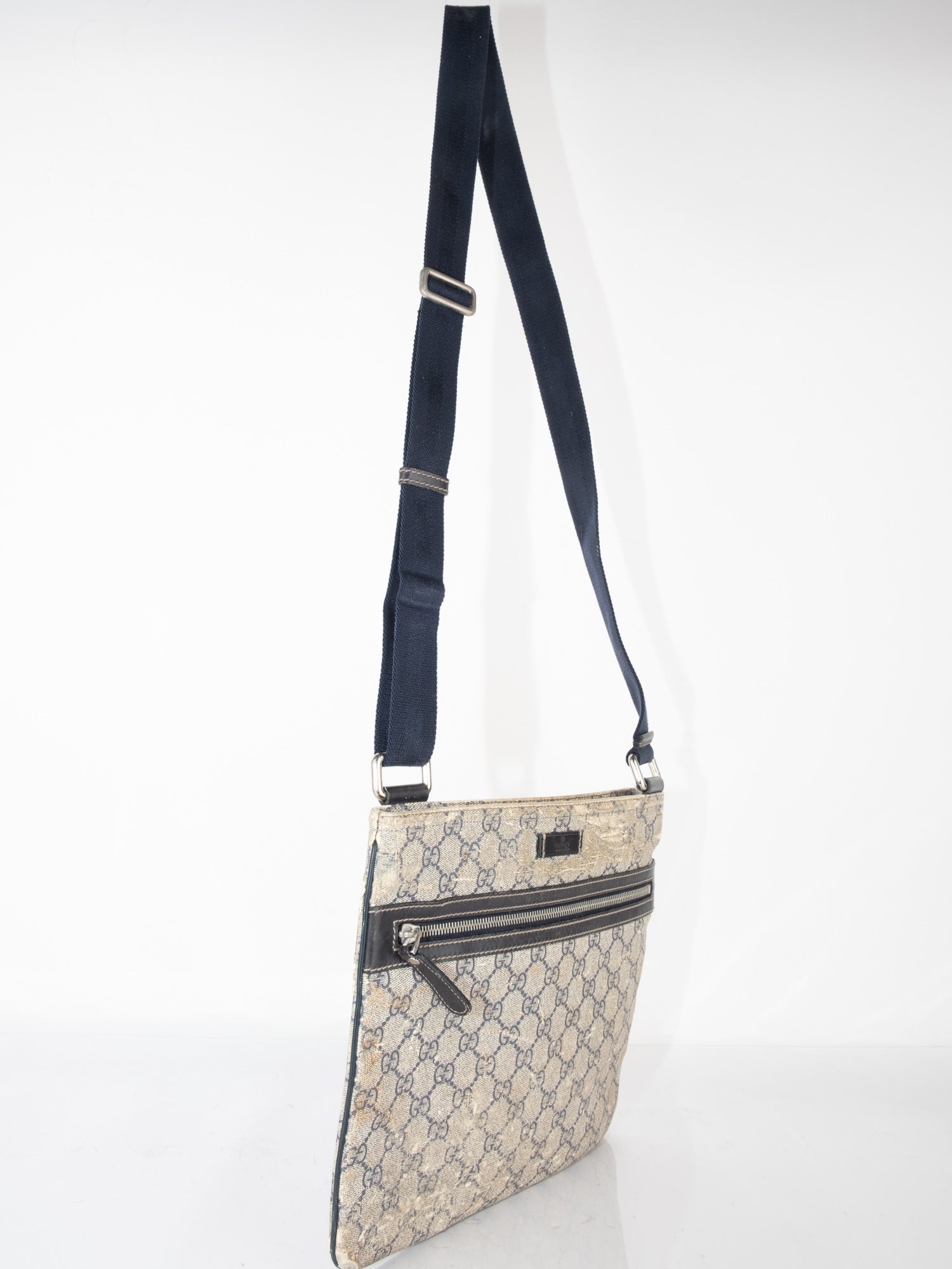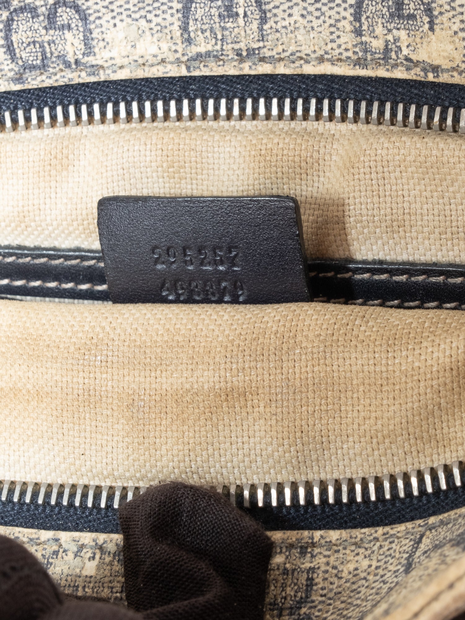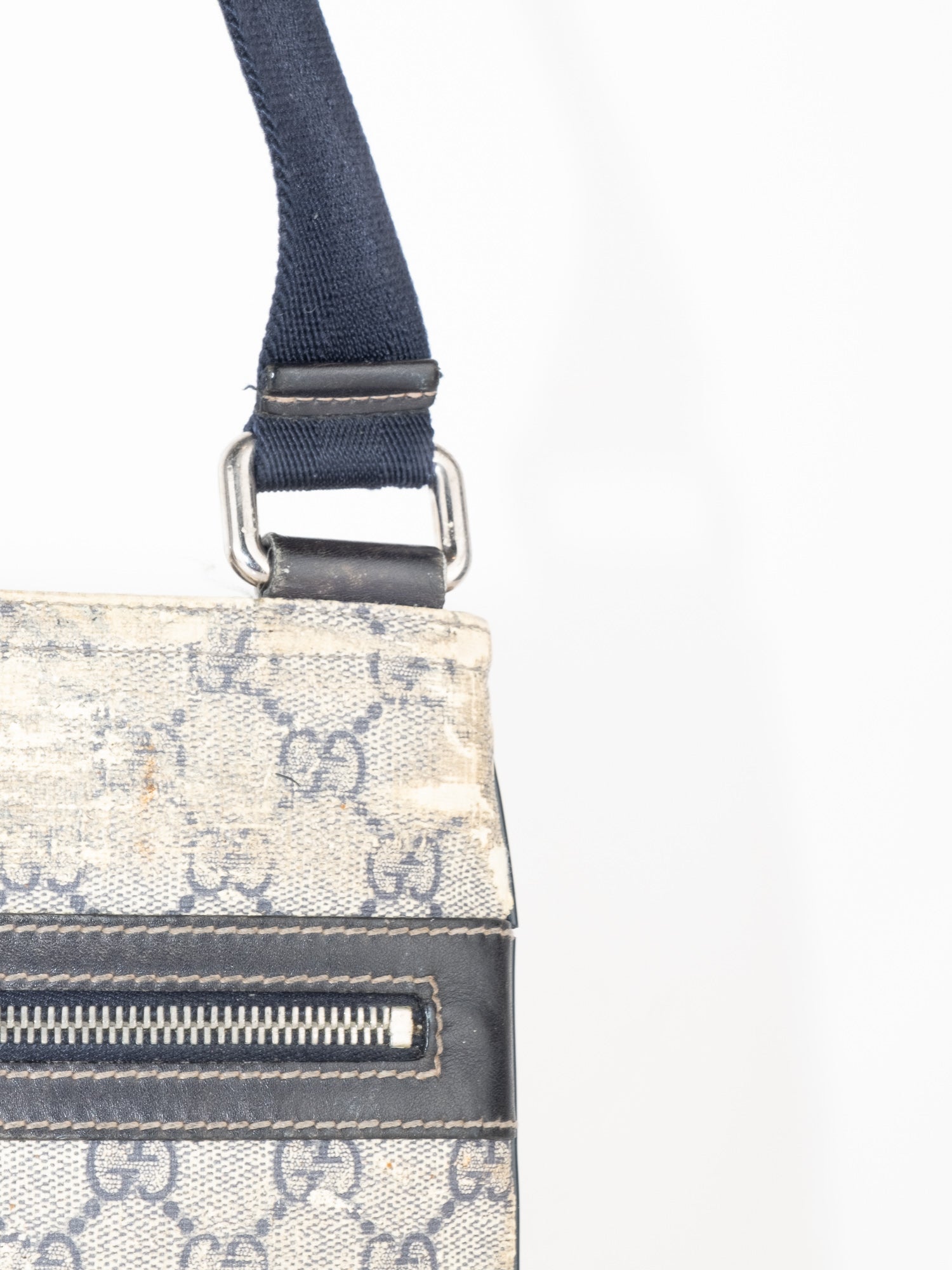 View Similar Productsתיק צד וינטג׳ של גוצ׳י (Gucci) בעיצוב שטוח ופרקטי מבד קנבס עם הדפס GG בצבע בז׳ ופרטים בגוון כחול־אפור. כולל רצועת כתף מתכווננת ורוכסן קדמי.