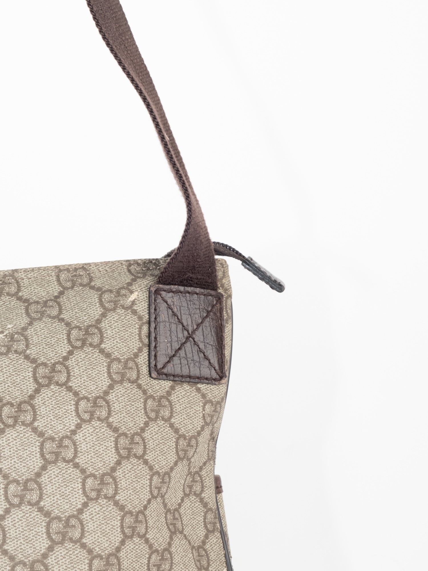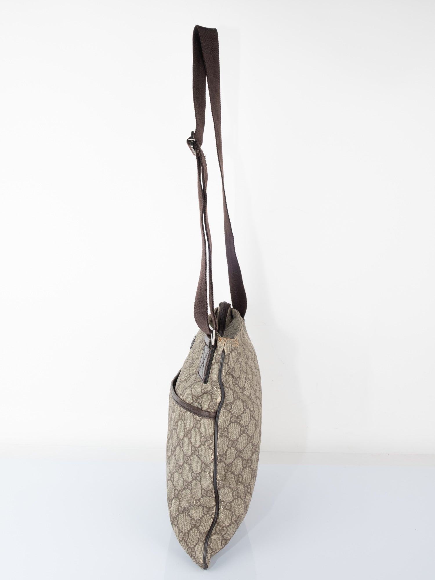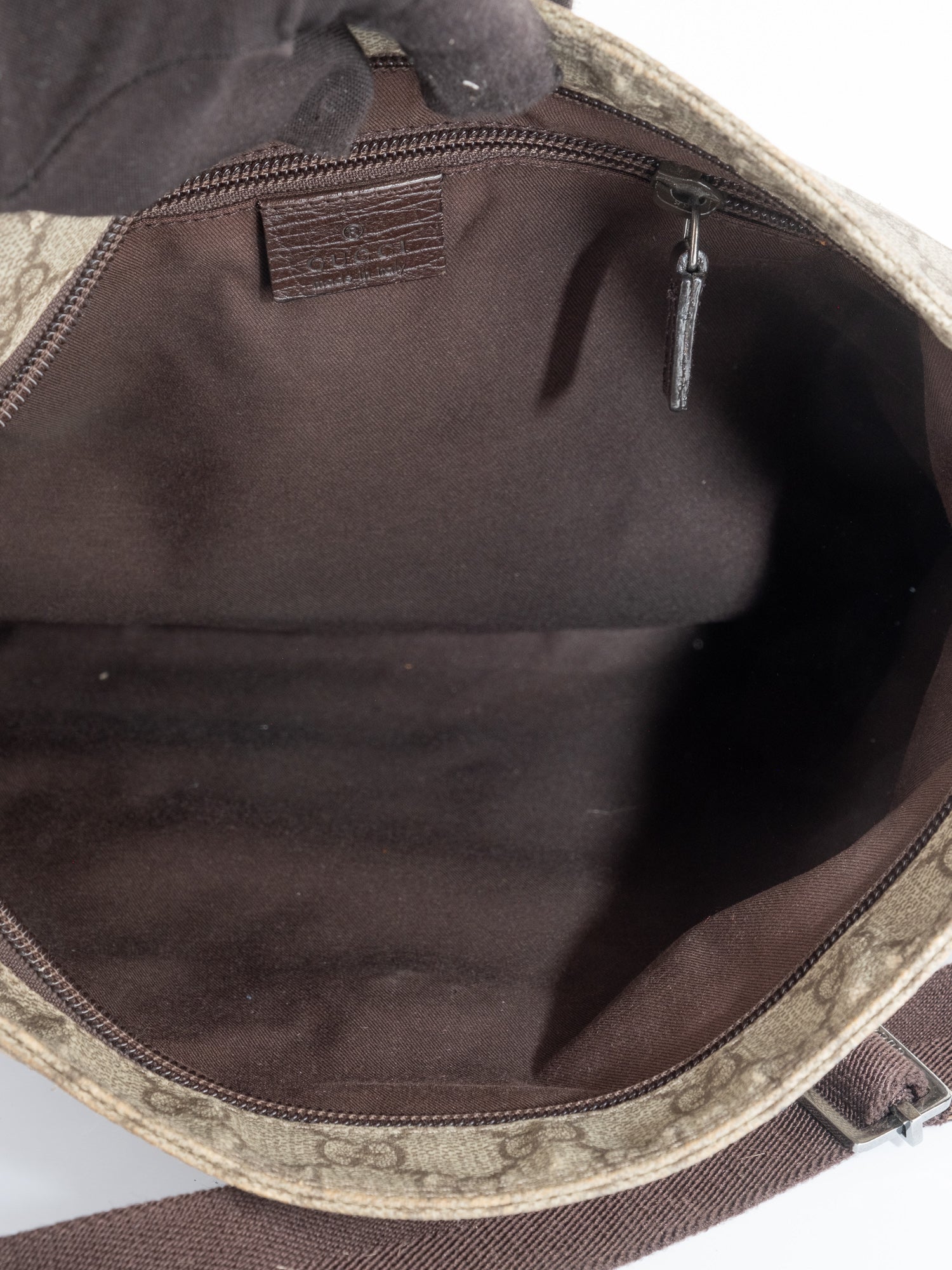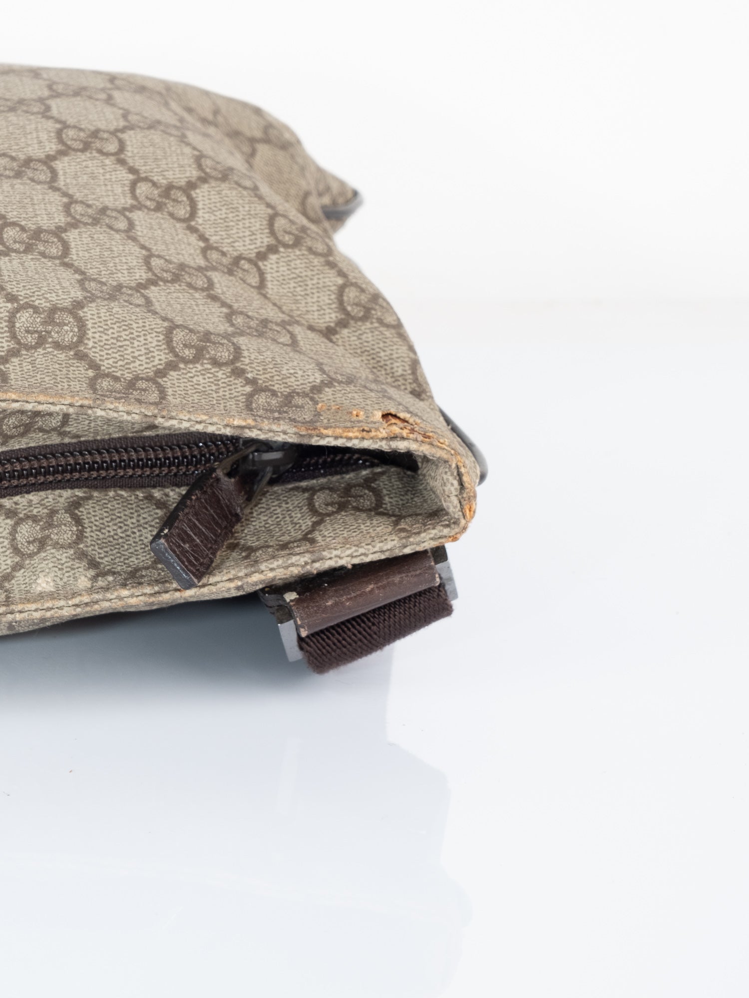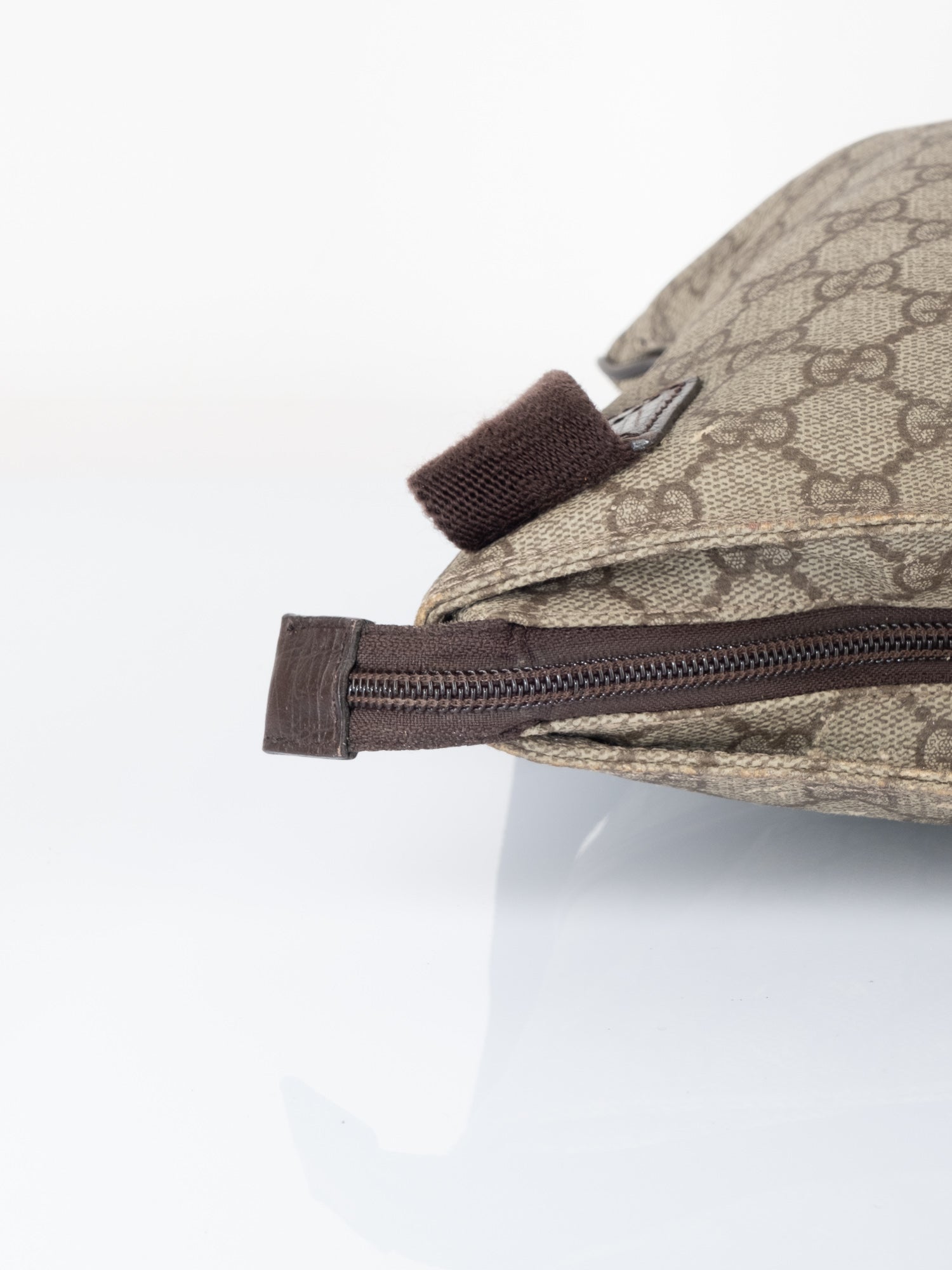 קנבס בגוון בז׳ עם הדפס GG קלאסי, רצועת בד חומה מתכווננת, תא מרכזי מרווח עם סגירת רוכסן ותא חיצוני עם רוכסן קדמי.