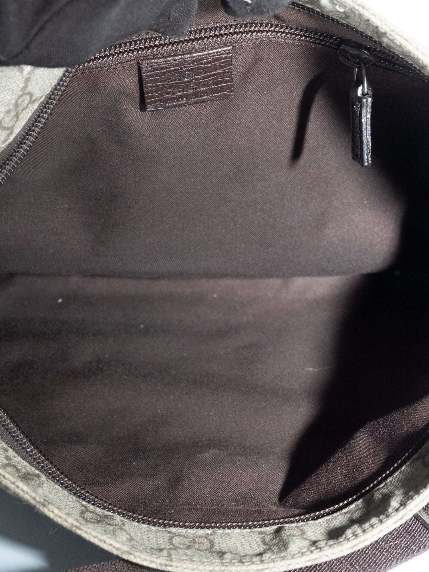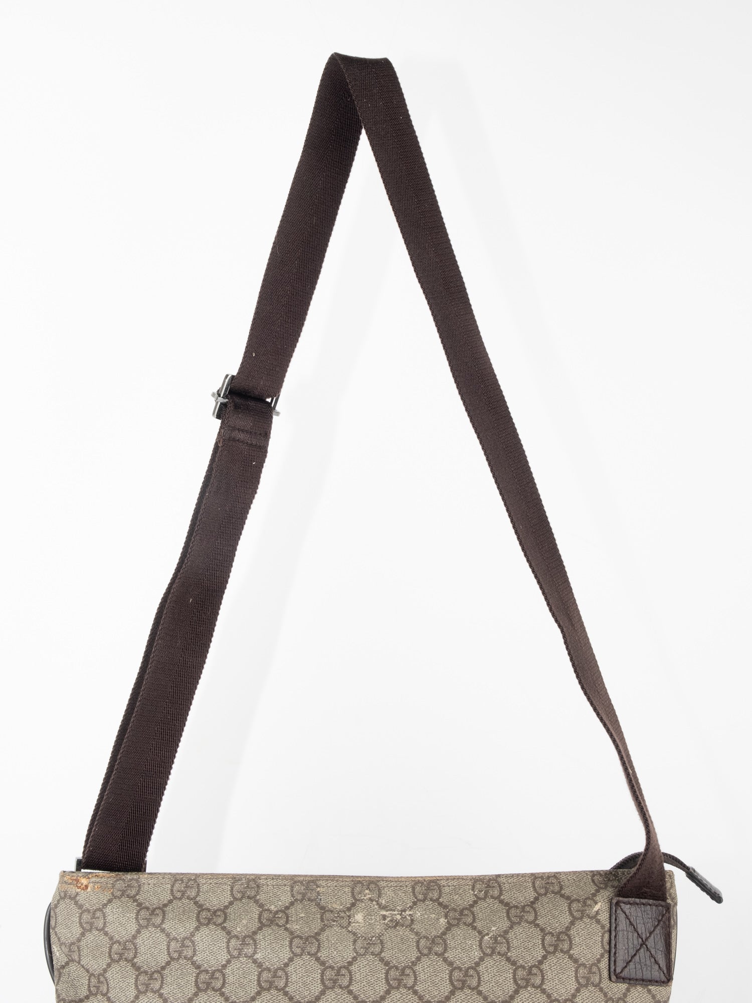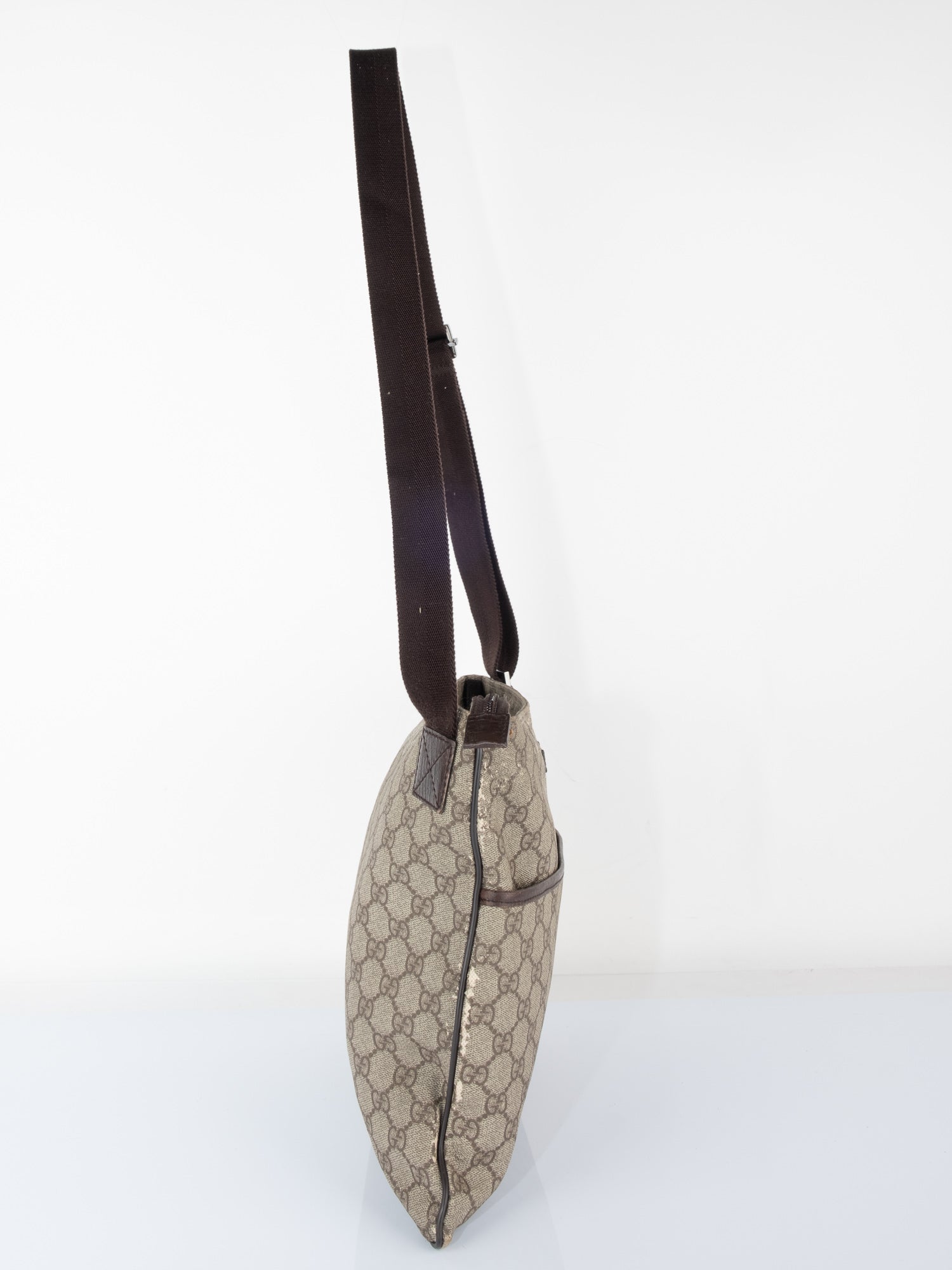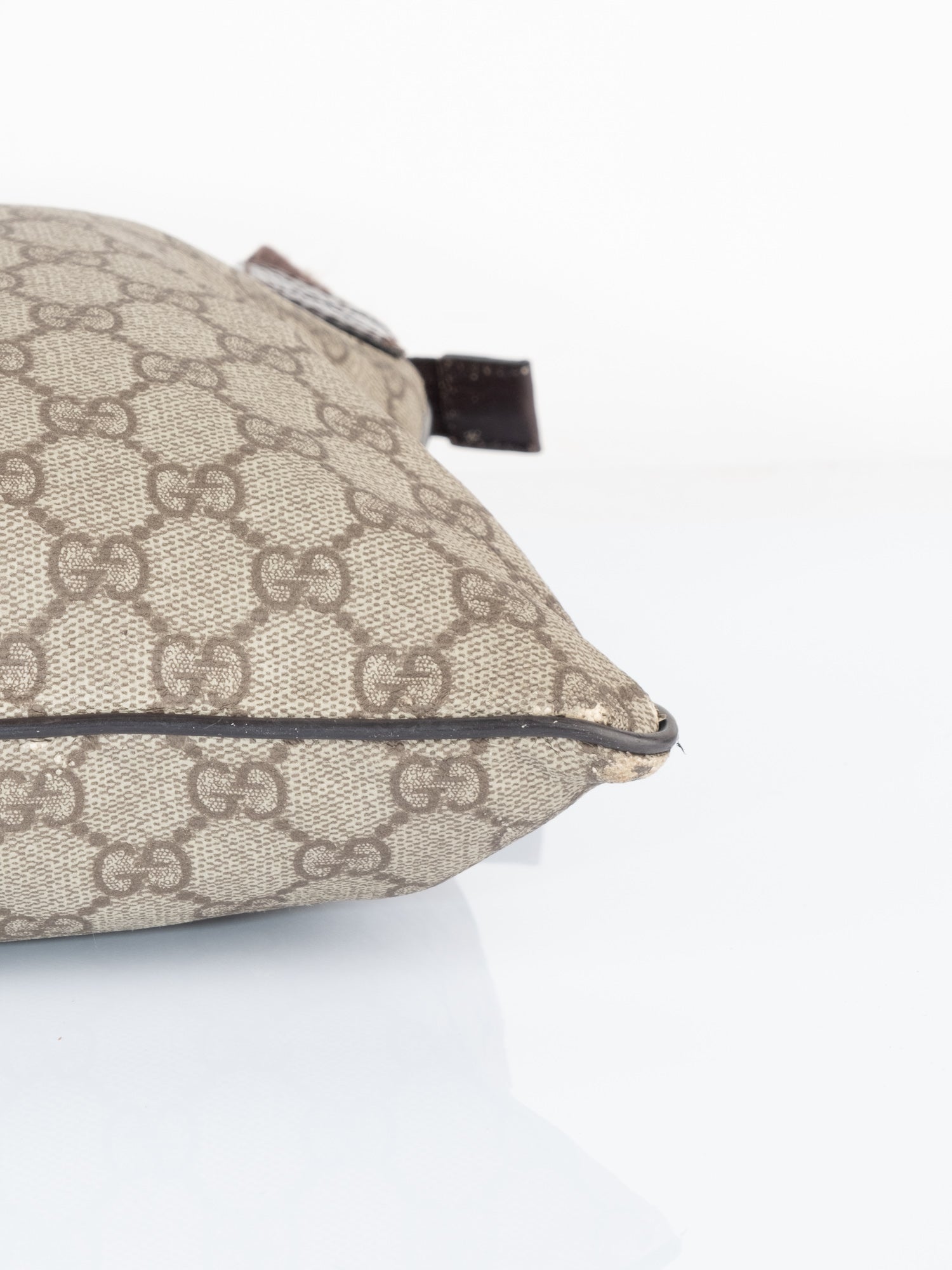 קנבס בגוון בז׳ עם הדפס GG קלאסי, רצועת בד חומה מתכווננת, תא מרכזי מרווח עם סגירת רוכסן ותא חיצוני עם רוכסן קדמי.