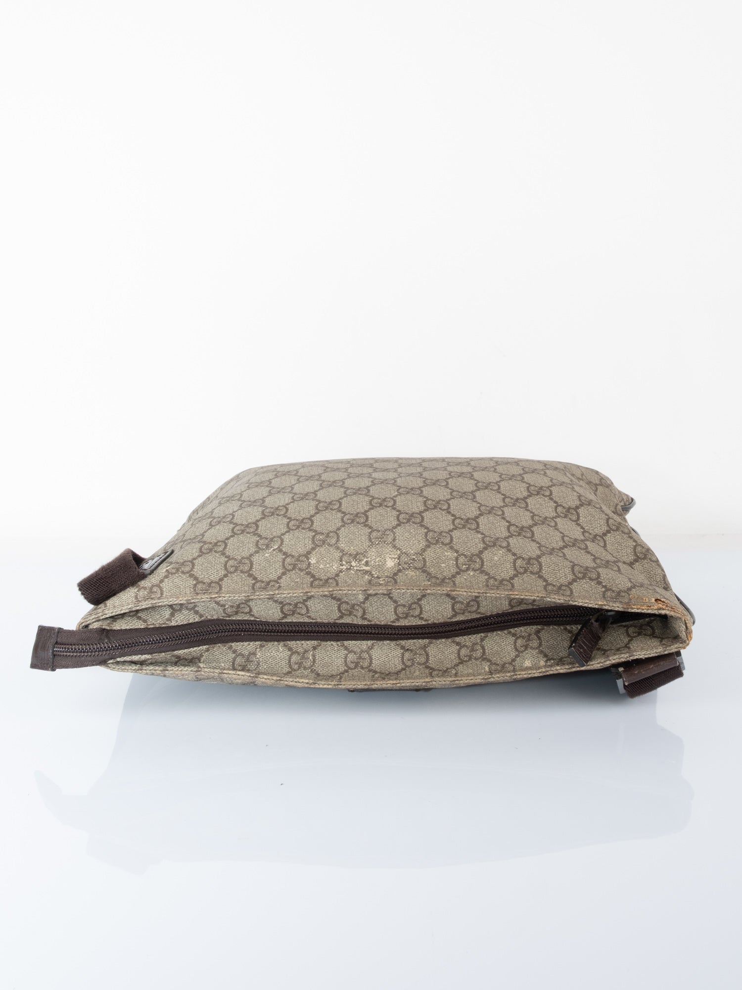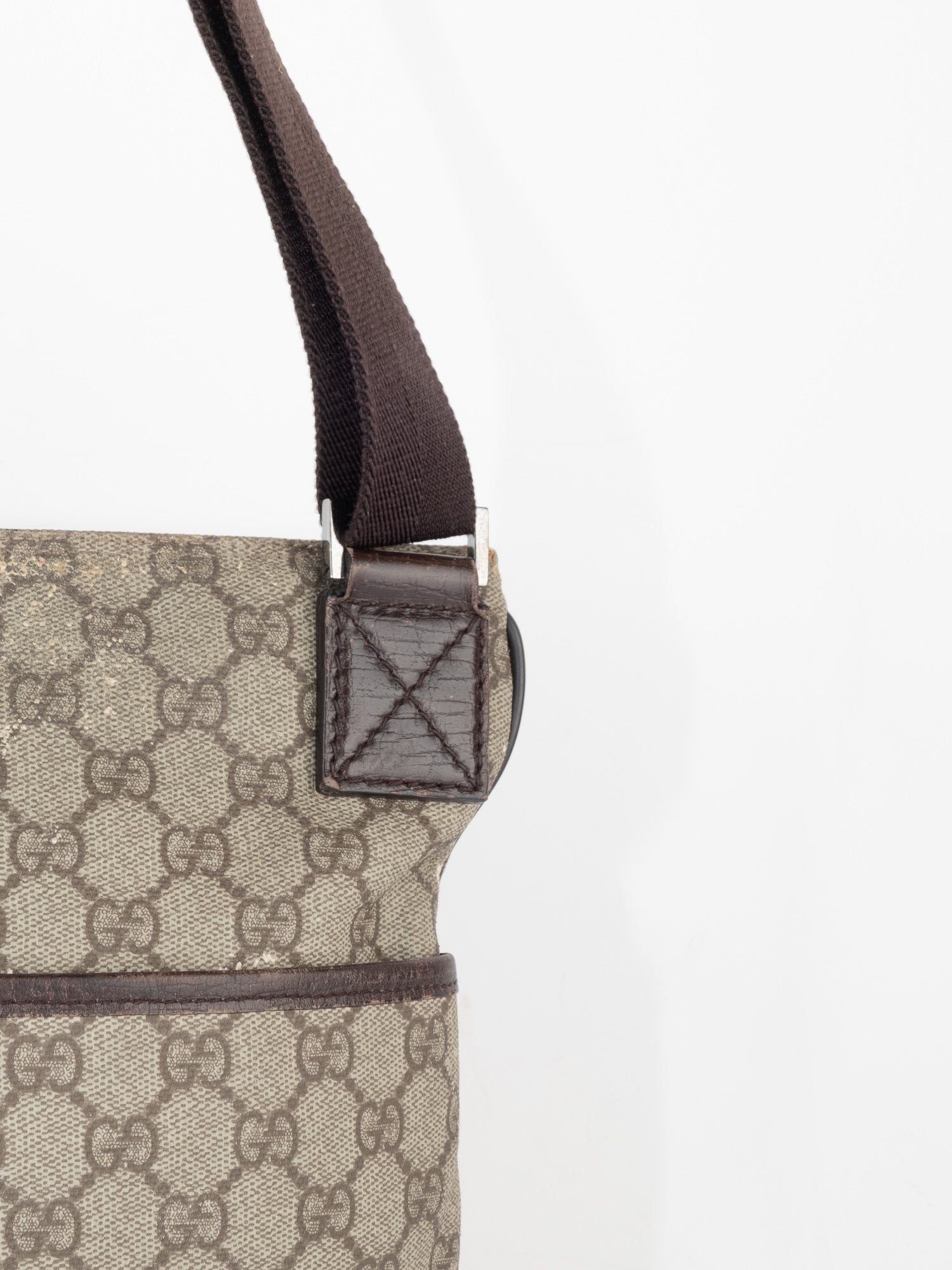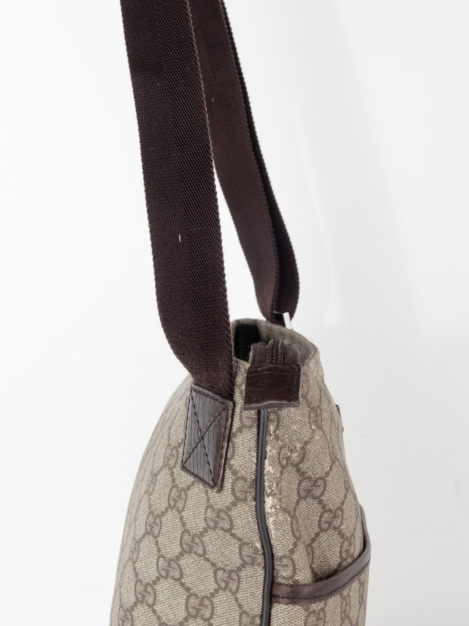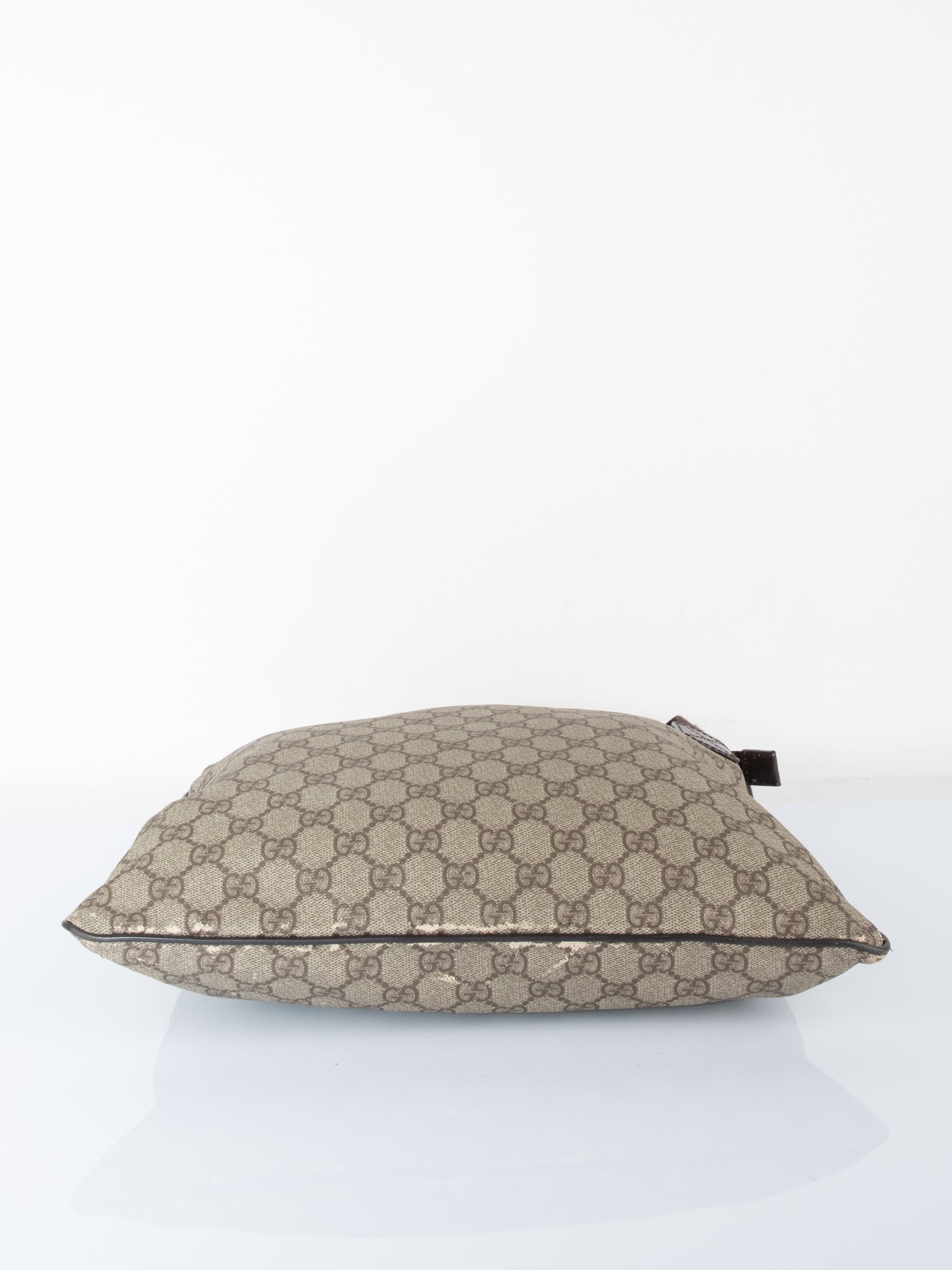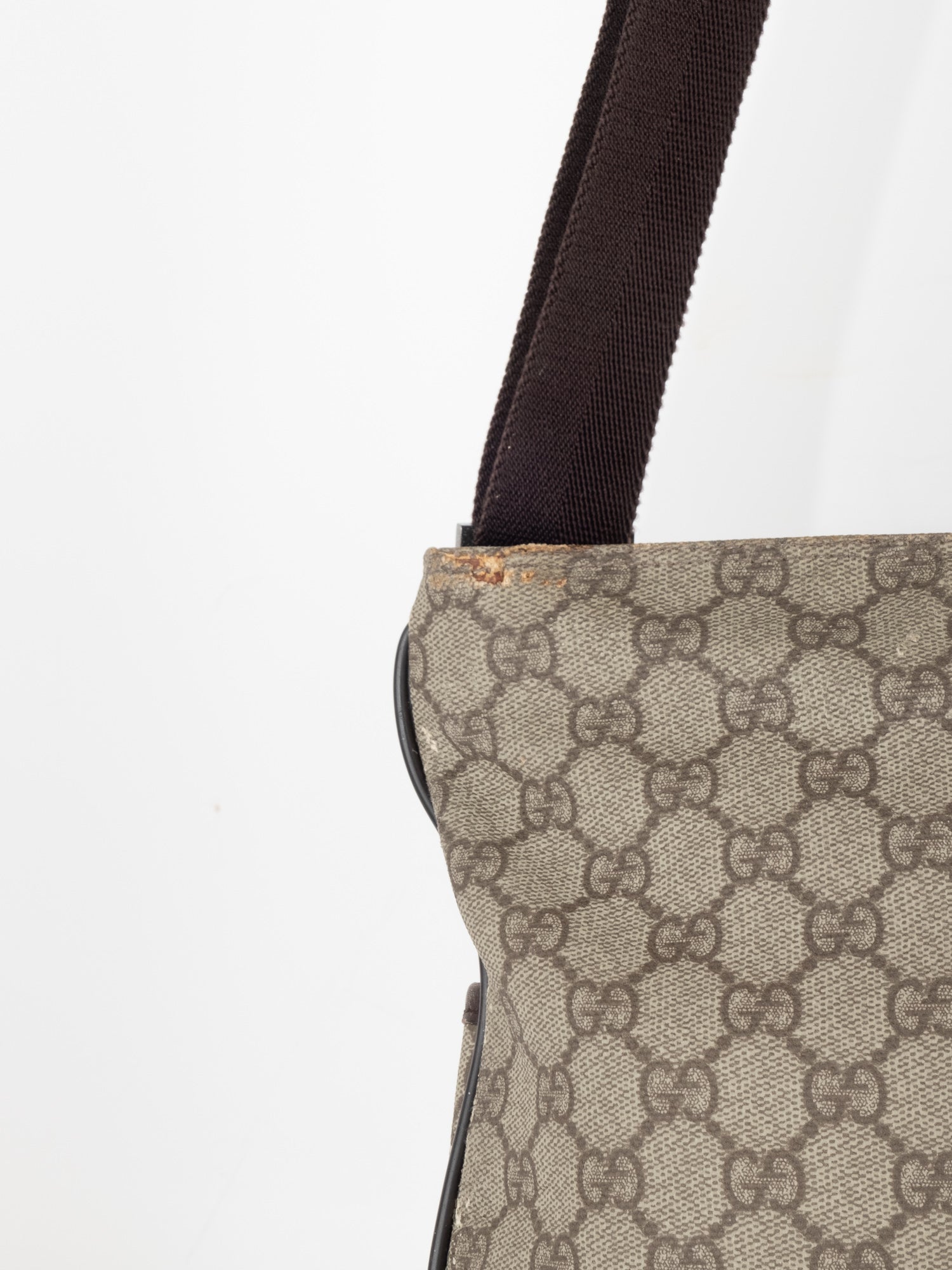 קנבס בגוון בז׳ עם הדפס GG קלאסי, רצועת בד חומה מתכווננת, תא מרכזי מרווח עם סגירת רוכסן ותא חיצוני עם רוכסן קדמי.