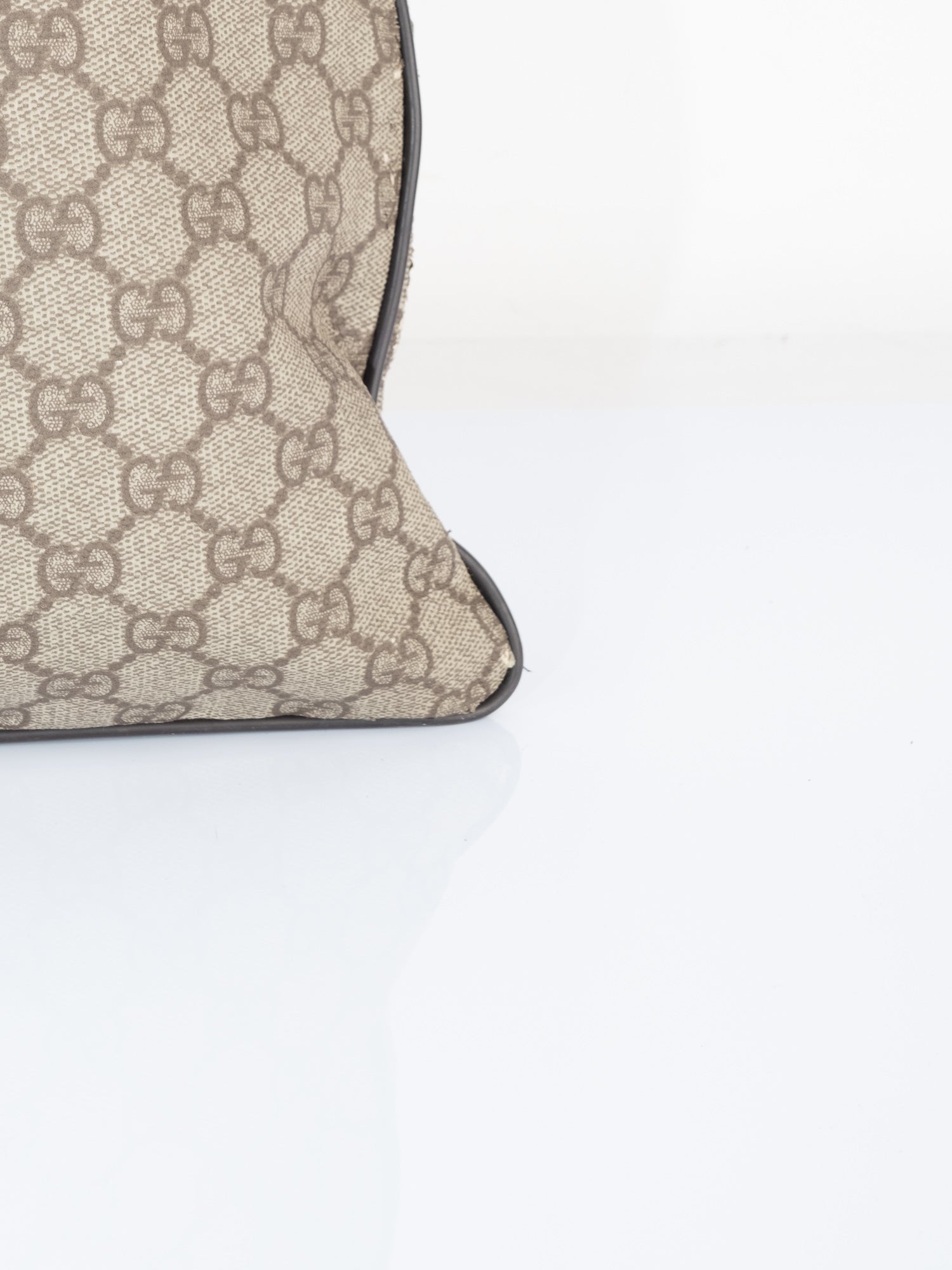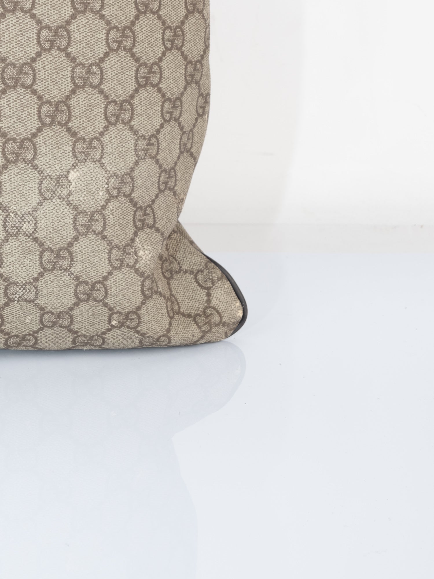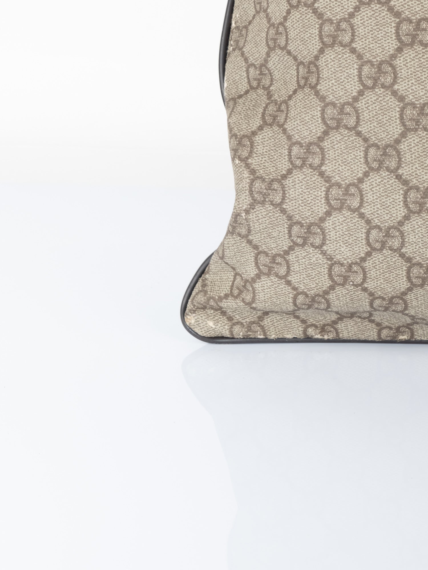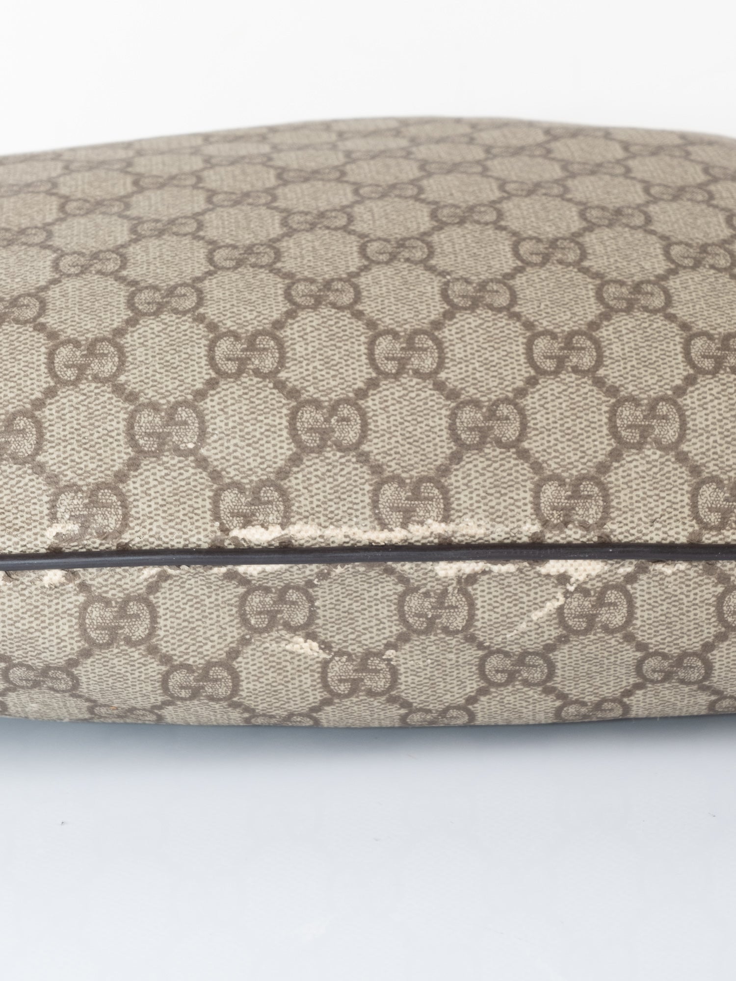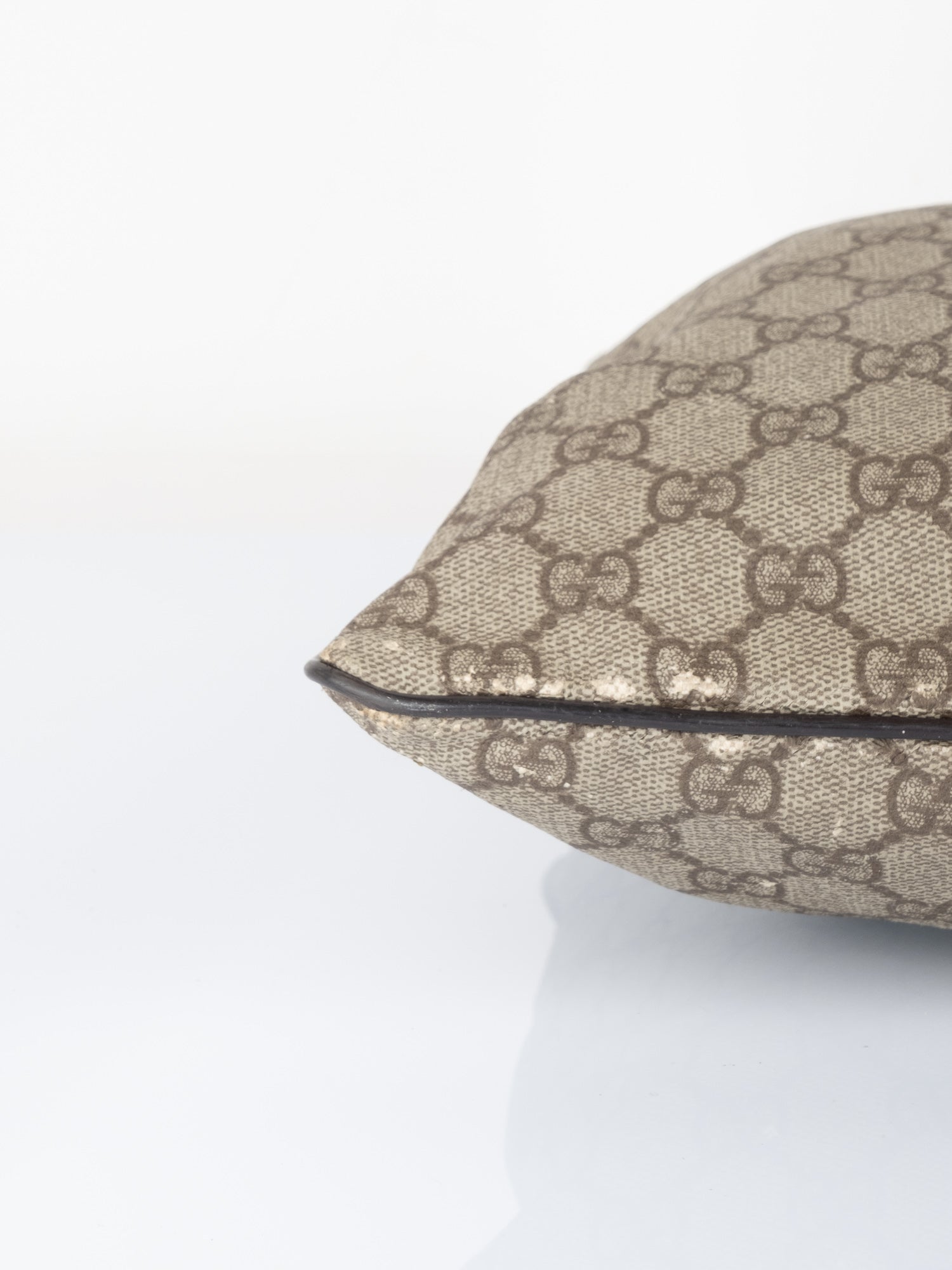 קנבס בגוון בז׳ עם הדפס GG קלאסי, רצועת בד חומה מתכווננת, תא מרכזי מרווח עם סגירת רוכסן ותא חיצוני עם רוכסן קדמי.