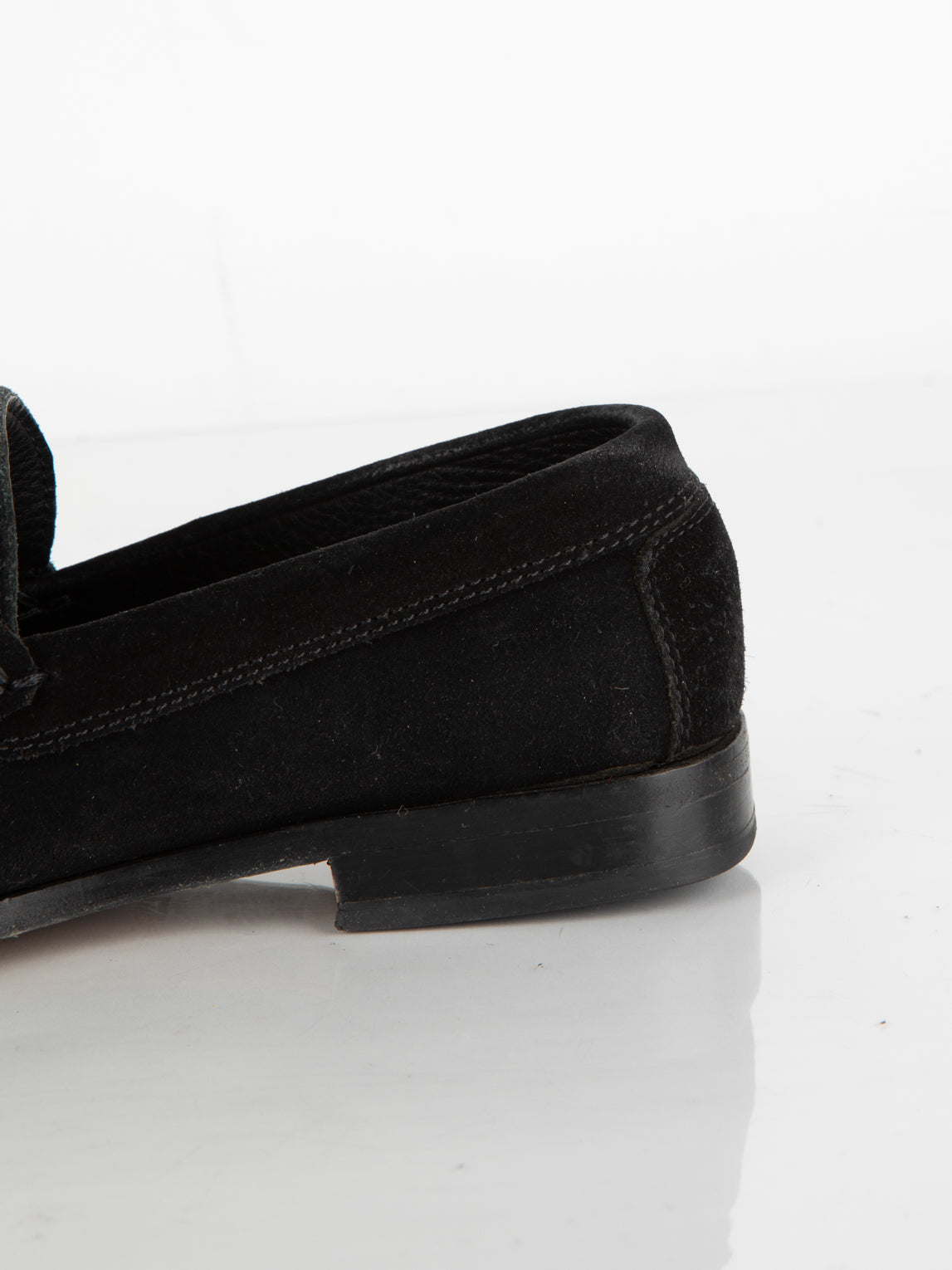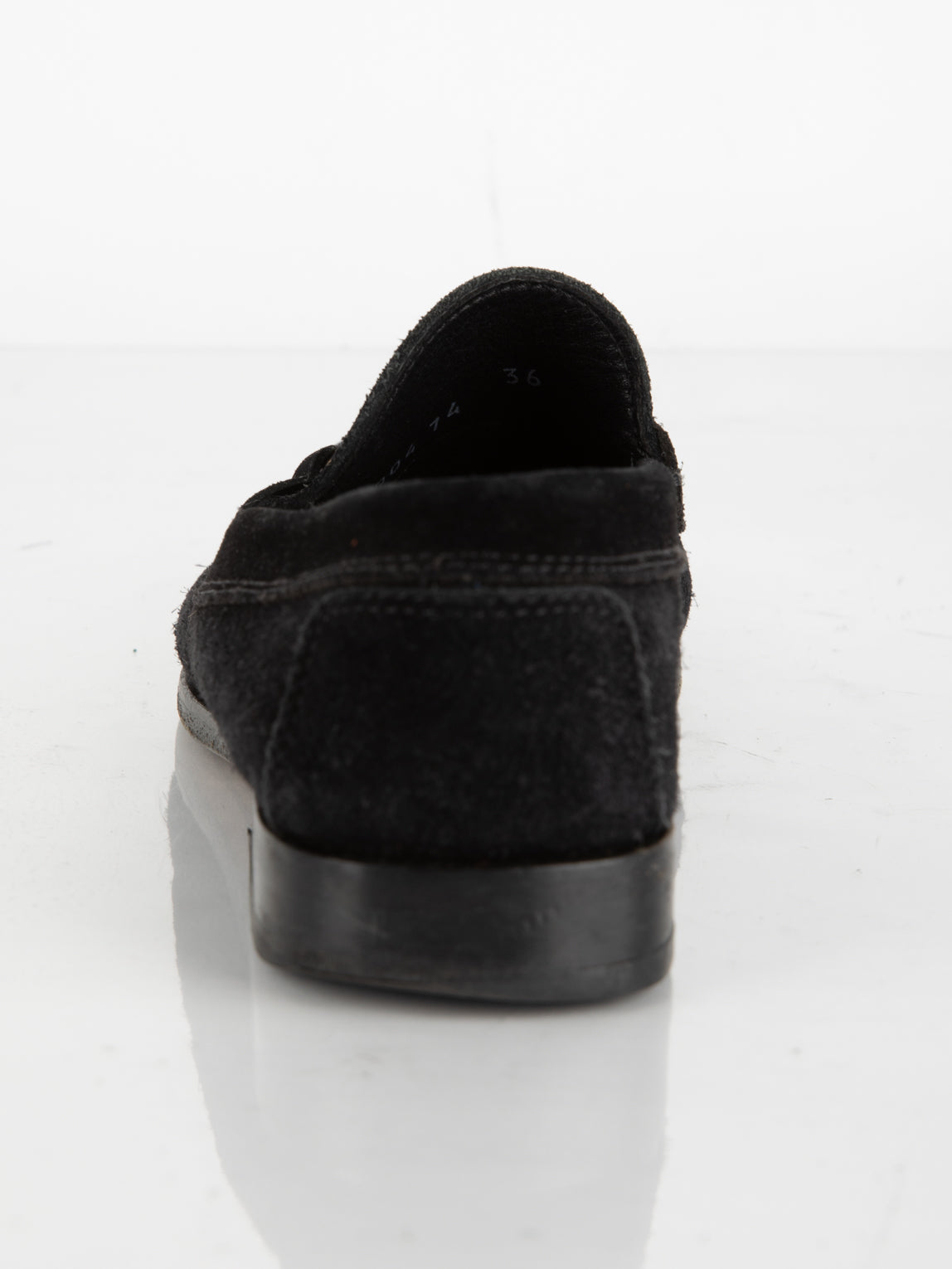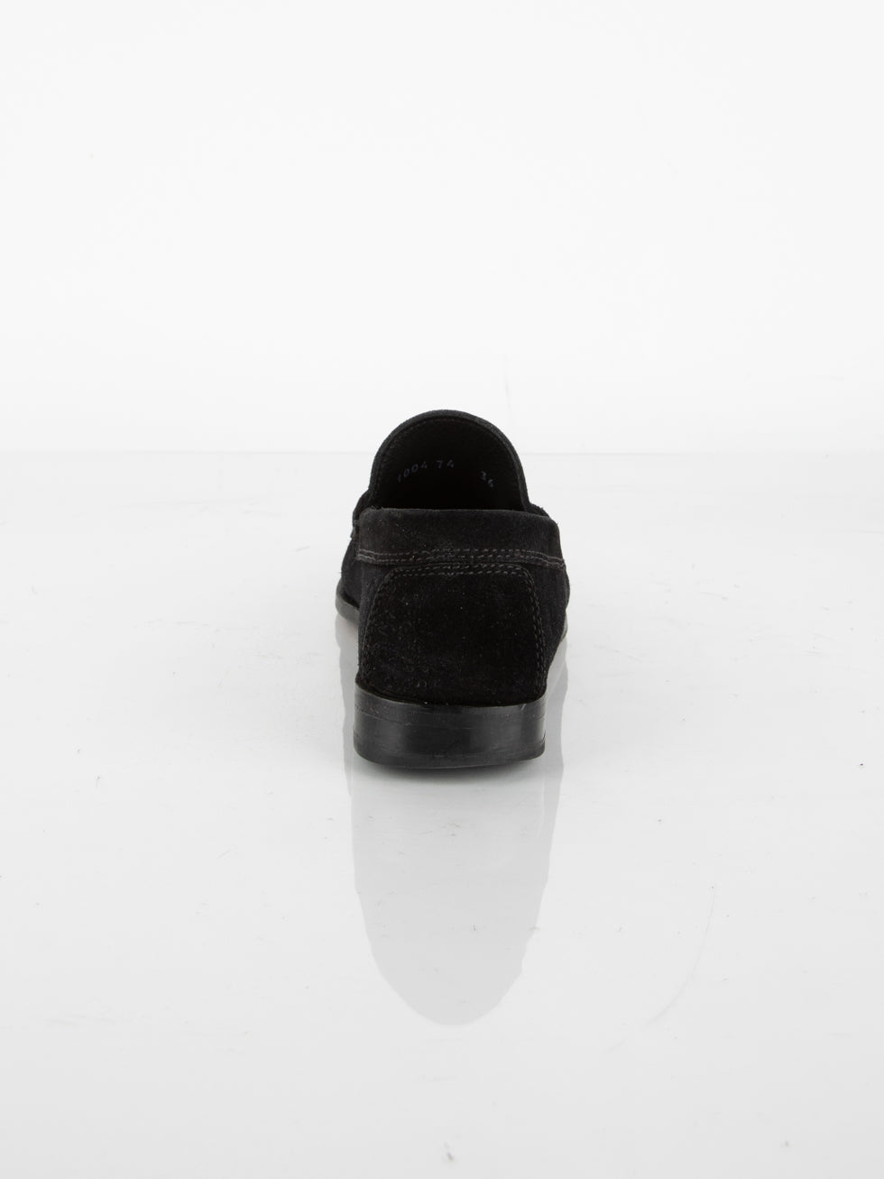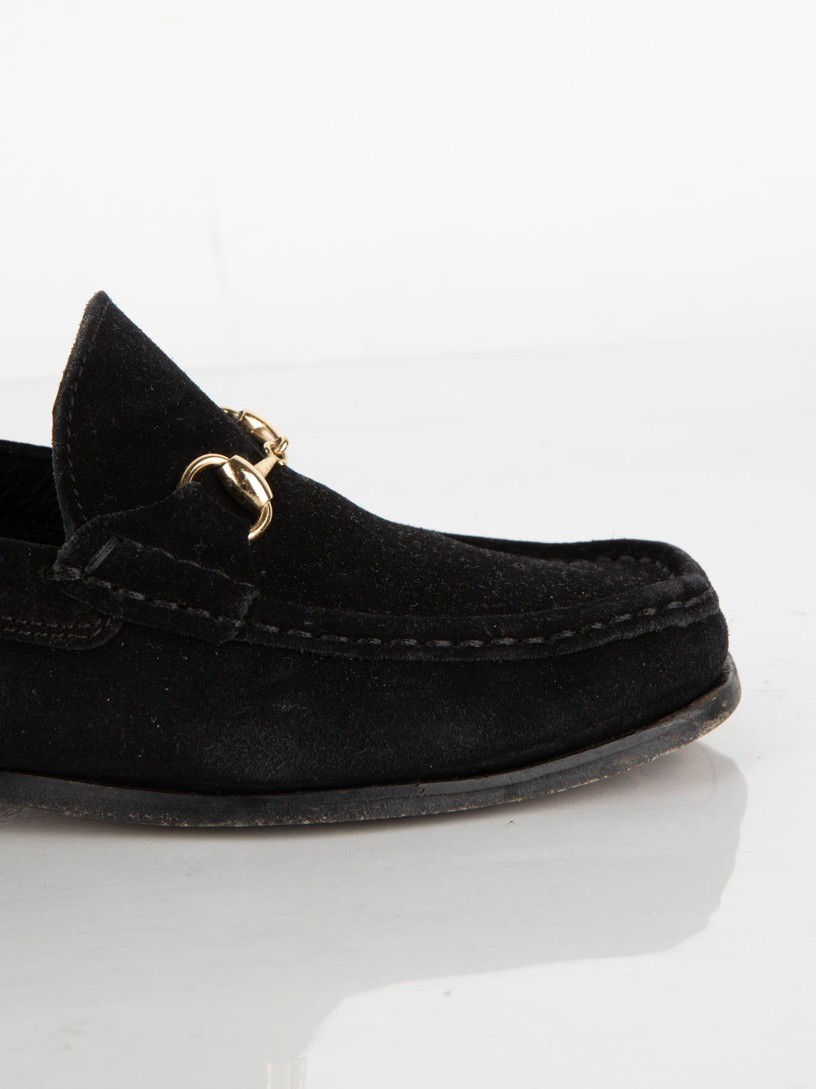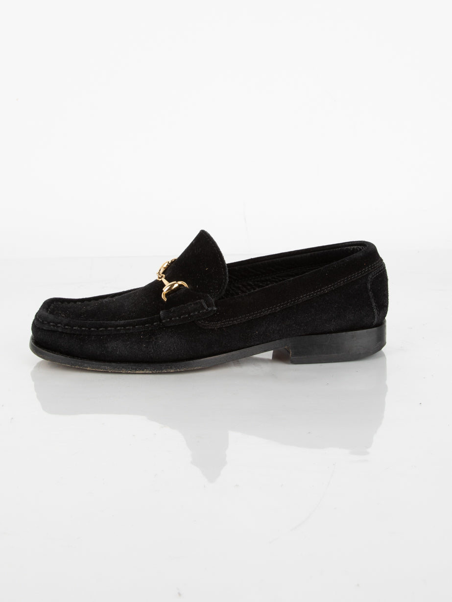 מוקסין העשוי מעור זמש בצבע שחור בעל דיטיילים מוזהבים.