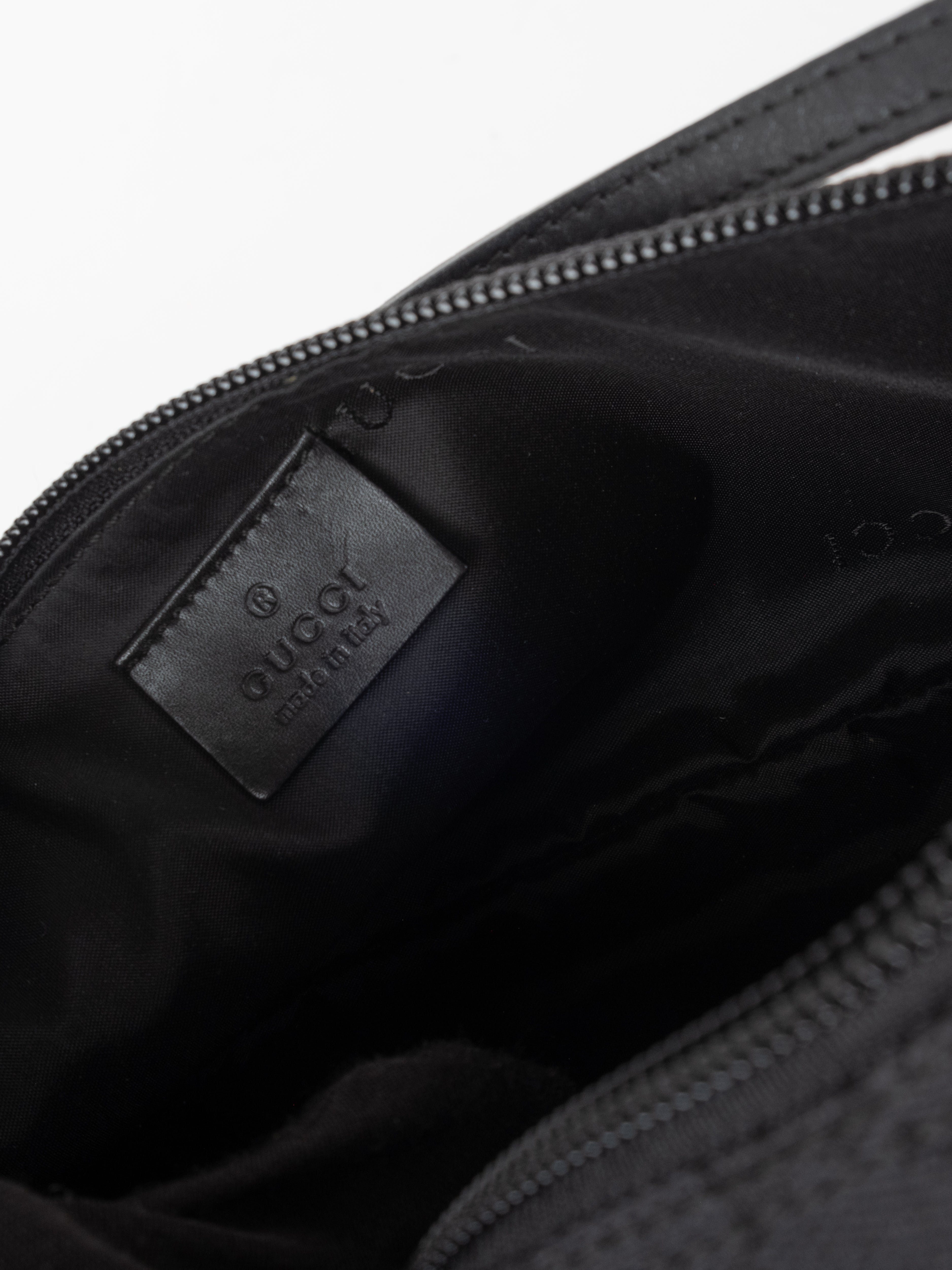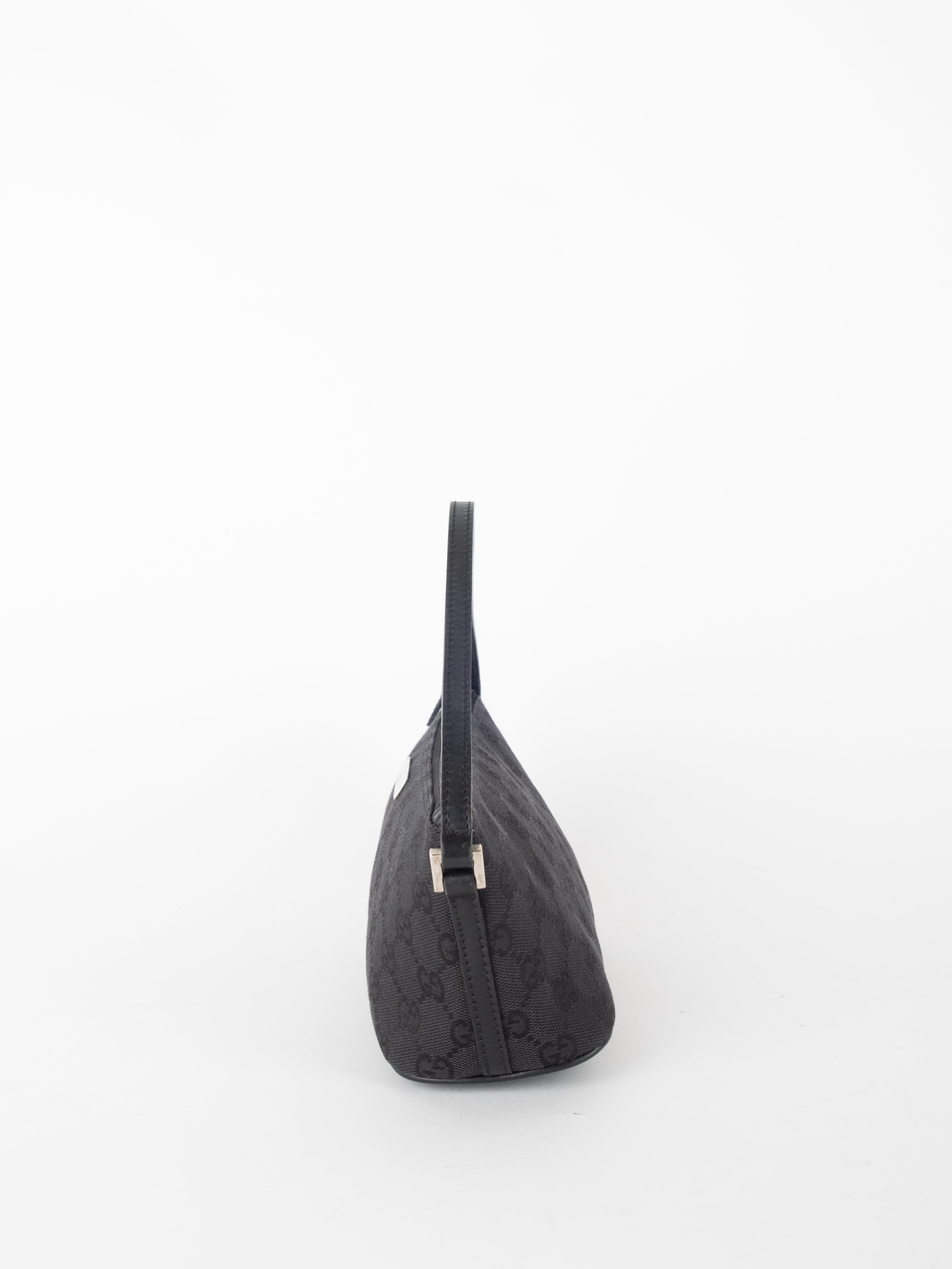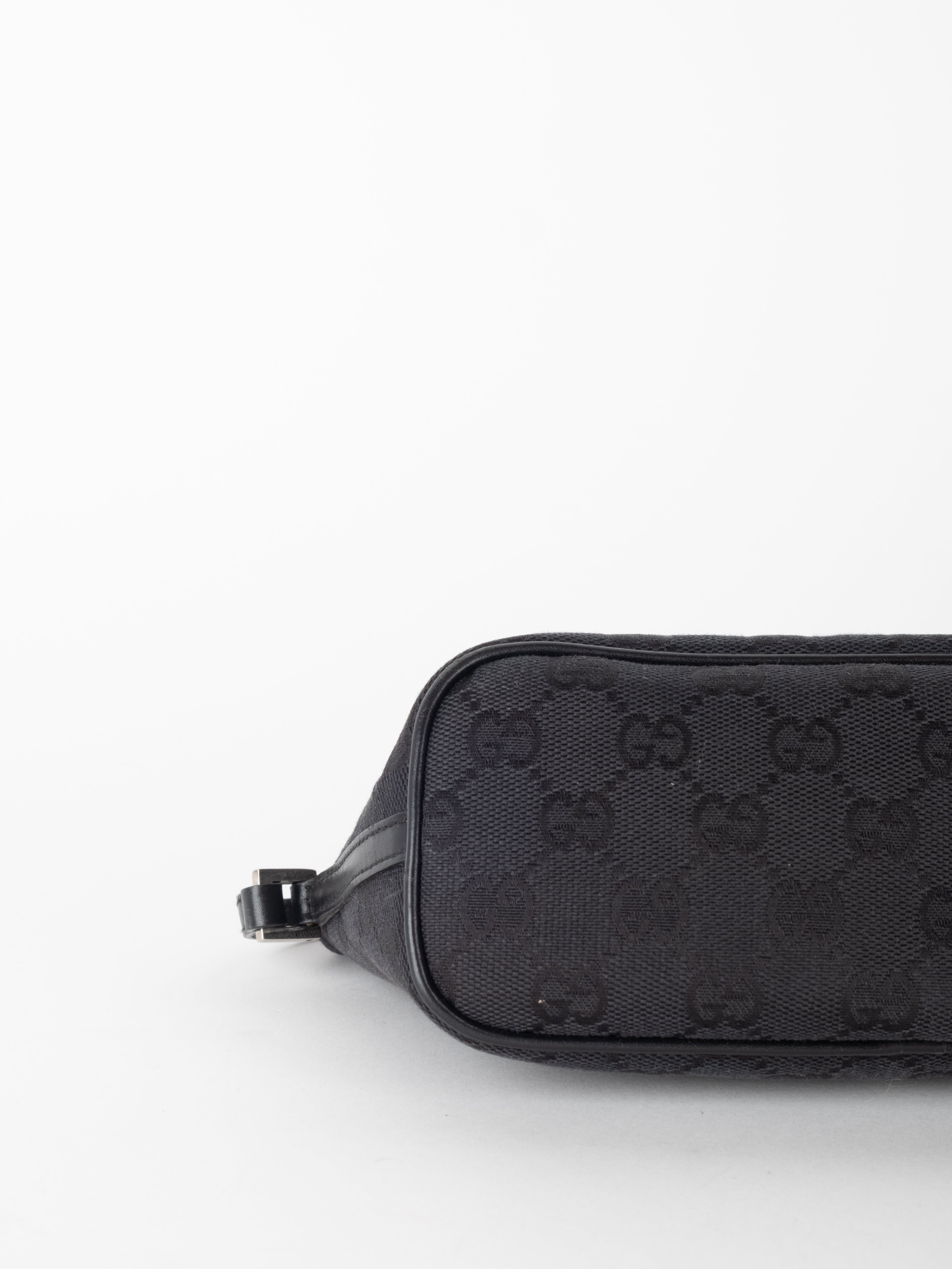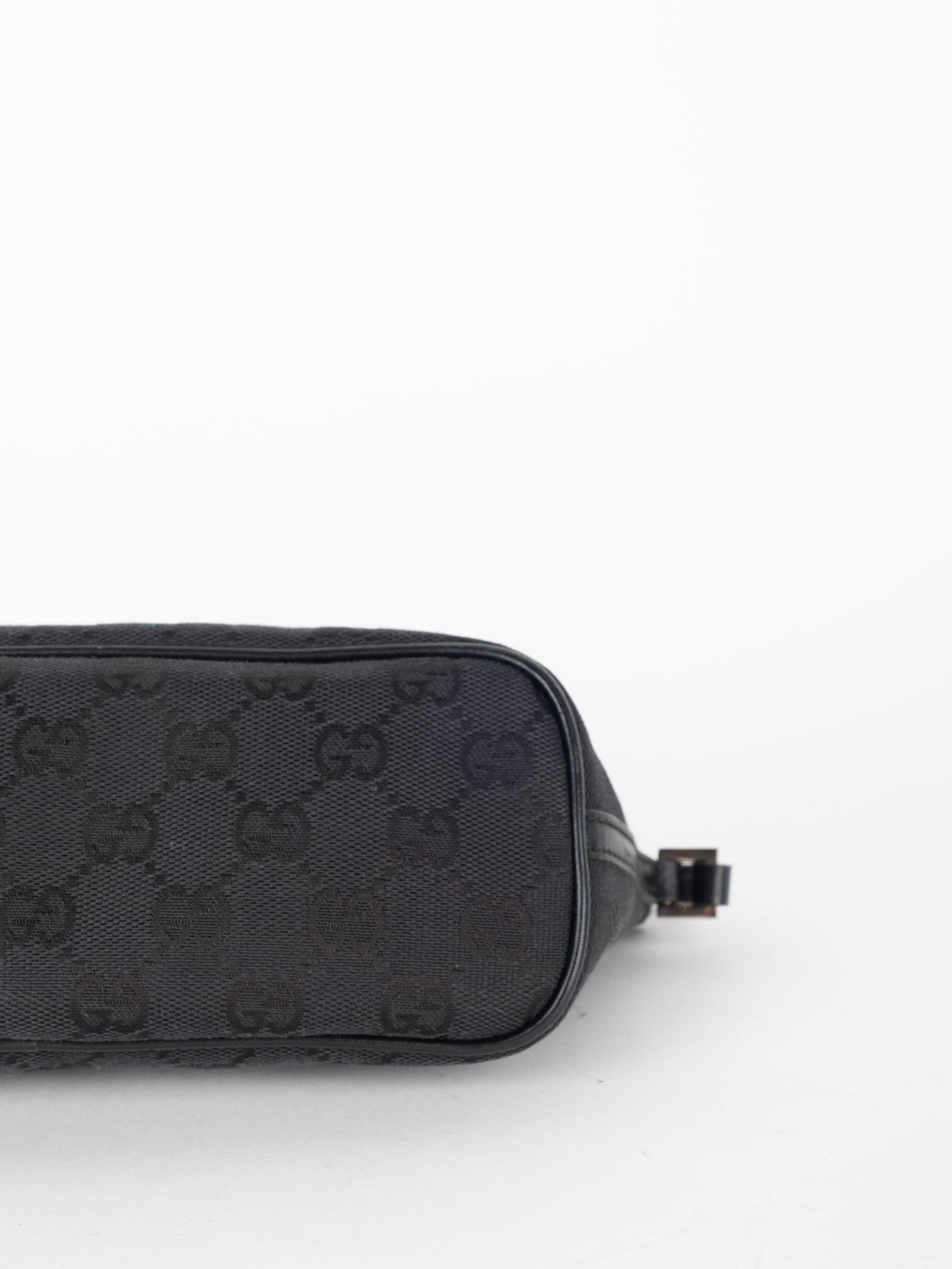 התיק עשוי קנבס מונוגרמי GG בצבע שחור כהה, כולל רצועת כתף דקה וסגירת רוכסן עליונה. תא פנימי אחד עם בטנה כהה.