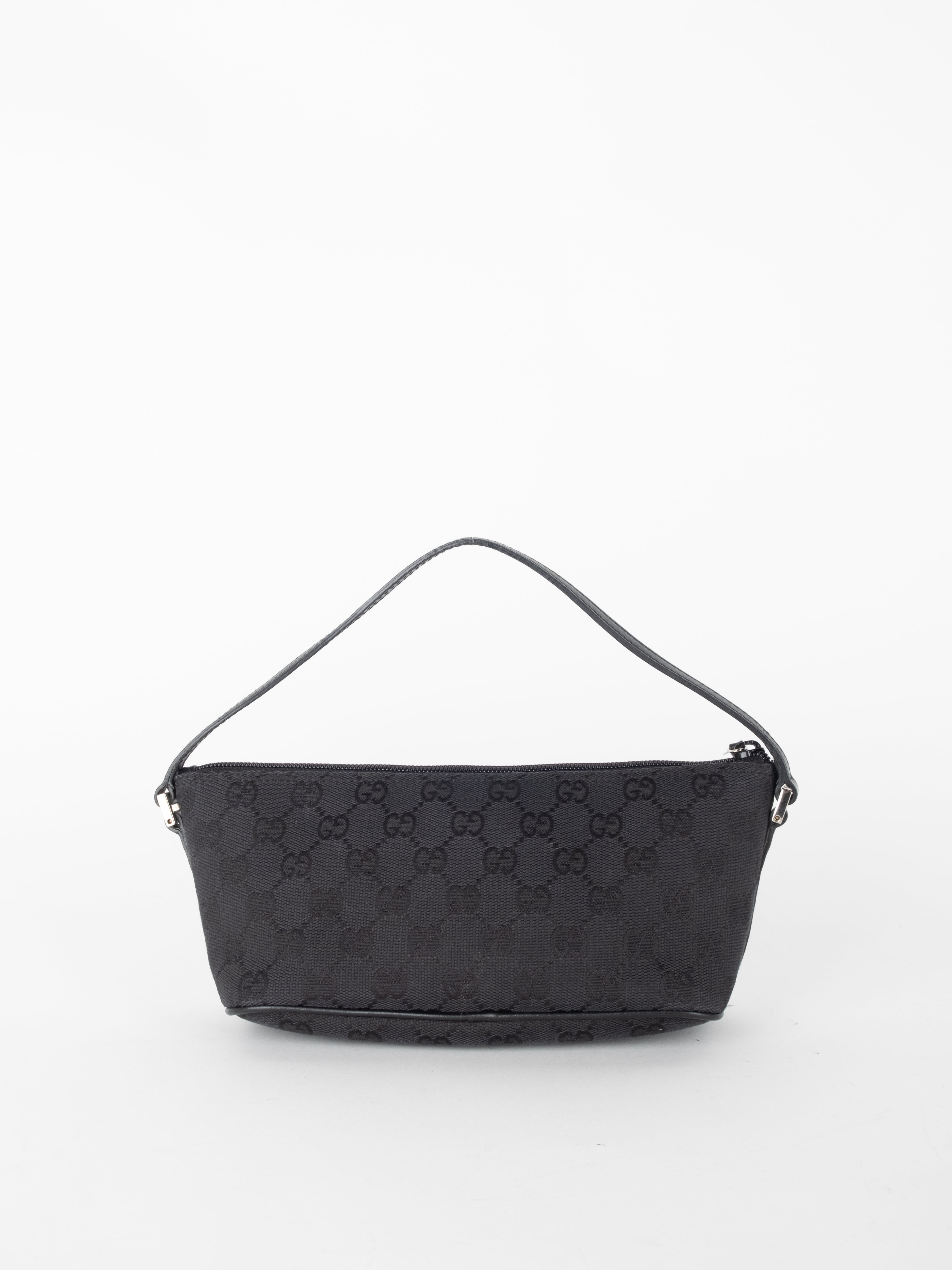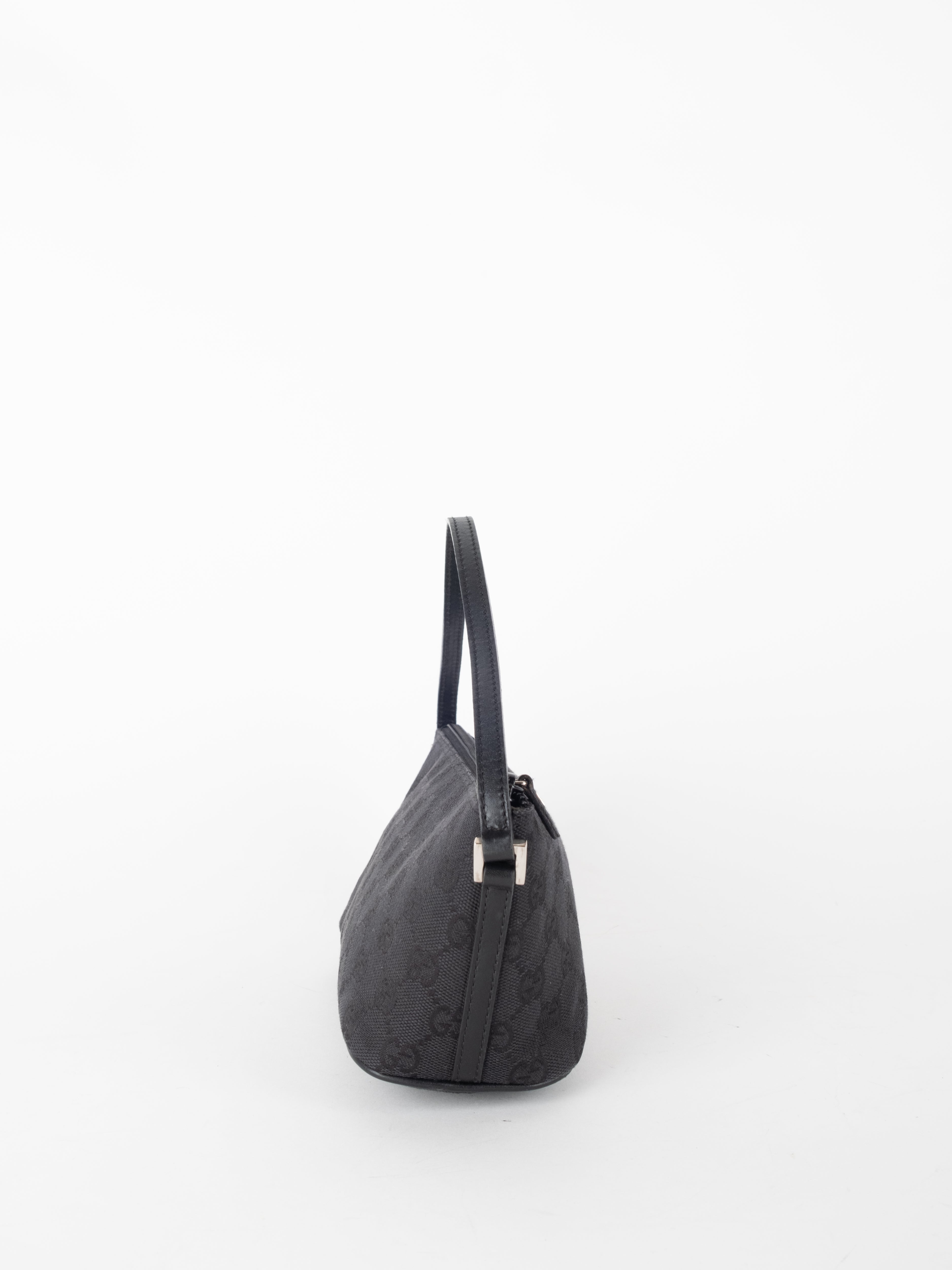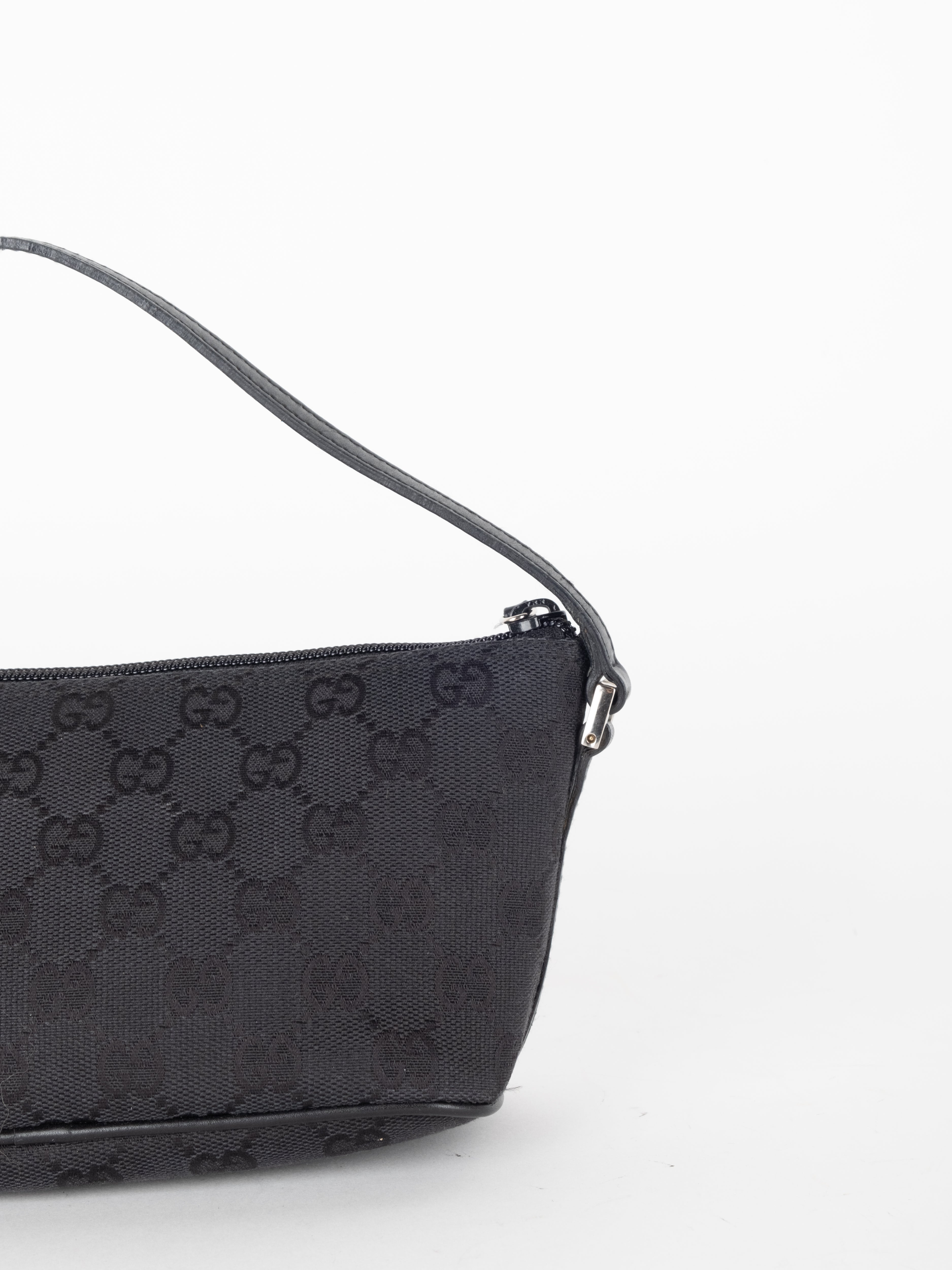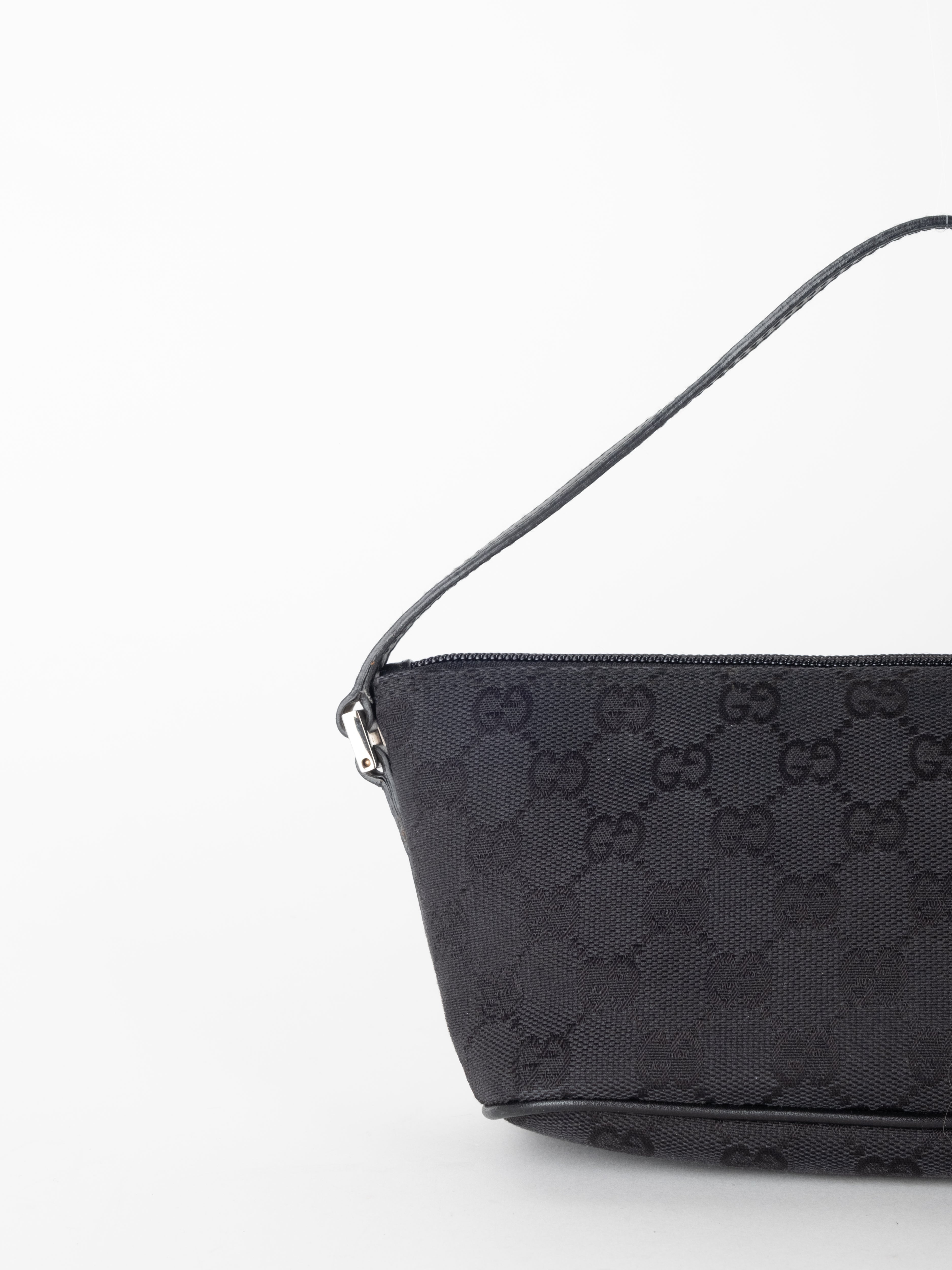 התיק עשוי קנבס מונוגרמי GG בצבע שחור כהה, כולל רצועת כתף דקה וסגירת רוכסן עליונה. תא פנימי אחד עם בטנה כהה.