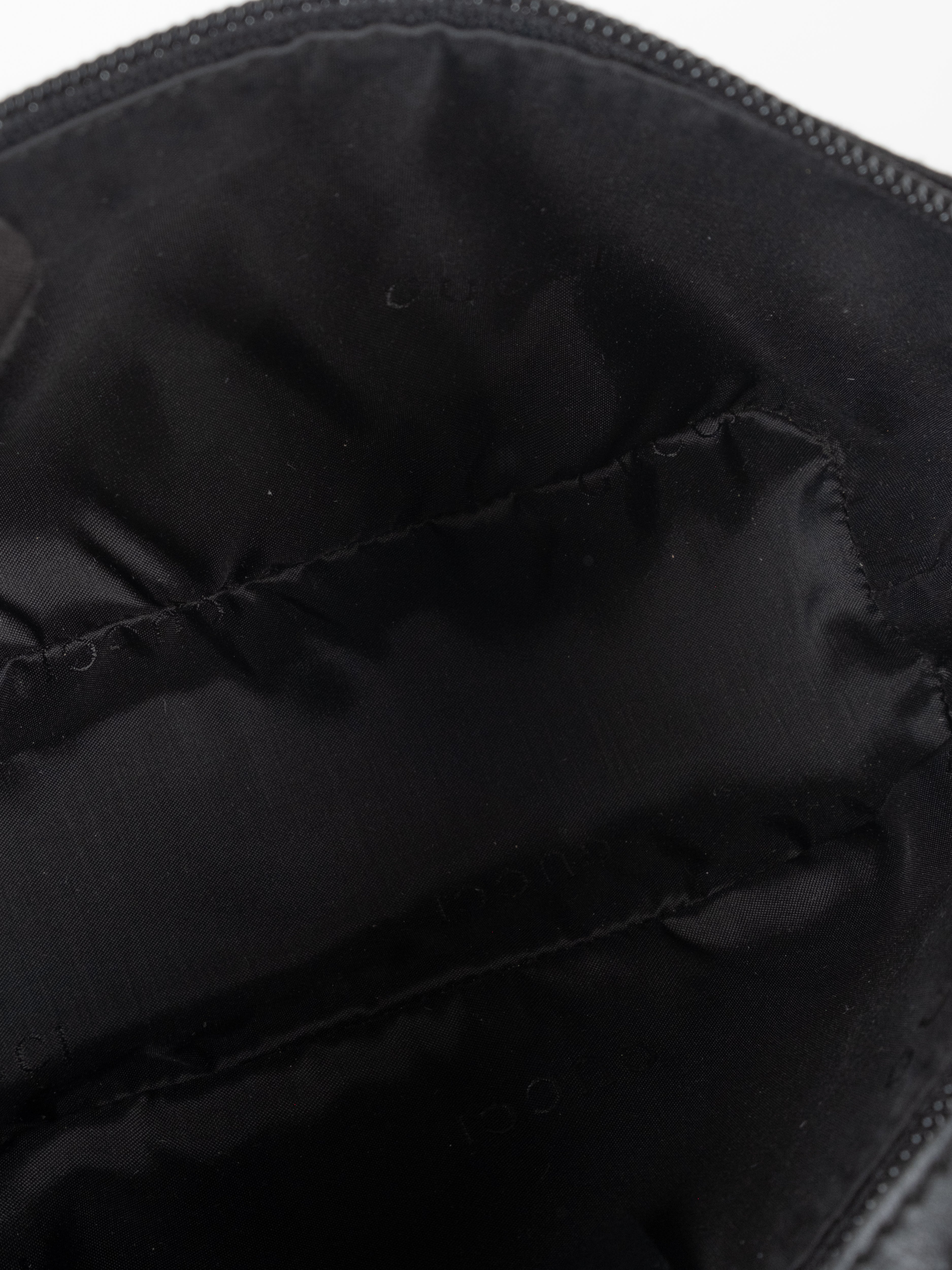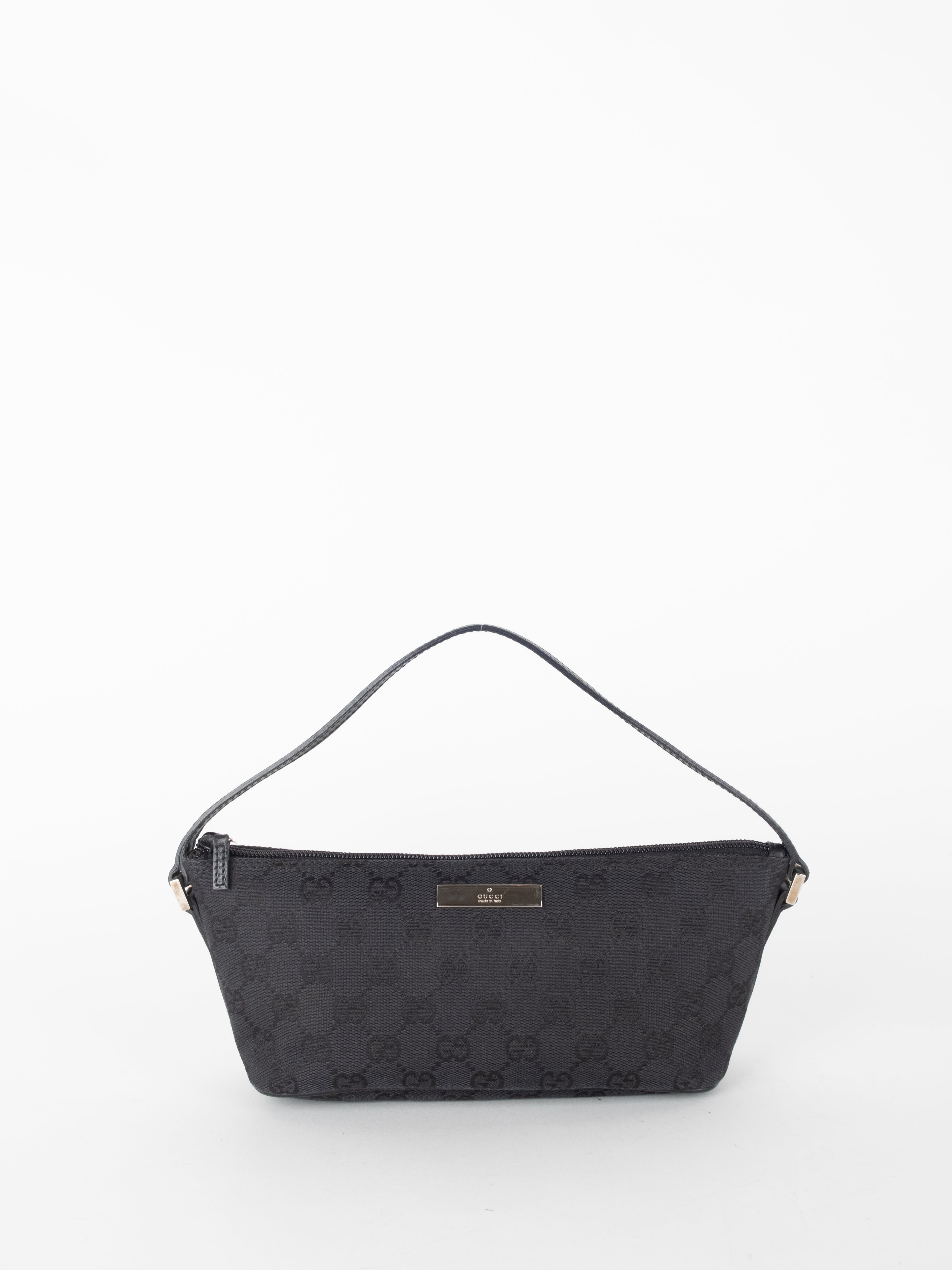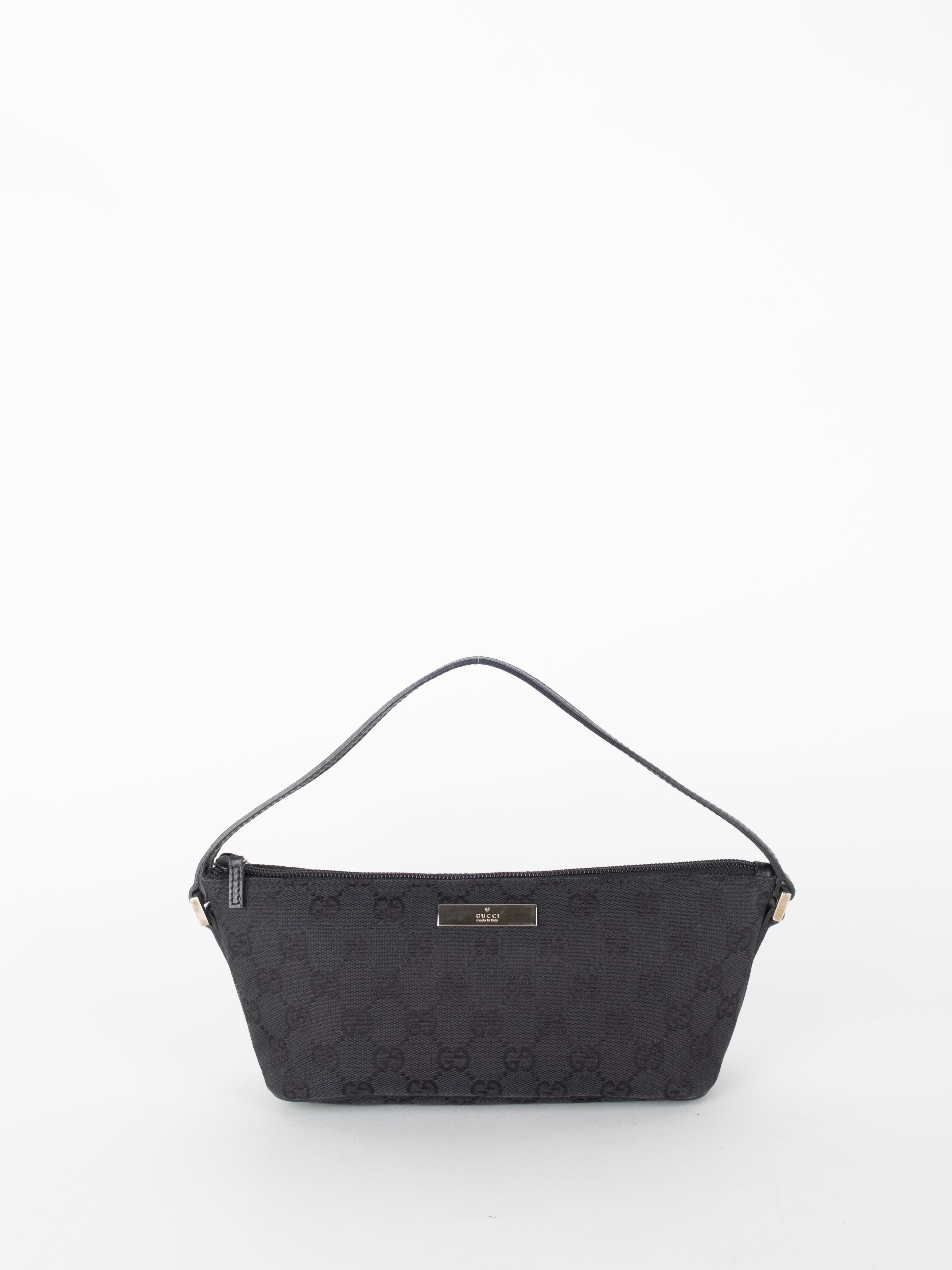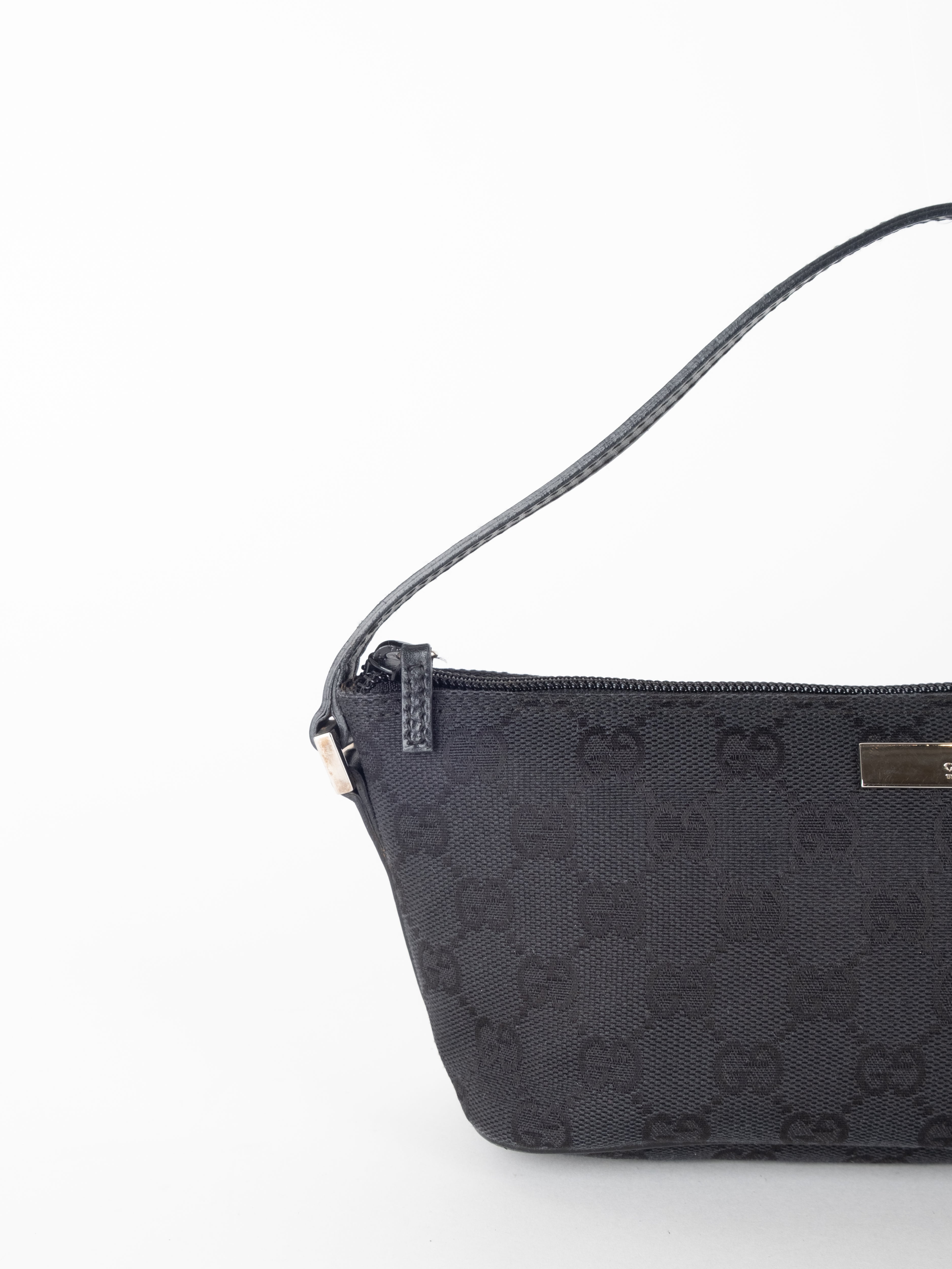 התיק עשוי קנבס מונוגרמי GG בצבע שחור כהה, כולל רצועת כתף דקה וסגירת רוכסן עליונה. תא פנימי אחד עם בטנה כהה.