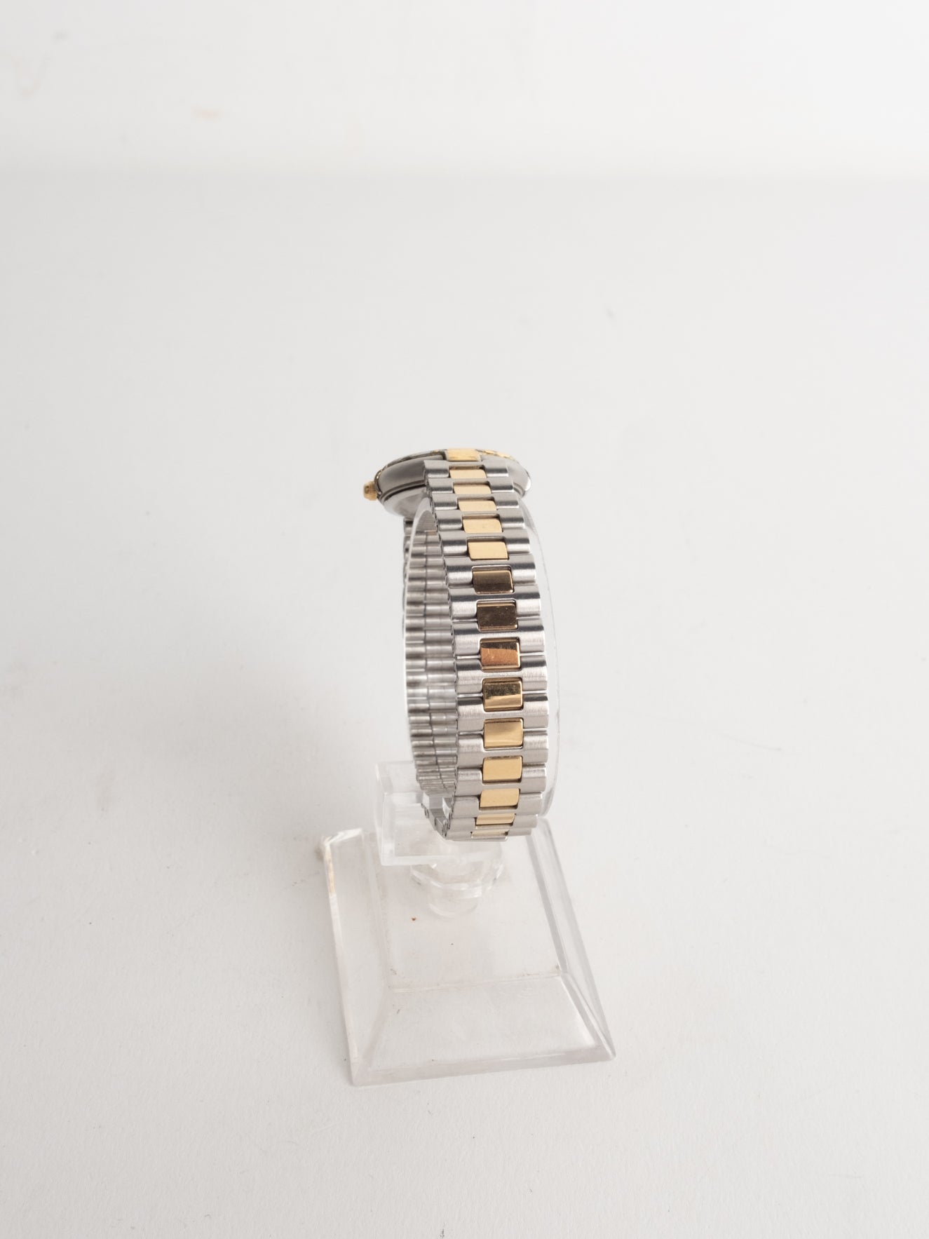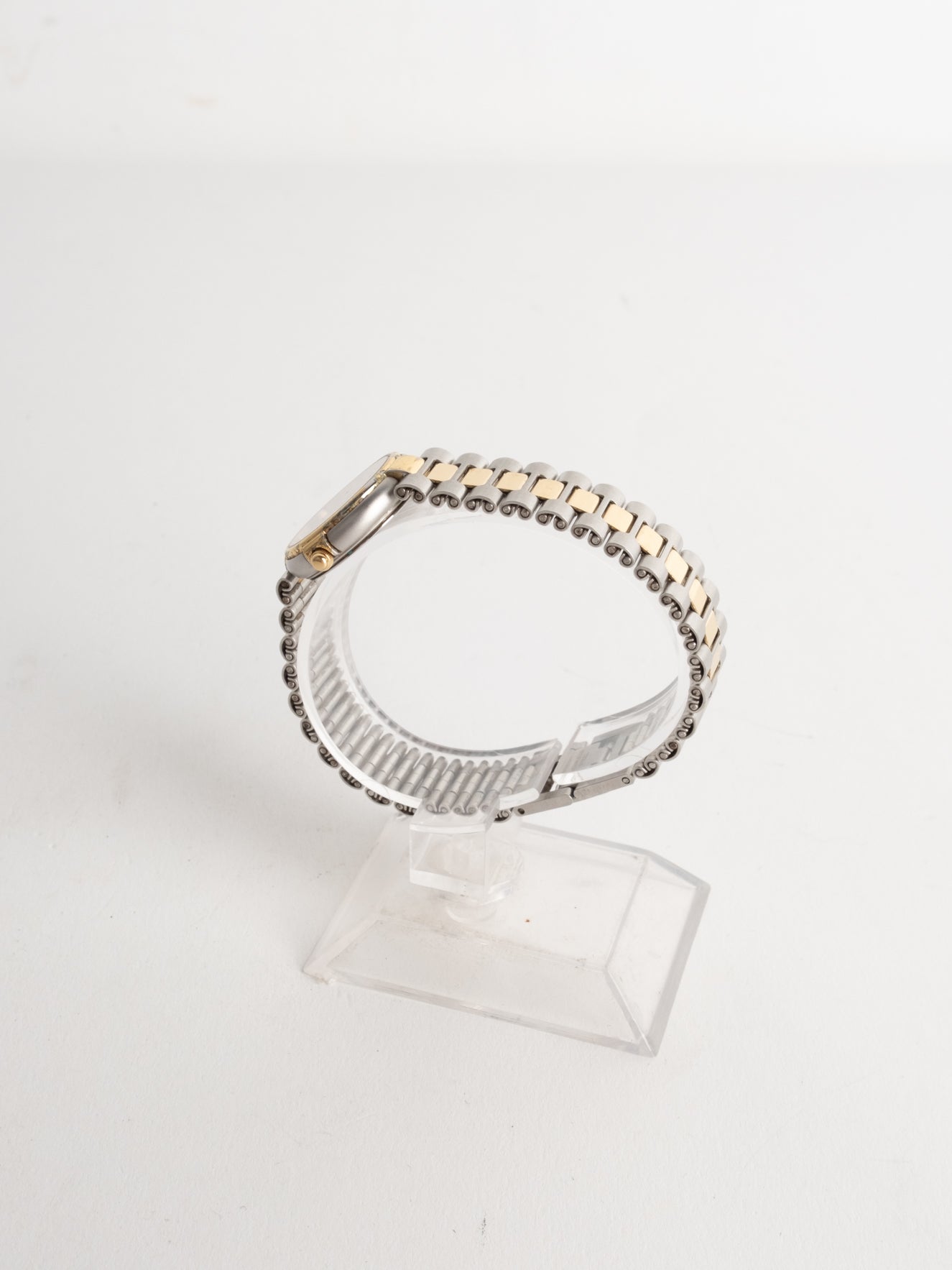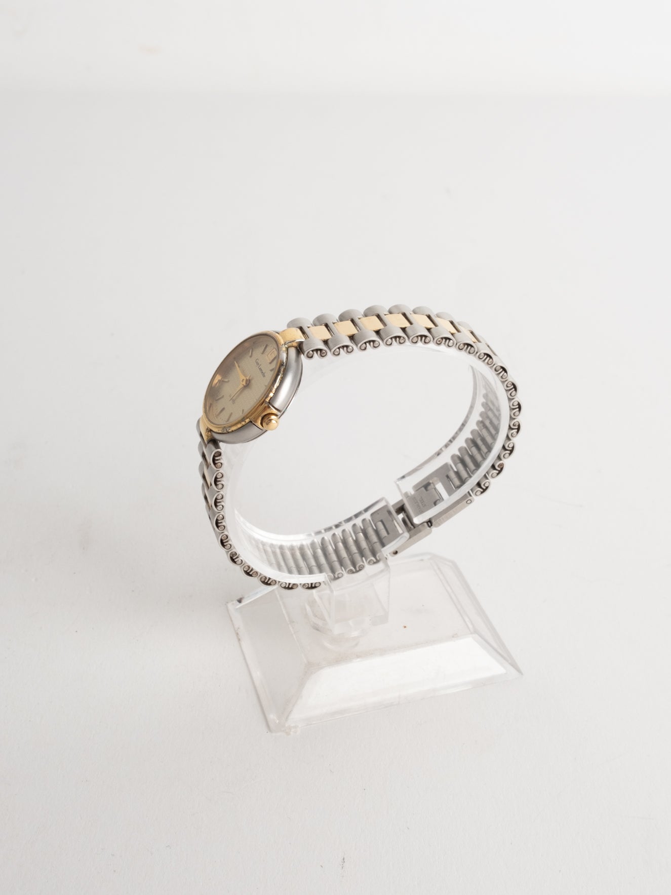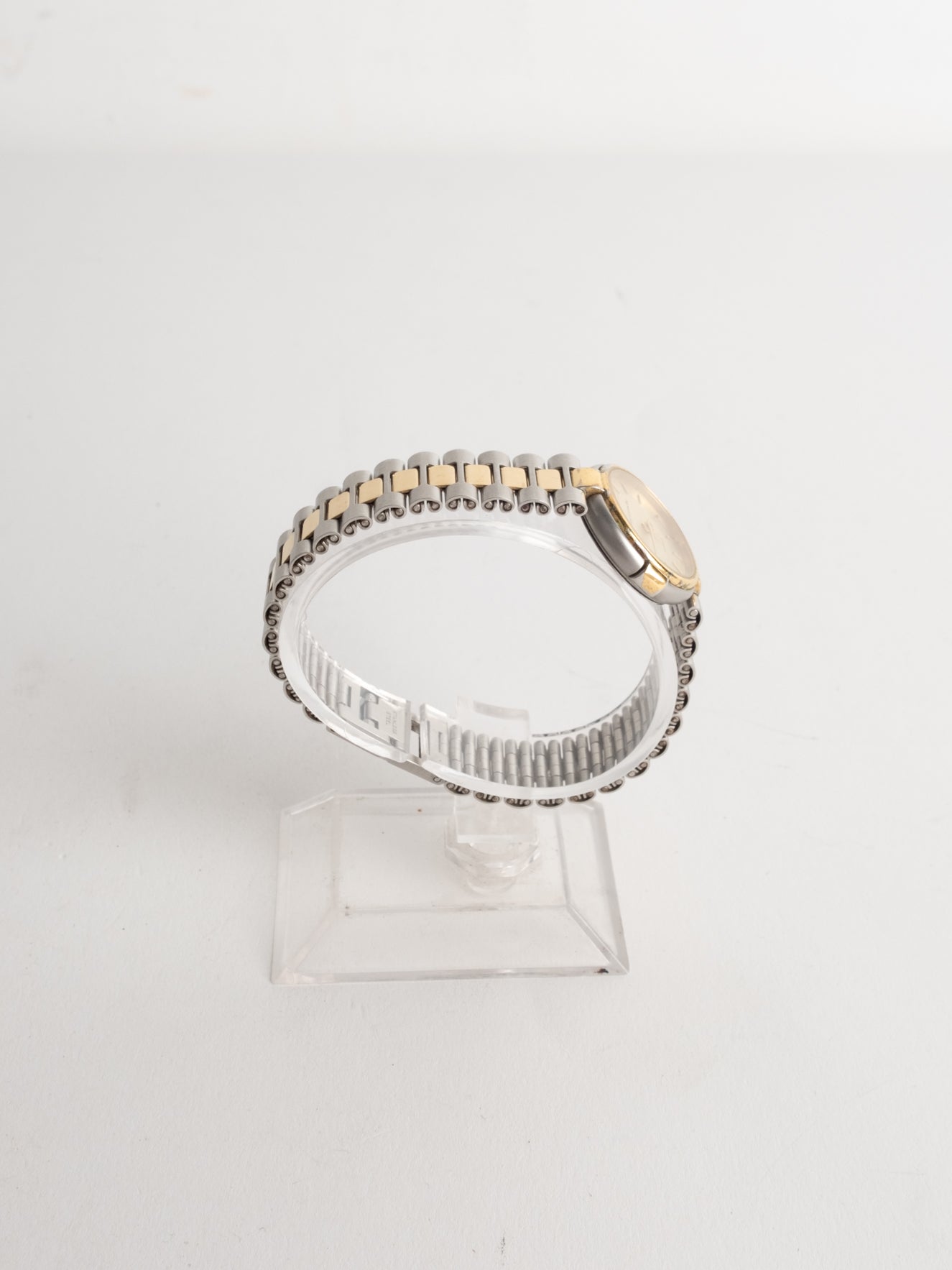 שעון קלאסי בצבע כסוף המשולב עם זהב בעל פני שעון בצורה עגולה עם רקע זהב ומחוגים. שעון זה נסגר באמצעות סוגר ממותג.