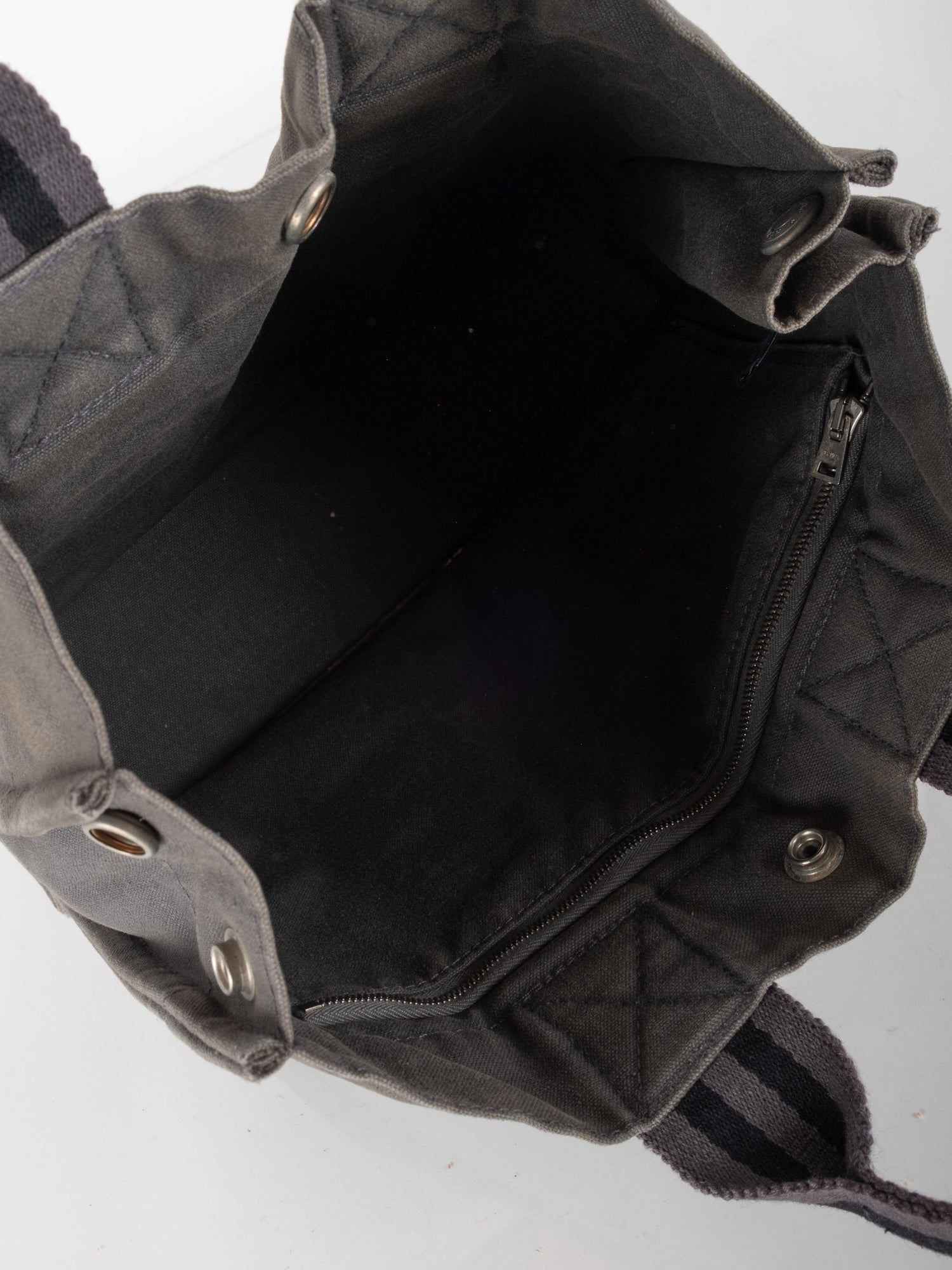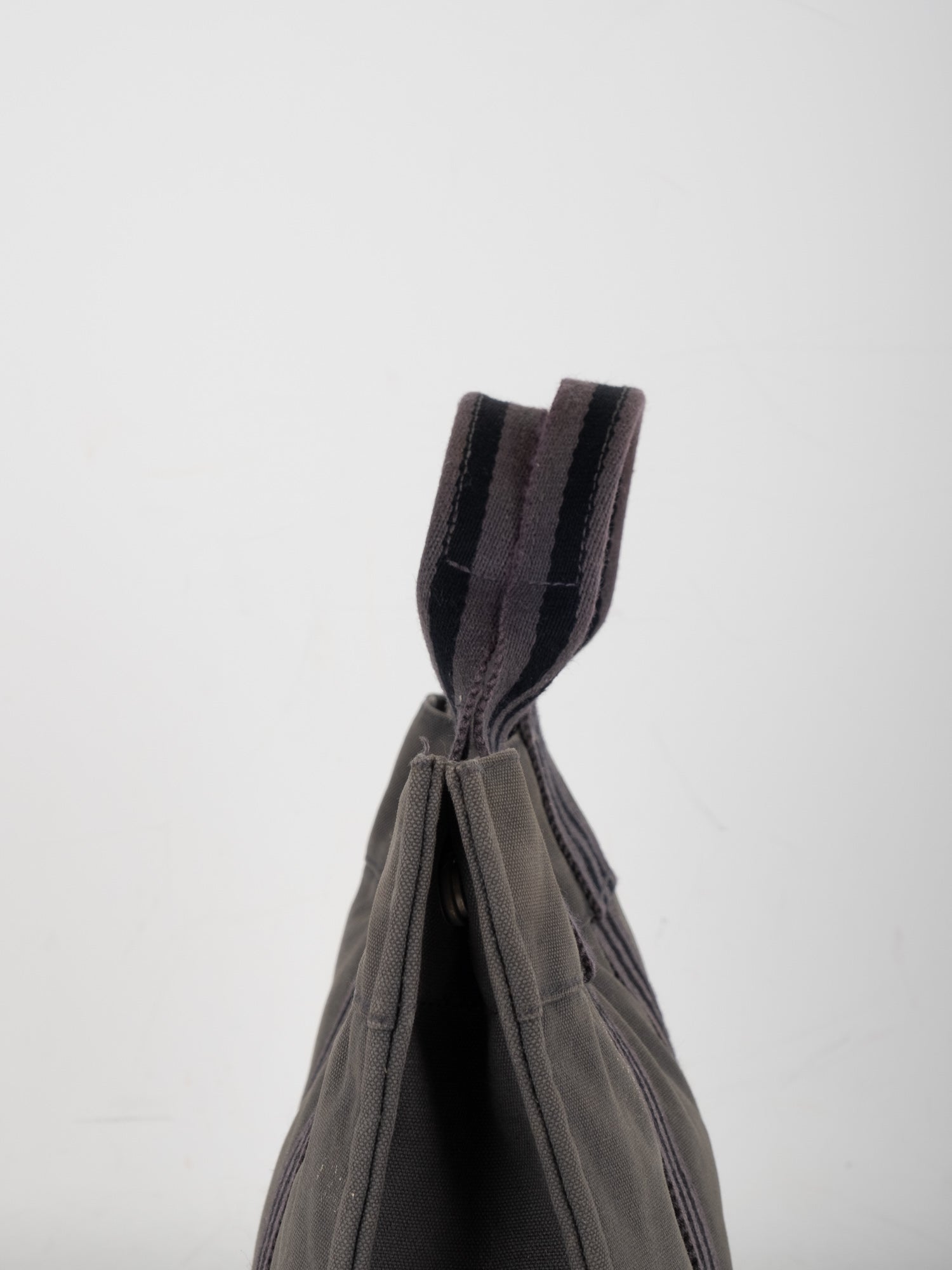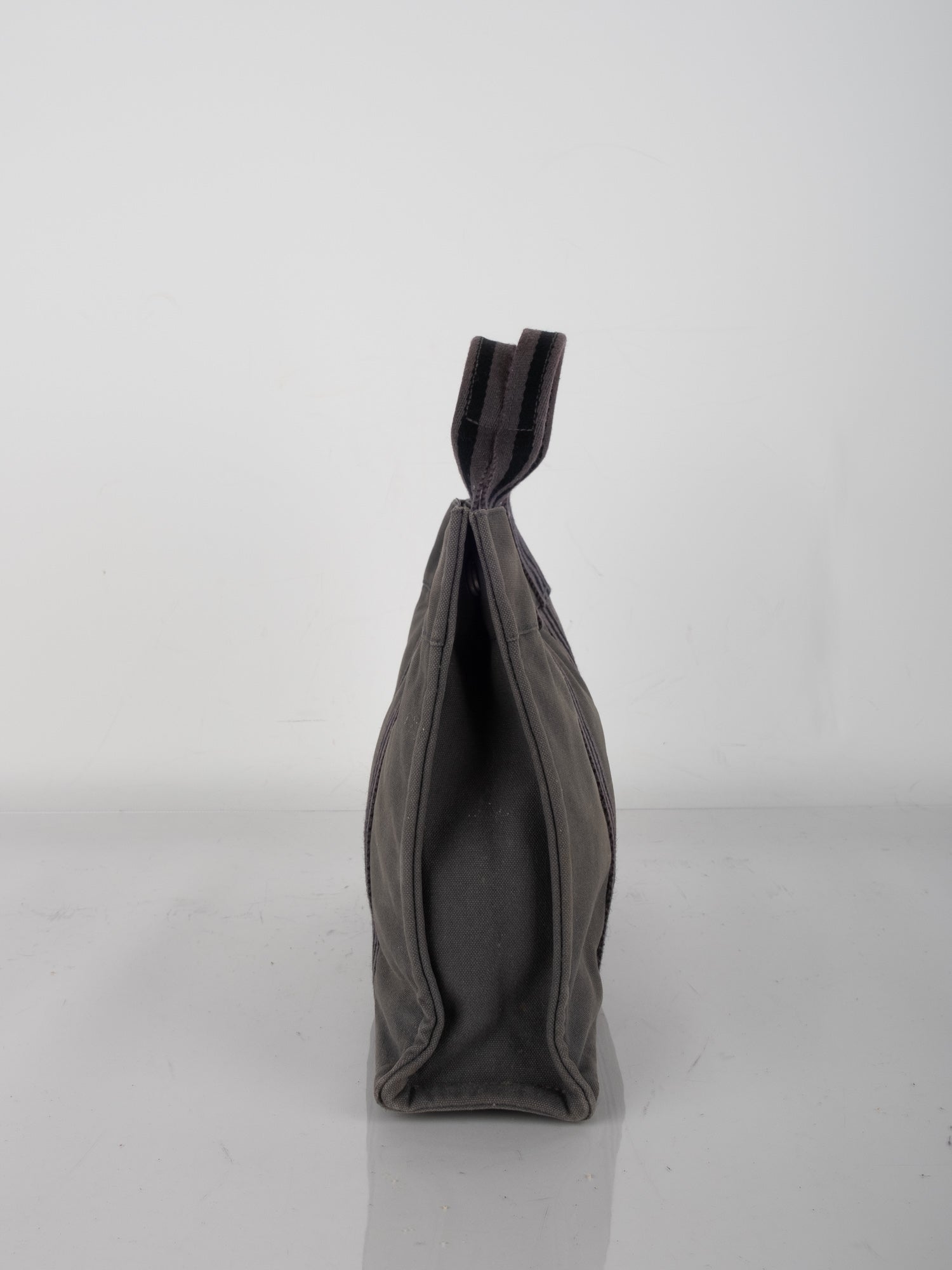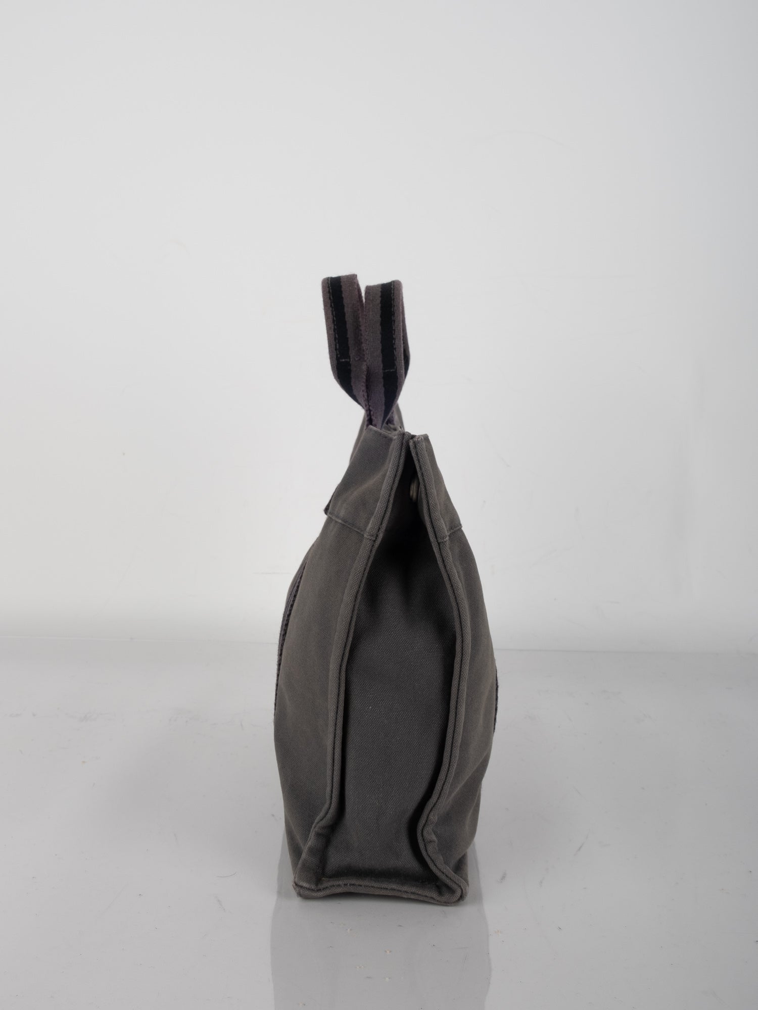 התיק עשוי בד חום כהה עם פסי בד אנכיים, ידיות בד חזקות ותא מרכזי מרווח.