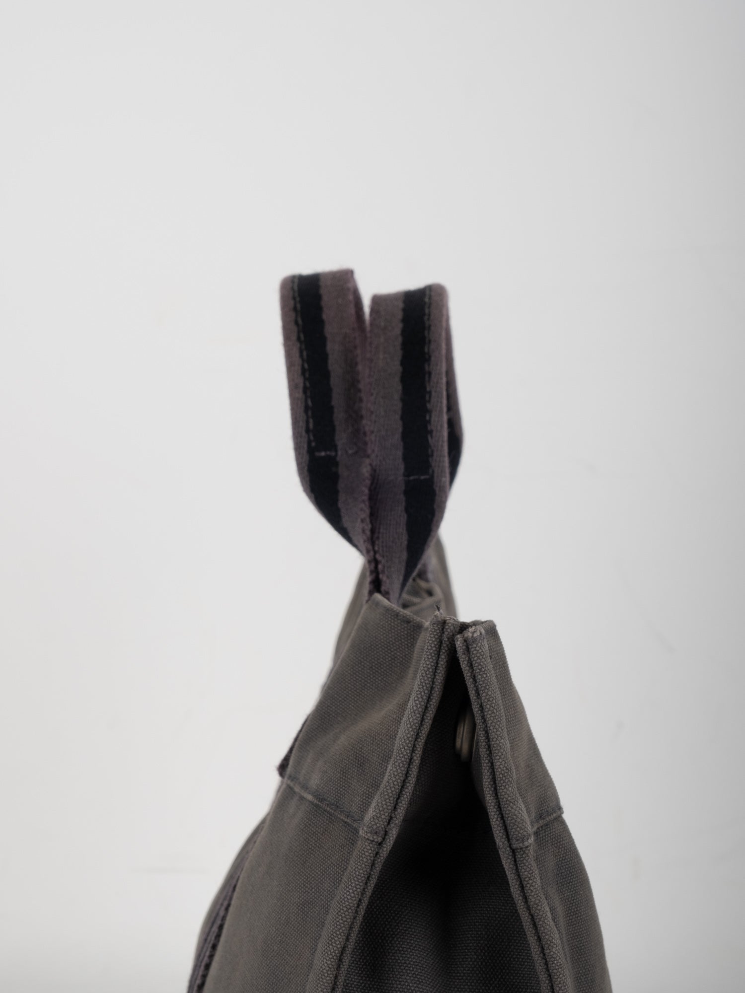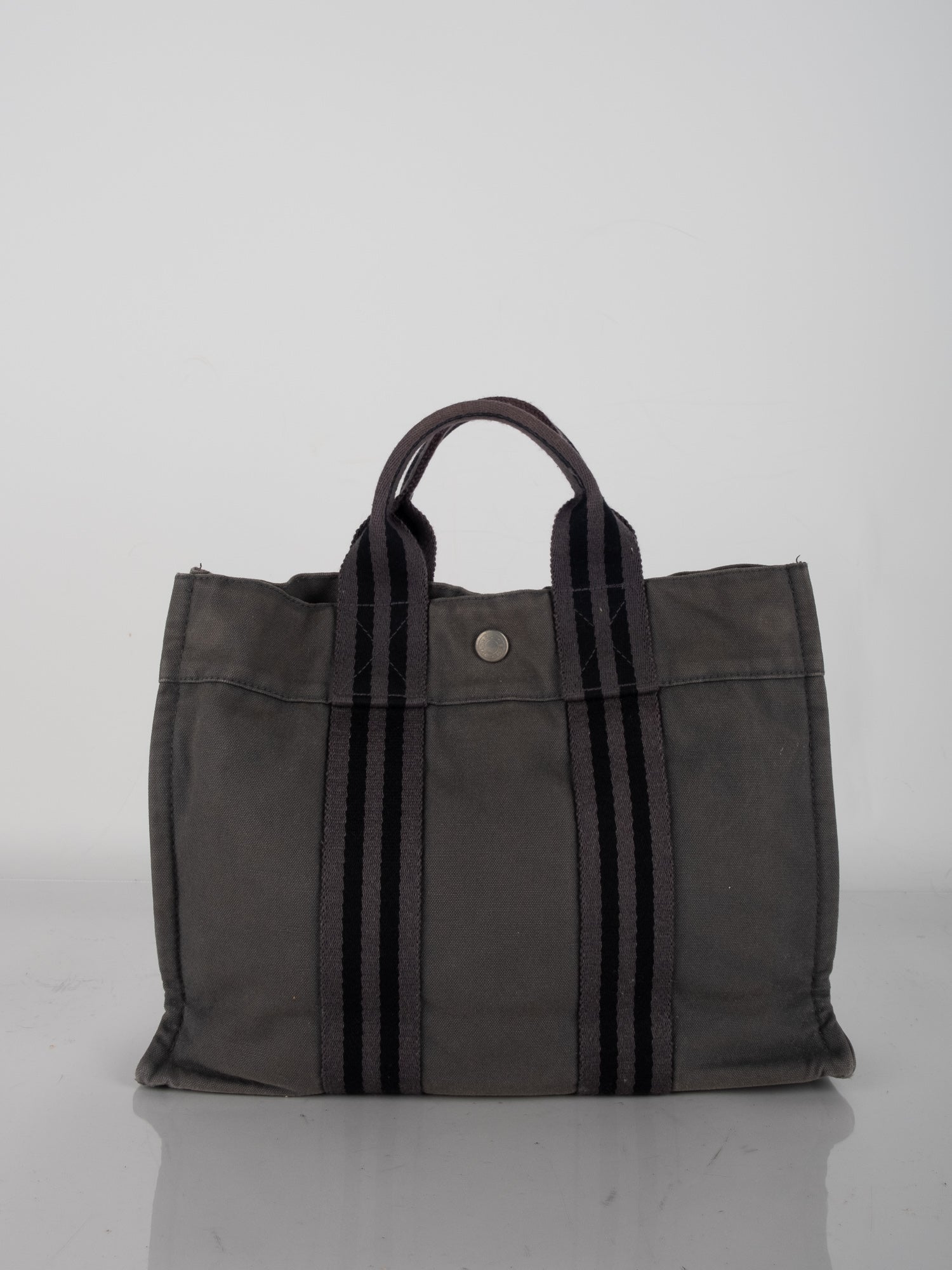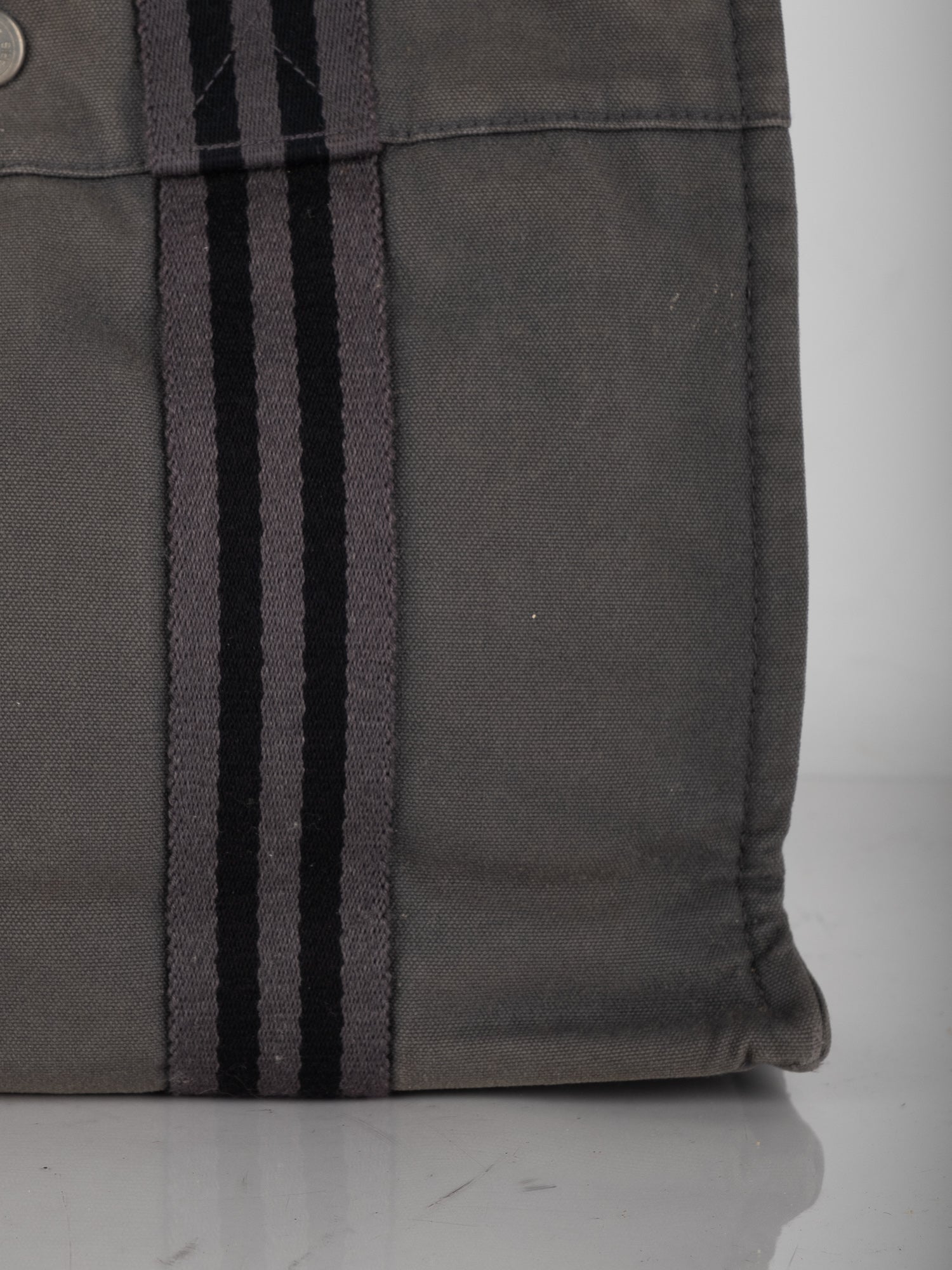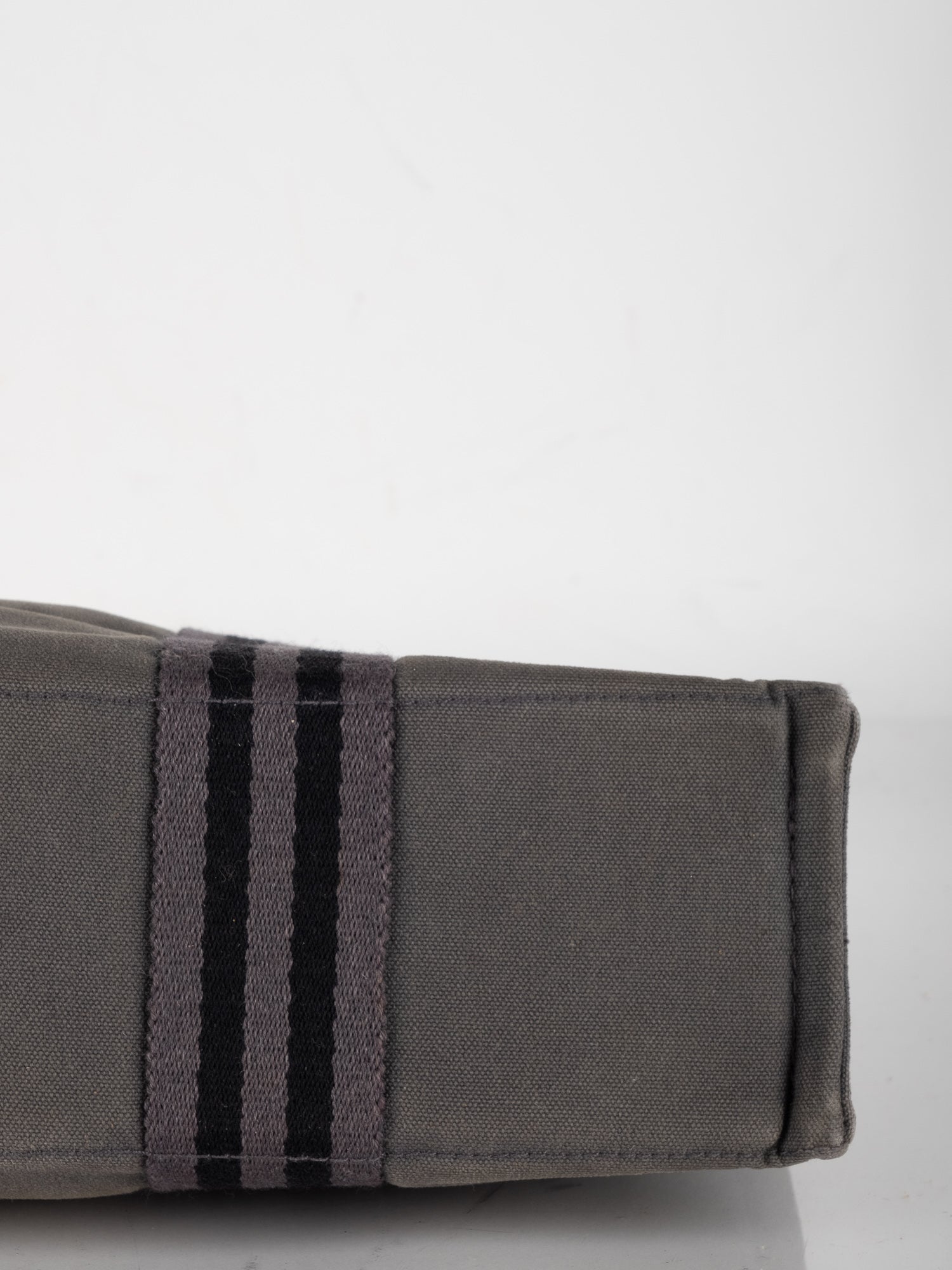 התיק עשוי בד חום כהה עם פסי בד אנכיים, ידיות בד חזקות ותא מרכזי מרווח.