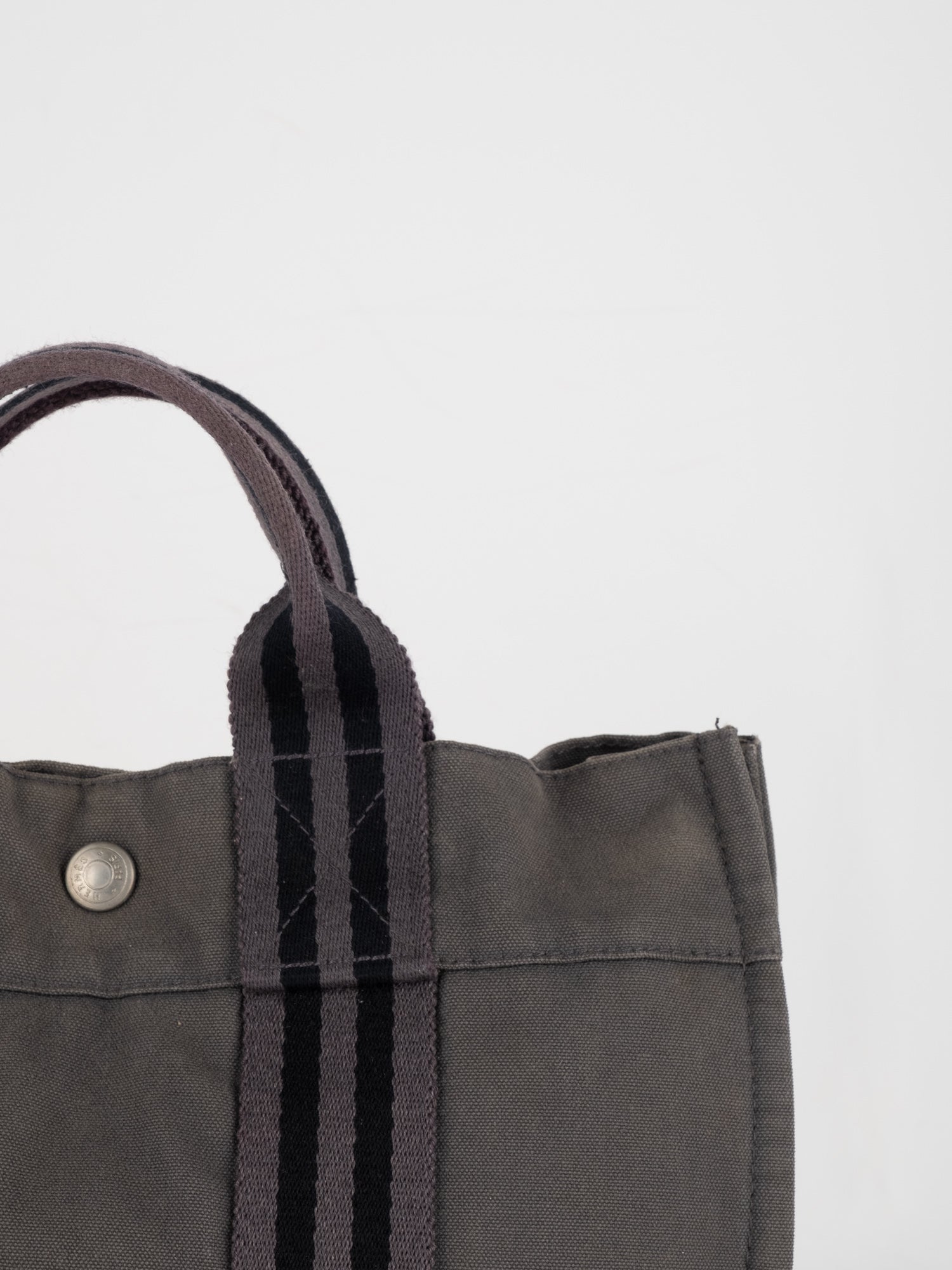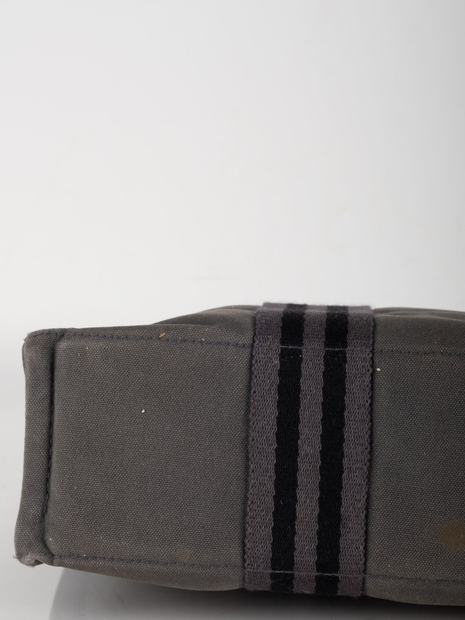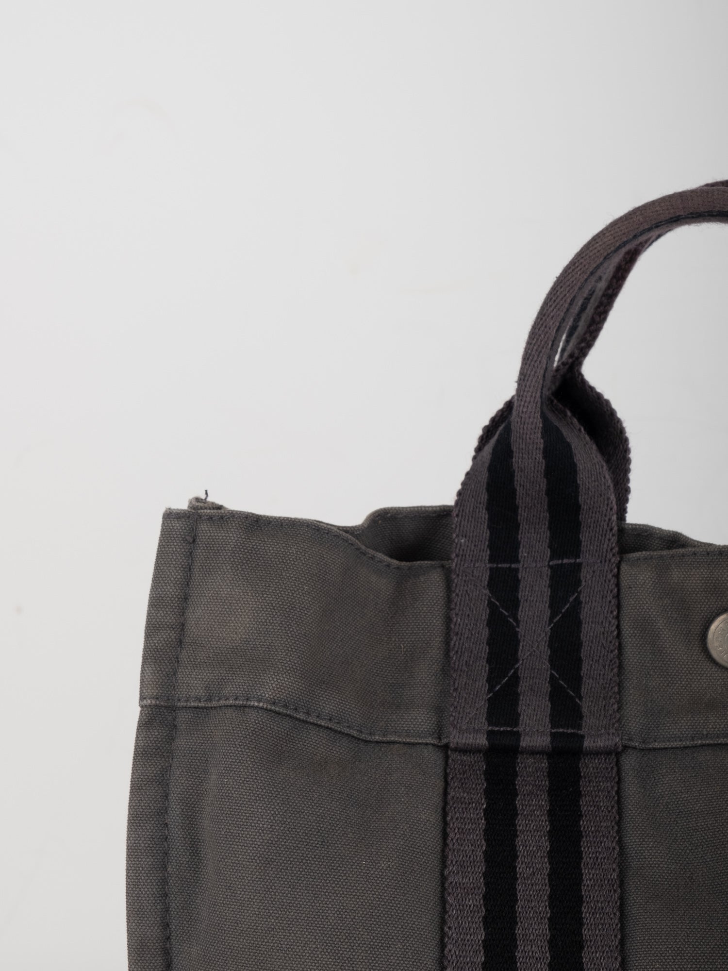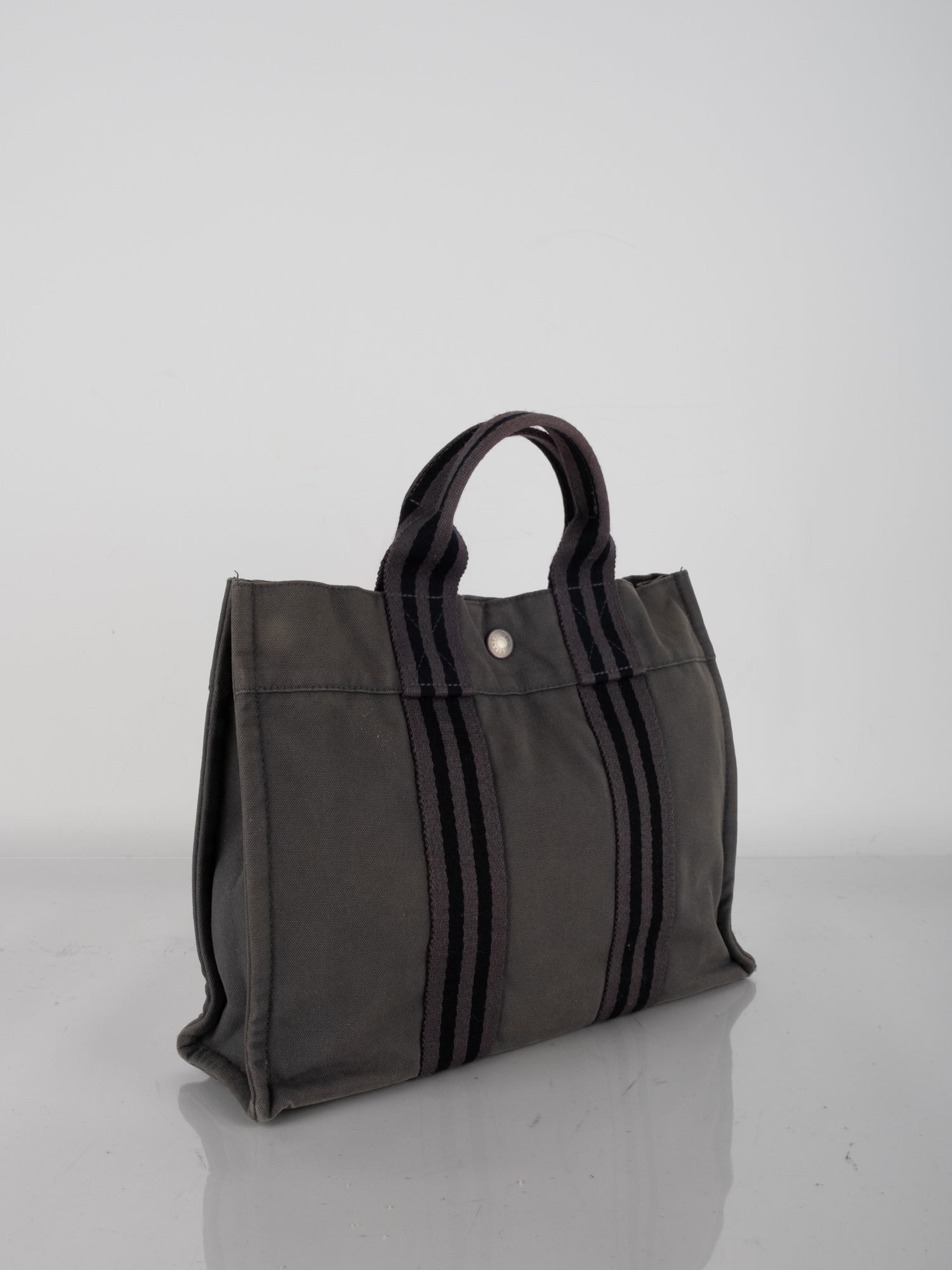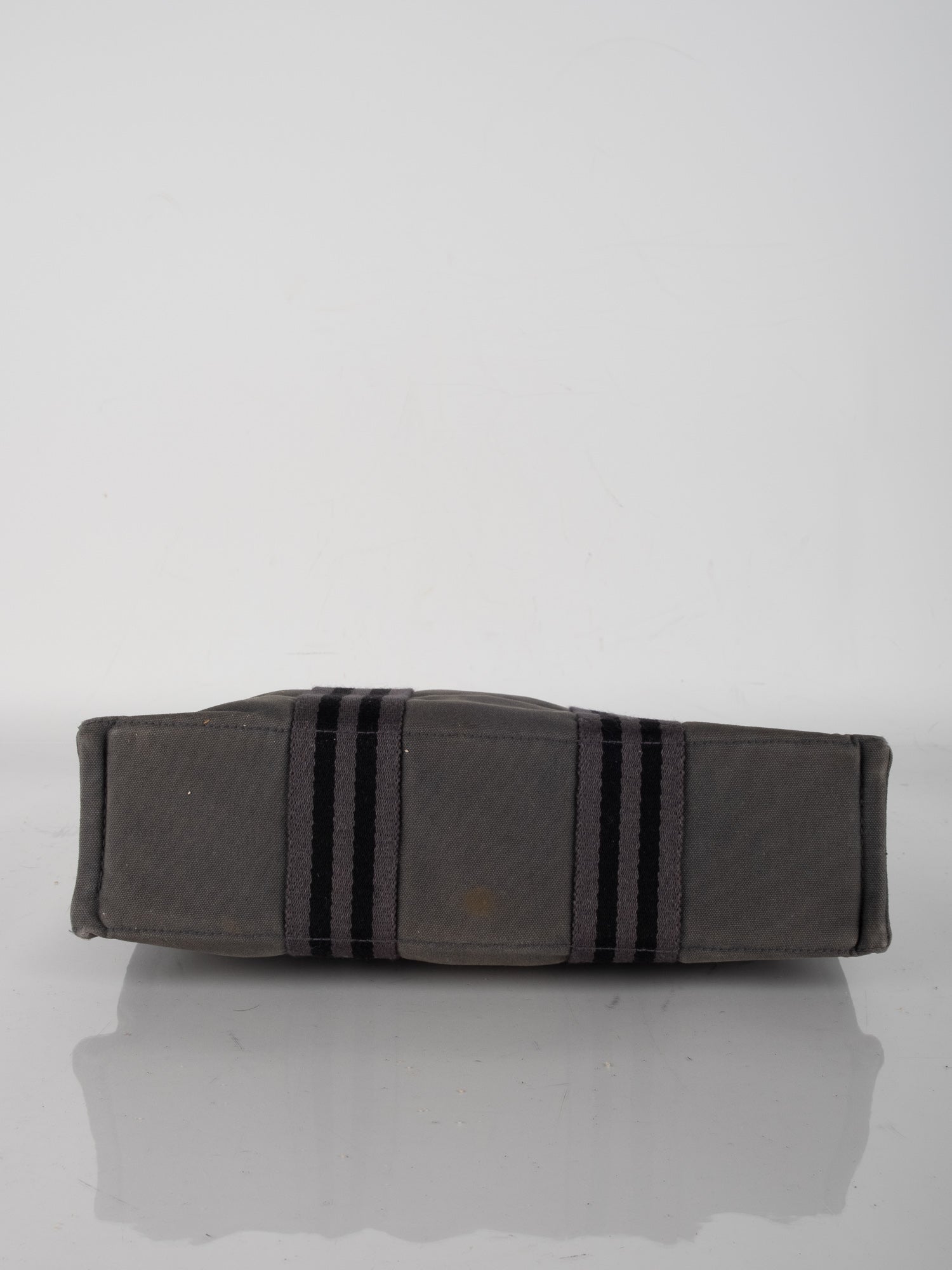 התיק עשוי בד חום כהה עם פסי בד אנכיים, ידיות בד חזקות ותא מרכזי מרווח.