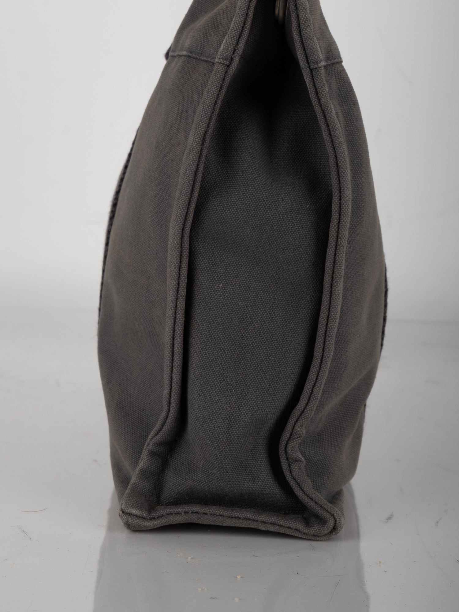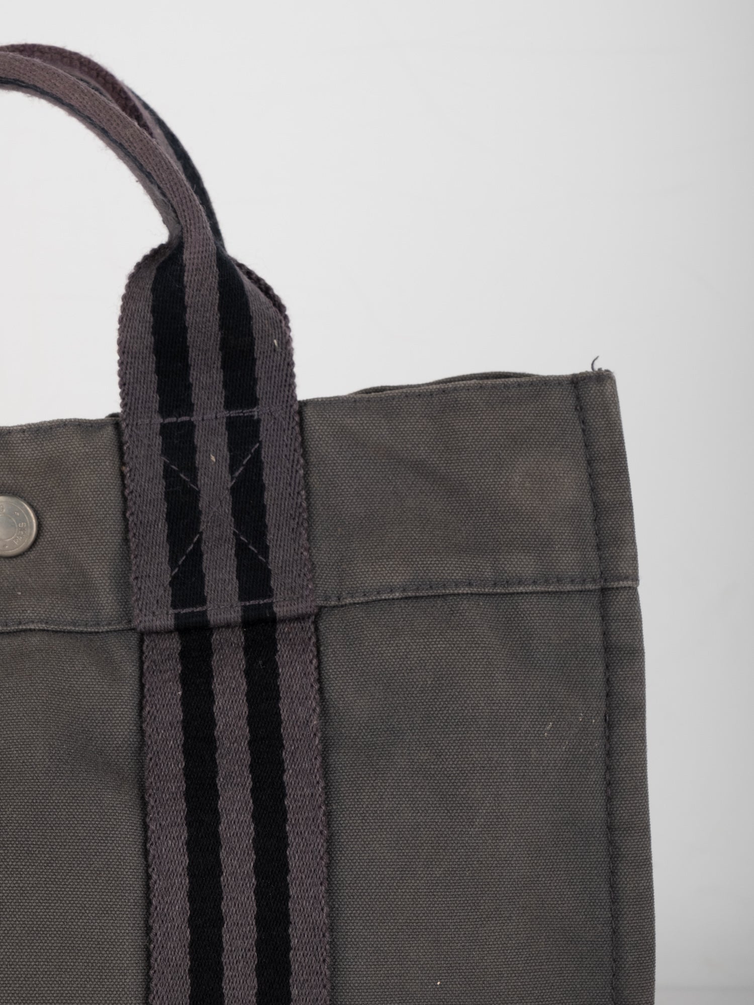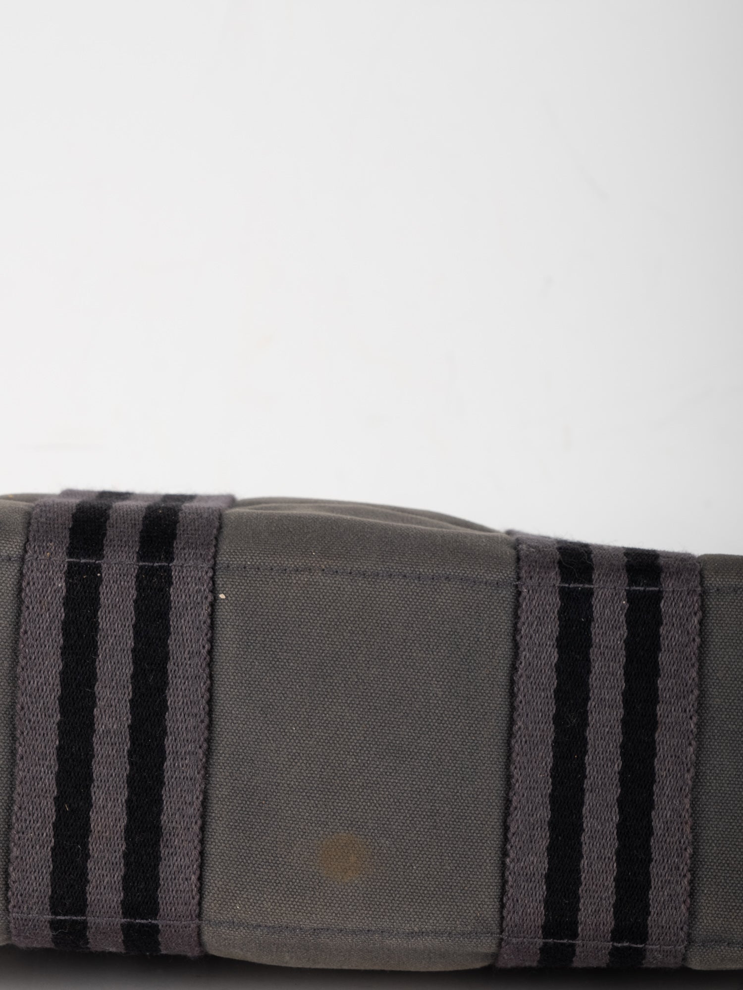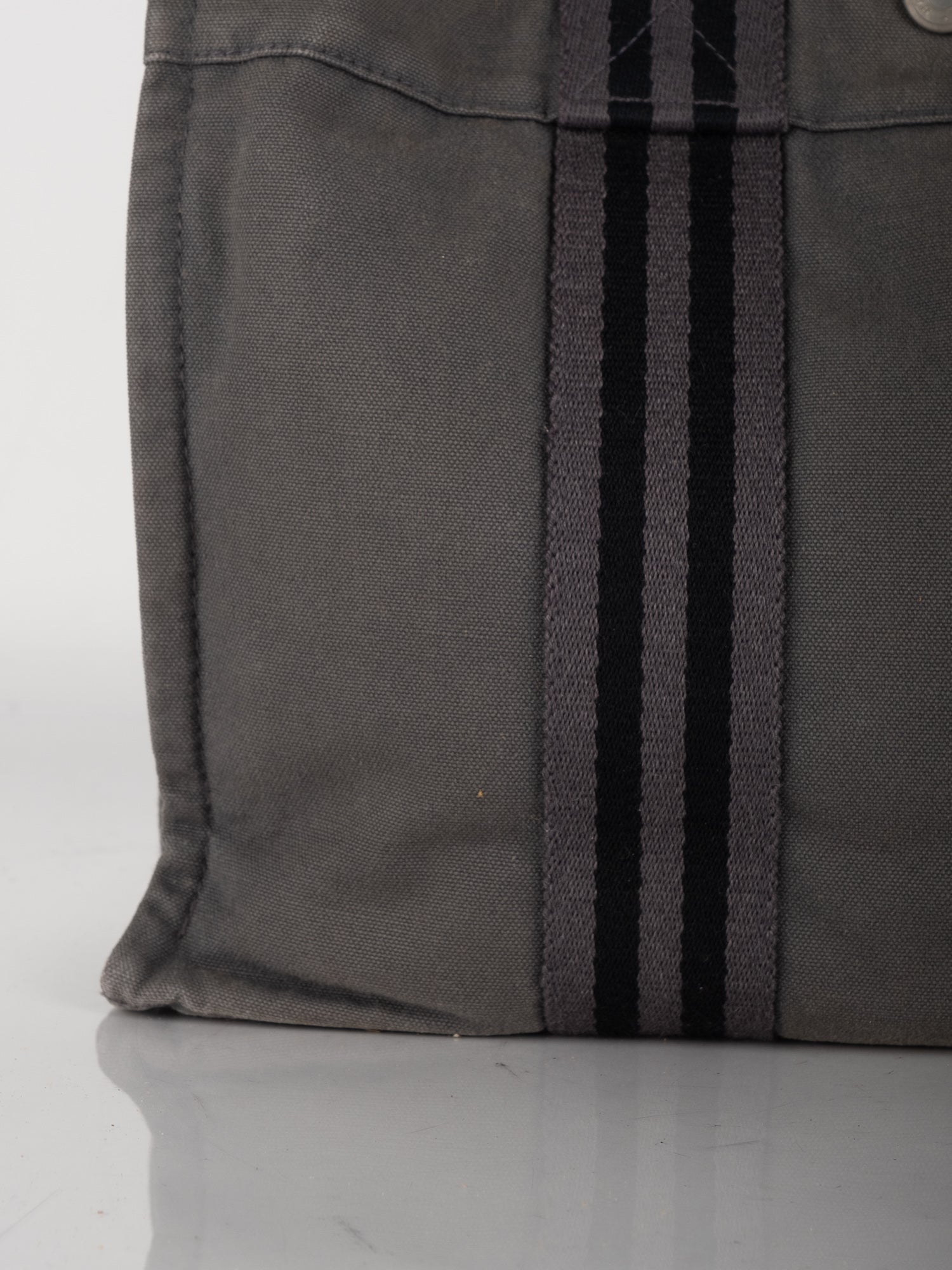 התיק עשוי בד חום כהה עם פסי בד אנכיים, ידיות בד חזקות ותא מרכזי מרווח.