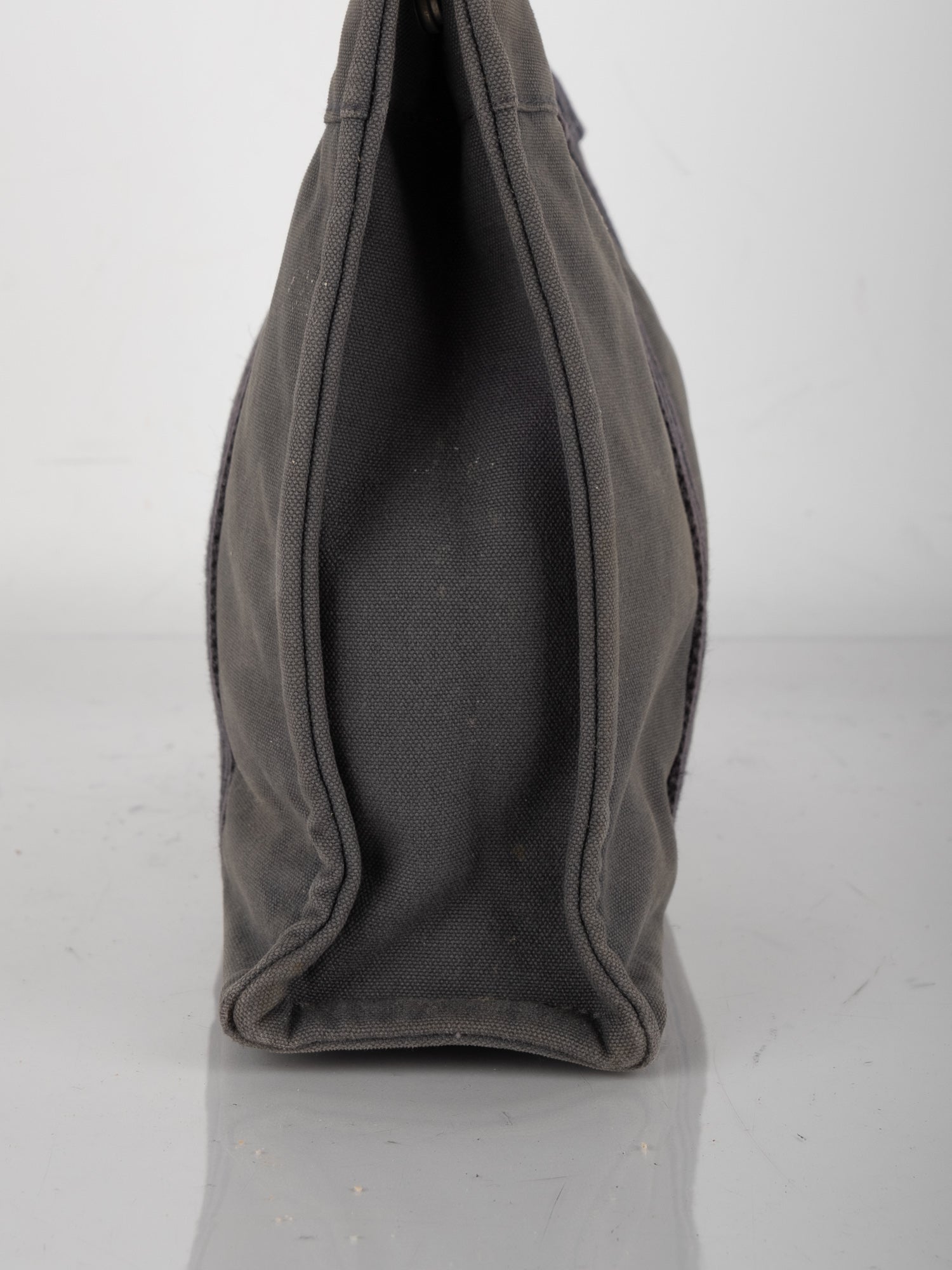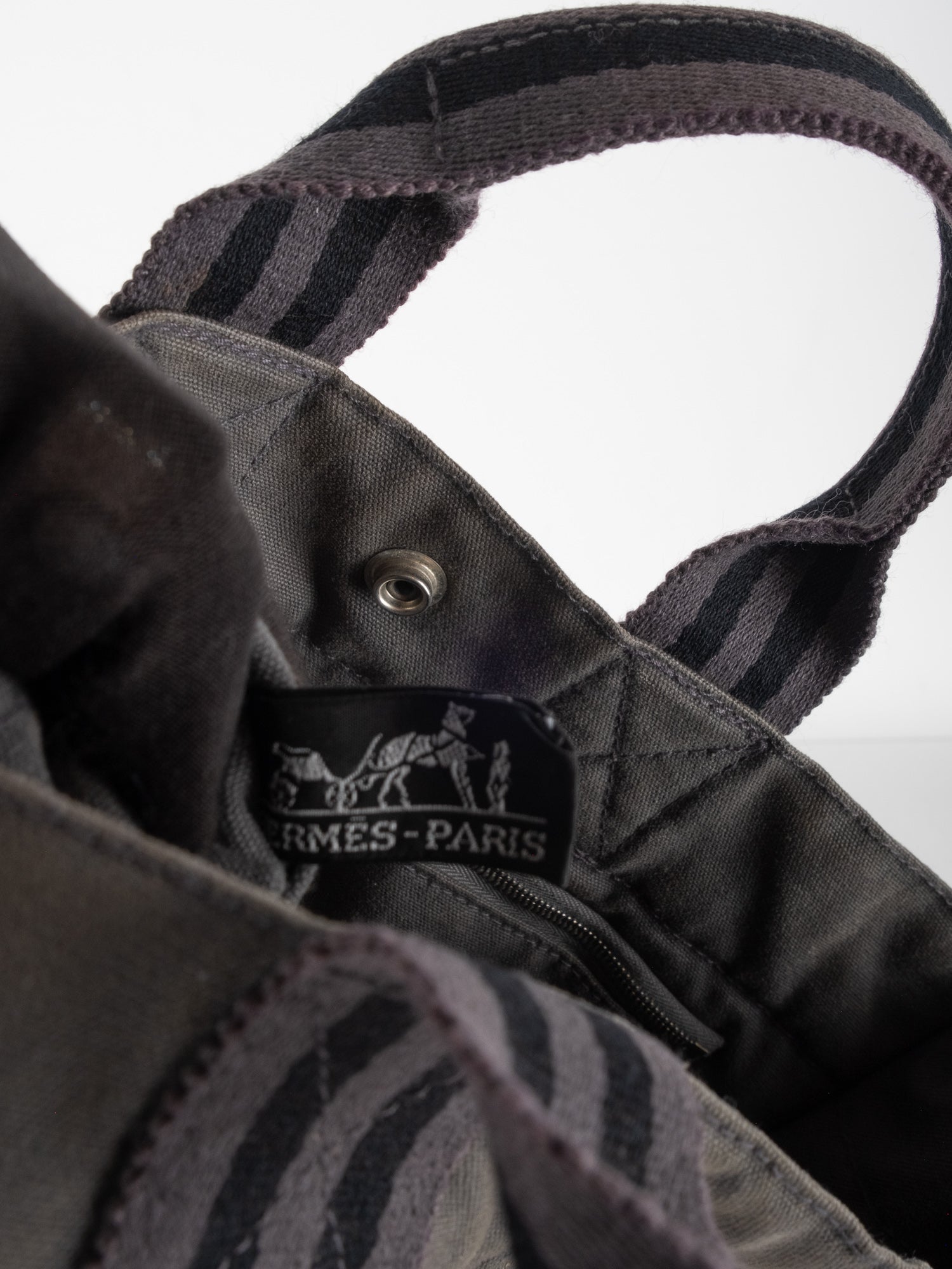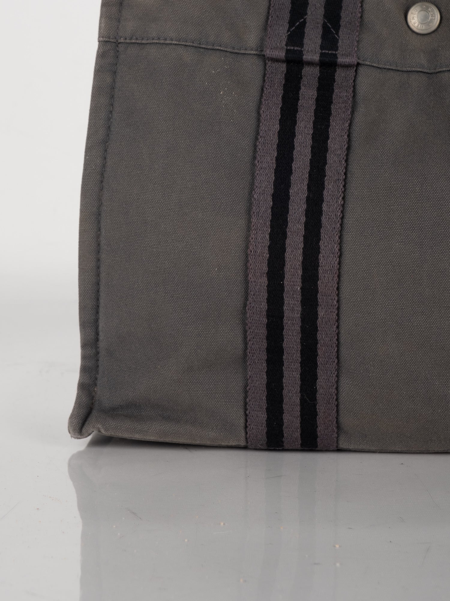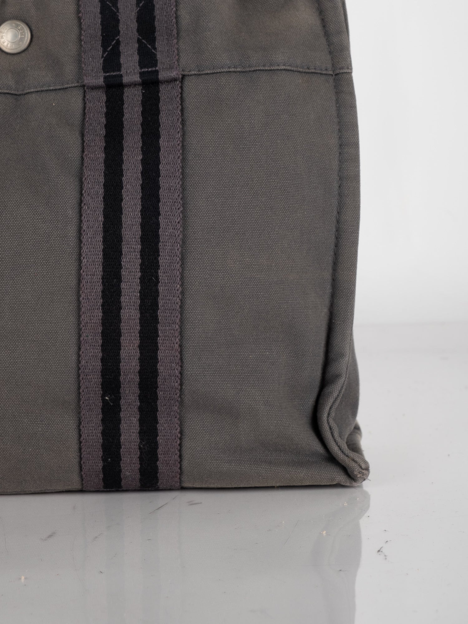 התיק עשוי בד חום כהה עם פסי בד אנכיים, ידיות בד חזקות ותא מרכזי מרווח.