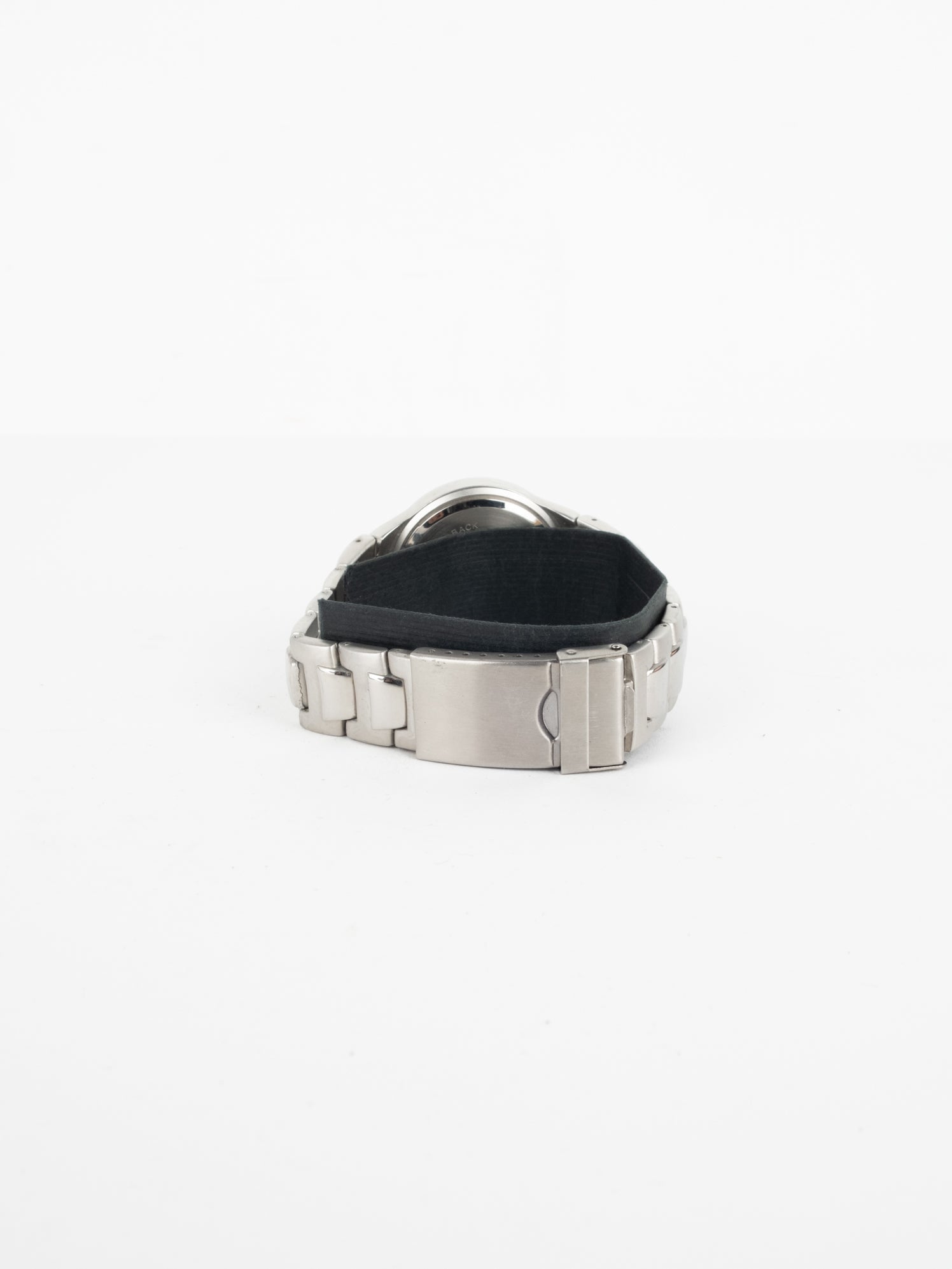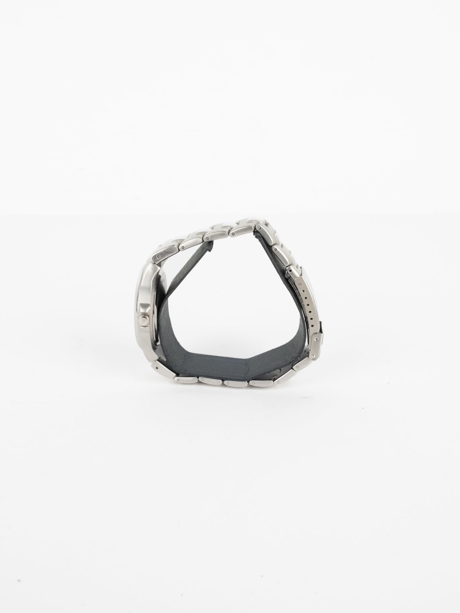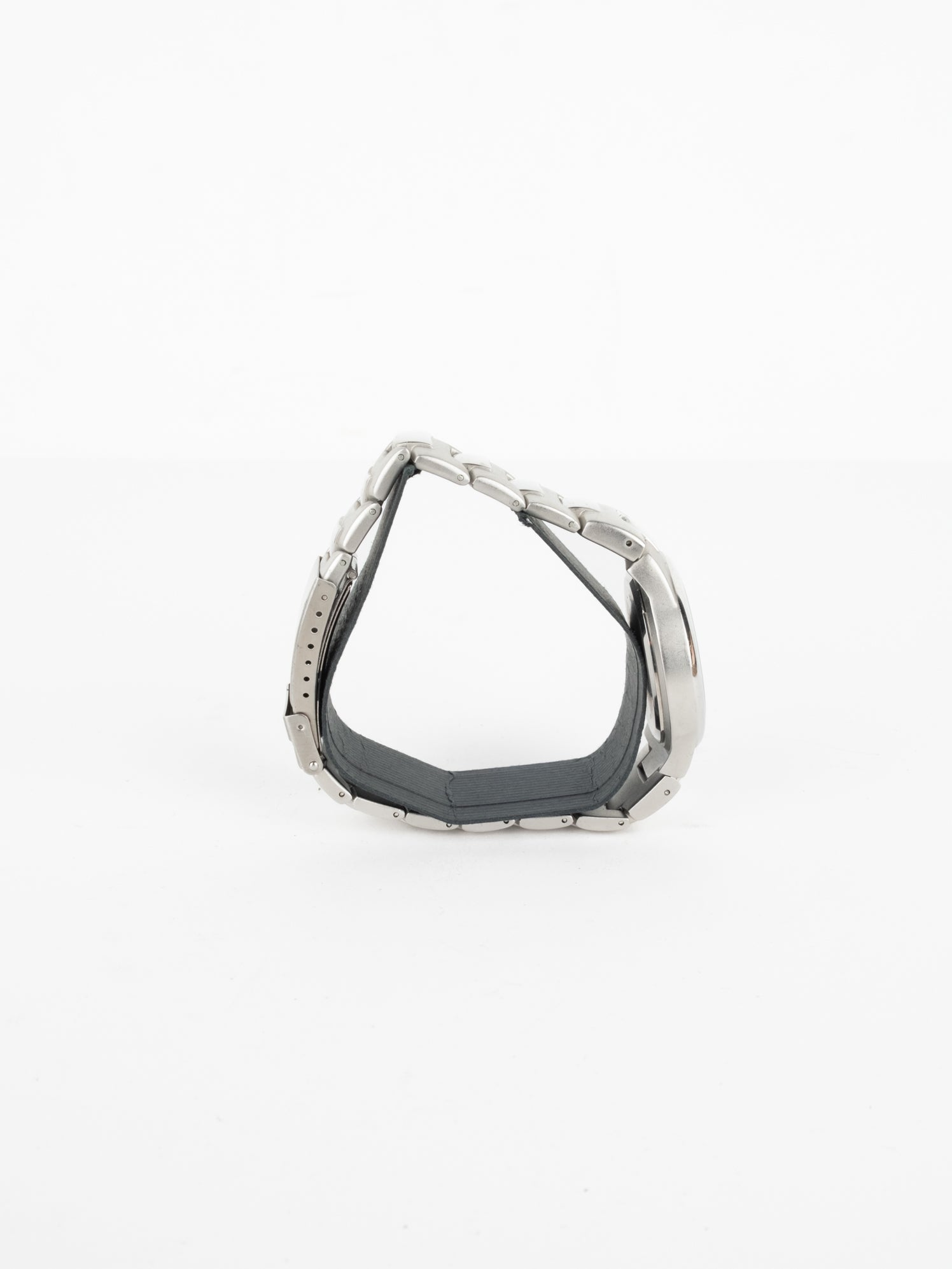 שעון גדול ספורטיבי בצבע כסוף, בעל פני שעון בצבע כחול כהה ומחוגים. שעון זה נסגר באמצעות סוגר ממותג.