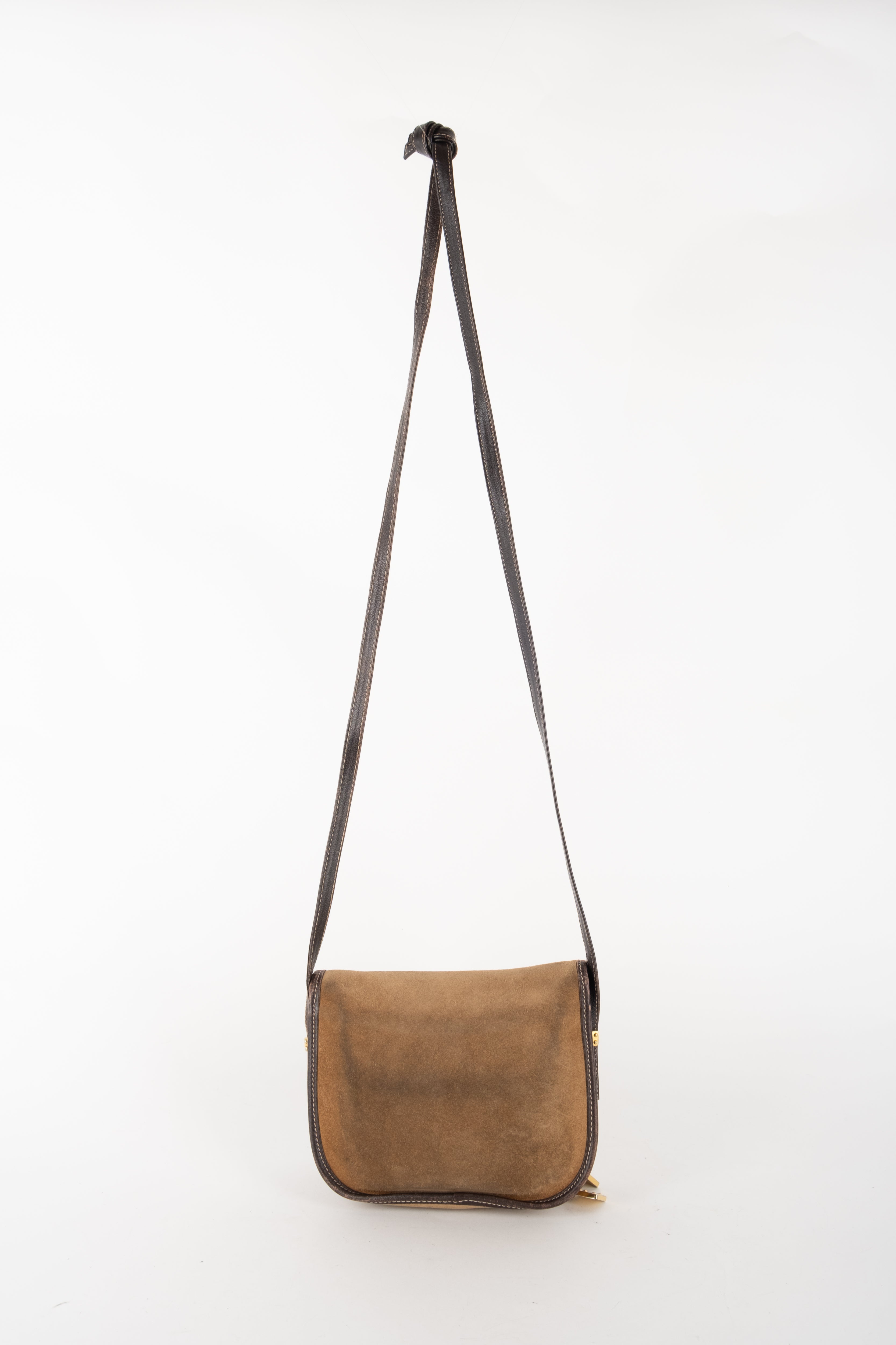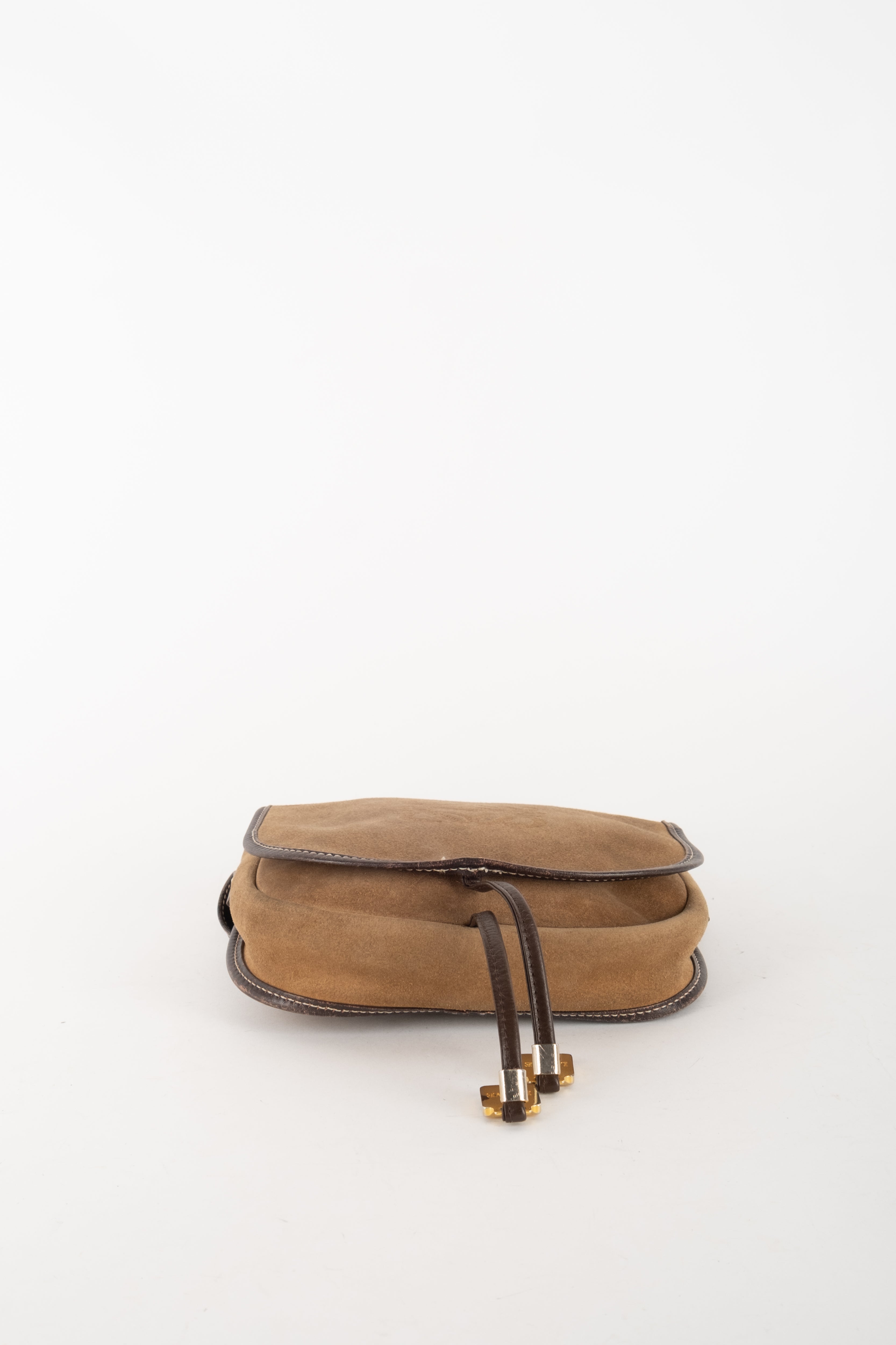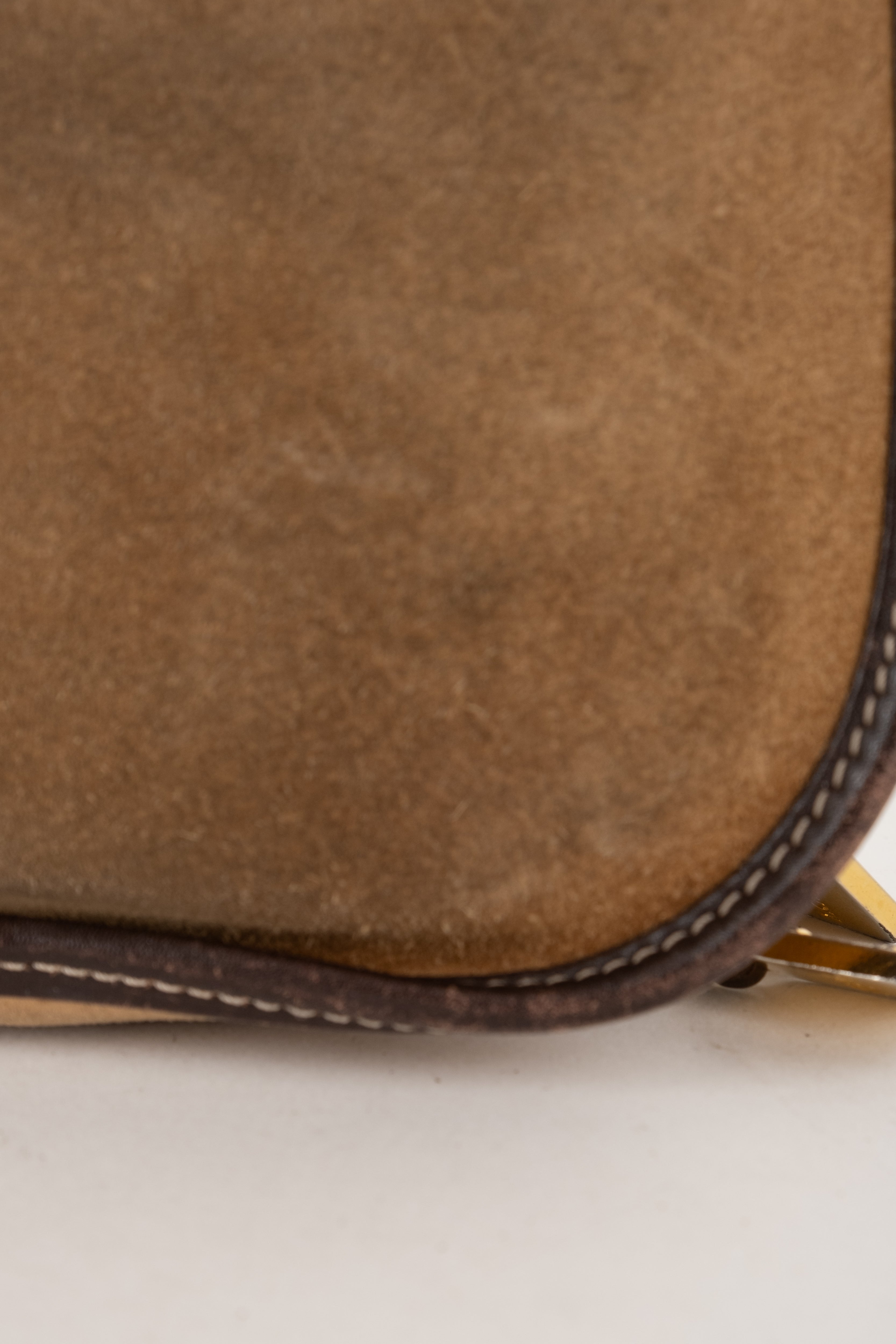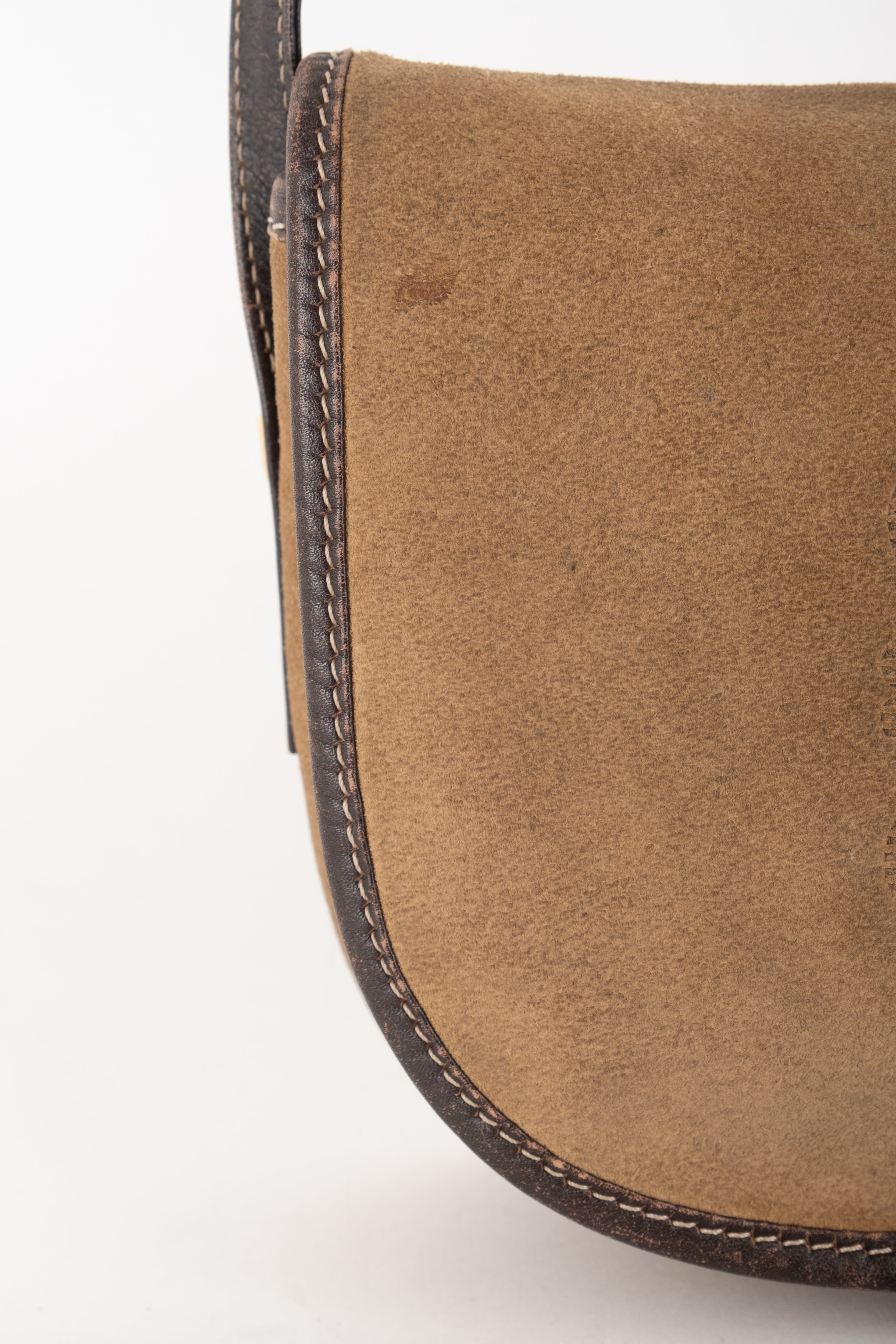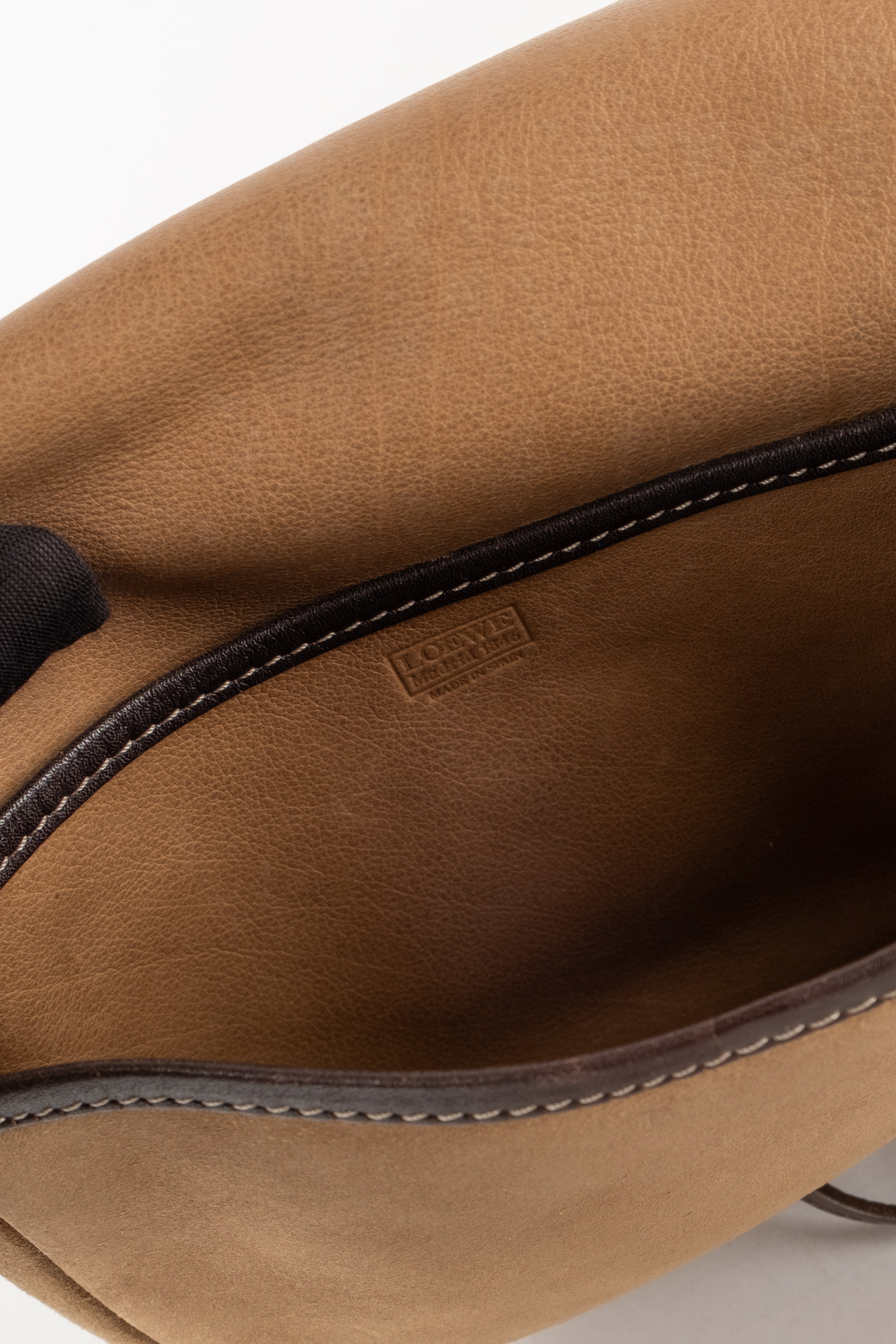 התיק עשוי זמש בגוון חום־בהיר, עם רצועת כתף ארוכה ומתכווננת לנשיאה באלכסון או על הכתף. סגירת דש קדמית עם אלמנט עור וחלק מתכתי קטן בתחתית, מבנה קומפקטי אך פרקטי, ותא פנימי המתאים לנשיאת פריטים חיוניים. עיצוב רך, נעים ומאוזן שמשדר שקט יוקרתי.