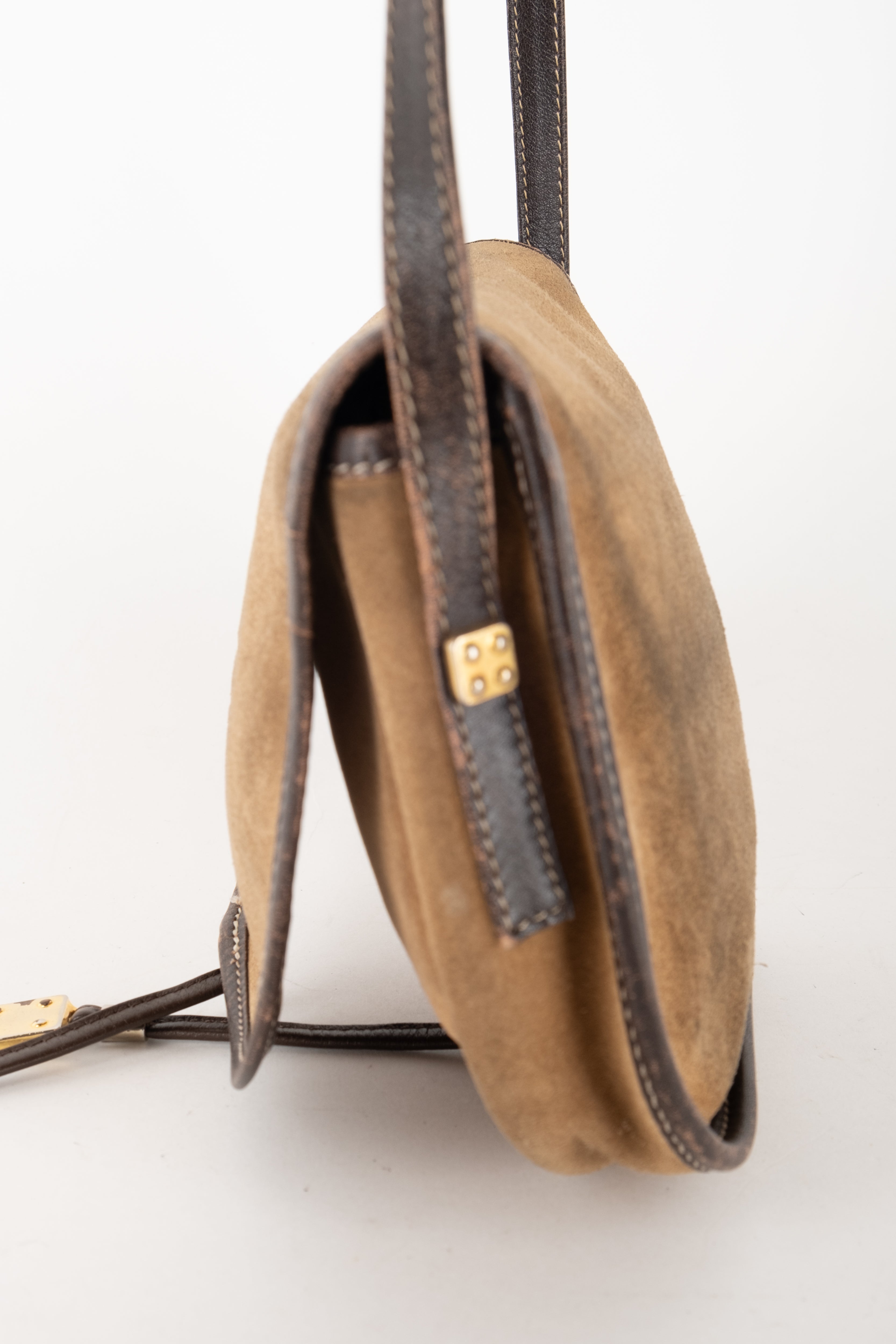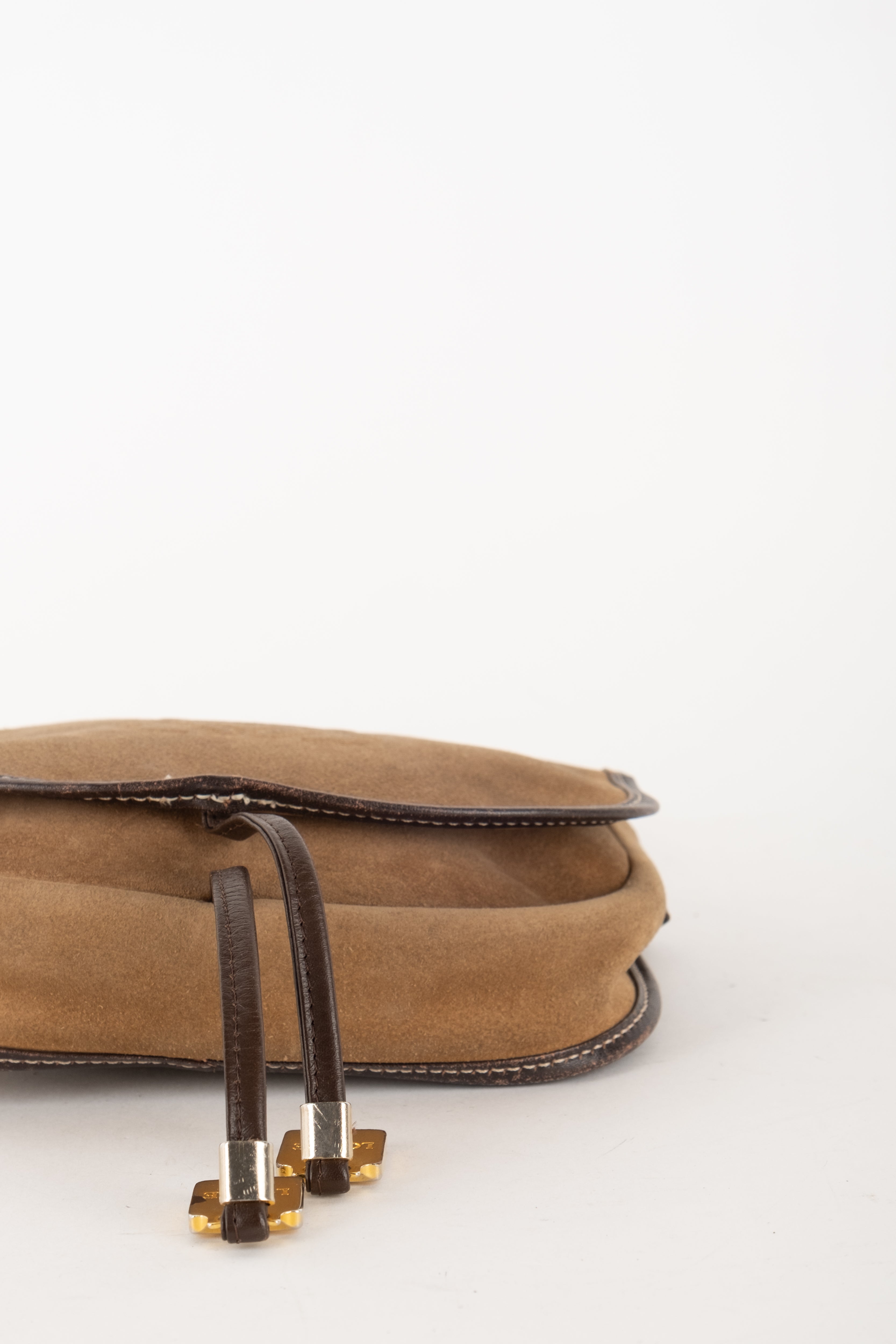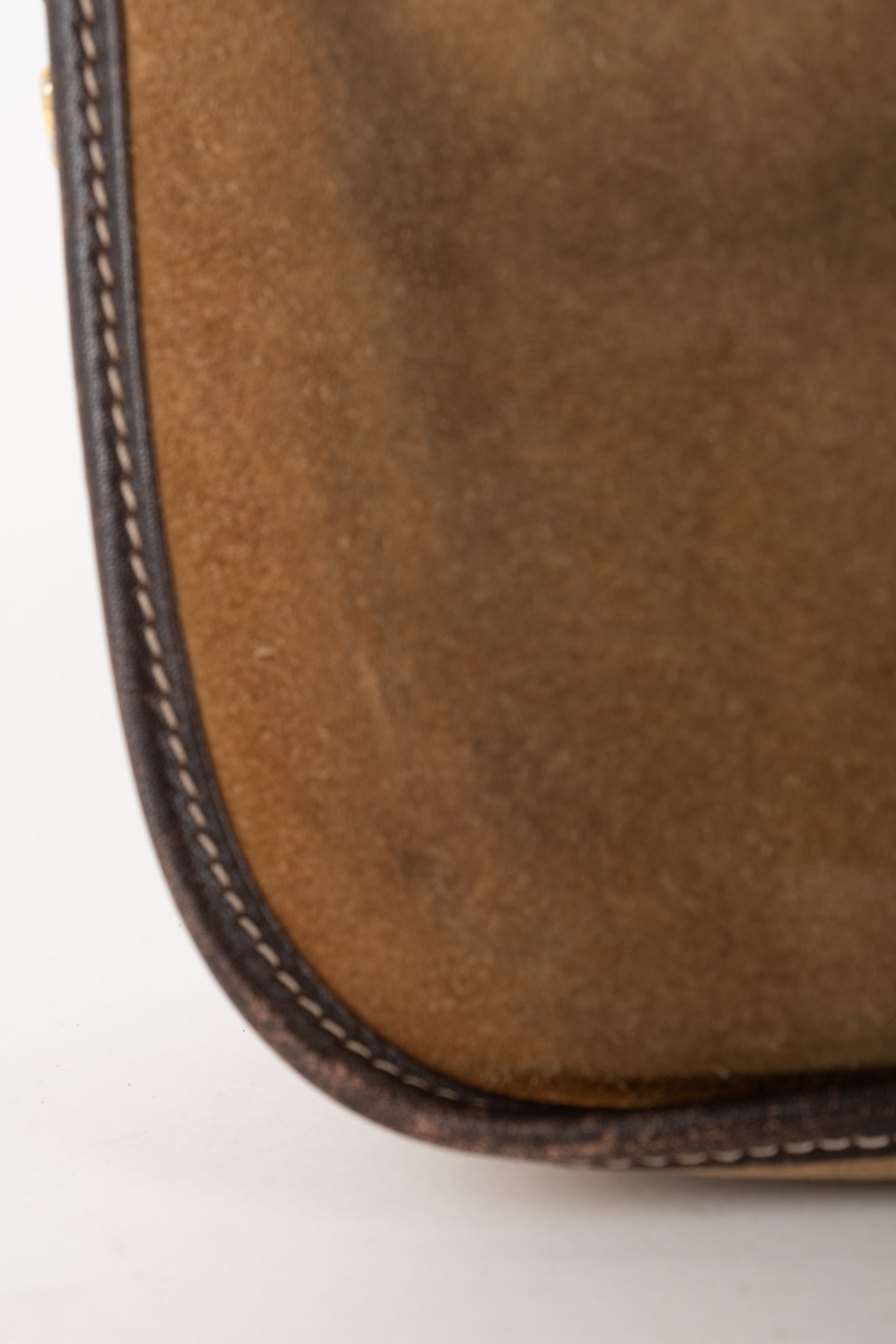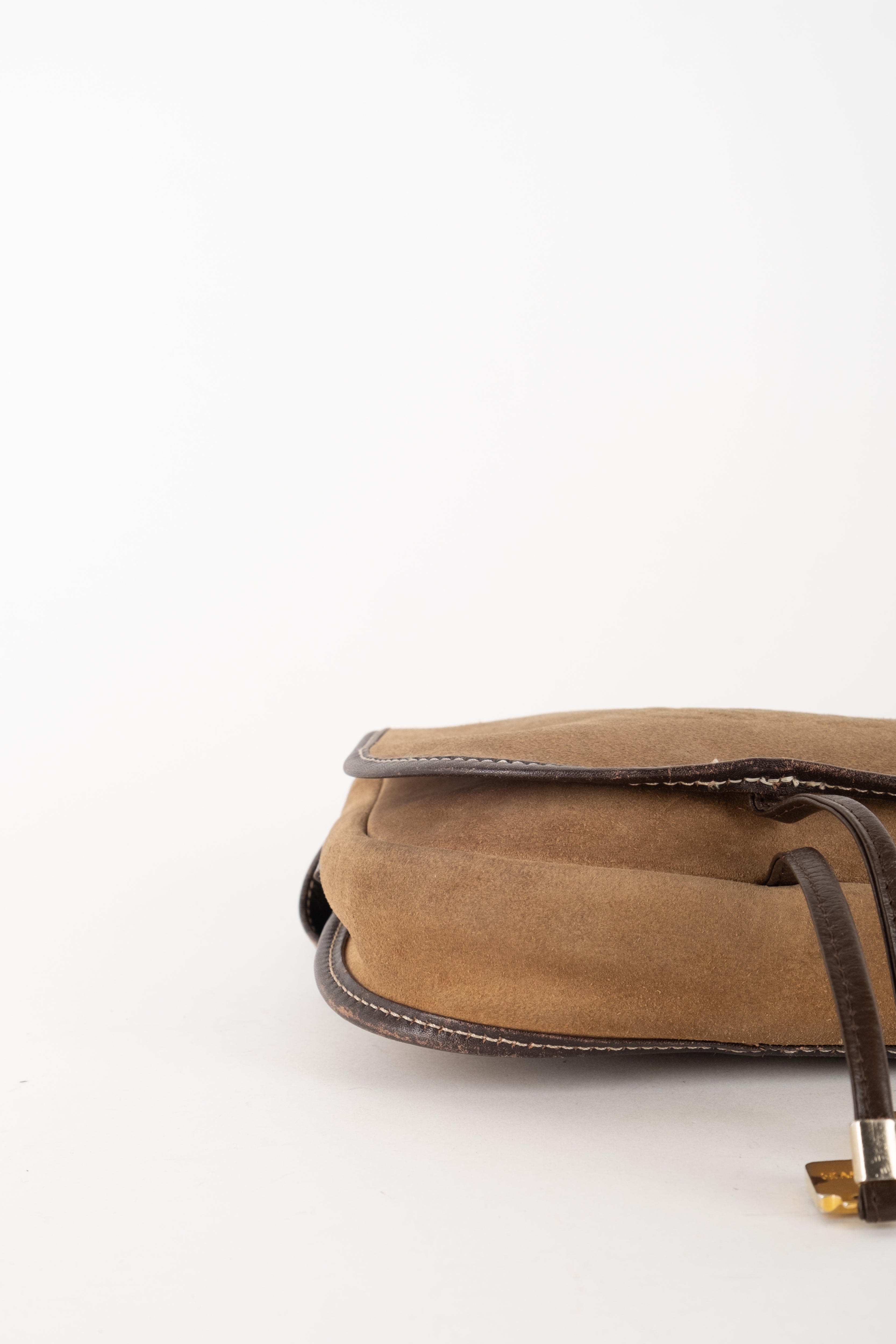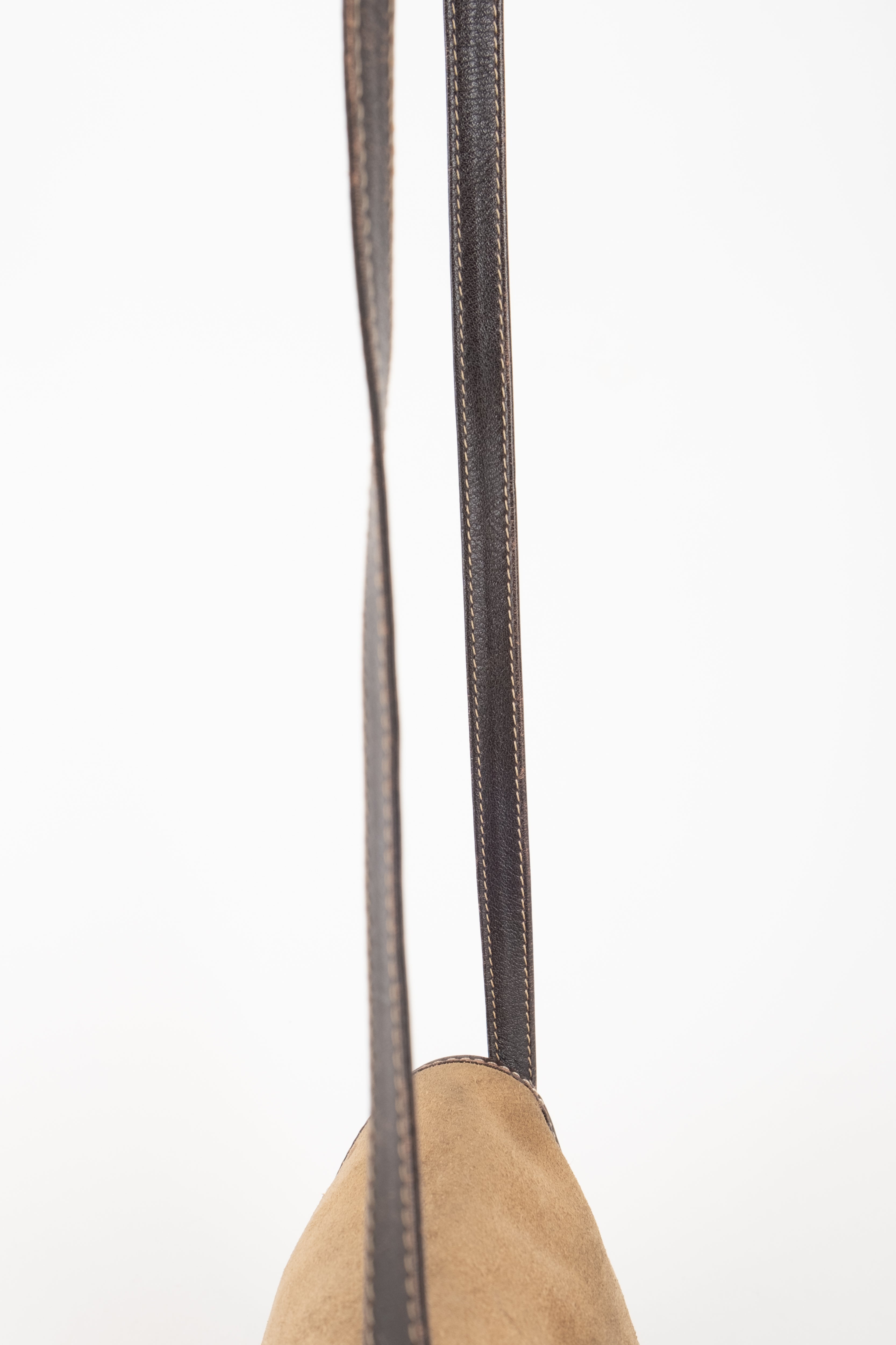 התיק עשוי זמש בגוון חום־בהיר, עם רצועת כתף ארוכה ומתכווננת לנשיאה באלכסון או על הכתף. סגירת דש קדמית עם אלמנט עור וחלק מתכתי קטן בתחתית, מבנה קומפקטי אך פרקטי, ותא פנימי המתאים לנשיאת פריטים חיוניים. עיצוב רך, נעים ומאוזן שמשדר שקט יוקרתי.