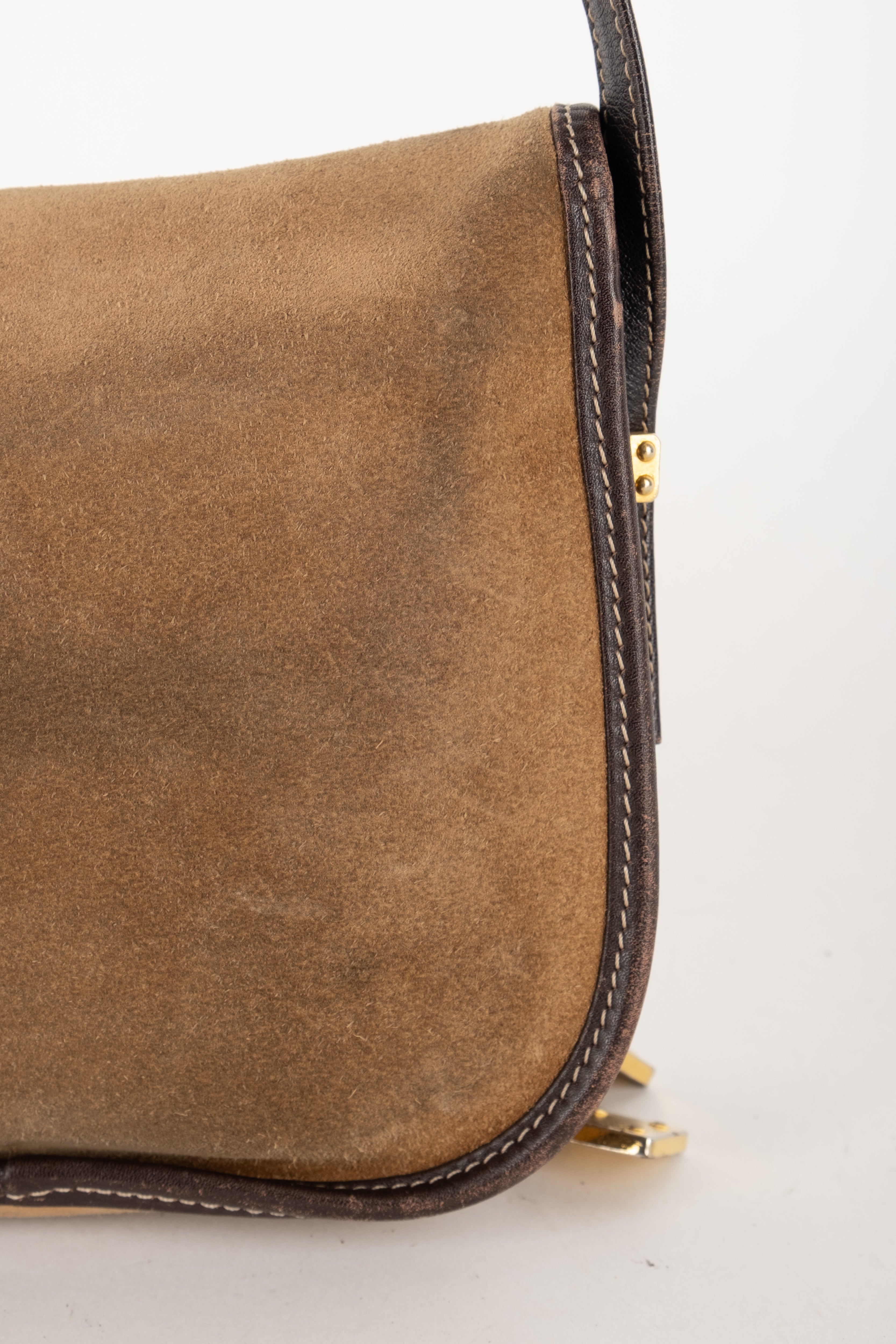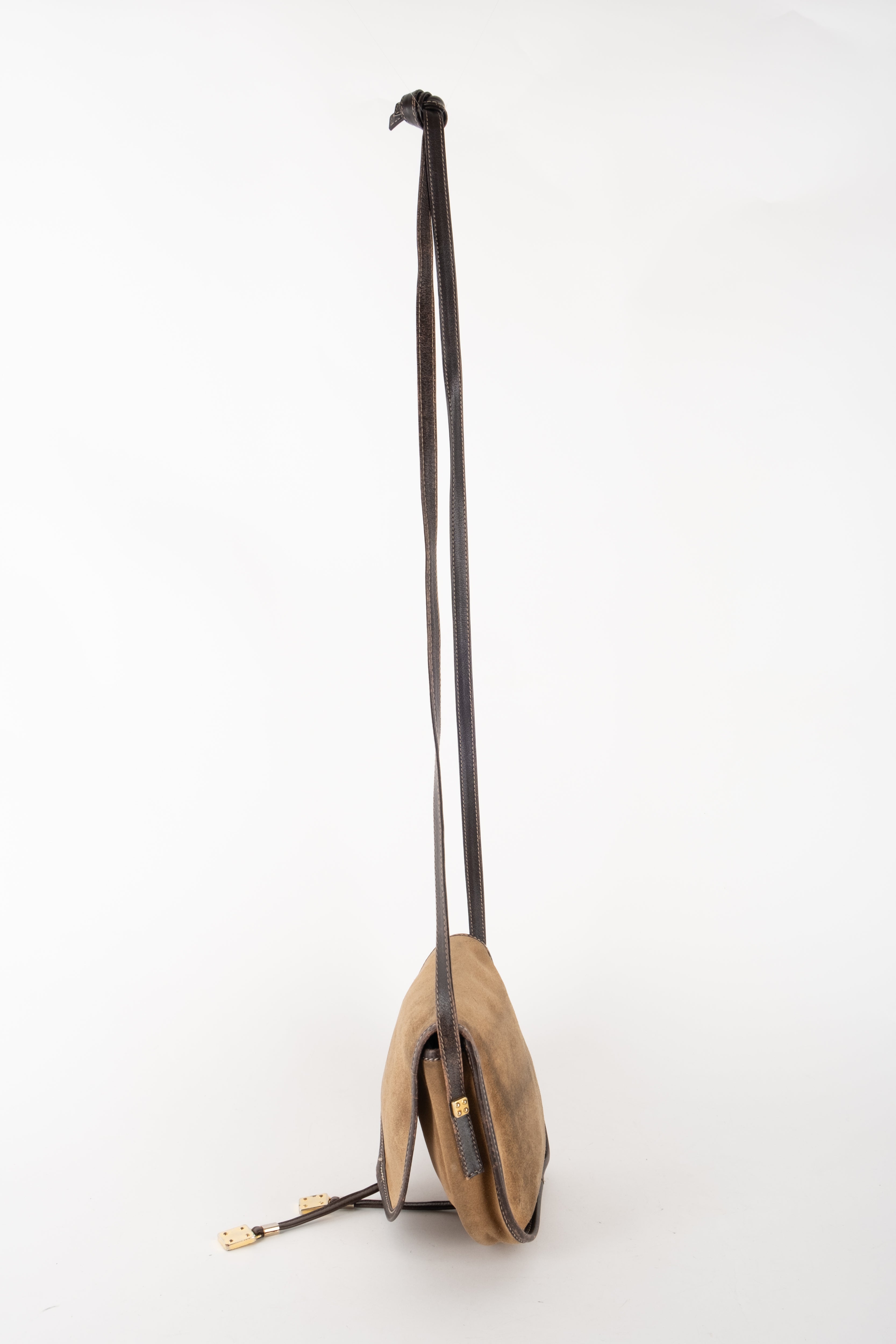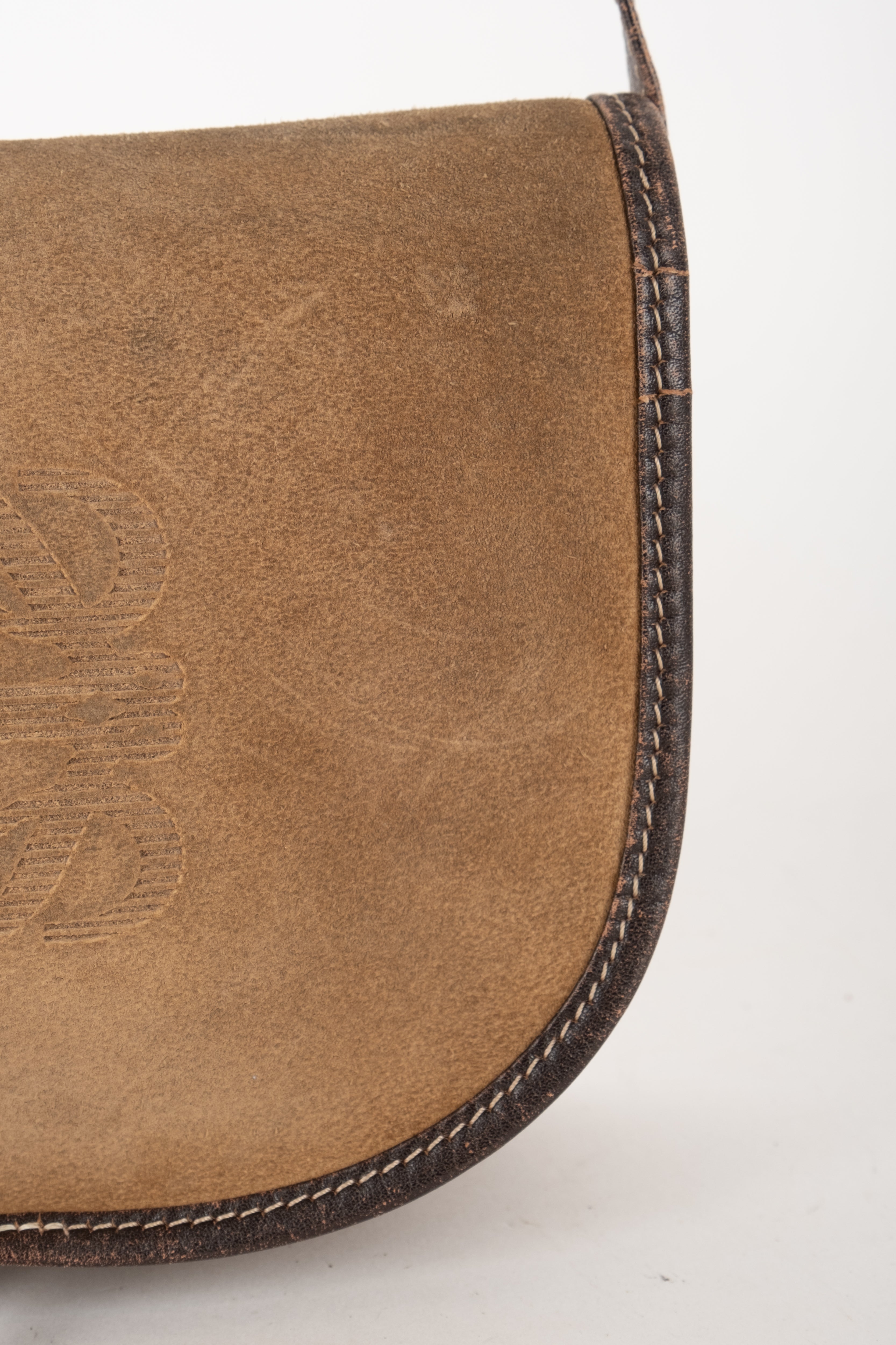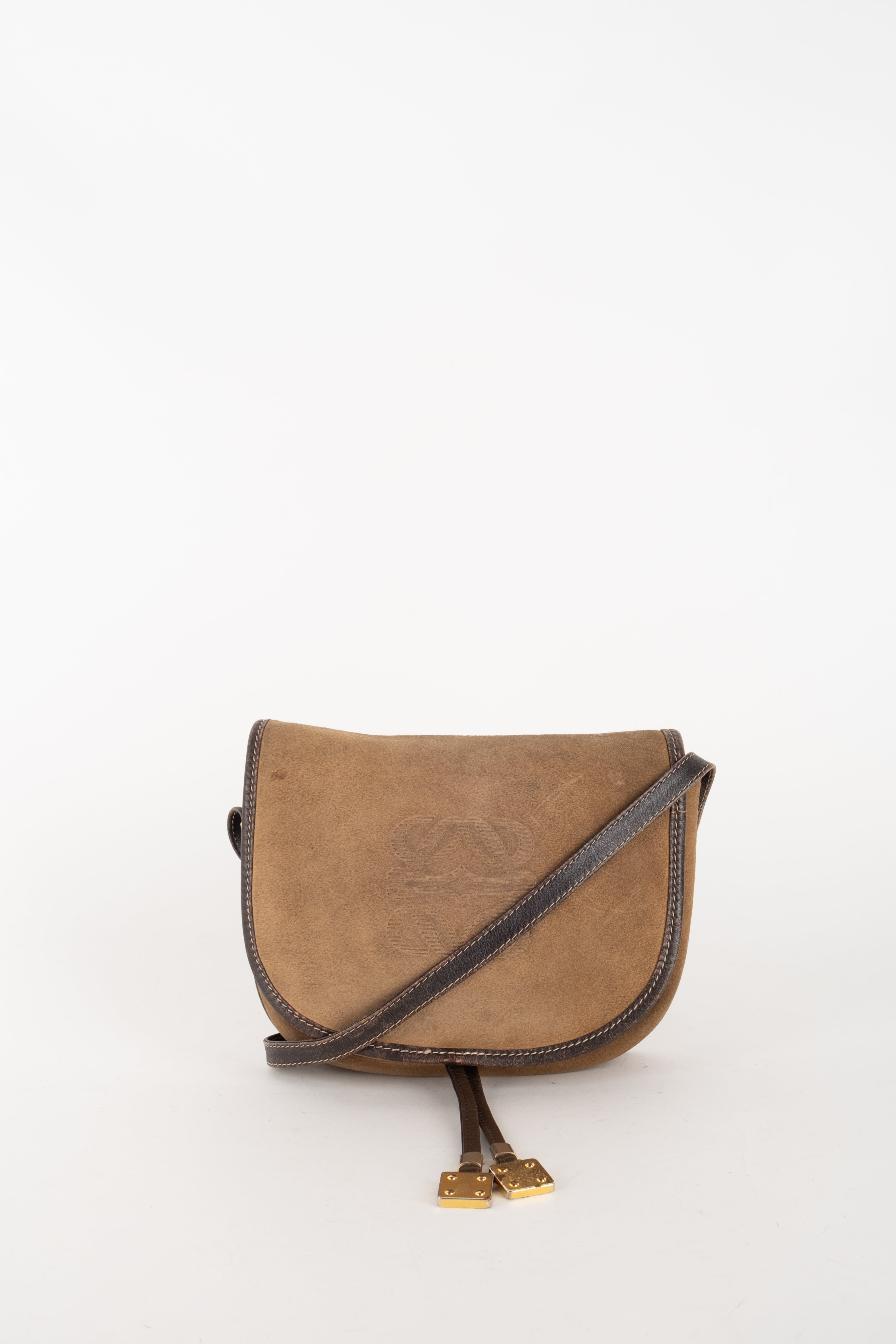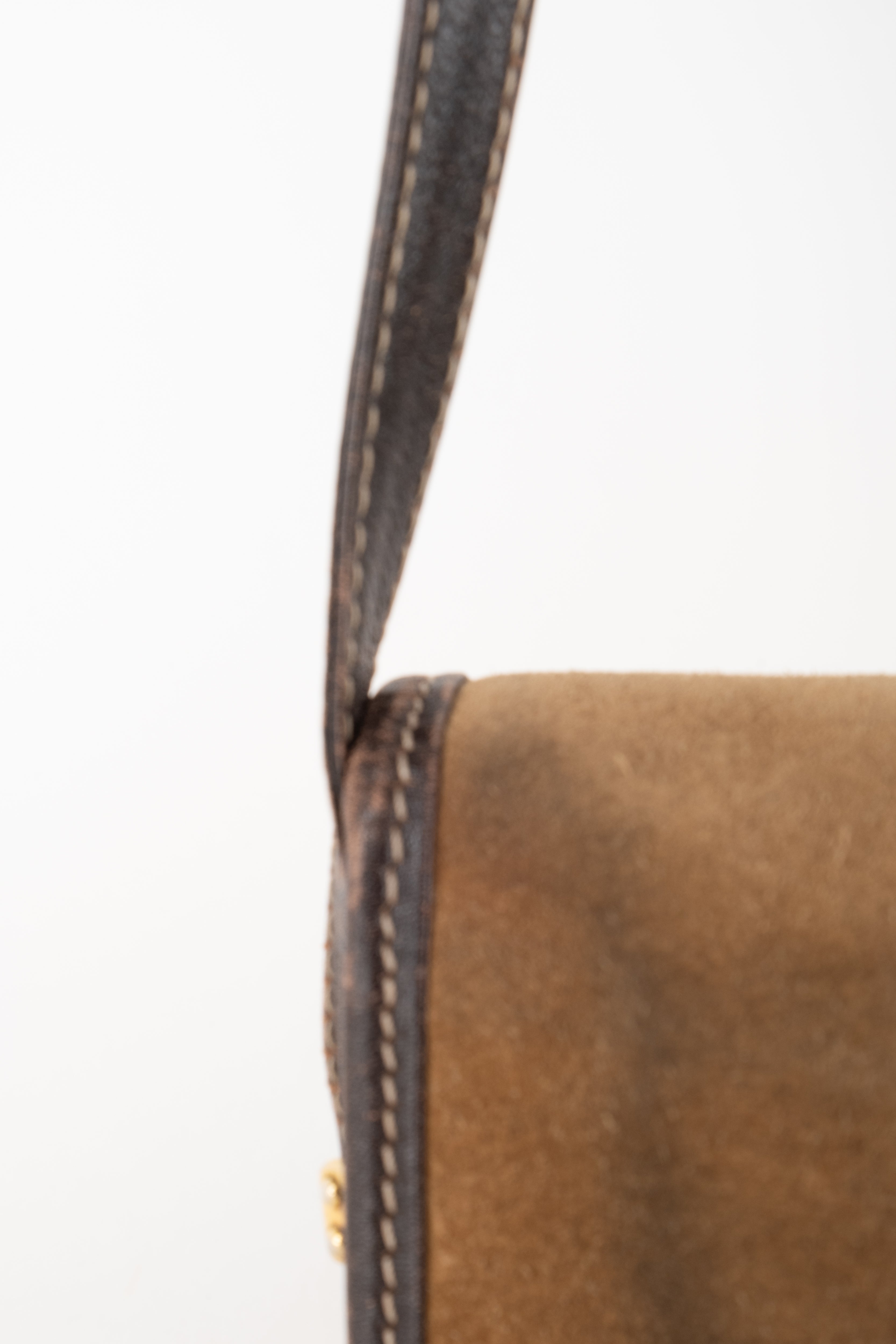 התיק עשוי זמש בגוון חום־בהיר, עם רצועת כתף ארוכה ומתכווננת לנשיאה באלכסון או על הכתף. סגירת דש קדמית עם אלמנט עור וחלק מתכתי קטן בתחתית, מבנה קומפקטי אך פרקטי, ותא פנימי המתאים לנשיאת פריטים חיוניים. עיצוב רך, נעים ומאוזן שמשדר שקט יוקרתי.