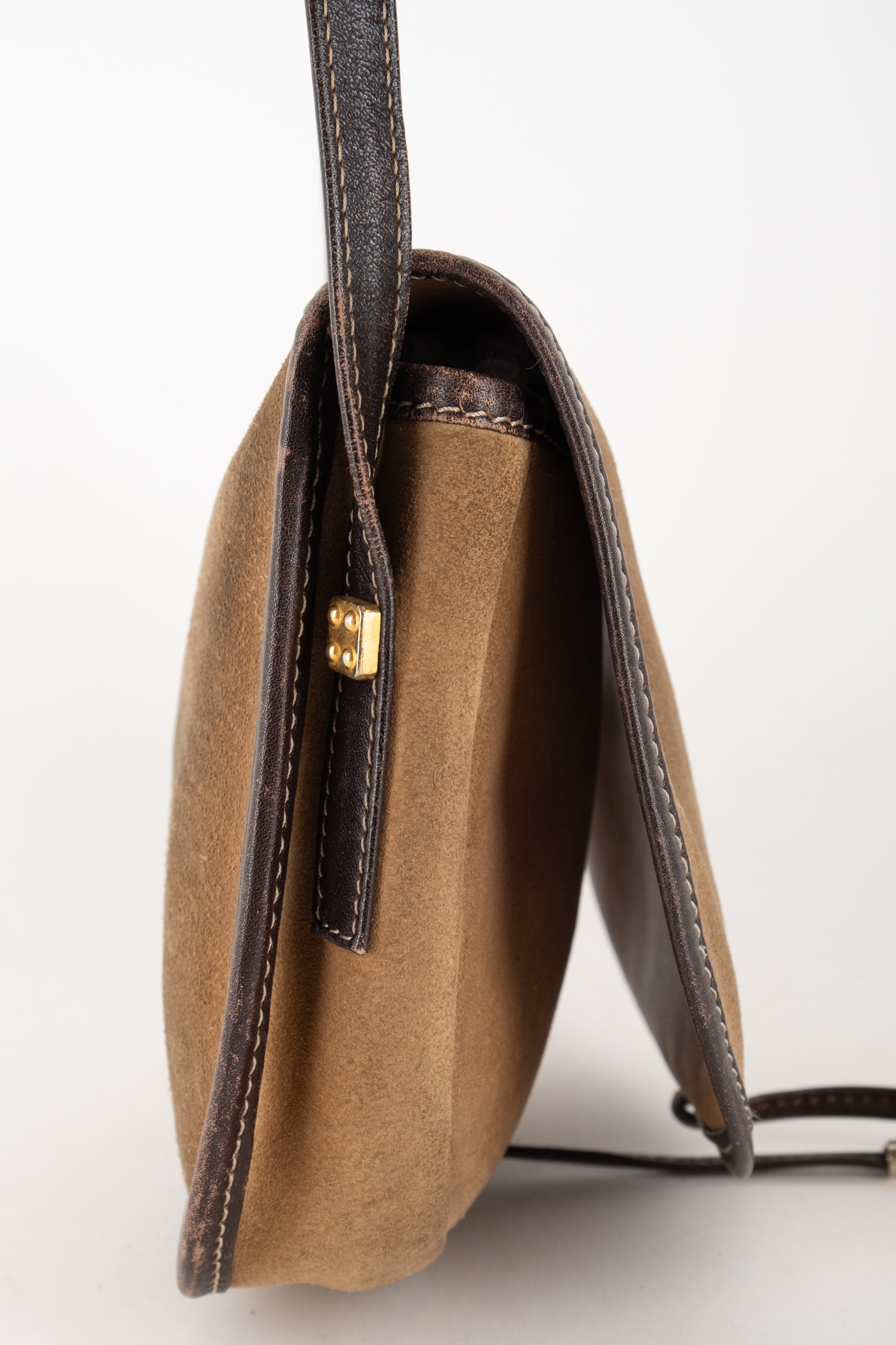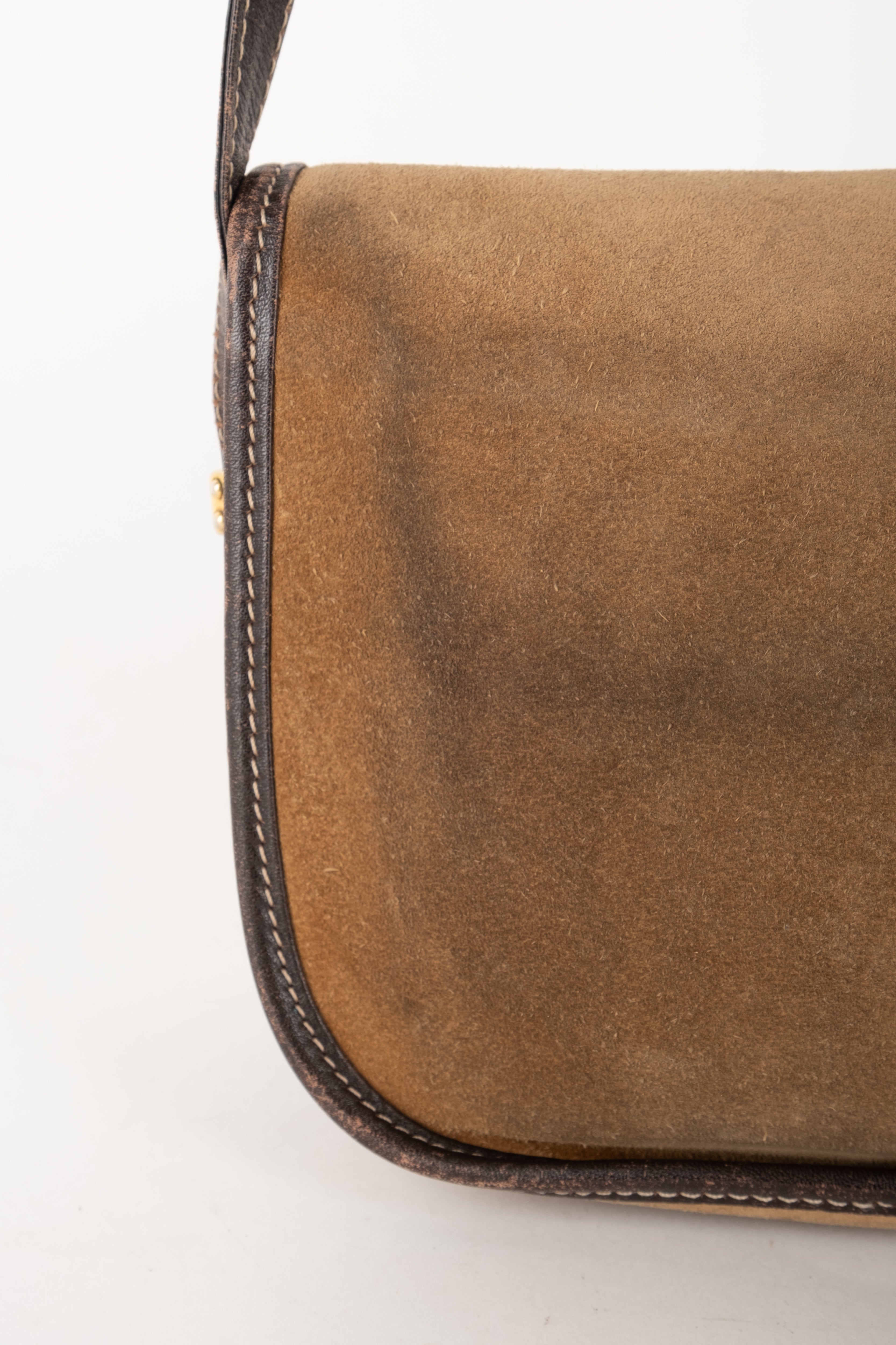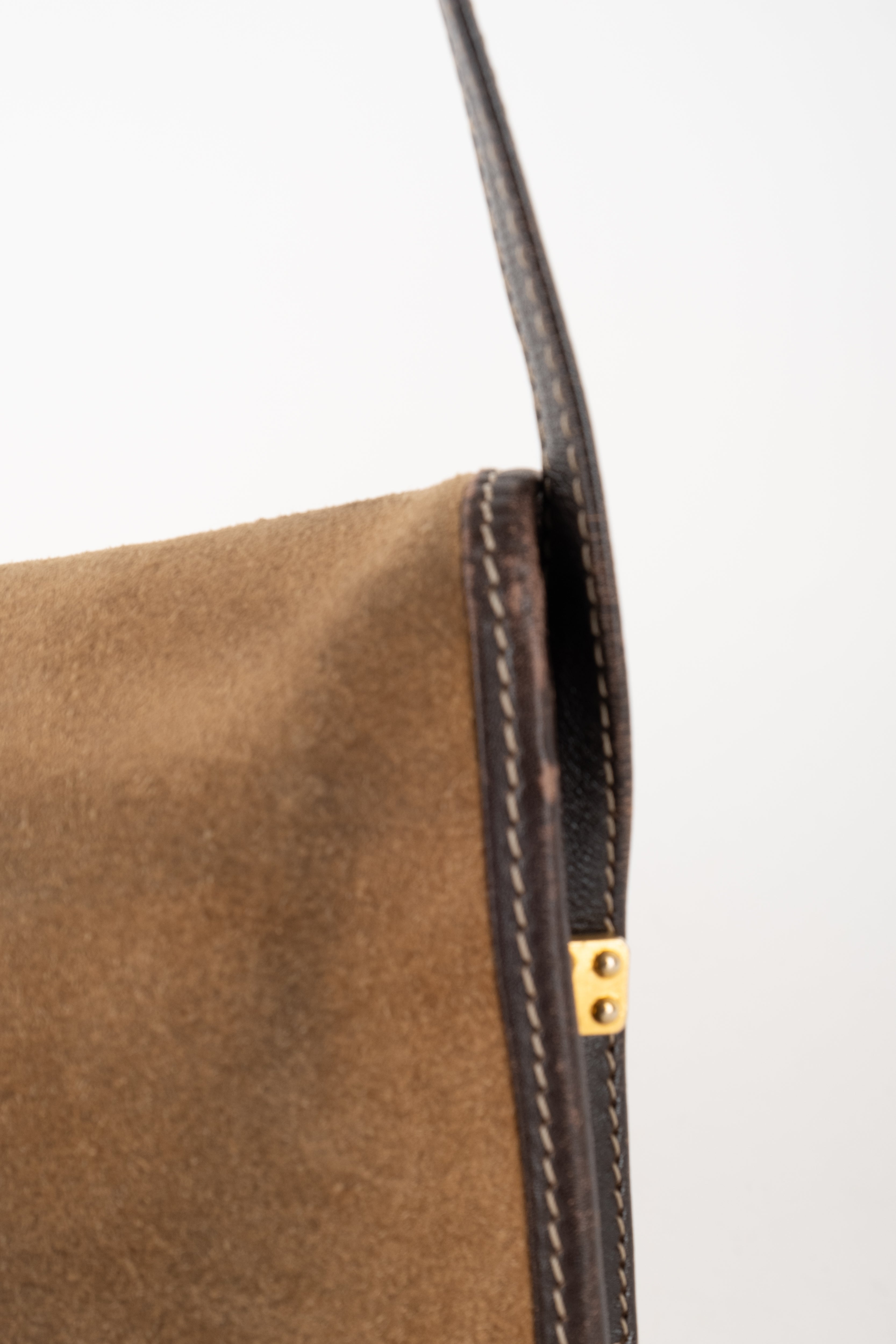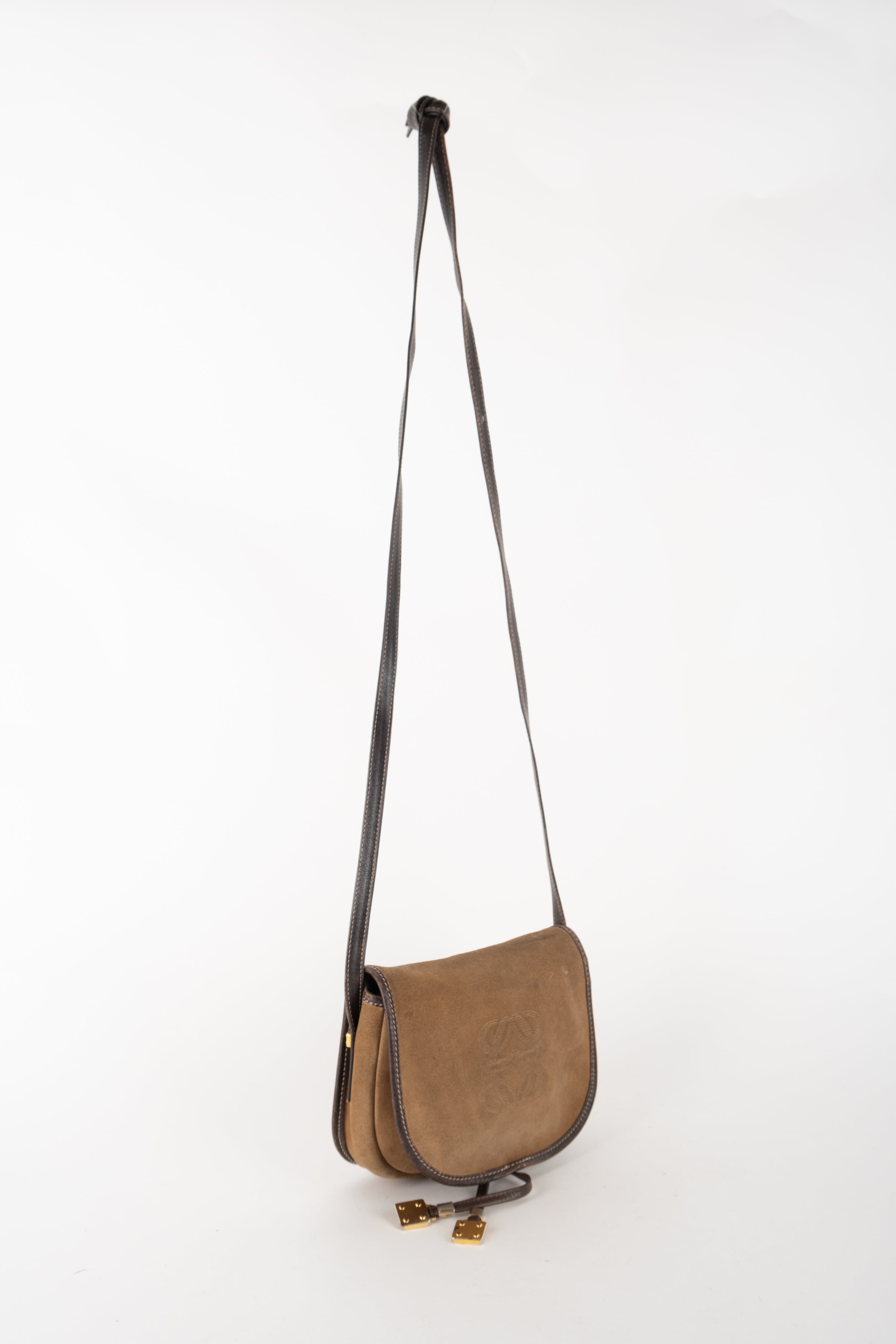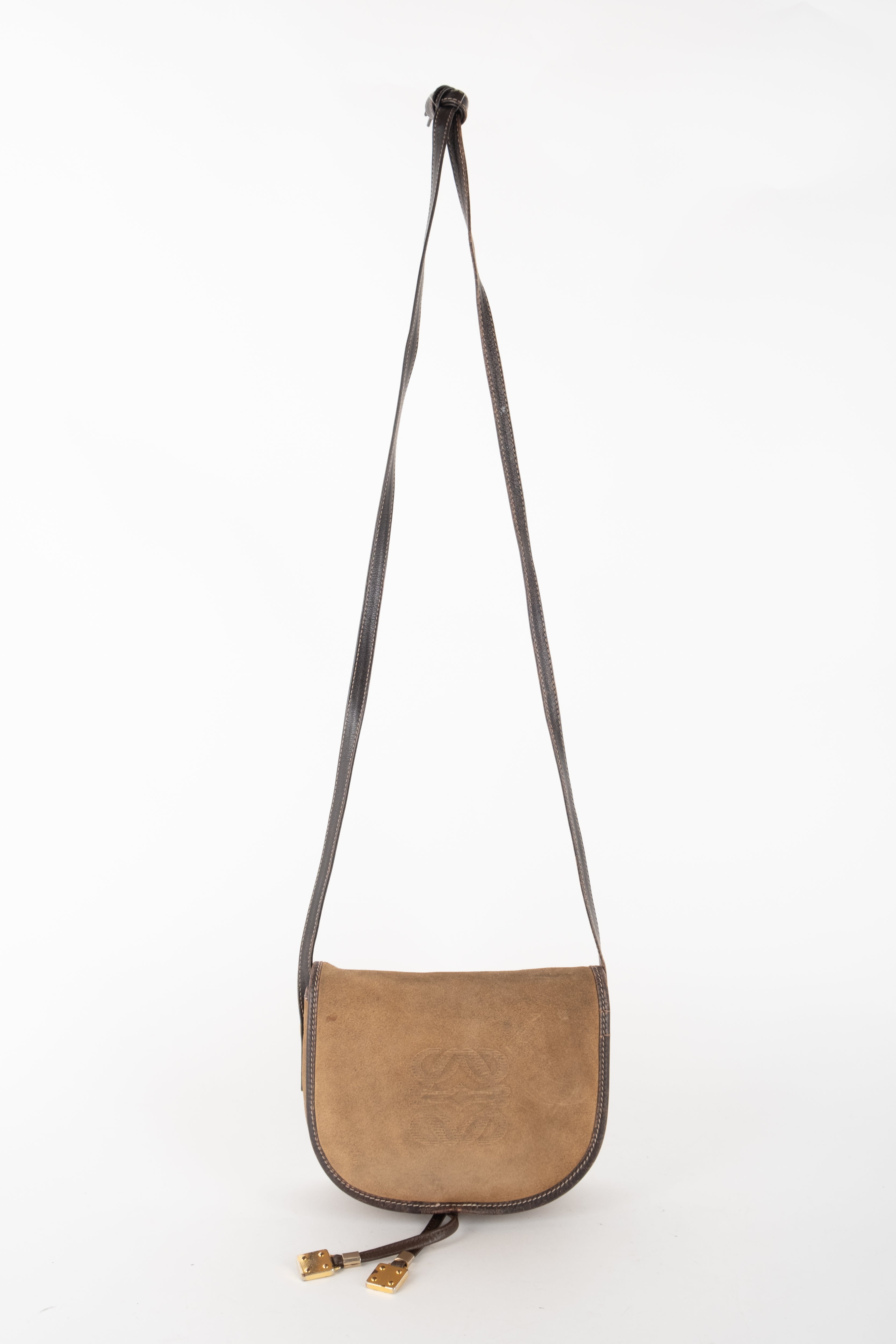 התיק עשוי זמש בגוון חום־בהיר, עם רצועת כתף ארוכה ומתכווננת לנשיאה באלכסון או על הכתף. סגירת דש קדמית עם אלמנט עור וחלק מתכתי קטן בתחתית, מבנה קומפקטי אך פרקטי, ותא פנימי המתאים לנשיאת פריטים חיוניים. עיצוב רך, נעים ומאוזן שמשדר שקט יוקרתי.