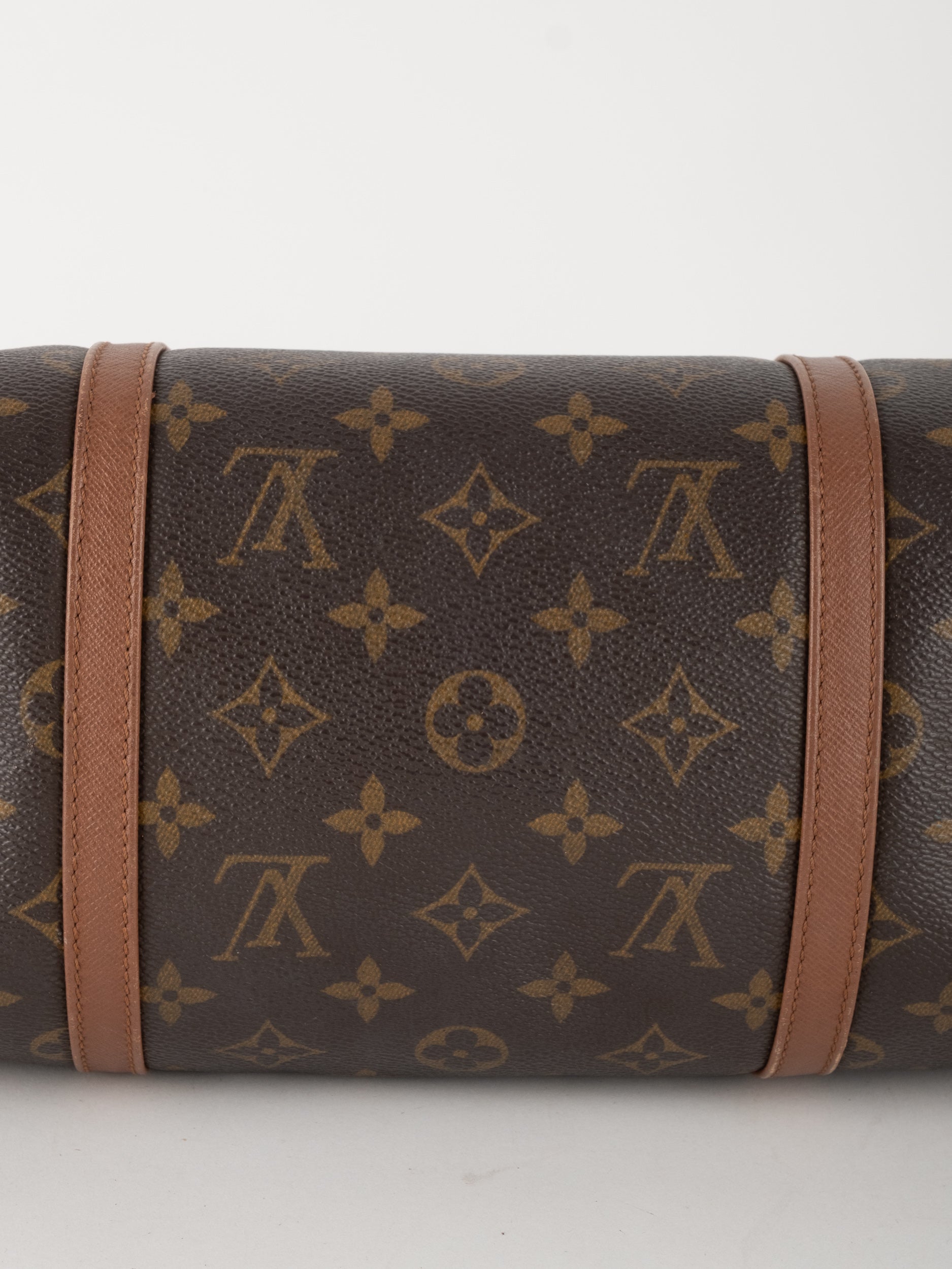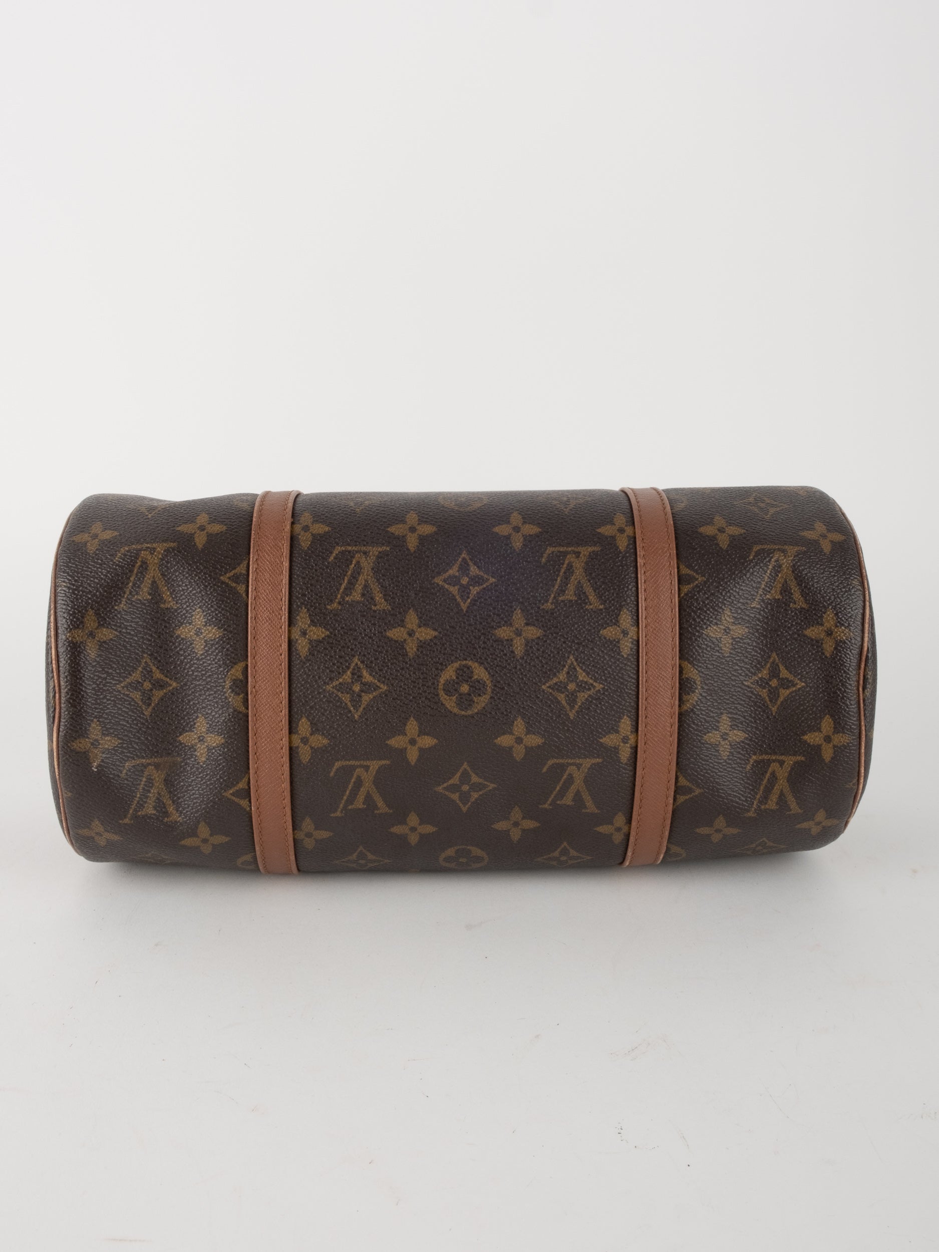 התיק עשוי קנבס בדוגמת Monogram עם רצועות ועיטורי עור חום, מבנה גלילי ייחודי וסגירת רוכסן עליונה. דגם Papillon 30 הוא מידה קלאסית ונוחה לנשיאה יומיומית, עם חלל פנימי מרווח ביחס למראהו הקומפקטי.