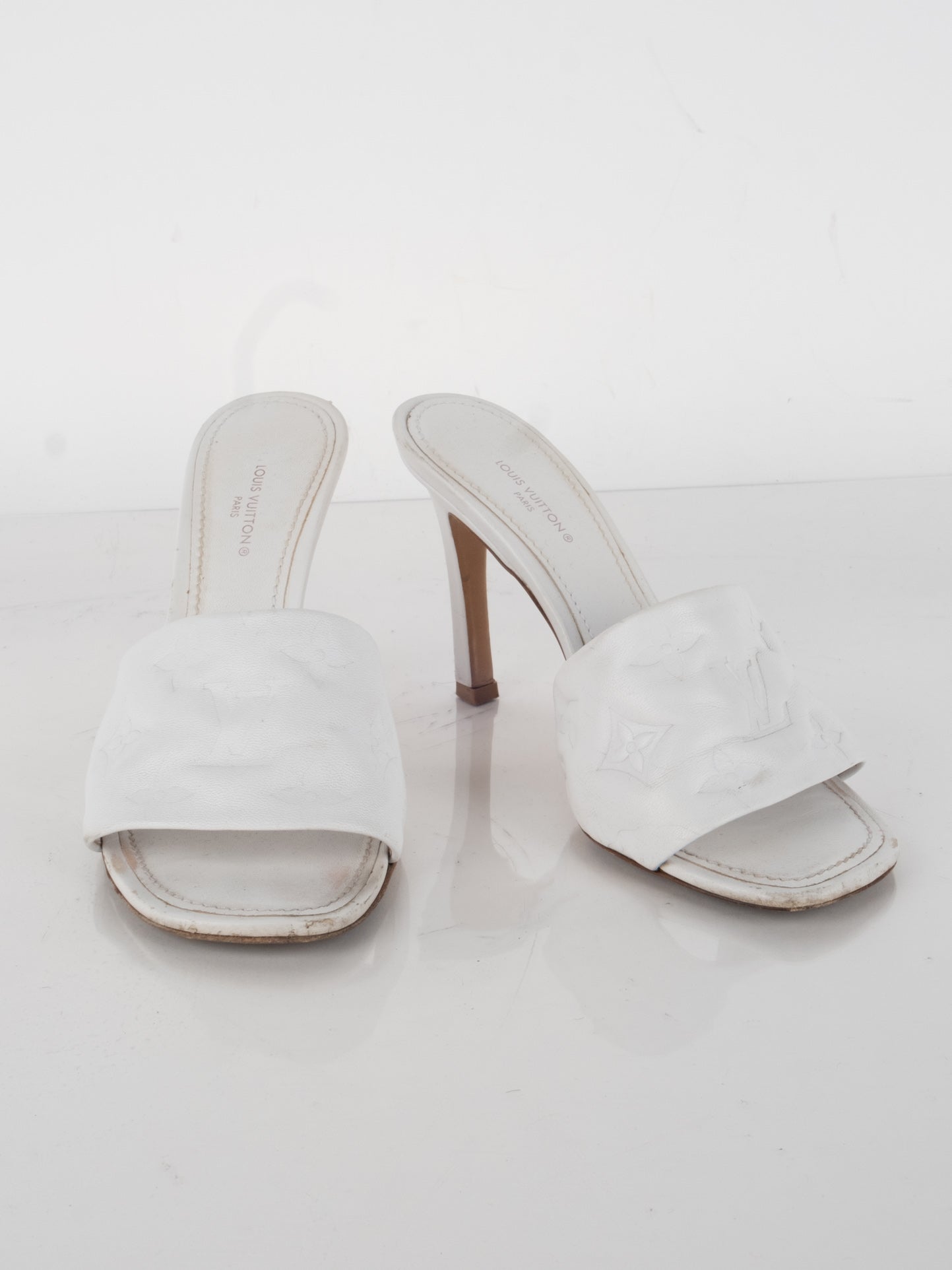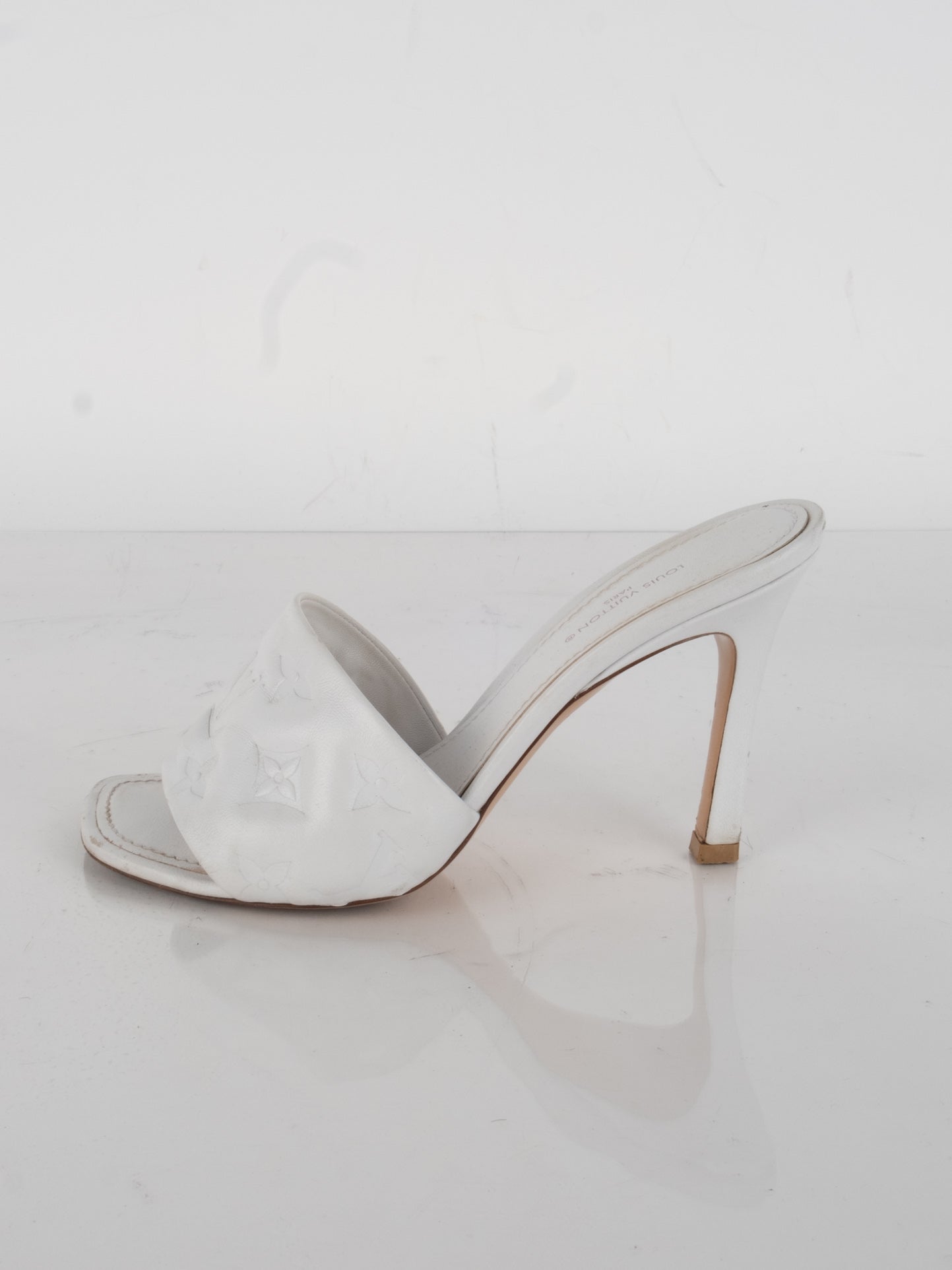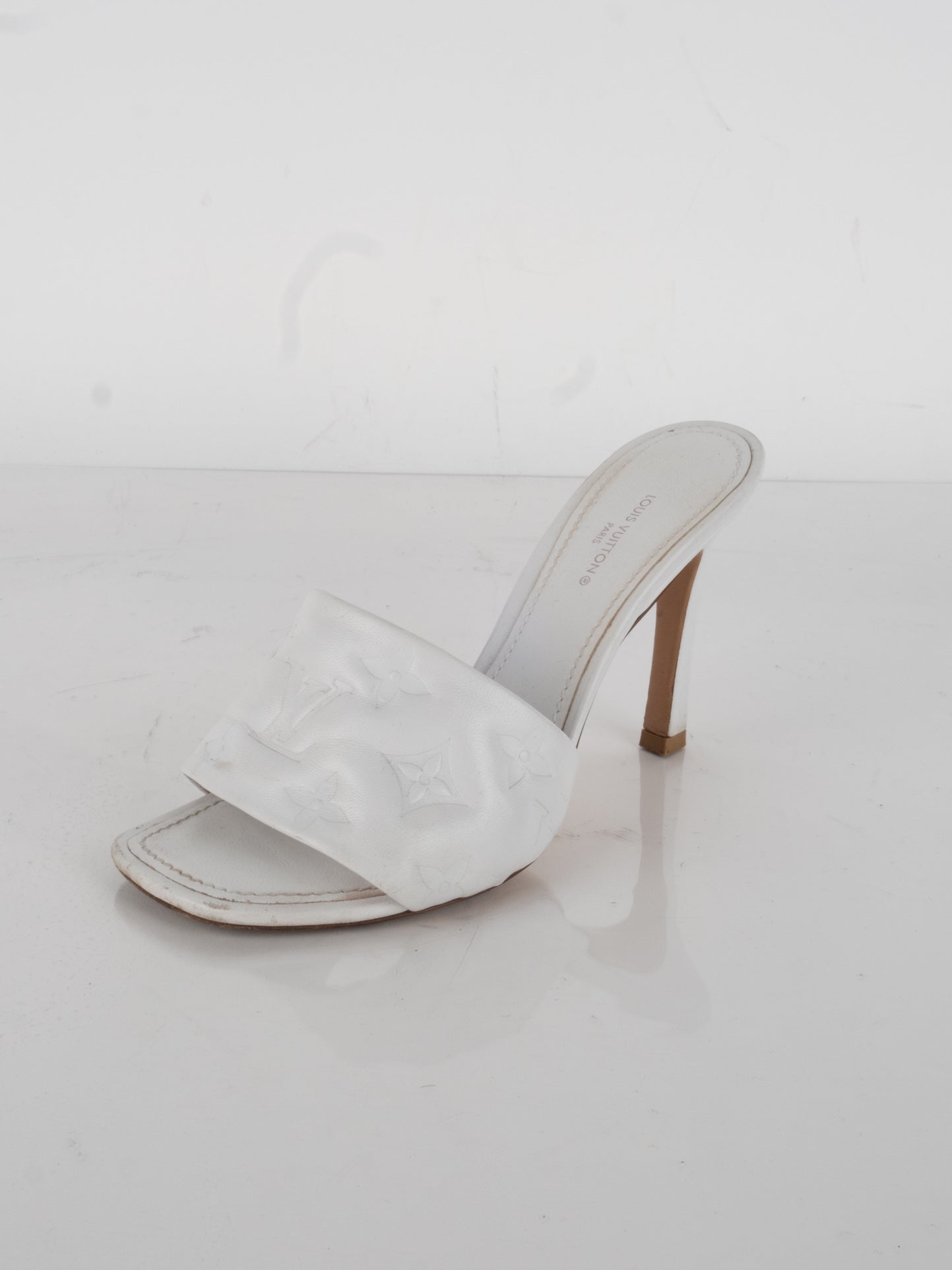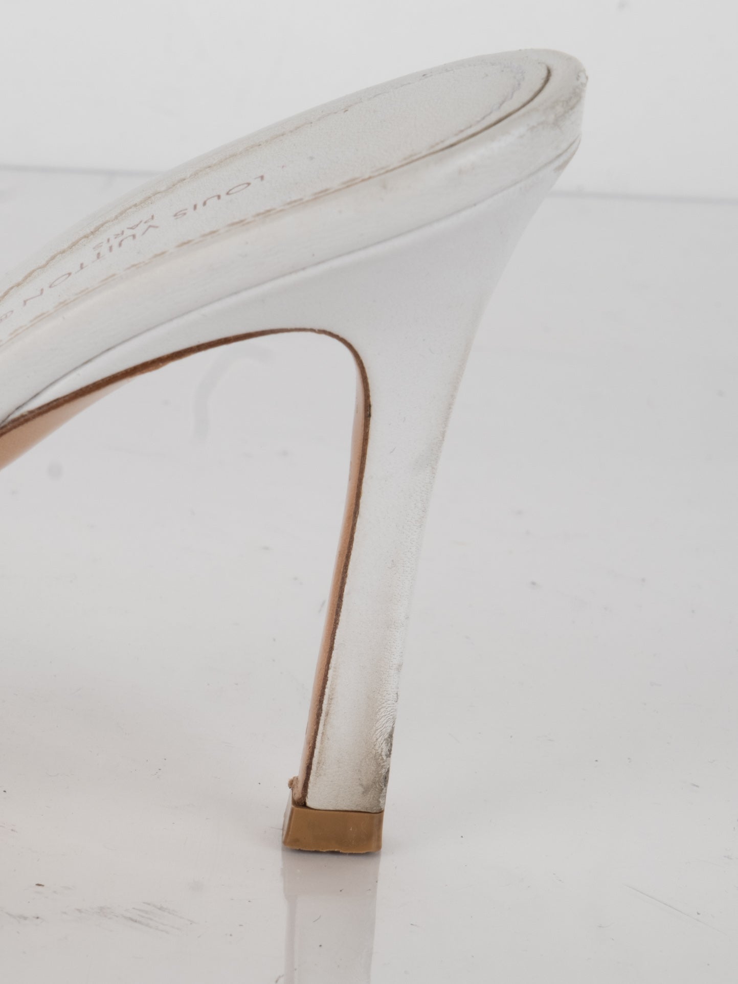 עקב סנדל העשוי מעור בצבע לבן בהדפס המונוגרמי המוכר של המותג הצרפתי בעל עקב דק.