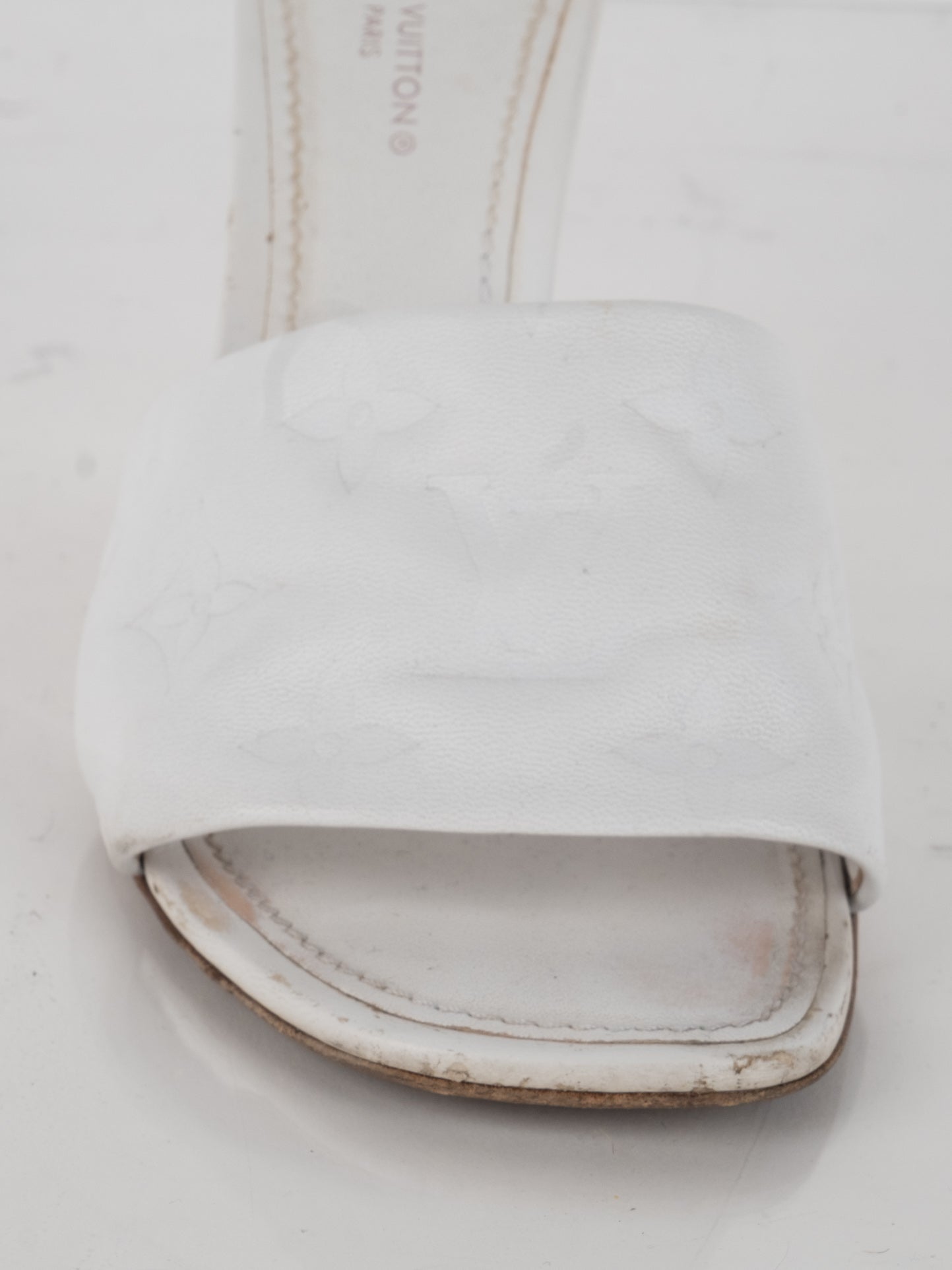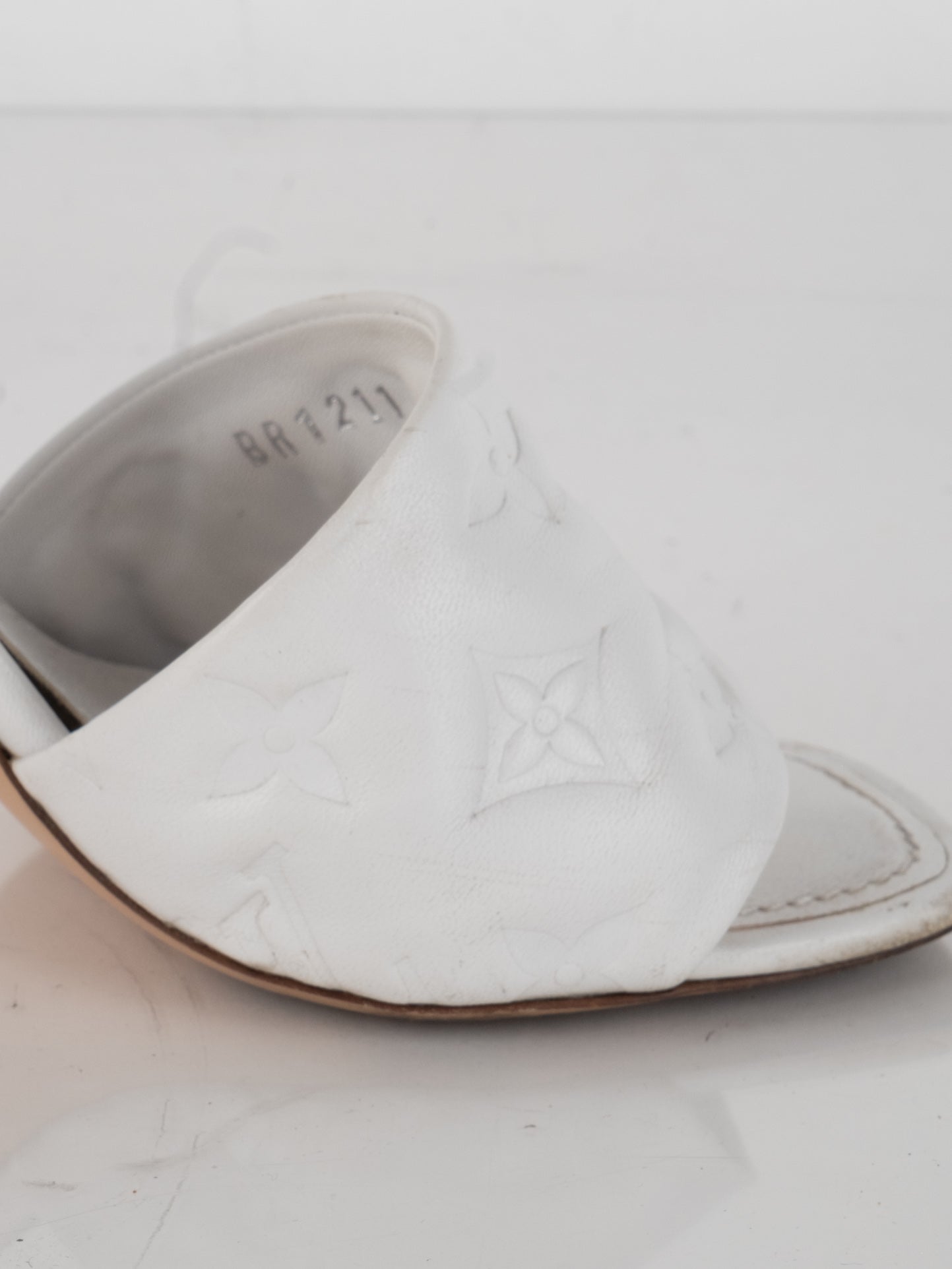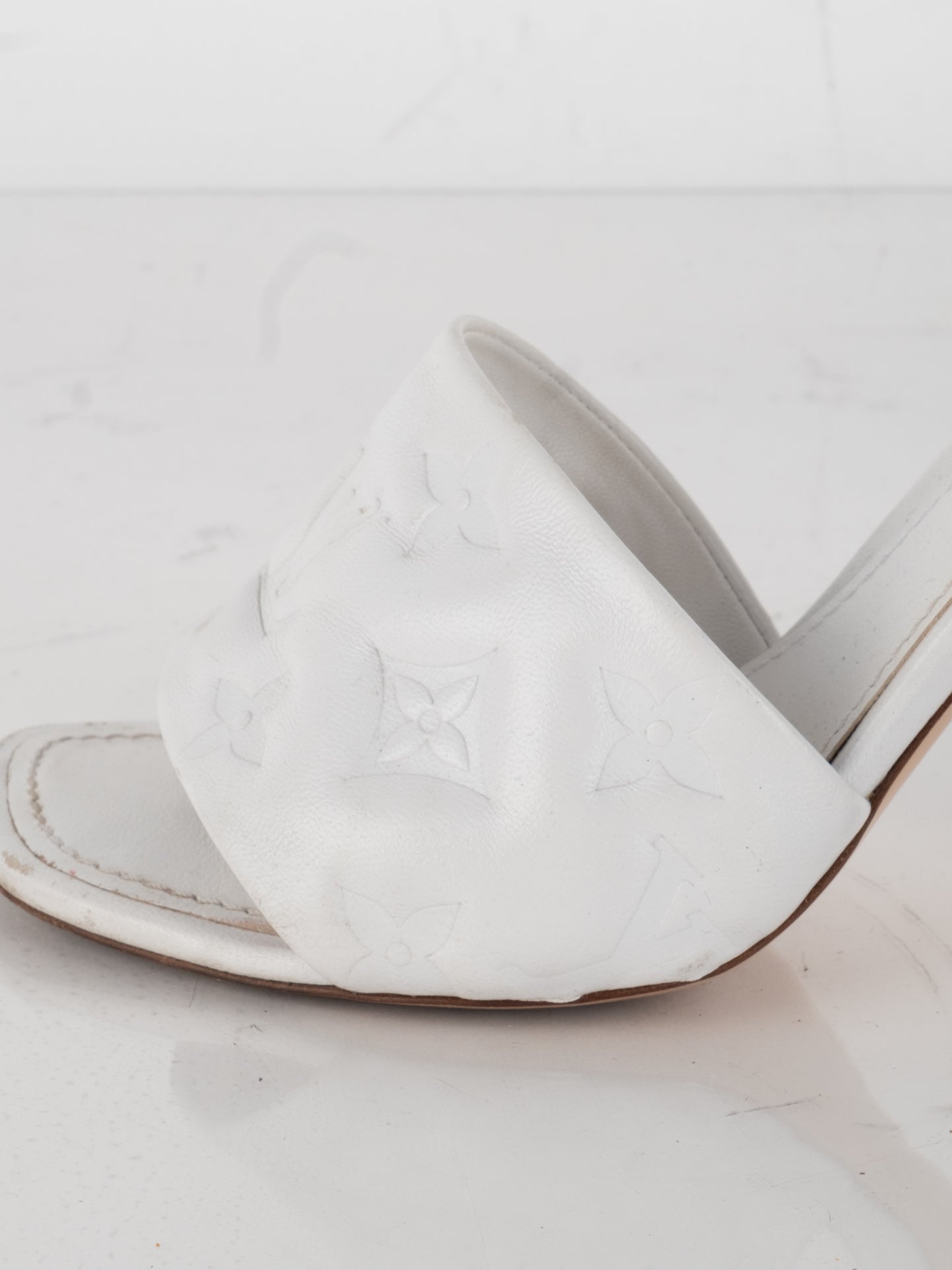 עקב סנדל העשוי מעור בצבע לבן בהדפס המונוגרמי המוכר של המותג הצרפתי בעל עקב דק.